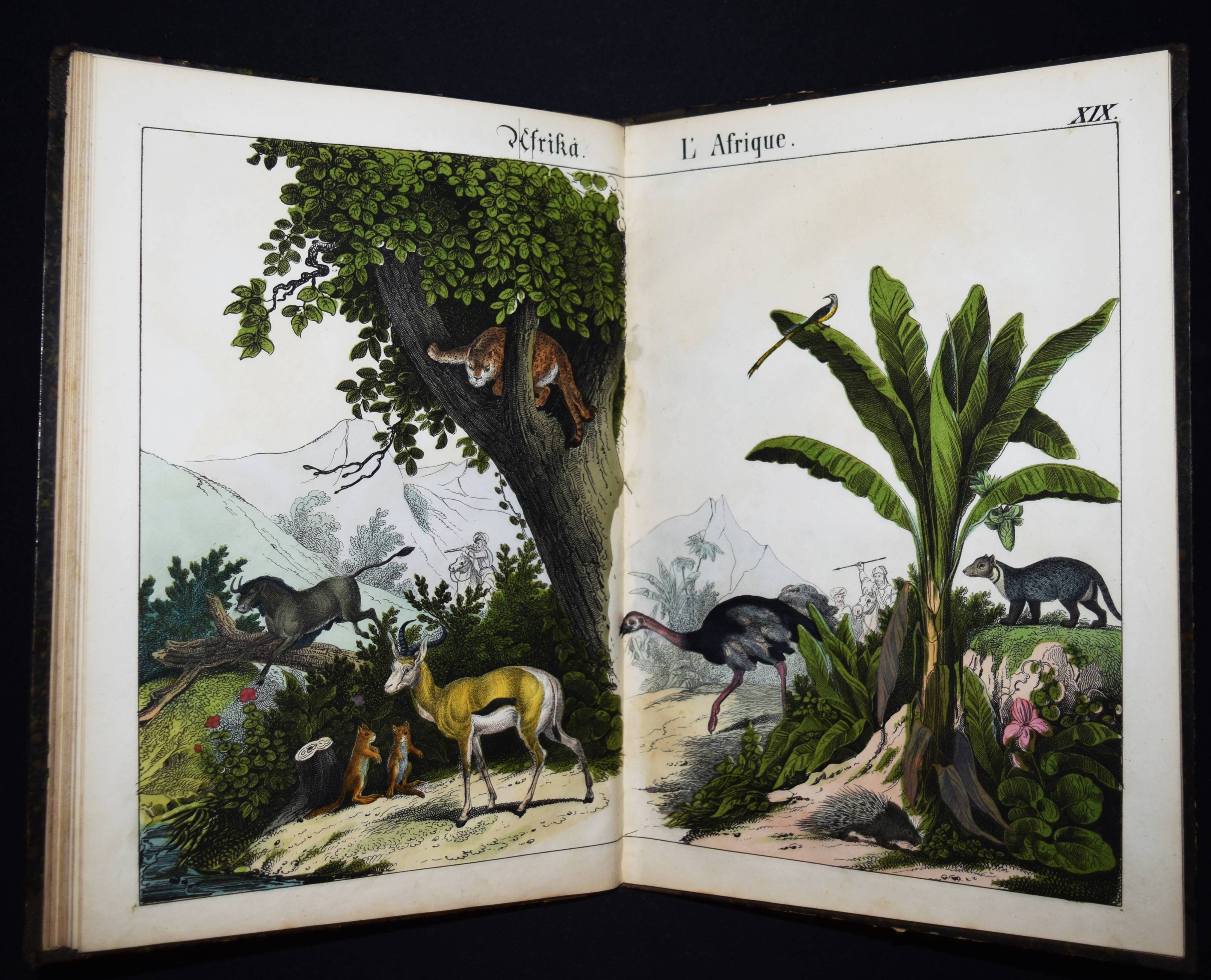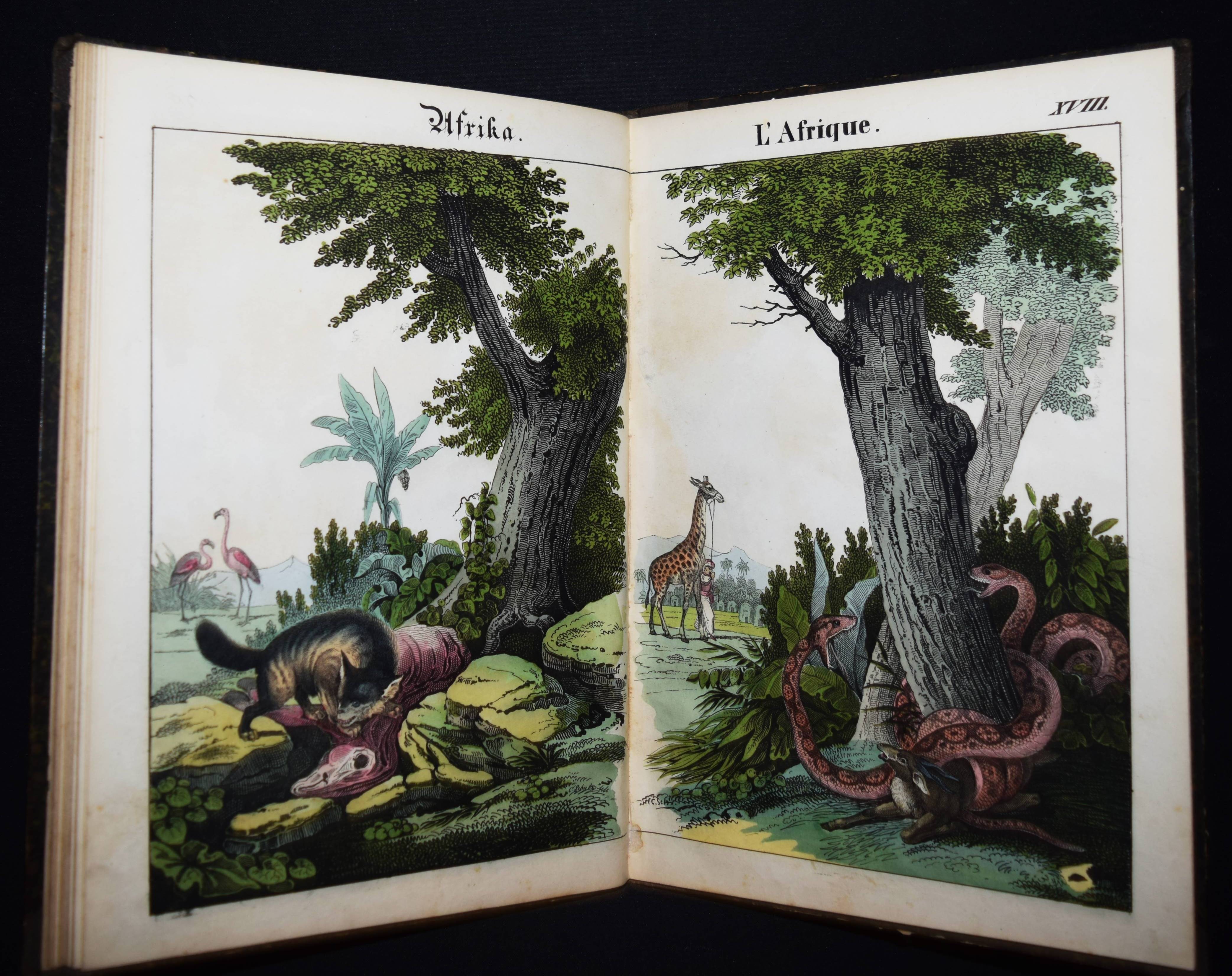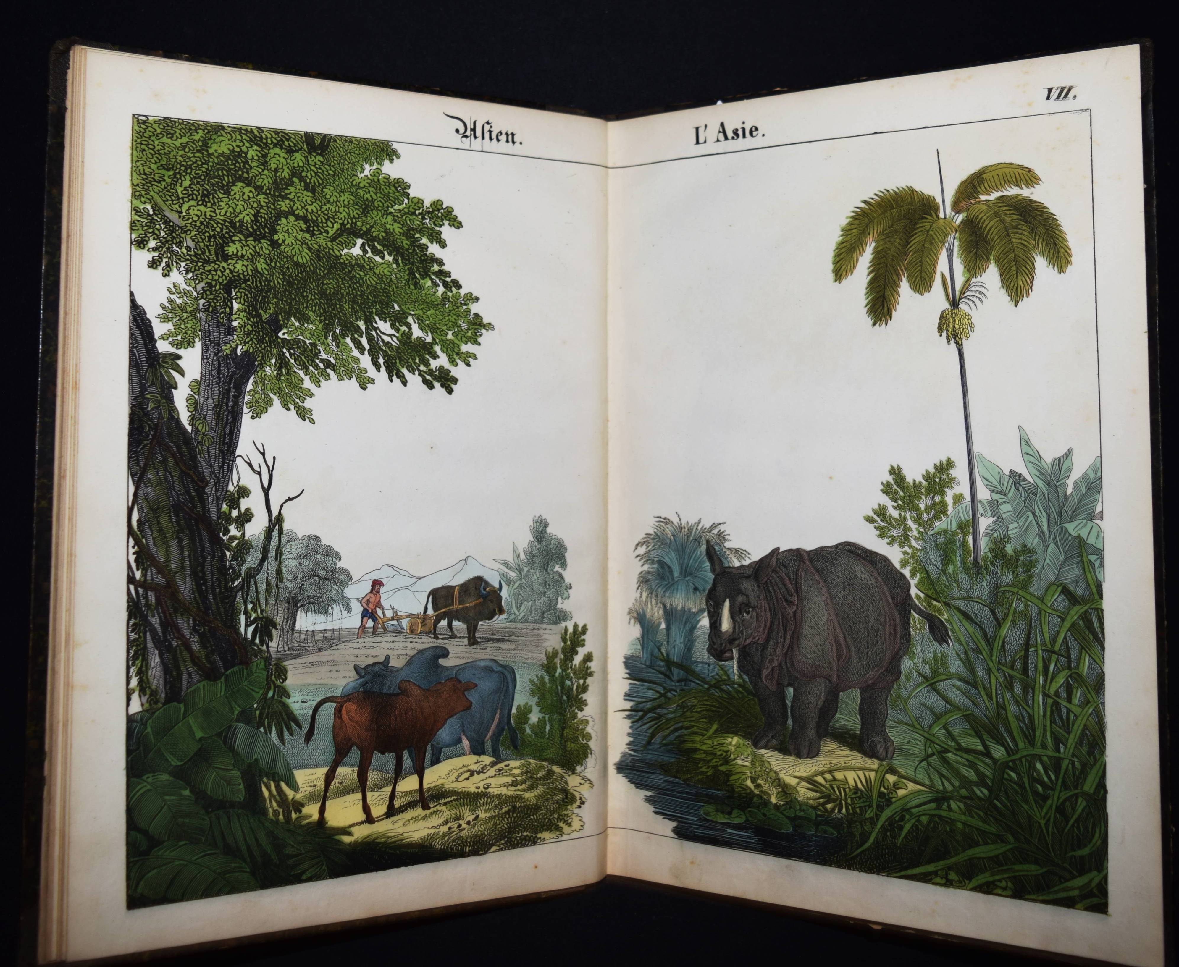 (Schmid). Bilder zum Anschauungs-Unterricht für die Jugend. Dritter Theil. Enthaltend ausländische, nach geographischen Rücksichten geordnete Naturgegenstände. Stuttgart und Esslingen, Schreiber & Schill o.J. (1846). 4°. [2] Bl., 26 S. (Text) und 30 doppelblattgr. handkol. lithogr. Tafeln von D(avid) Englert (u. a. ?). Halbleinenband der Zeit. Brunken-Hurrelmann-Pech 79 Anm. Doderer/Müller 153. Klotz, Bilderbücher 1279/1. – Zweite Ausgabe des seltenen dritten Teils dieses erfolgreichen Anschauungsbilderbuchs; die erste Ausgabe erschien 1844. Der Verlag hat erst ab 1846 (bis 1862) als „Schreiber & Schill“ firmiert. Die Vorrede stammt von Rektor Schmid. – Die schönen sorgfältig kolorierten Tafeln zeigen Tiere, Pflanzen sowie die Lebens- und Arbeitsweisen der Menschen aus Afrika, Amerika, Asien und der Polarregion. Mit Inhaltsverzeichnis in Deutsch und Französisch. – Einband leicht berieben, sehr gutes sauberes Exemplar.