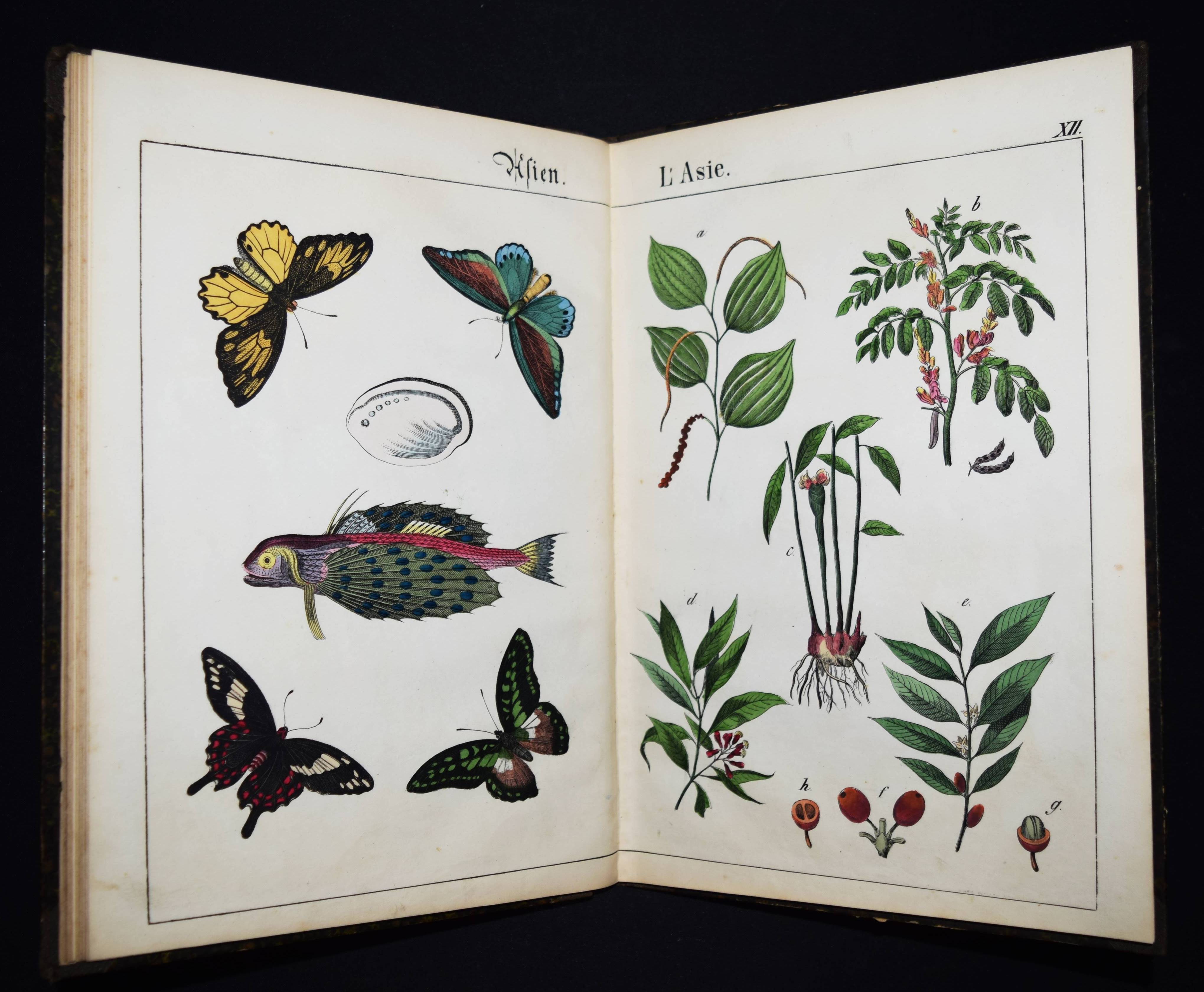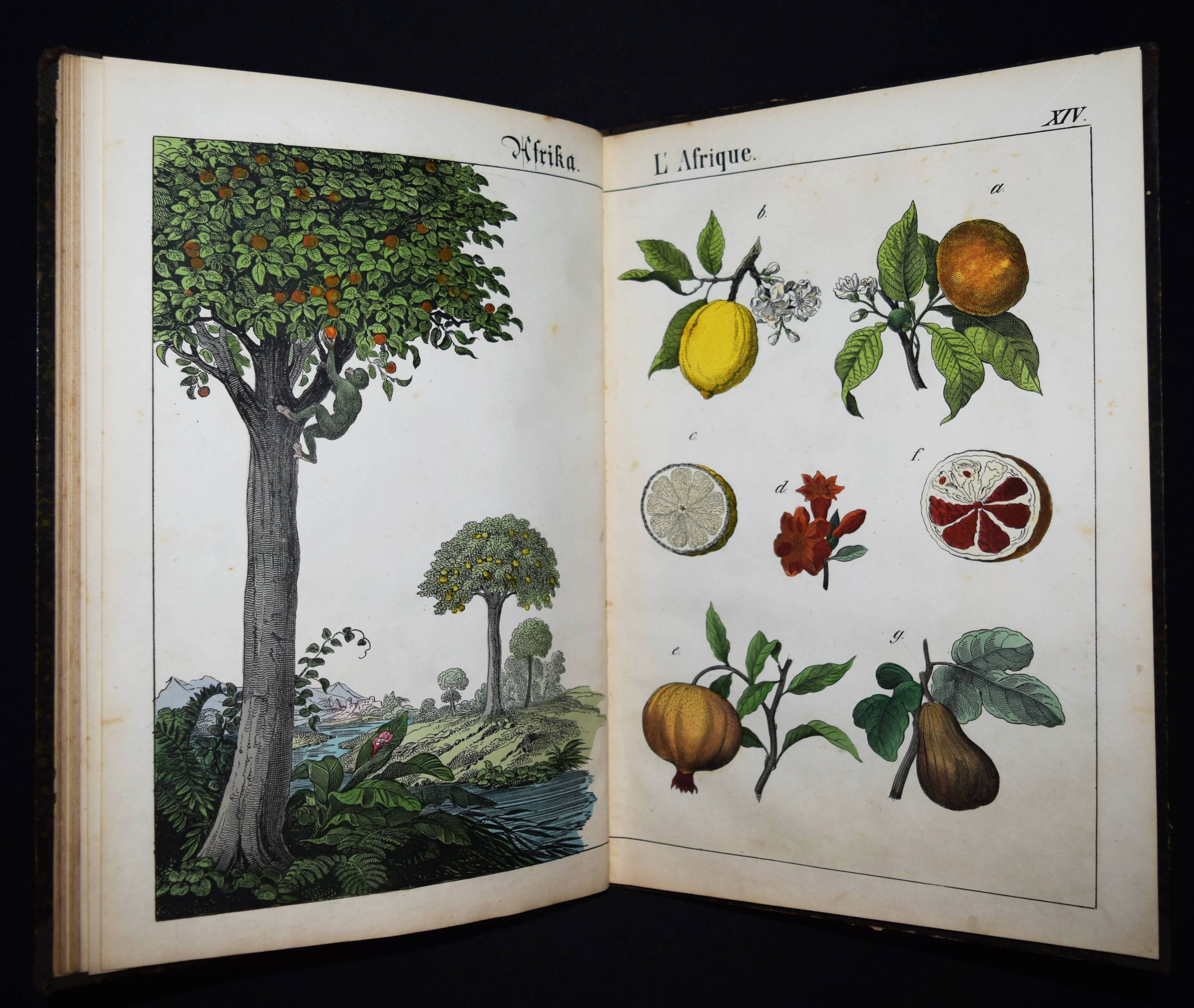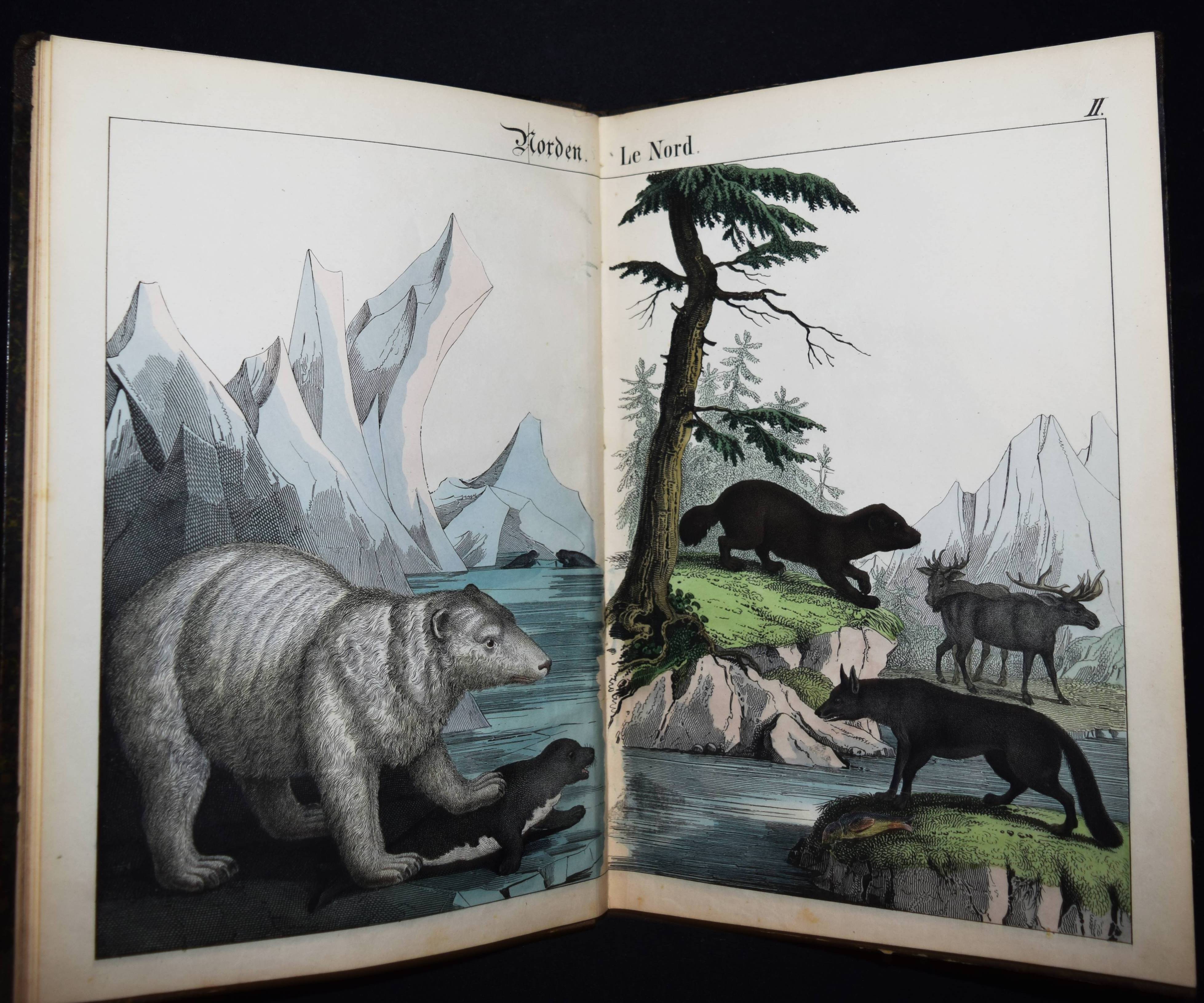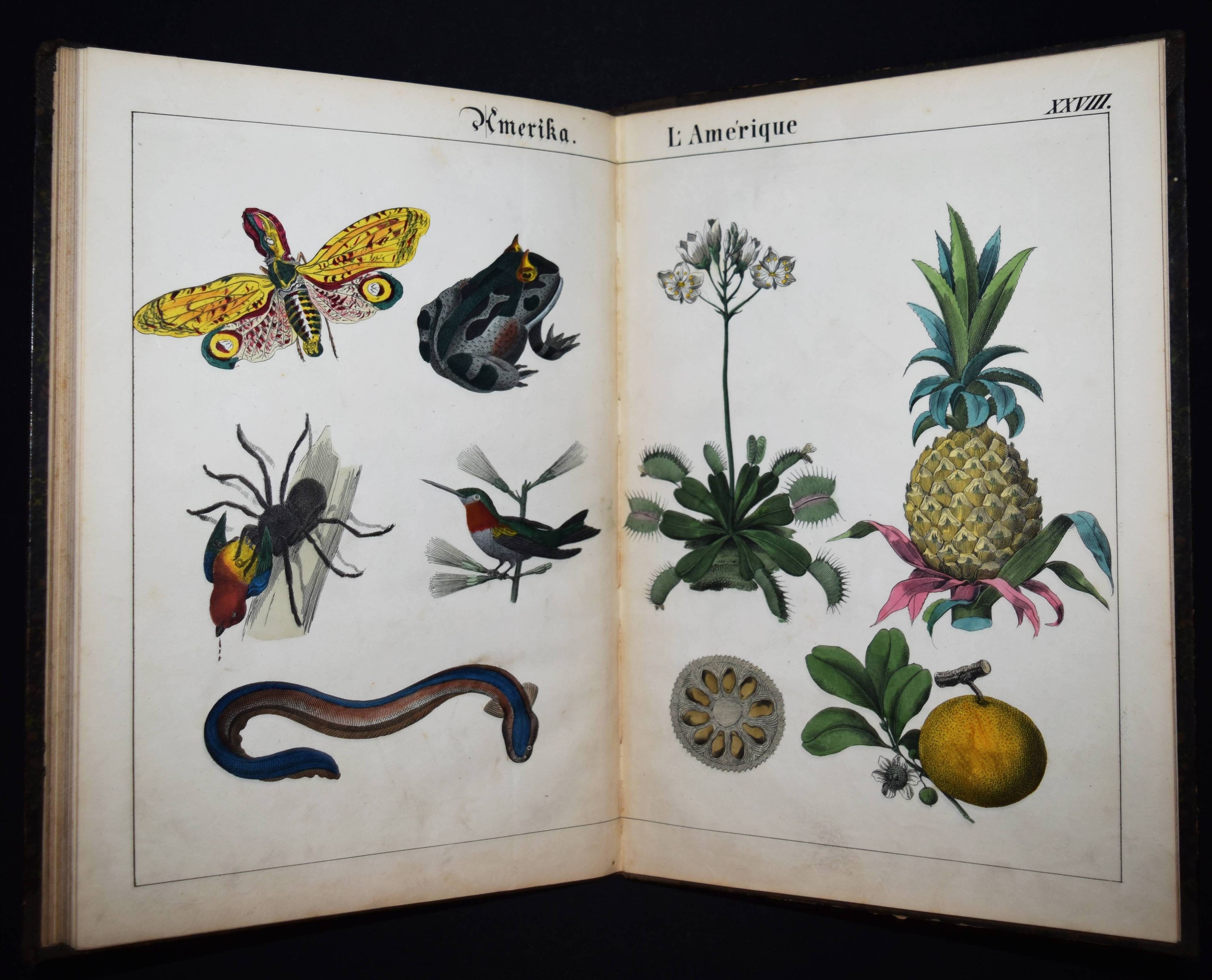 (Schmid). Bilder zum Anschauungs-Unterricht für die Jugend. Dritter Theil. Enthaltend ausländische, nach geographischen Rücksichten geordnete Naturgegenstände. Stuttgart und Esslingen, Schreiber & Schill o.J. (1846). 4°. [2] Bl., 26 S. (Text) und 30 doppelblattgr. handkol. lithogr. Tafeln von D(avid) Englert (u. a. ?). Halbleinenband der Zeit. Brunken-Hurrelmann-Pech 79 Anm. Doderer/Müller 153. Klotz, Bilderbücher 1279/1. – Zweite Ausgabe des seltenen dritten Teils dieses erfolgreichen Anschauungsbilderbuchs; die erste Ausgabe erschien 1844. Der Verlag hat erst ab 1846 (bis 1862) als „Schreiber & Schill“ firmiert. Die Vorrede stammt von Rektor Schmid. – Die schönen sorgfältig kolorierten Tafeln zeigen Tiere, Pflanzen sowie die Lebens- und Arbeitsweisen der Menschen aus Afrika, Amerika, Asien und der Polarregion. Mit Inhaltsverzeichnis in Deutsch und Französisch. – Einband leicht berieben, sehr gutes sauberes Exemplar.