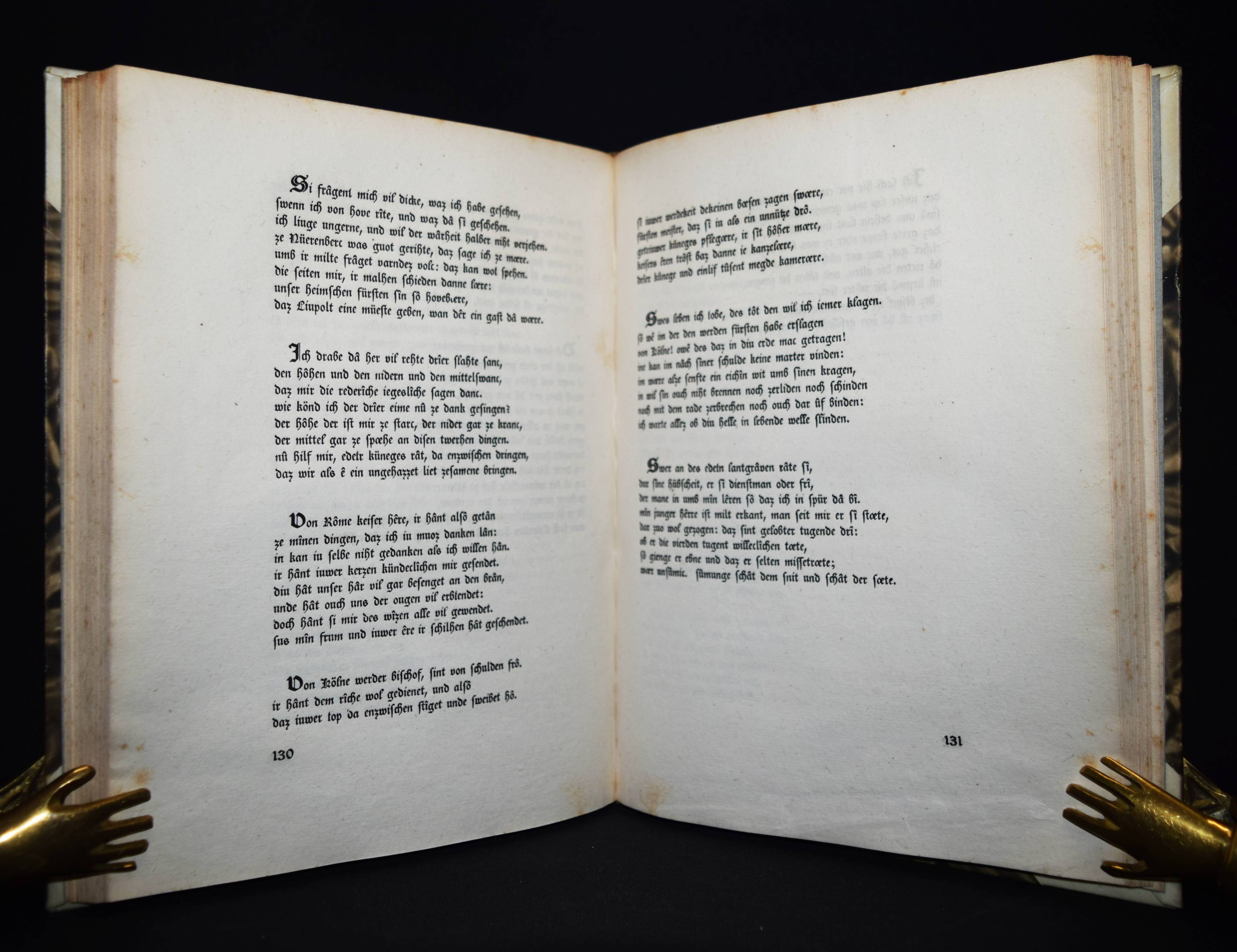 Walther von der Vogelweide. Gedichte. (Auf Grund der Lachmannschen Ausgabe von Hans Berendt herausgegeben). Leipzig, Kurt Wolff 1913. Gr.-8°. 204 S. Orig.-Halbpergamentband mit goldgepr. Rückenschild. (17. Drugulin-Druck). Erste Ausgabe. – Rückenschild etwas berieben, stellenweise etwas braunfleckig, gutes Exemplar aus der Bibliothek des Bibliotheksdirektors, Verlegers und Literaturwissenschaftlers Herbert Hans Wilhelm Stubenrauch (1896-1958)mit dessen Exlibris.
