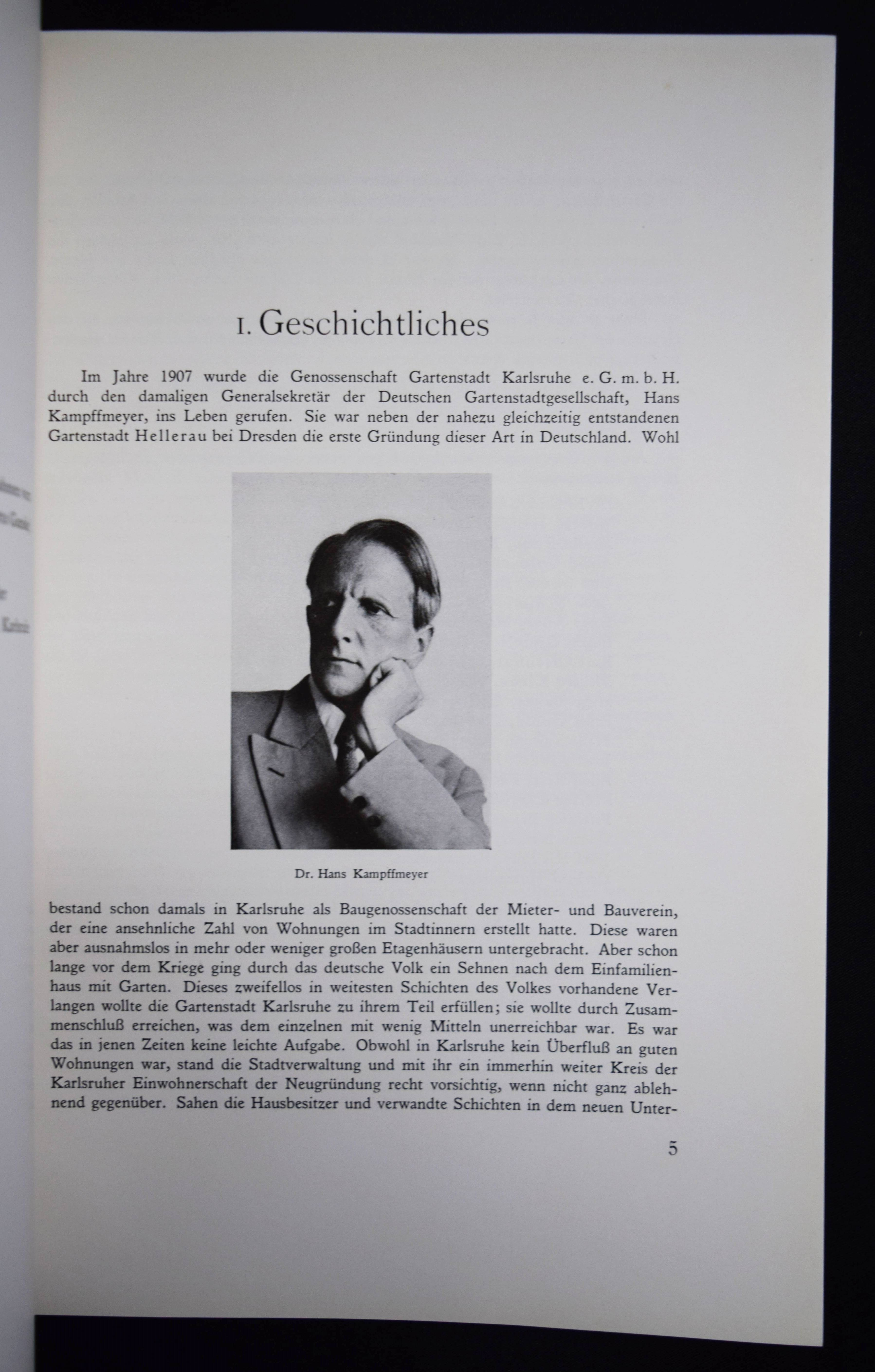 Botz, Georg. Die Gartenstadt Karlsruhe, 1907-1932. Herausgegeben … anlässlich des 25jährigen Bestehens. Karlsruhe, G. Braun 1932. 4°. 64 S. mit zahlr. Abb. Orig.-Kartonumschlag. „Die Gartenstadt Karlsruhe ist eine Wohnsiedlung im Südosten von Karlsruhe-Rüppurr, die nach den Grundsätzen einer Gartenstadt geplant und realisiert wurde. 1907 wurde die Baugenossenschaft Gartenstadt Karlsruhe eGmbH gegründet, 1911 wurde mit dem Bau der Gartenstadt begonnen, 1912 konnten die ersten 42 Häuser bezogen werden. Die Gartenstadt Karlsruhe gehört damit – neben Hellerau – zu den ältesten deutschen Gartenstädten auf der Grundlage eines gemeinschaftlichen Haus- und Grundbesitzes“ (Wikipedia). – Sehr gutes Exemplar.