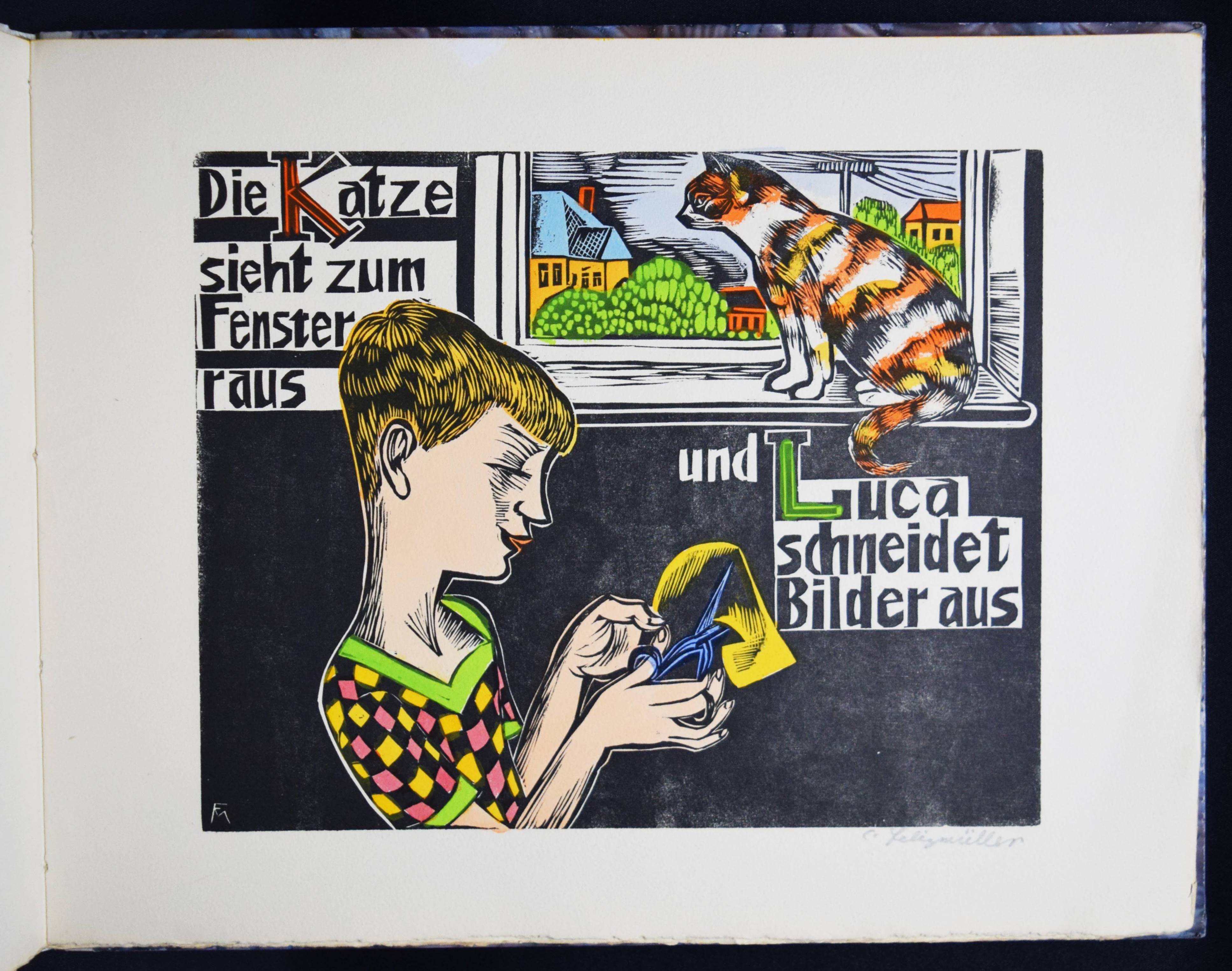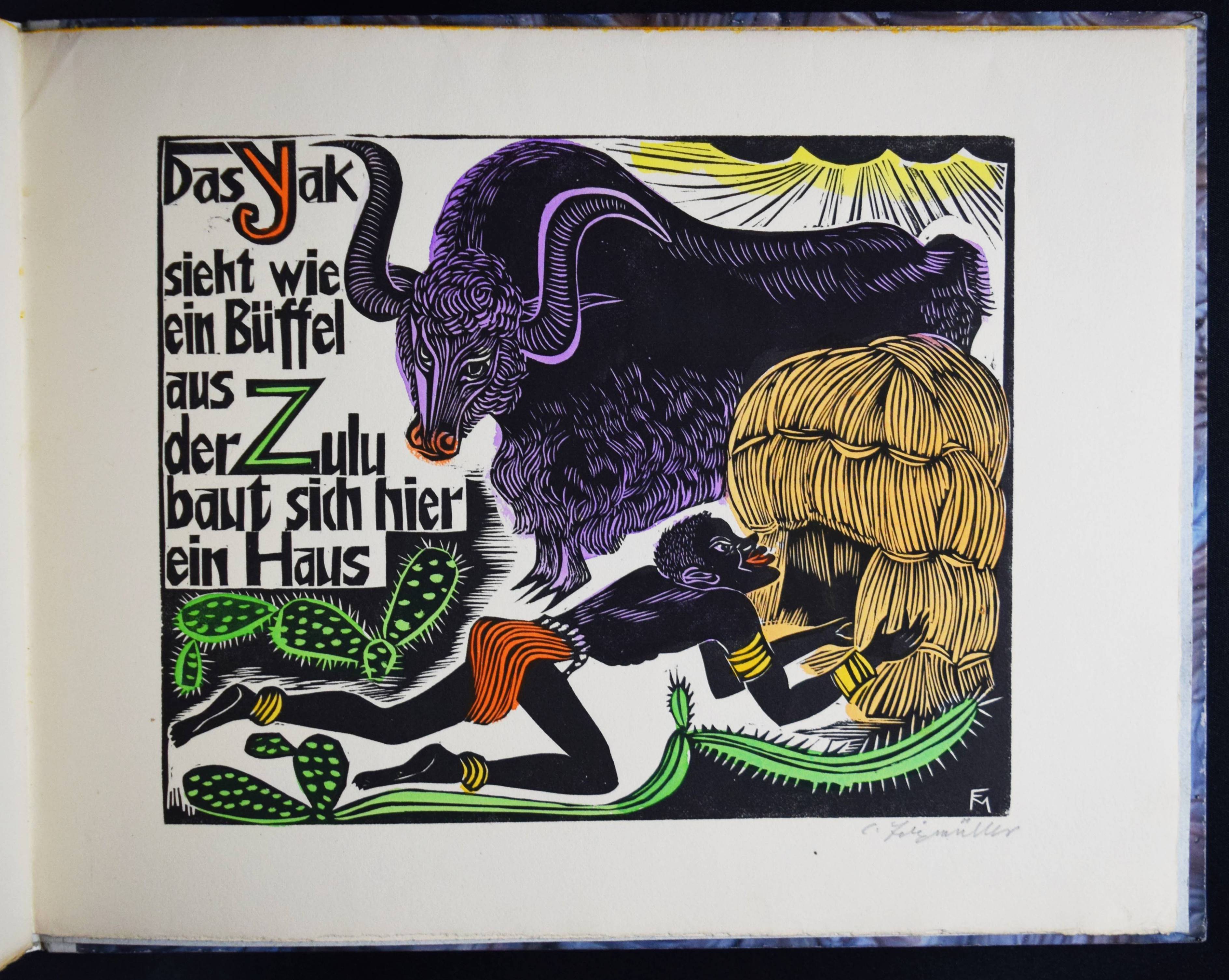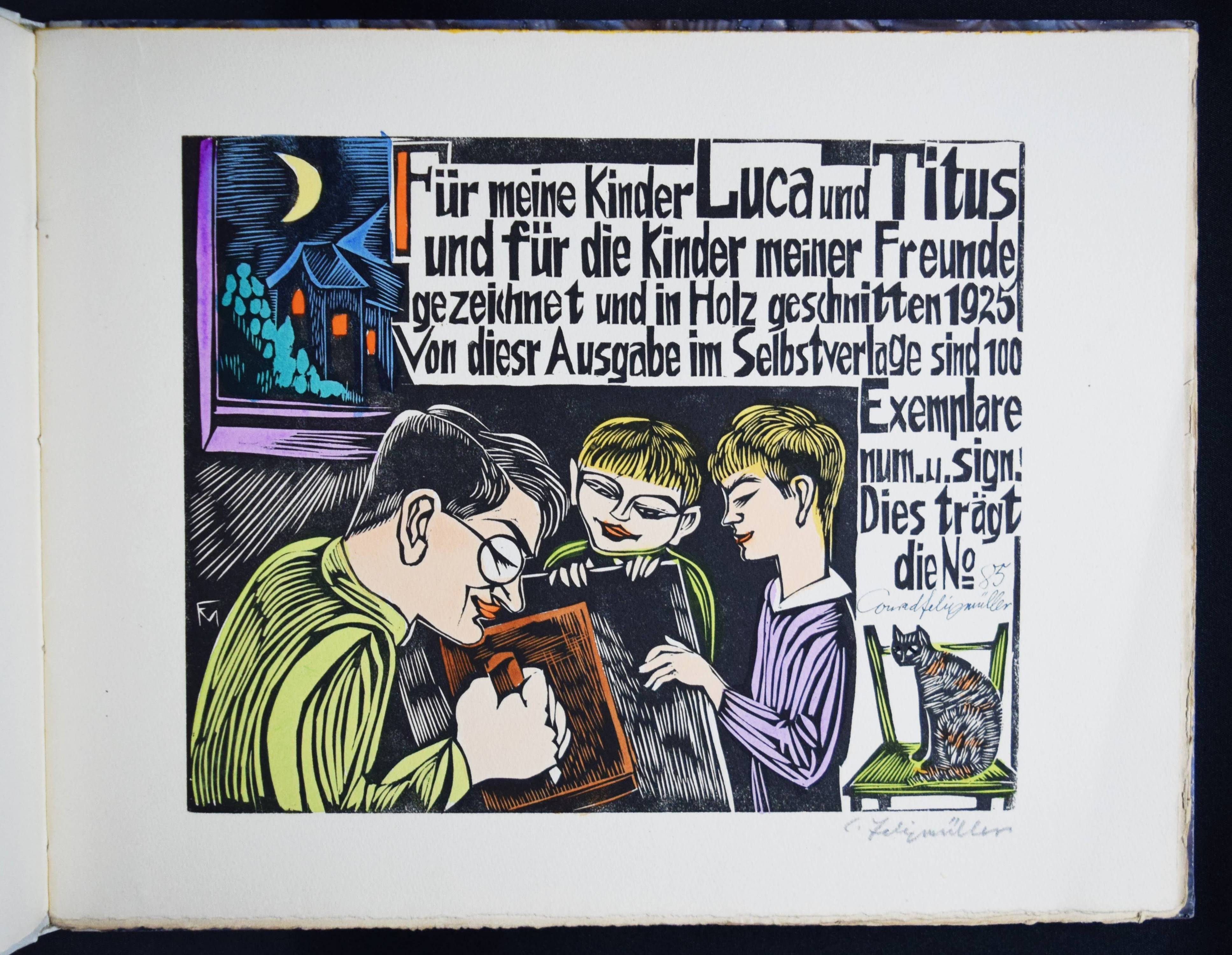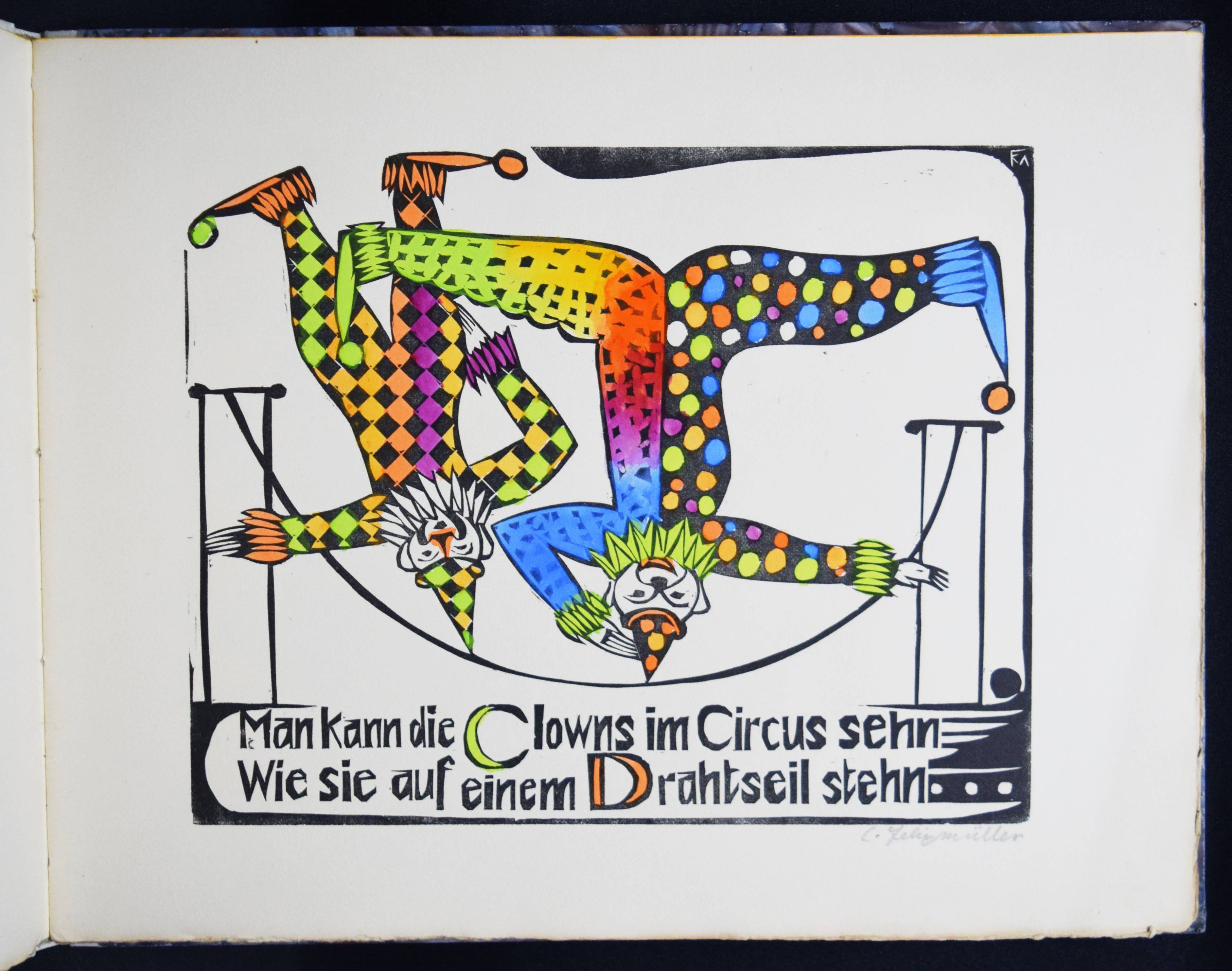 ABC – Felixmüller, Londa und Conrad. ABC. Ein geschütteltes, geknütteltes Alphabet in Bildern mit Versen. Dresden, Selbstverlag 1925. Quer-Gr.-4°. Zweifarbig gedruckter Holzschnitt-Titel und 15 eigenhändig kolorierte und signierte Holzschnitt-Tafeln. Halb-Pergamenteinband der Zeit mit goldgepr. Rückentitel. Jentsch 154. Pressler 25. Rifkind Collection 617. Söhn 348-363. – Eines von 100 num. Exemplaren auf gelblichen Ingres-Bütten (Gesamtauflage 350 Exemplare). Druckvermerk und sämtl. Holzschnitte von C. Felixmüller signiert. Eines der wenigen Exemplare, die Felixmüller selbst koloriert und jedem Holzschnitt signiert hat. Unterhalb der letzten Darstellung mit eigenhändigem Vermerk vom Künstler: „Eigenhändig coloriert – Conrad Felixmüller“ (laut Söhn wurden nur etwa 10 Exemplare vom Künstler koloriert). – „Für meine Kinder Luca und Titus und für die Kinder meiner Freunde gezeichnet und in Holz geschnitten… Unter meiner Aufsicht in der Firma F. Emil Boden Dresden im Dezember 1925 gedruckt.“ – Das wohl bedeutendste deutsche ABC-Bilderbuch des 20. Jahrhunderts mit schön kolorierten expressionistischen Holzschnitten mit Tier-, Zirkus-, Spiel- und Märchenszenen, bei dem Felixmüller ebenso wie die Autorin der Verse das Kunststück vollbringen mussten, immer zwei aufeinanderfolgende Buchstaben des Alphabets in 1 Bild und 1 Zweizeiler zu bringen: „Ein Riese ist der Elefant. Der Fotograf knipst ihn gewandt. – Die Katze sieht zum Fenster raus, und Luca schneidet Bilder aus“. – Zu seinem ABC-Buch erklärte Felixmüller am 25. April 1972: „Ich habe seiner Zeit nach der Inflation dieses kleine Bilderbuch gemacht, um unseren pekuniären wirtschaftlichen Nöten zu begegnen … Da einige Kunstfreunde sich ihre Exemplare colorieren ließen – und die noch letzten Exemplare von 1964 überhaupt nur coloriert und jedes Blatt voll signiert wurden – sind somit verschiedene Exemplare dieses Holzschnittbuches unterwegs“ (zit. nach Jentsch). Demnach handelt es sich bei dem vorliegenden Exemplar wohl wirklich um eines der wenigen Künstler-Exemplare aus den 1920er Jahren. – Sehr schönes und farbfrisches Exemplar. – One of the few rare copies colored and signed throughout by Felixmüller himself. 1 of 100 numb. copies on hand made paper (complete print run 350), publisher’s imprint and all woodcuts signed by the artist. Woodcut title, printed in two colors and 15 col. and signed woodcut plates, a nice and clean copy in fresh coloring.