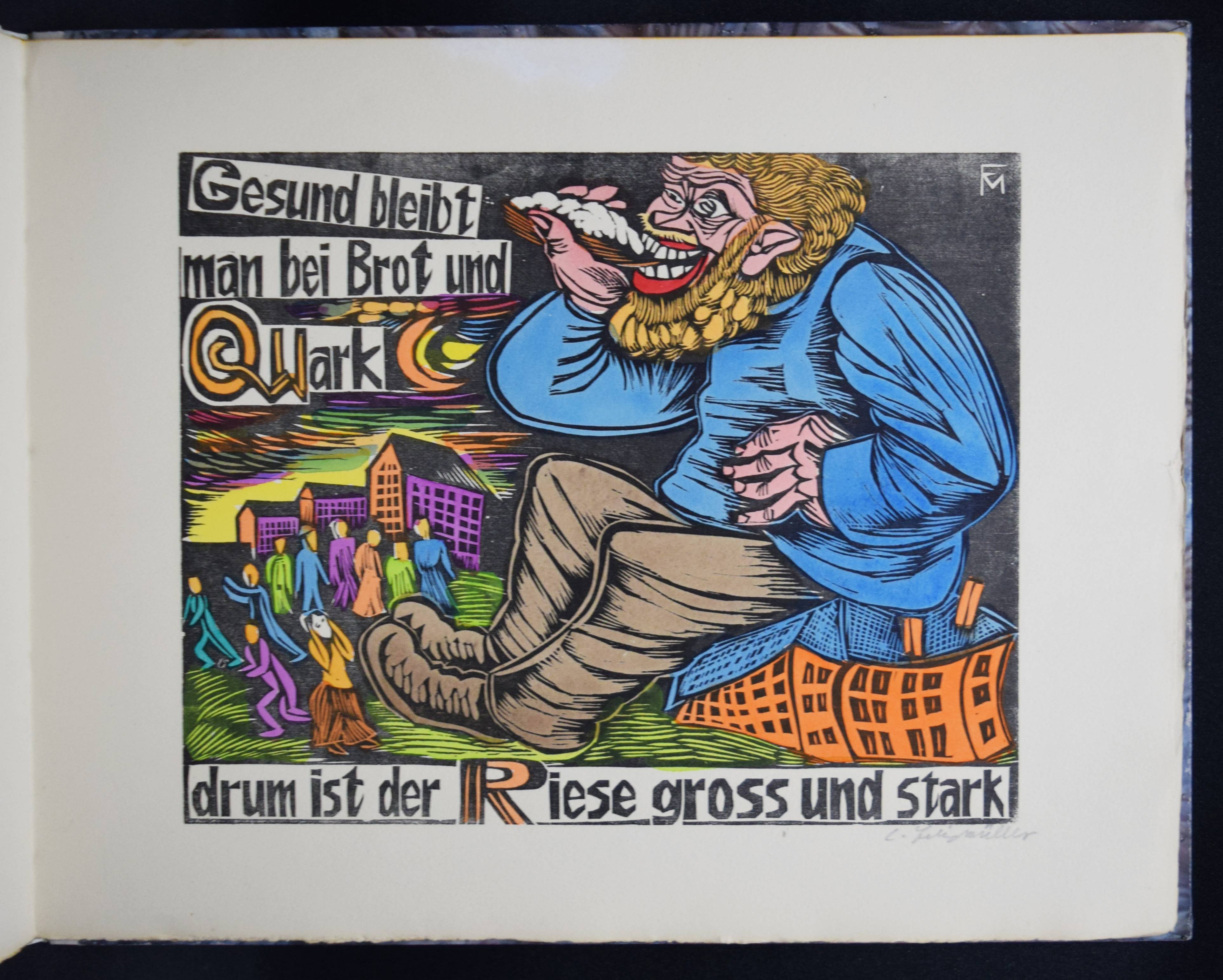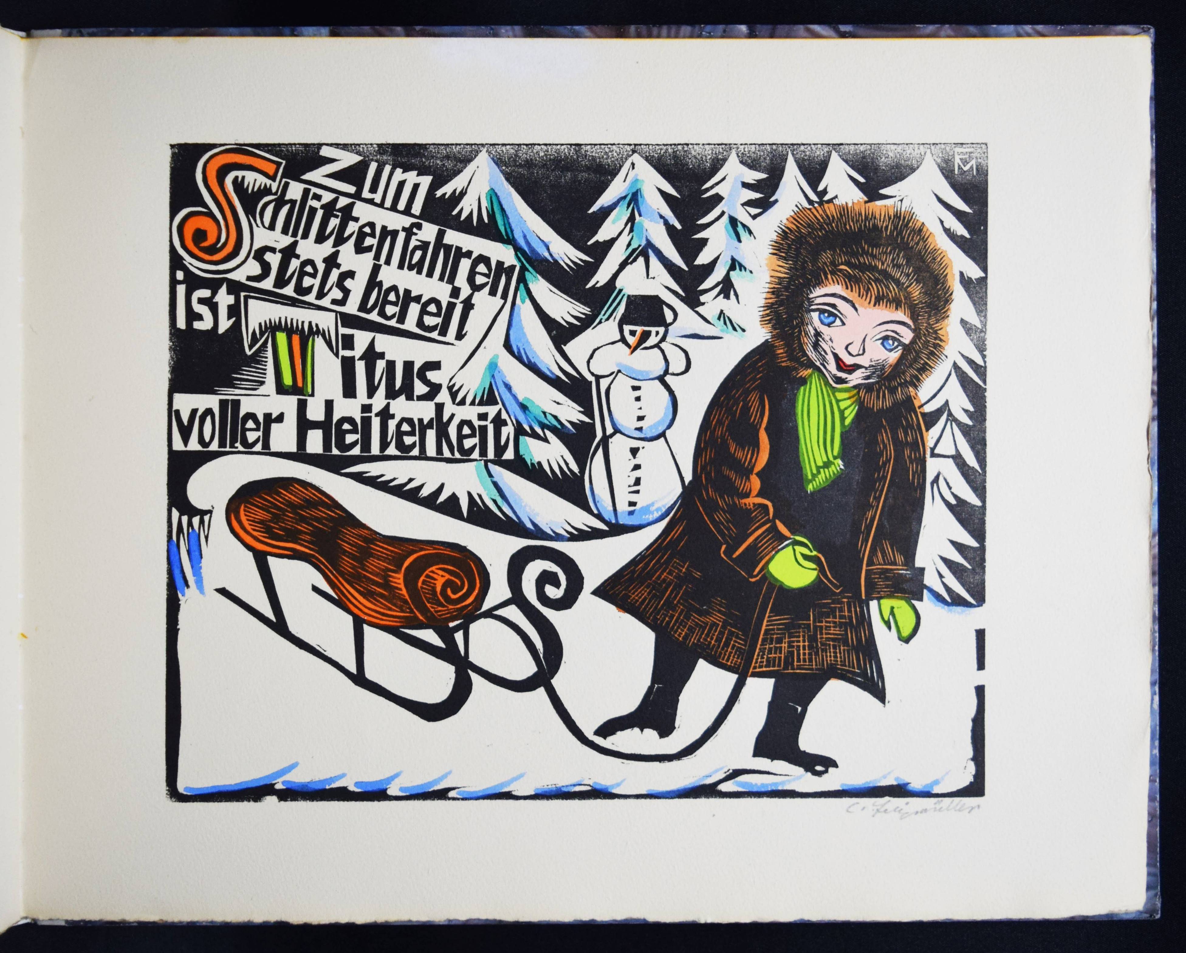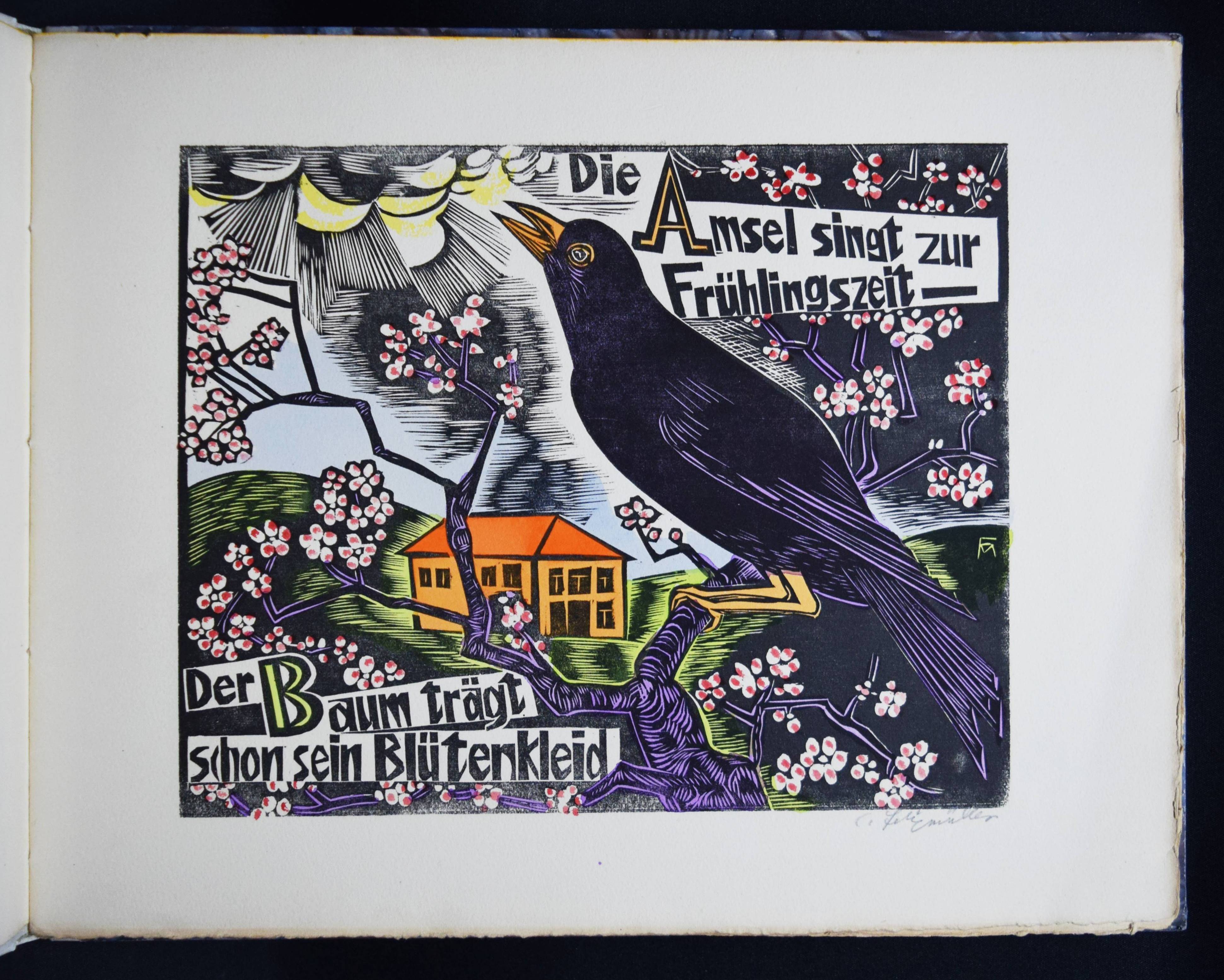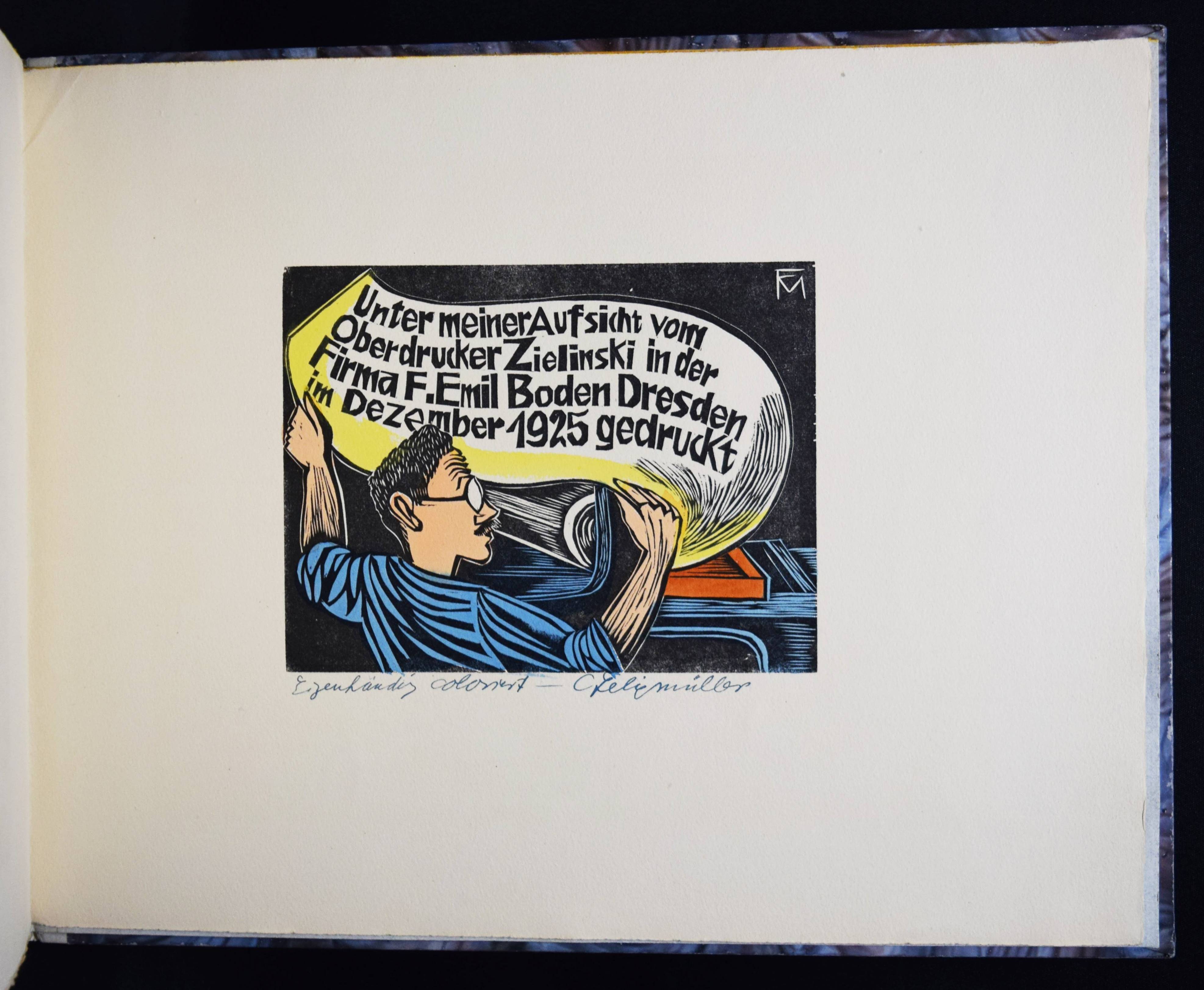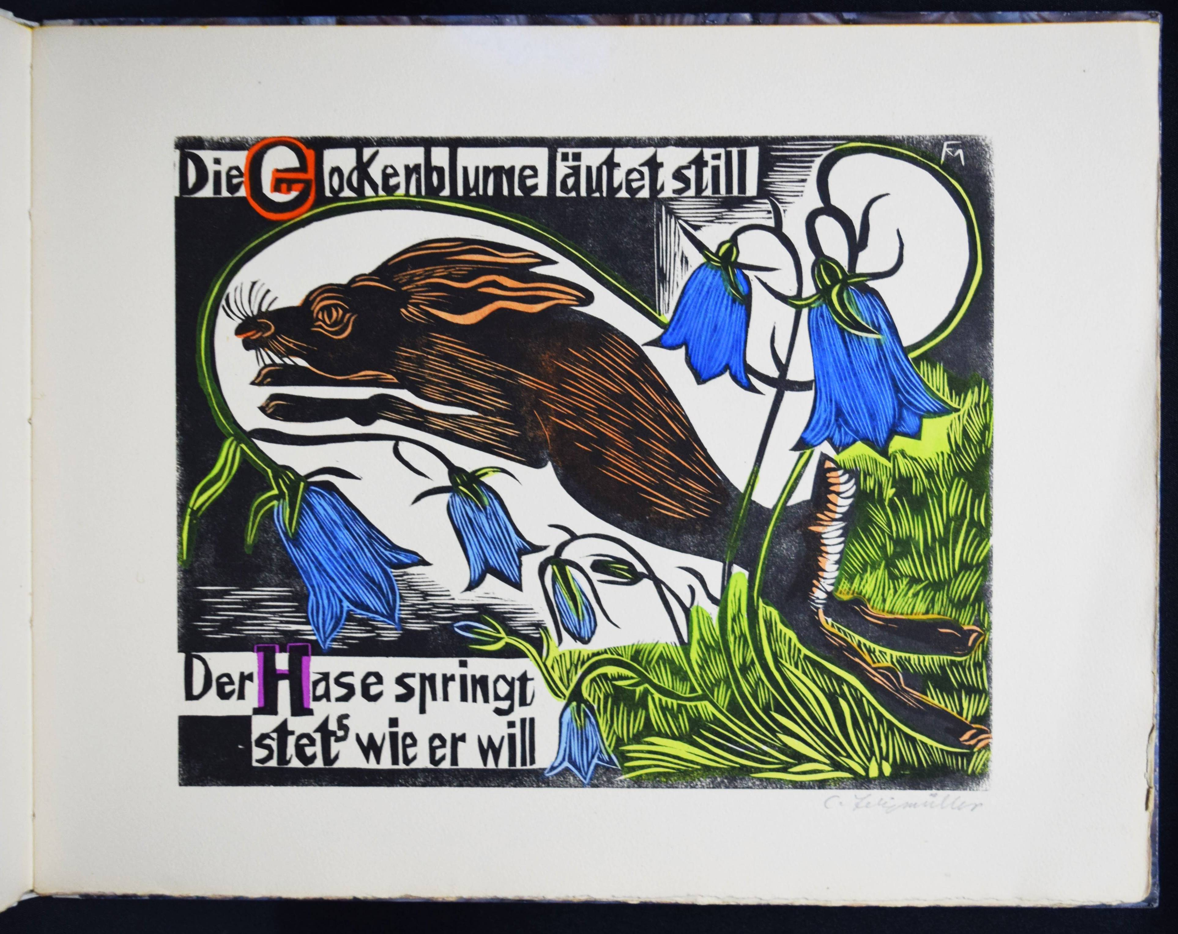 ABC – Felixmüller, Londa und Conrad. ABC. Ein geschütteltes, geknütteltes Alphabet in Bildern mit Versen. Dresden, Selbstverlag 1925. Quer-Gr.-4°. Zweifarbig gedruckter Holzschnitt-Titel und 15 eigenhändig kolorierte und signierte Holzschnitt-Tafeln. Halb-Pergamenteinband der Zeit mit goldgepr. Rückentitel. Jentsch 154. Pressler 25. Rifkind Collection 617. Söhn 348-363. – Eines von 100 num. Exemplaren auf gelblichen Ingres-Bütten (Gesamtauflage 350 Exemplare). Druckvermerk und sämtl. Holzschnitte von C. Felixmüller signiert. Eines der wenigen Exemplare, die Felixmüller selbst koloriert und jedem Holzschnitt signiert hat. Unterhalb der letzten Darstellung mit eigenhändigem Vermerk vom Künstler: „Eigenhändig coloriert – Conrad Felixmüller“ (laut Söhn wurden nur etwa 10 Exemplare vom Künstler koloriert). – „Für meine Kinder Luca und Titus und für die Kinder meiner Freunde gezeichnet und in Holz geschnitten… Unter meiner Aufsicht in der Firma F. Emil Boden Dresden im Dezember 1925 gedruckt.“ – Das wohl bedeutendste deutsche ABC-Bilderbuch des 20. Jahrhunderts mit schön kolorierten expressionistischen Holzschnitten mit Tier-, Zirkus-, Spiel- und Märchenszenen, bei dem Felixmüller ebenso wie die Autorin der Verse das Kunststück vollbringen mussten, immer zwei aufeinanderfolgende Buchstaben des Alphabets in 1 Bild und 1 Zweizeiler zu bringen: „Ein Riese ist der Elefant. Der Fotograf knipst ihn gewandt. – Die Katze sieht zum Fenster raus, und Luca schneidet Bilder aus“. – Zu seinem ABC-Buch erklärte Felixmüller am 25. April 1972: „Ich habe seiner Zeit nach der Inflation dieses kleine Bilderbuch gemacht, um unseren pekuniären wirtschaftlichen Nöten zu begegnen … Da einige Kunstfreunde sich ihre Exemplare colorieren ließen – und die noch letzten Exemplare von 1964 überhaupt nur coloriert und jedes Blatt voll signiert wurden – sind somit verschiedene Exemplare dieses Holzschnittbuches unterwegs“ (zit. nach Jentsch). Demnach handelt es sich bei dem vorliegenden Exemplar wohl wirklich um eines der wenigen Künstler-Exemplare aus den 1920er Jahren. – Sehr schönes und farbfrisches Exemplar. – One of the few rare copies colored and signed throughout by Felixmüller himself. 1 of 100 numb. copies on hand made paper (complete print run 350), publisher’s imprint and all woodcuts signed by the artist. Woodcut title, printed in two colors and 15 col. and signed woodcut plates, a nice and clean copy in fresh coloring.