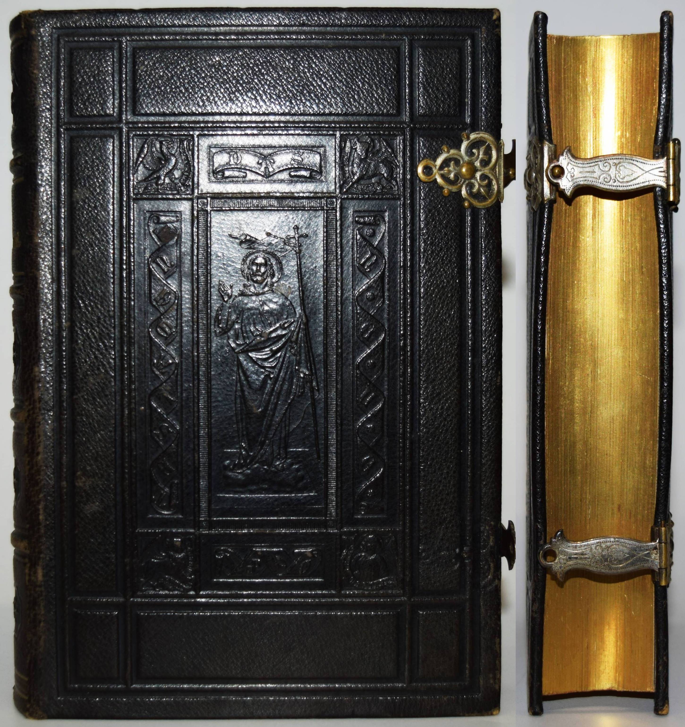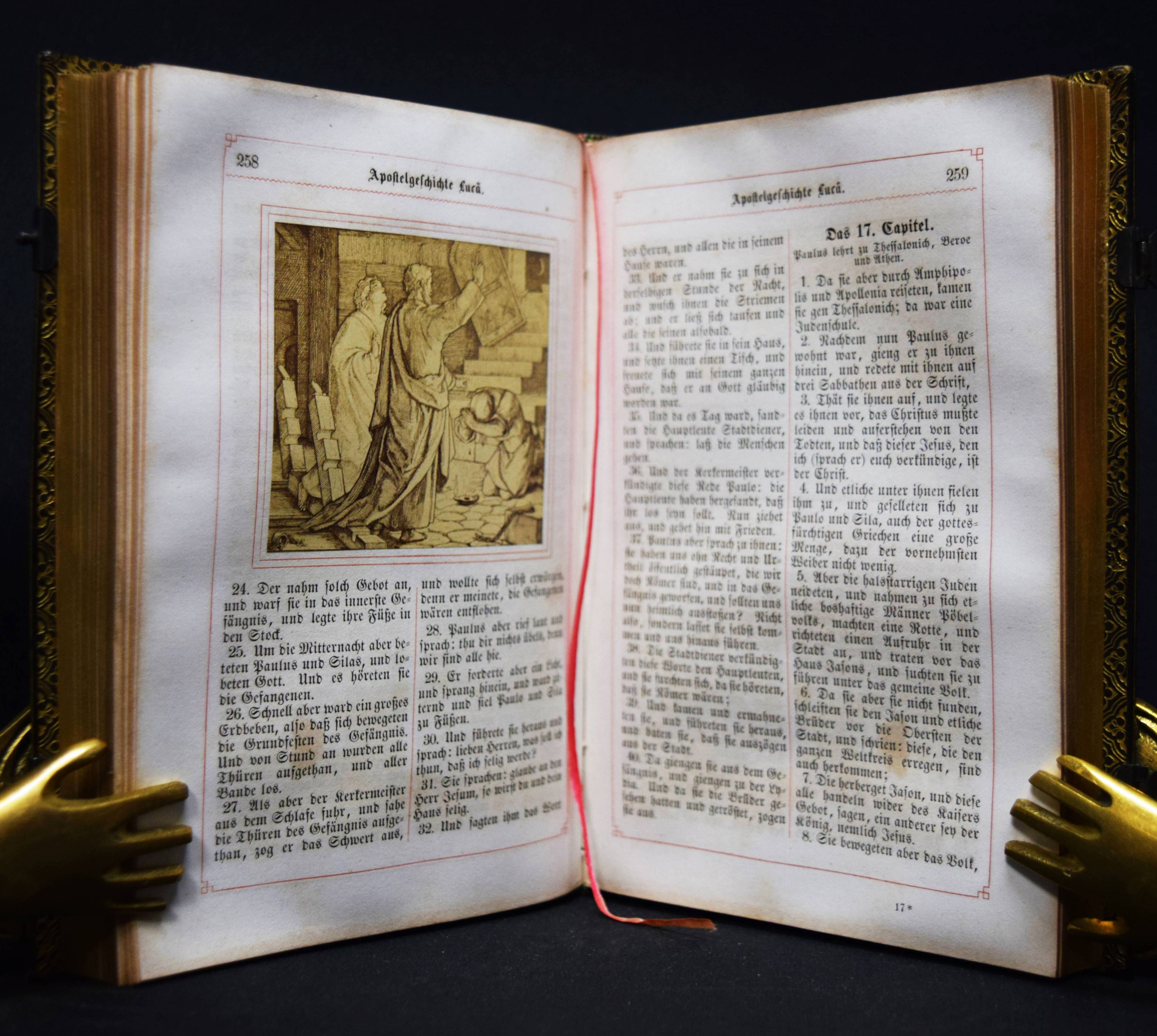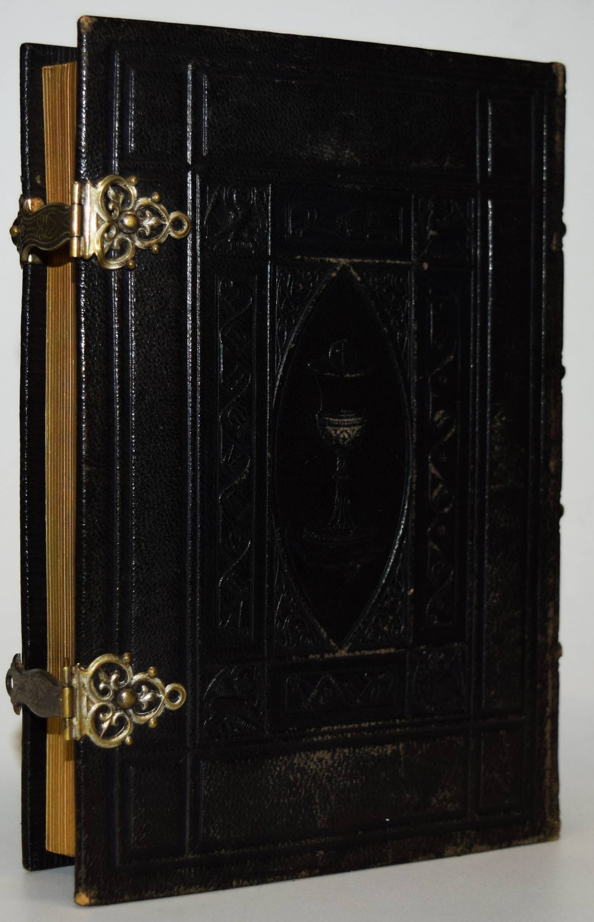 Albert – Luther, Martin (Übers.). Das Neue Testament unsers Herrn u. Heilandes Jesu Christi (und) Der Psalter. Mit Photographien der ersten Künstler Deutschlands (u. a. Ludwig Richter, Rethel, Schnorr v. Carolsfeld, Strähuber und G. Jäger). (2. Auflage). Leipzig, F. A. Brockhaus o. J. (1869). 8°. Titel in Rot und Schwarz, 484 S., [2] Bl.; Titel, 110 S., [1] Bl. mit 46 (2 ganzs.) mont. Orig.-Photographien (Abuminabzüge, meist ca. 5,5 x 6 cm.) von Joseph Albert. Blindgepr. Chagrin-Ledereinband mit goldgepr. Rückentitel, 2 Messingschließen und Goldschnitt. Heidtmann, Wie das Photo ins Buch kam1444. – Die ersten deutschen Bibel-Illustrationen in Fotografie, hier in der um den Psalter mit 2 Fotos erweiterten zweiten Ausgabe. Die erste Ausgabe erschien 1860 bei Cotta. 1850 erschien bei Cotta eine Quartausgabe mit den Illustrationen in Holzschnitten. – J. Albert (1825-1886), seit 1858 Hofphotograph in München und „Meister der Reproduktionsphotographie“ (F. Heidtmann), stattete bereits 1859 eine Prachtausgabe von Schillers Gedichten für Cotta mit Fotografien aus. – „Kein anderer etablierter Verlag beschäftigte sich damals in nennenswertem Umfange mit der Illustration durch Photographien. Für dieses Gebiet entstanden vielmehr neue Verlage, wie die von Schauer, Bruckmann, Hanfstaengl und Albert. Cotta war illustrationstechnisch interessiert und pflegte auch ein wenig das schöne illustrierte Buch, er stand auch neuen technischen Entwicklungen auf dem Bereich der Buchherstellung aufgeschlossen gegenüber. Der riesige und enorm reiche Verlag hatte neben ‚Schöner Literatur‘ ein breites Programm mit Titeln aus allen Fachgebieten, so auch Medizin und Kunst. Was Cotta ¡m einzelnen bewog, die Photographie in so verschiedenen Fachgebieten einzusetzen und warum Cotra nicht weiter mit Photographien illustrierte Bücher herausgab, ist nicht bekannt. möglicherweise bestanden Zweifel hinsichtlich der Haltbarkeit der Photographien, ein damals viel diskutiertes Thema, obwohl es mit Albert als Fachmann sicher keinen Grund für diese Befürchtungen gab. Oder aber die (zu) teuren Bände waren einfach kein Geschäft“ (F. Heidtmann S. 83). – Rücken und Kanten etwas berieben, ein Verschlußteil einer Schließe fehlt, nur vereinzelt etwas braunfleckig, sonst gut erhalten.