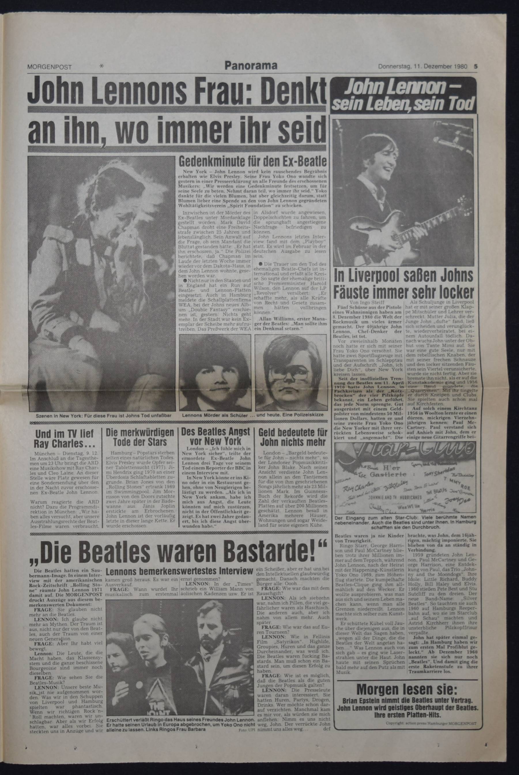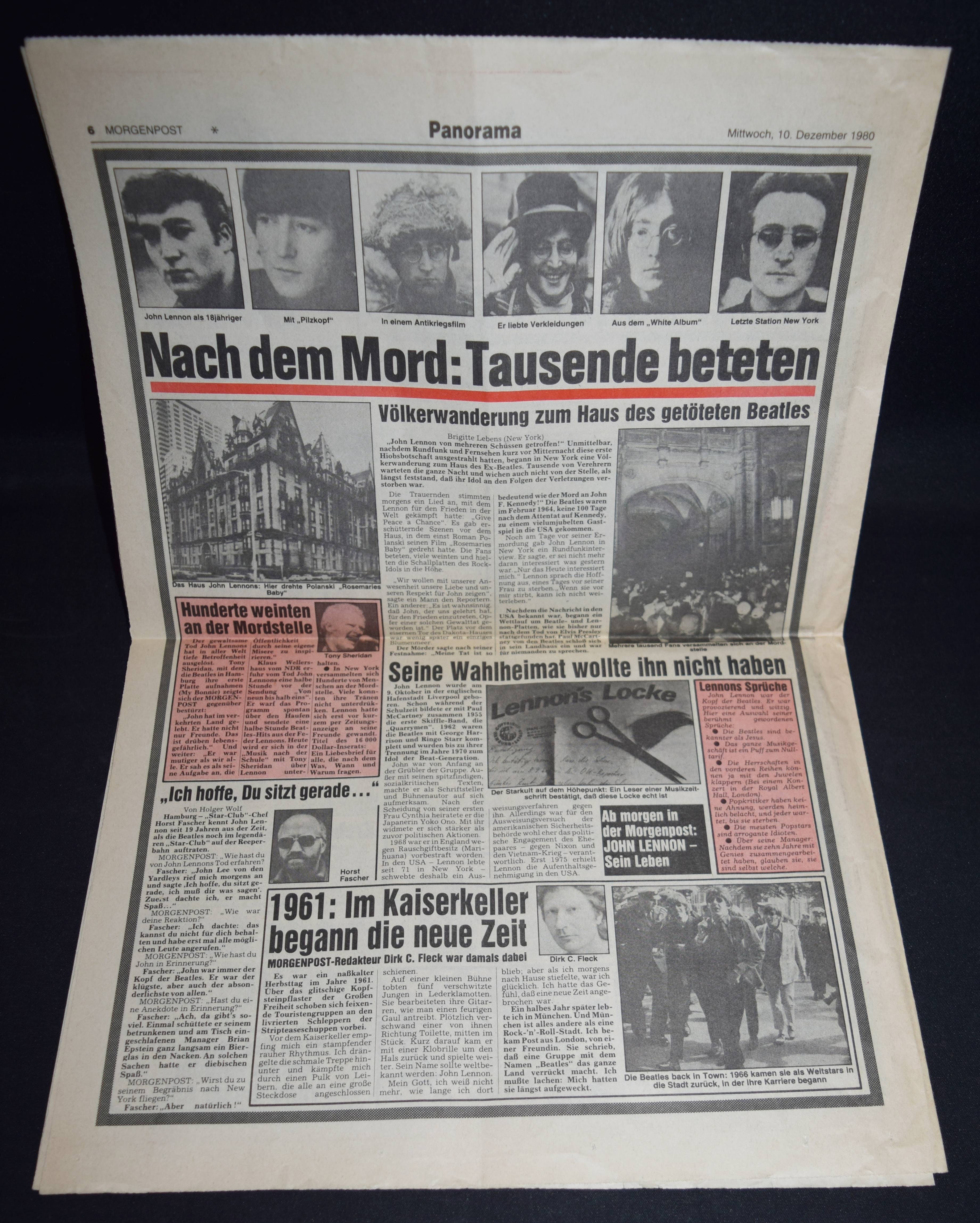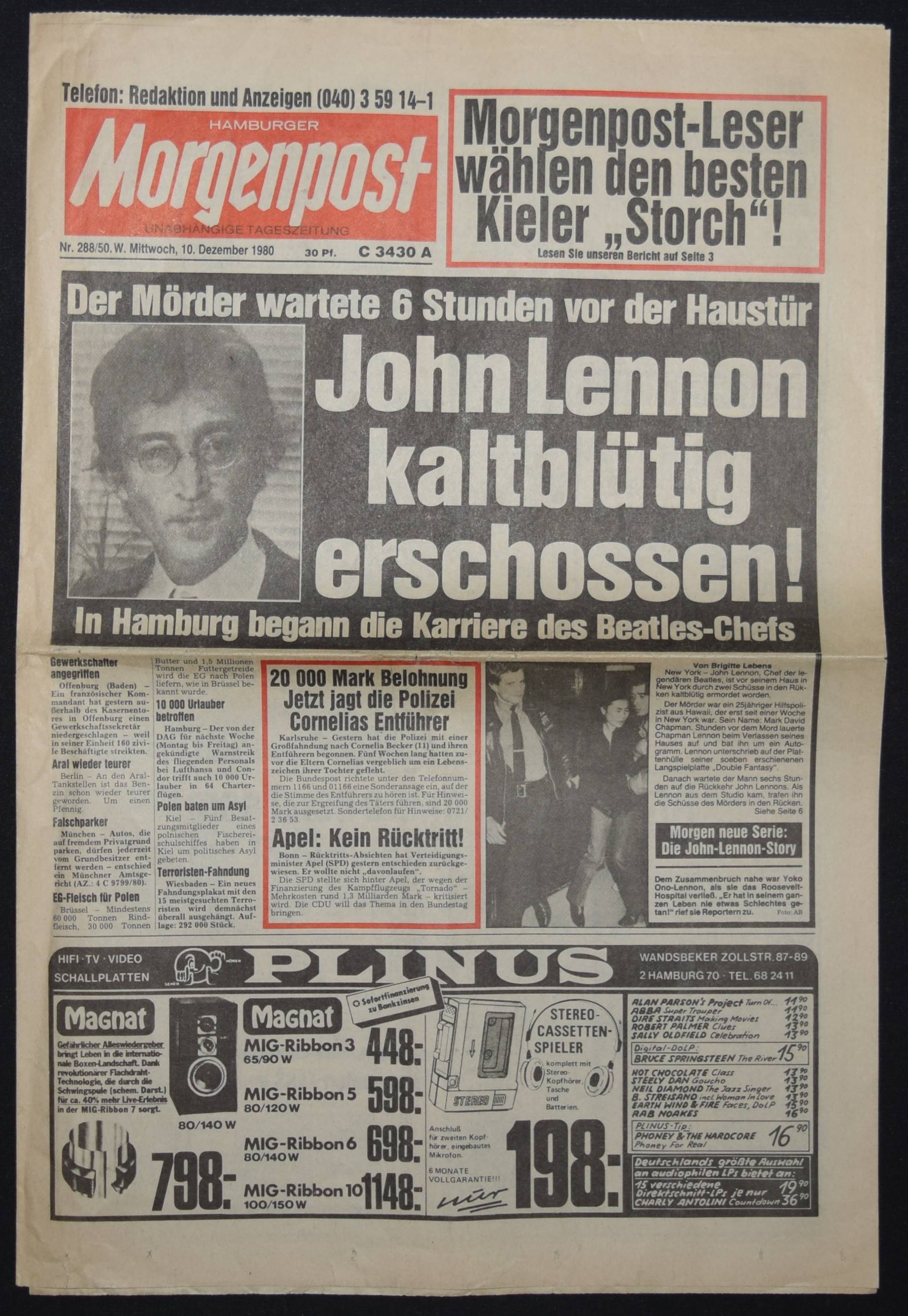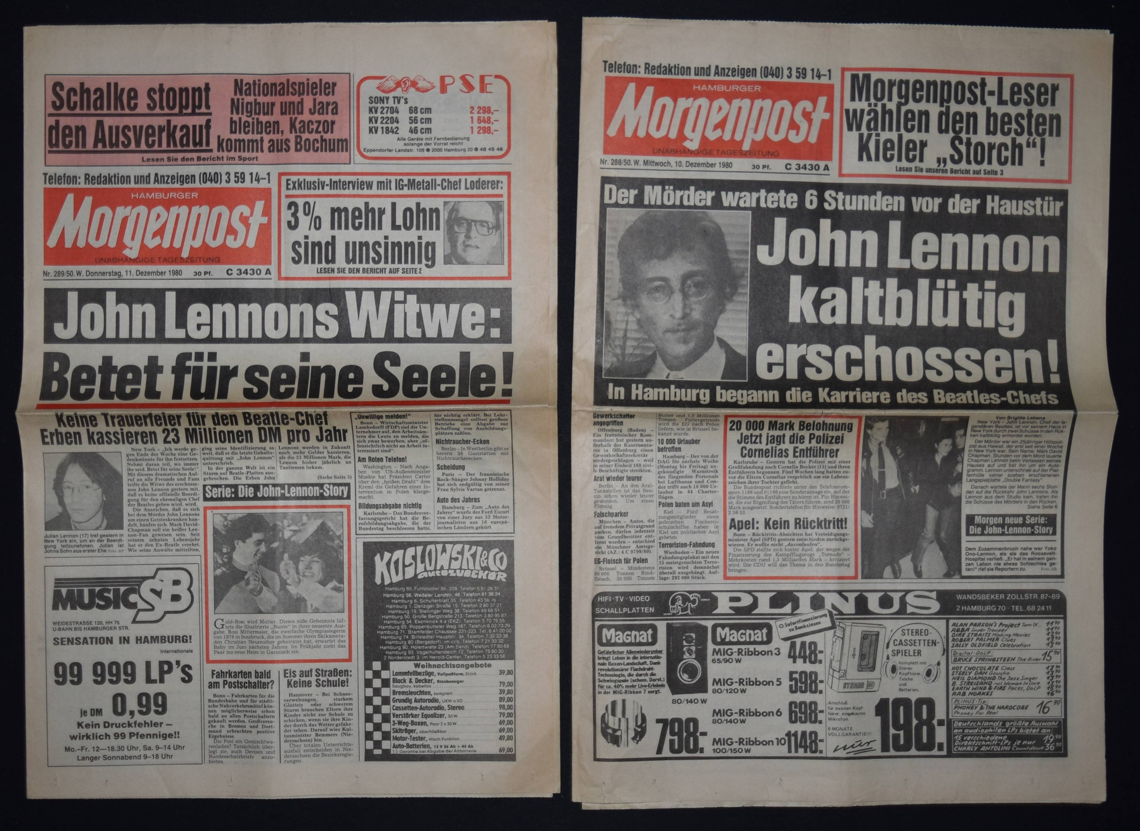 Lennon – Lebens, Brigitte. John Lennon kaltblütig erschossen! Der Mörder wartete 6 Stunden vor der Haustür. In Hamburg begann die Karriere des Beatles-Chefs. – (Und): John Lennons Wittwe: Betet für seine Seele! – Titel-Schlagzeilen in: Hamburger Morgenpost. Nr. 288/50. Mittwoch, 10. Dezember 1980 (und) Nr. 289/50. Donnerstag, 11. Dezember 1980. 2 Tages-Zeitungen. Hamburg 1980. Gr.-4°. Jeweils 6 S. mit zahlr. Abb. Das erste Heft mit einem Artikel von B. Lebens auf der Titelseite und der letzten Seite sowie zwei weiteren Beiträgen von Holger Wolf und Dirk C. Fleck. – Das zweite Heft über Lennons Trauerfeier, „Lennons bemerkenswertesten Interview: Die Beatles waren Bastarde“ (Auszüge aus einem Interview im Rolling Stone von 1971) und weiteren Artikeln. – Beide Hefte in der Mitte horizontal gefaltet, papierbedingt etwas gebräunt, sehr gut erhalten.