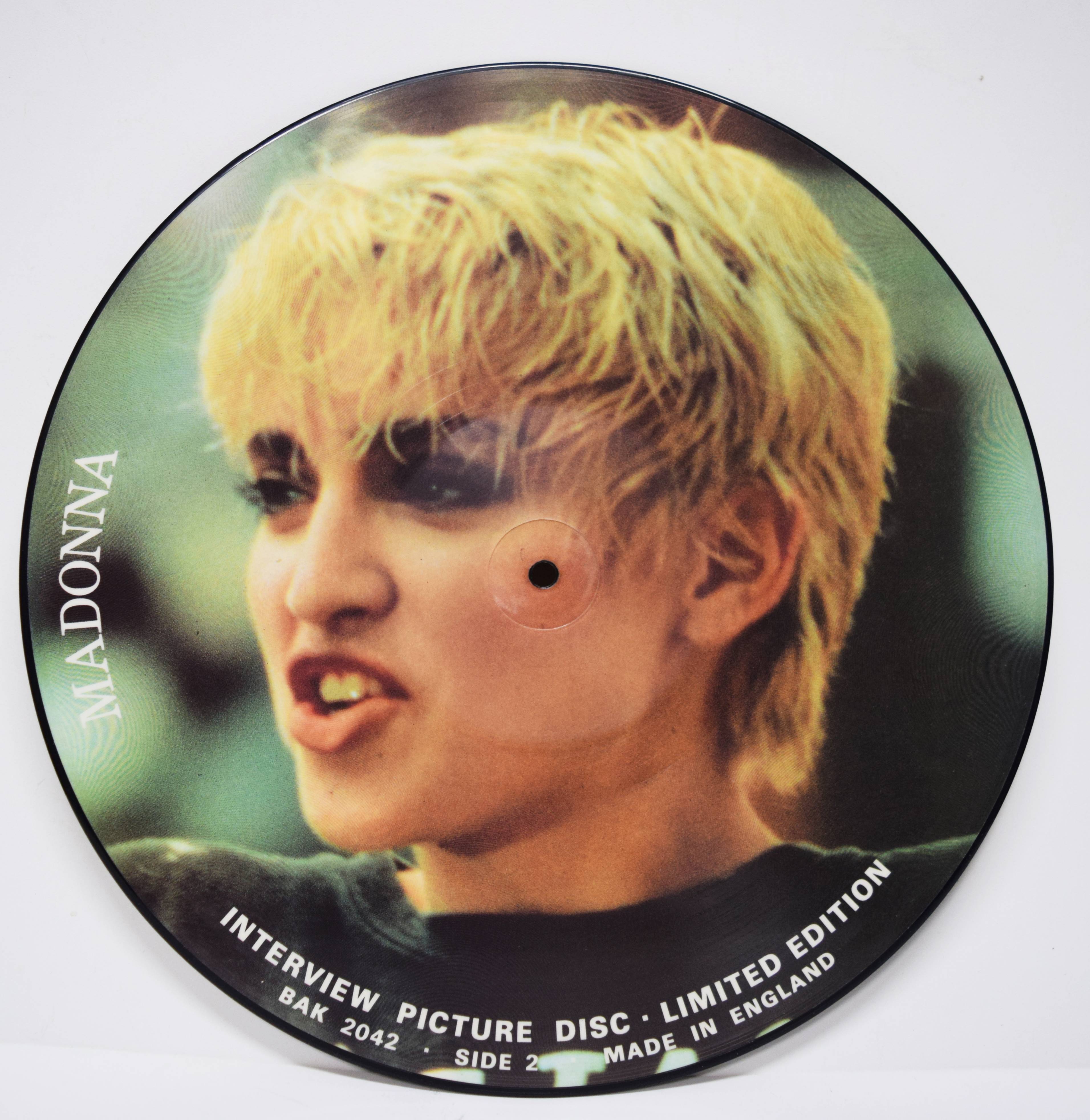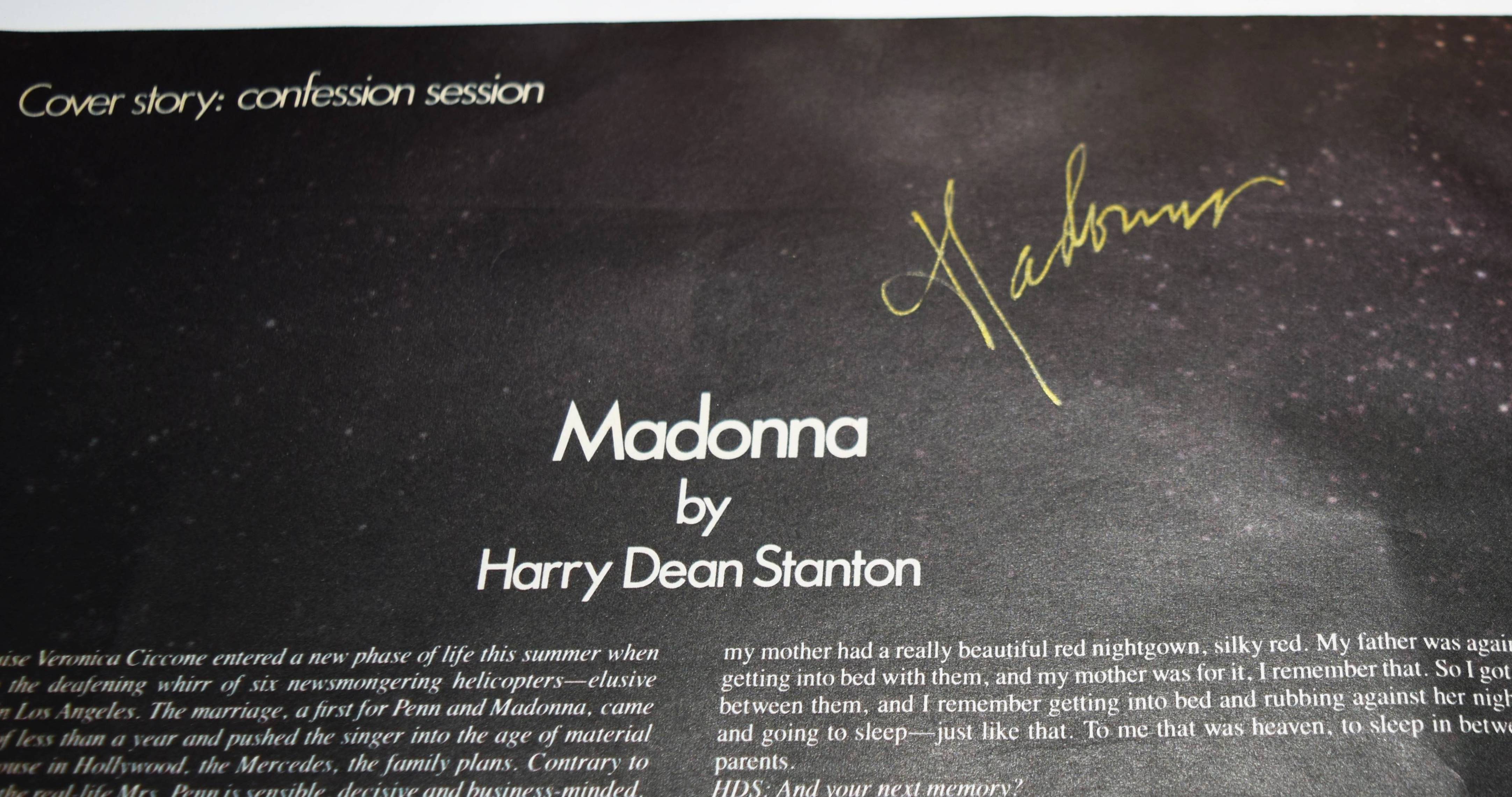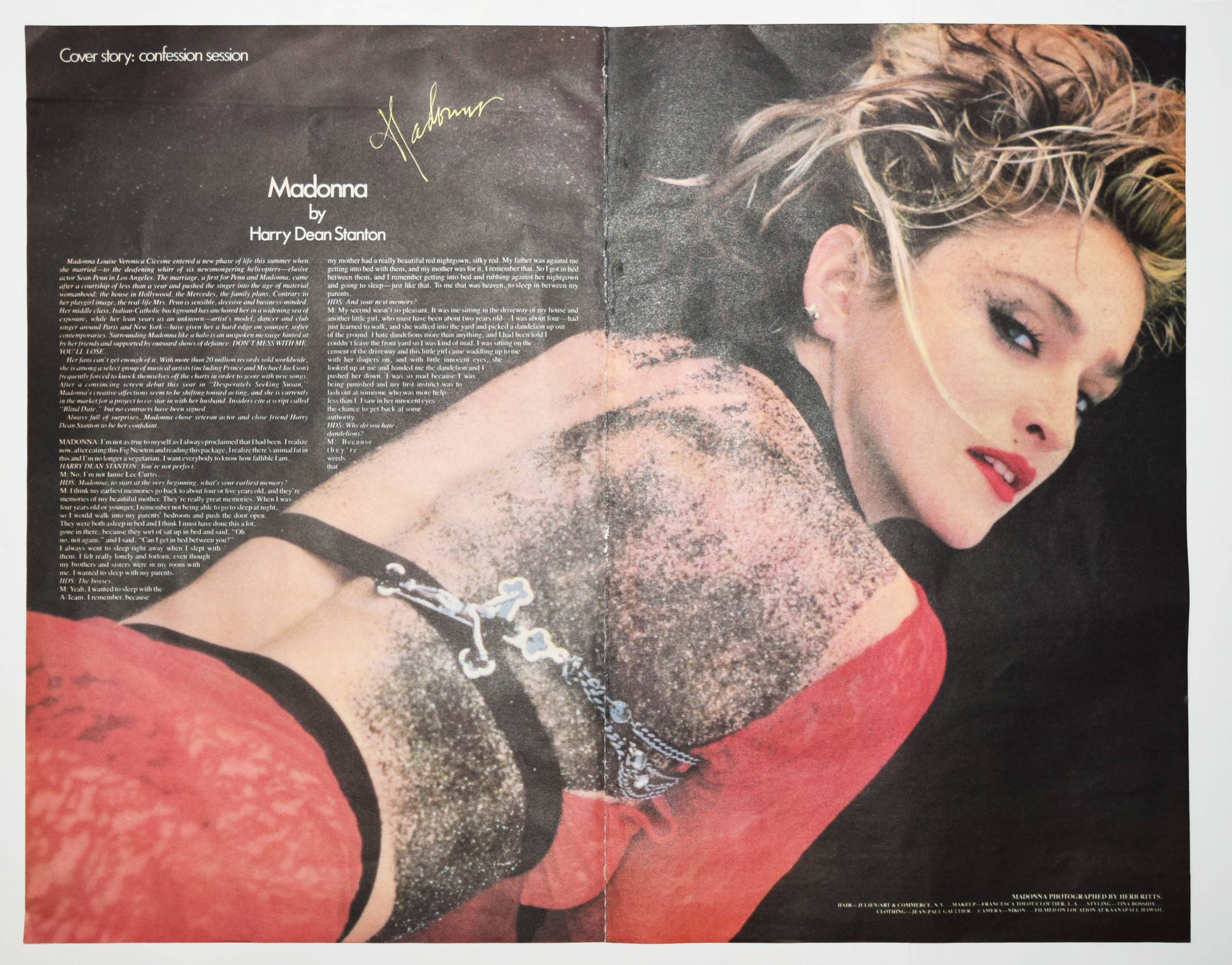 Madonna (Louise Veronica Ciccone). Interview Picture Disc – Limited Edition. Vinyl, 12“, Picture Disc. BAC 2042. London, Baktabak Tabak Marketing Ltd. Juni 1987. Orig.-Klarsicht-Cover. The transparent cover signed by Madonna. – Rare picture disc LP issued as part of the ‚Talking Pictures‘ series of albums which contains rare interviews with Madonna. – Plus: Madonna by Harry Dean Stanton. Cover story: confession session. Double sheet (pp. 57-60) from Andy Warhol’s Interview. No. 12. Christmas 1985. 43 x 55 cm. With color photo by Herb Ritts. Signed by Madonna.