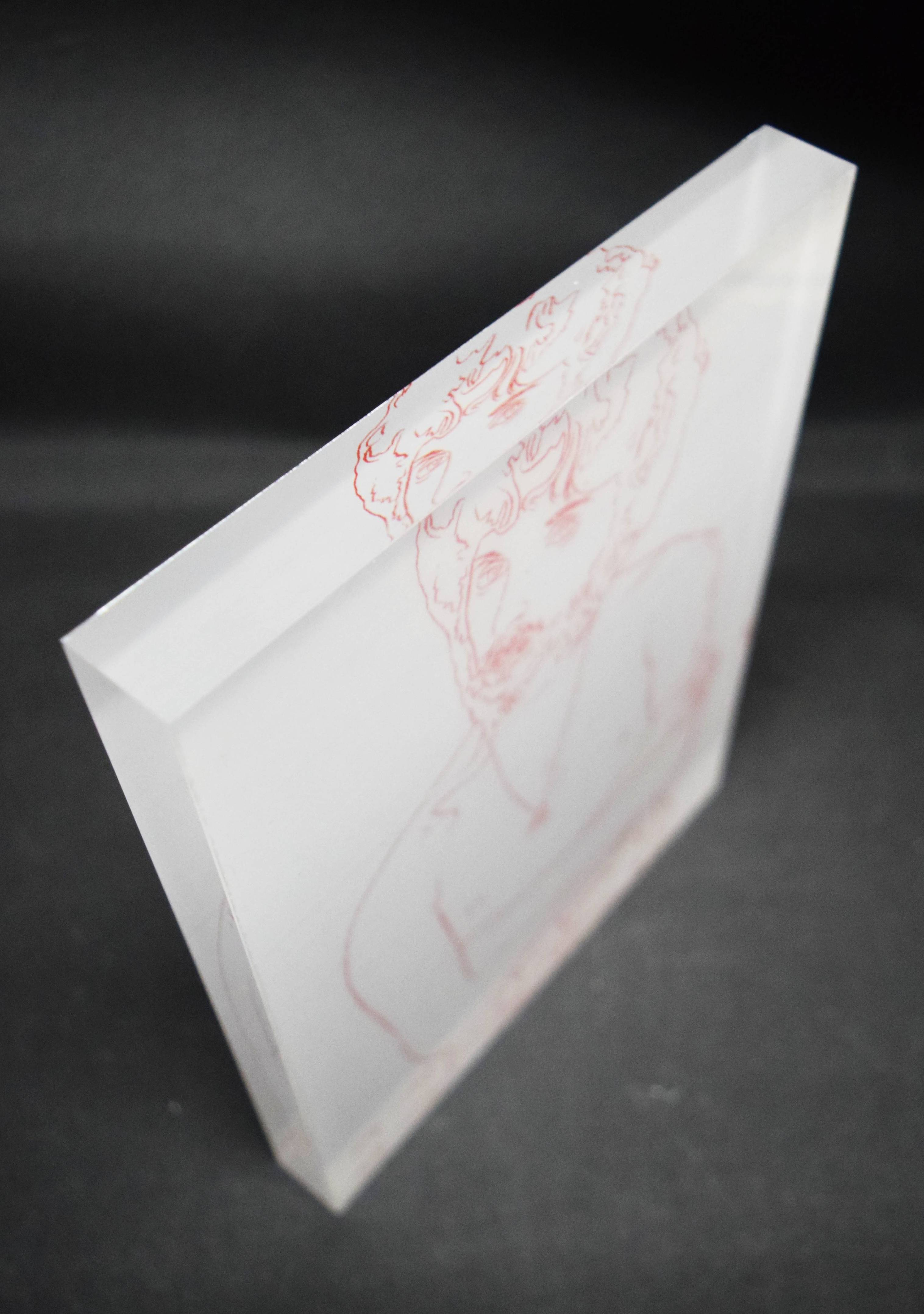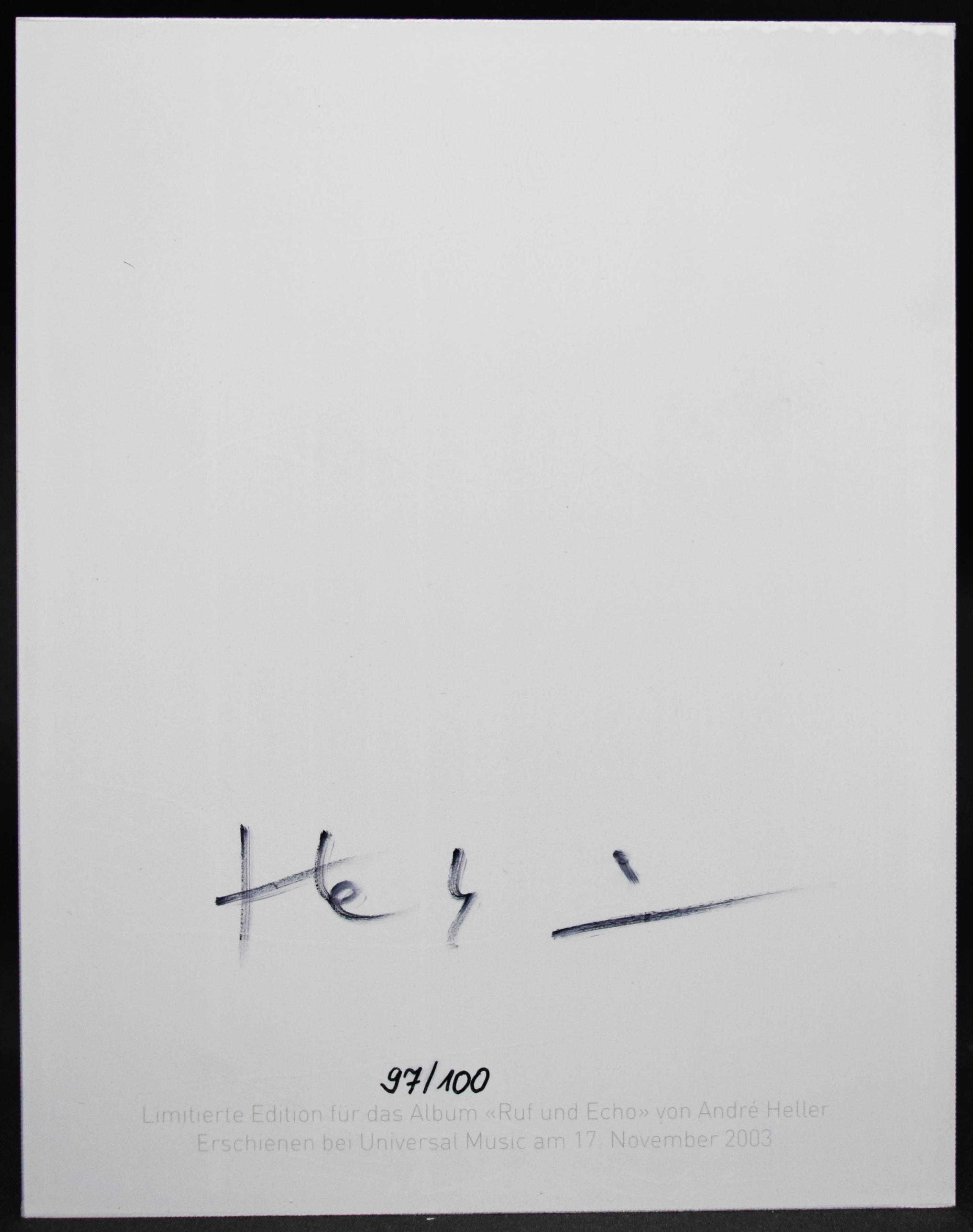 Warhol, Andy. Portrait von André Heller (1981). Lithographie in Rot unter Plexiglas-Platte (21 x 16,5 x 2 cm.). Wien (2003). Orig.-Versand-Karton. Eines von 100 num. Exemplaren; von A. Heller auf der Rückseite signiert. „Limitierte Edition für das Album „Ruf und Echo“ von André Heller. Erschienen bei Universal Music am 17. November 2003.“ – „Then we had to meet a kid named André Heller who has gold records and he owns all these paintings and wants me to do a drawing for his album cover. He was taking us down underground to show us dead people who’re petrified and they’re all in their eighteenth-century clothes. Fred said it might be a good idea to go, that maybe we’d get ideas there. So we met him and he gave us about twenty boxes of candy. Then we went down into the catacombs and we had to oooh and ahh at all the dead bodies, and it was really cold down there and he’d made us leave our candy behind and we didn’t want to do that but we did, and this place was just hateful. I hated it a lot. Fred loved it.” (Andy Warhol and Pat Hackett, The Andy Warhol Diaries p. 379).