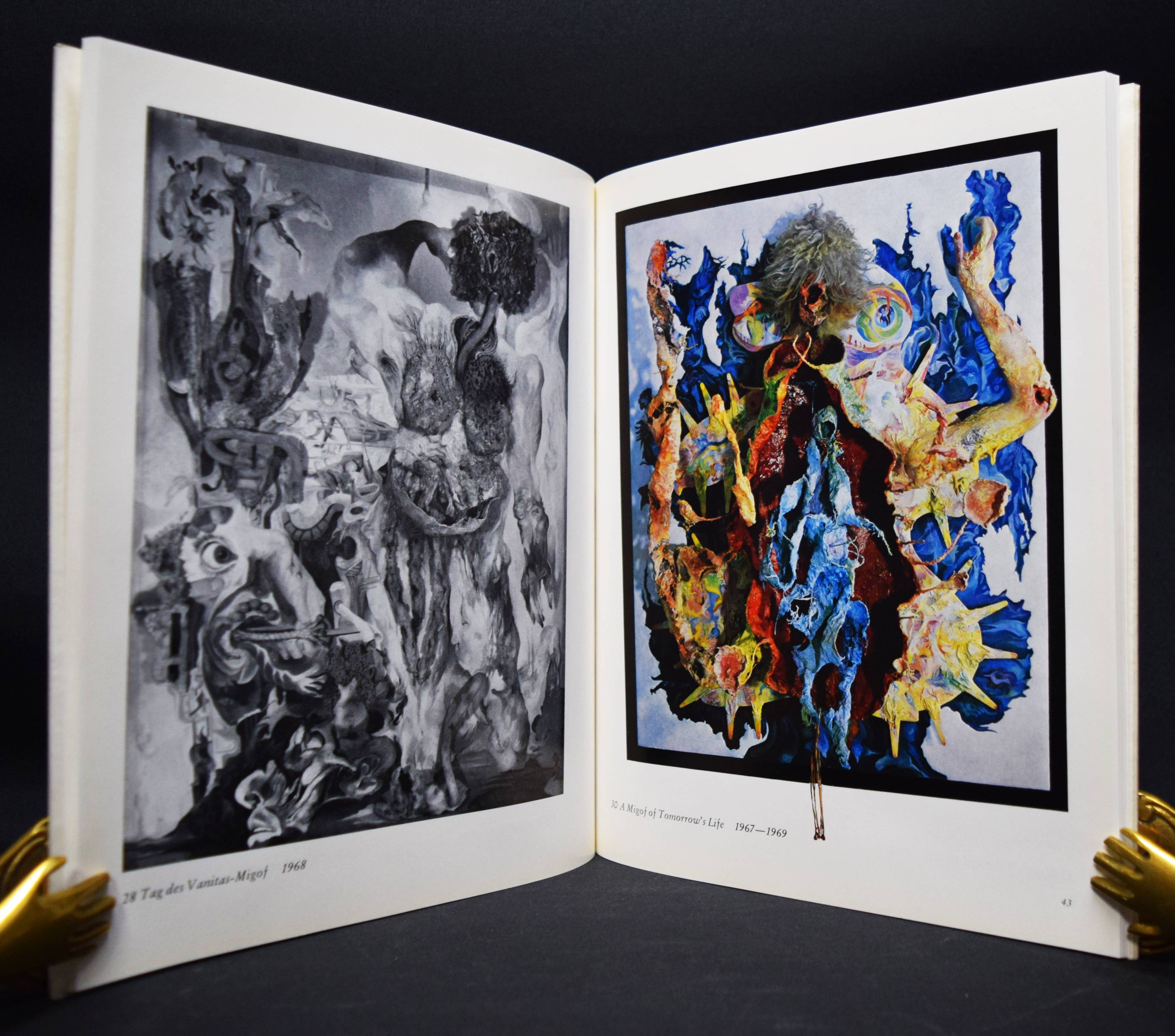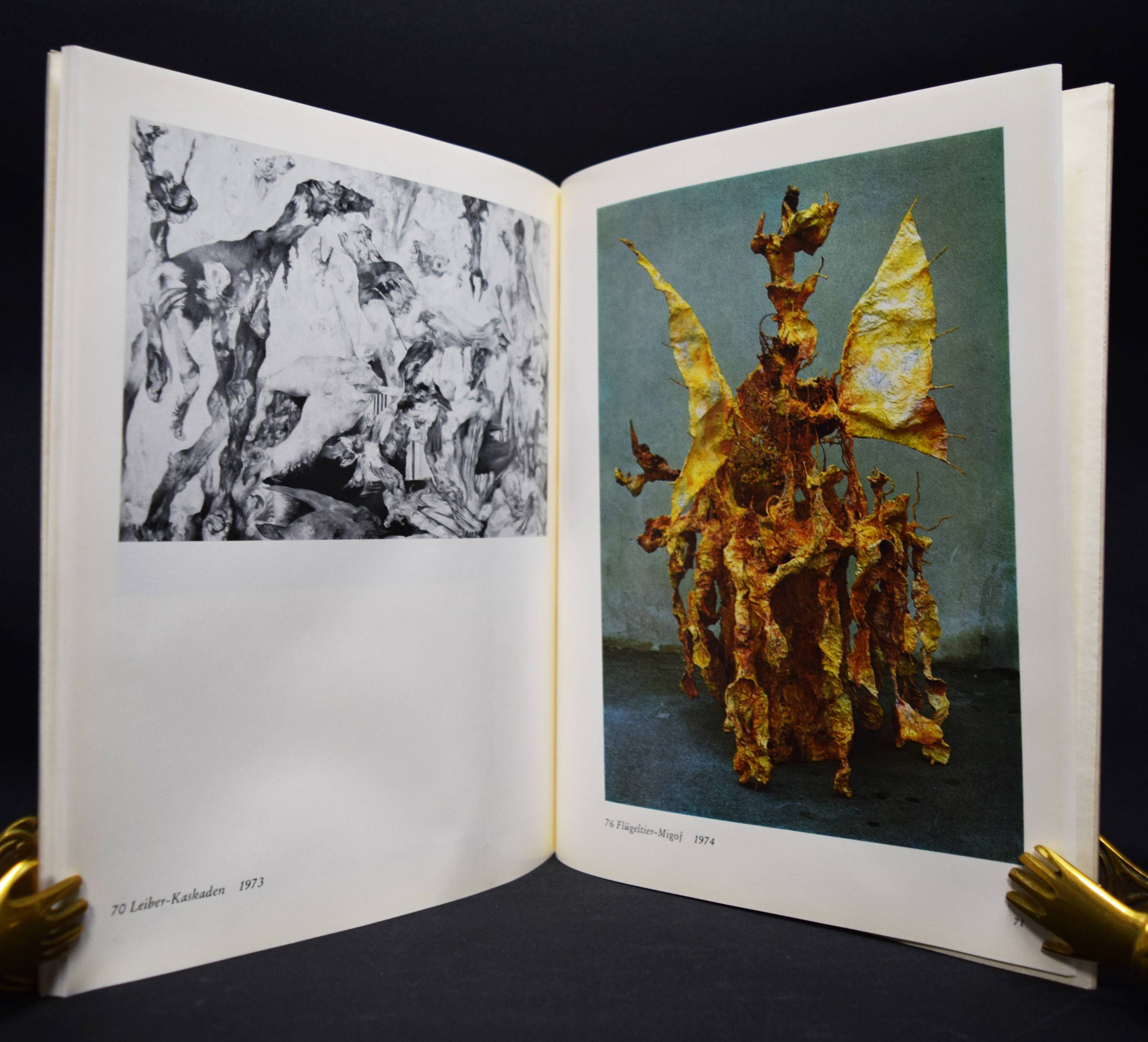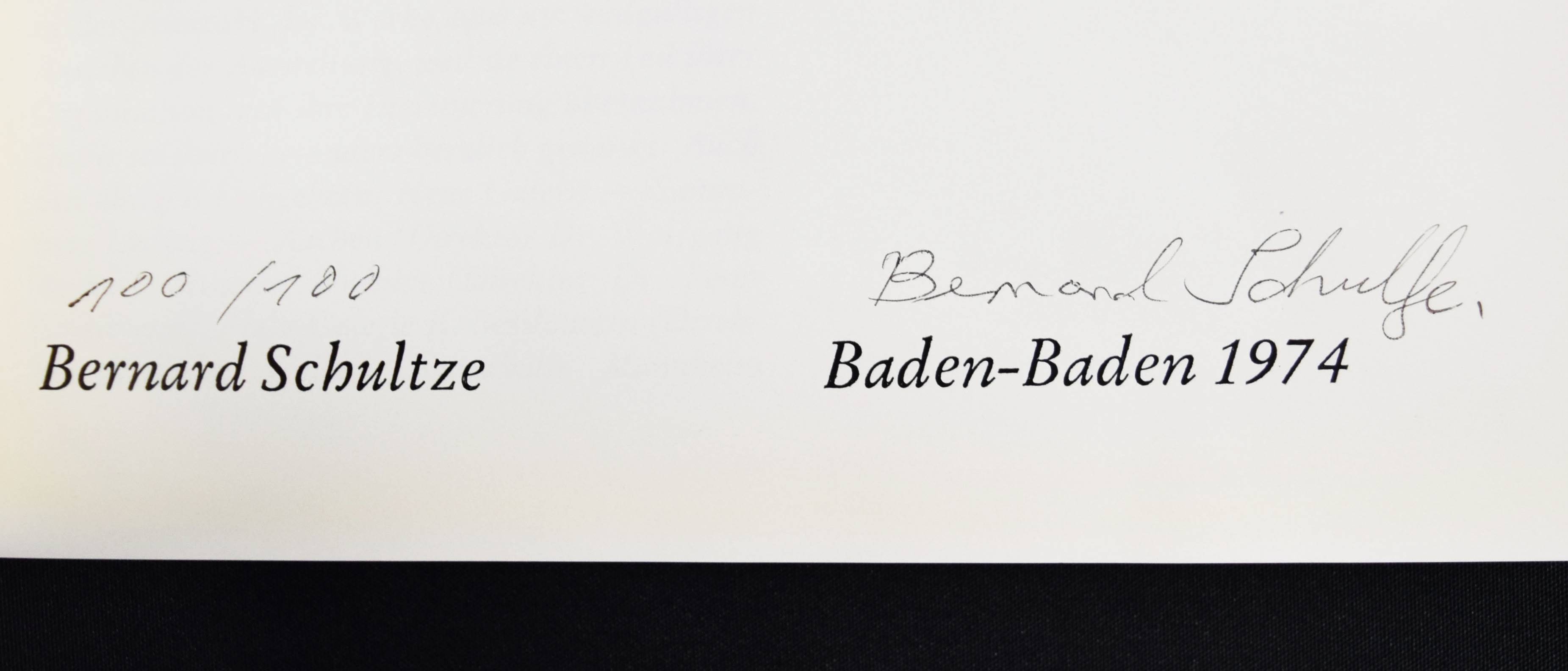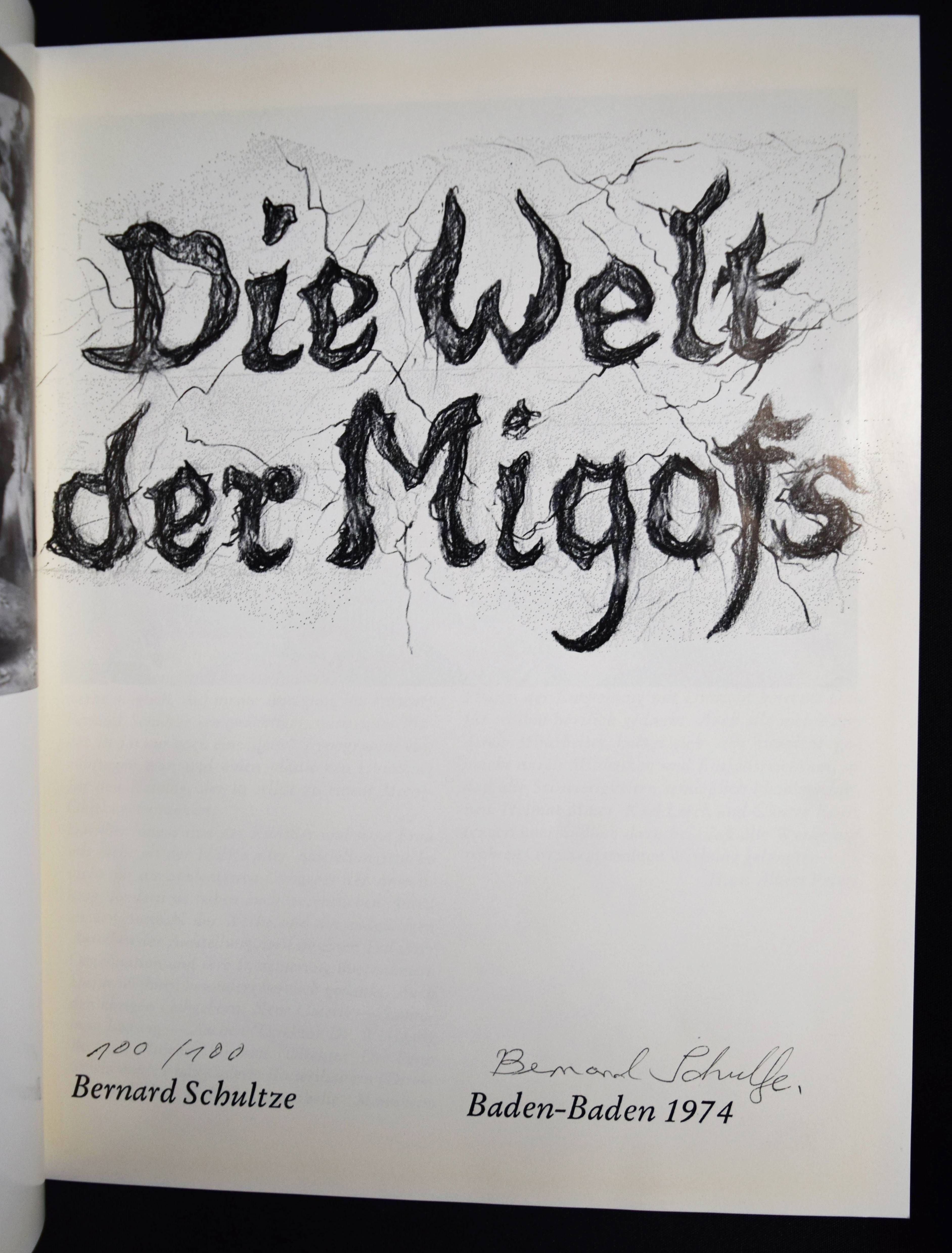 Schultze, Bernard. Die Welt der Migofs. (Katalog zur Ausstellung: 18. 10. – 24. 11. 1974, Staatliche Kunsthalle Baden-Baden). Baden-Baden, Staatliche Kunsthalle 1974. 4°. 85, (1) S. mit 48 (13 farb.) meist ganzs. Abb. im Text und auf 43 Tafeln sowie einem Photoportrait des Künstlers. Orig.-Pappband mit farbigem Kunststoff-Relief auf beiden Deckeln. Eines von 100 num. Exemplaren; auf dem Titelblatt von B. Schultze signiert. – Mit einem Vorwort von Hans Peter Albers und einen Essay „Das Migof-Paradies“ von Eberhard Roters. – Migofs sind dreidimensionale Kunstobjekte mit fließenden Übergängen zwischen Plastik, Relief und Malerei aus Draht, Plastikmasse, Holz und bemalter Leinwand. „Vor einiger Zeit fragte ich Schultze, wie er auf das Wort ‚Migof‘ verfallen sei. Schultze antwortete, er habe es intuitiv gefunden. Migof sei ein lautmalerisches Wort. Vordergründig bedeute es gar nichts, aber dank seiner lautmalerischen Qualität eigne es sich dazu, beim Hören Assoziationen auszulösen, die zwar die Tendenz einer gewissen Grundstimmung angäben, deren Präzision aber jeder für sich selbst finden müsse. Migof – wie sich das genau fassen lasse, wisse er nicht, vielleicht: die Heiterkeit nach der Katastrophe“ (E. Roters). – B. Schultze (1915-2005) war einer der wichtigsten deutschen Vertreter der Kunstrichtung Informel. „Nachhaltig beeinflusst von Wols (Otto Wolfgang Schulze) und Jean-Paul Riopelle, dem Tachismus und dem Action Painting, entwickelte Bernard Schultze einen sehr persönlichen Stil der gestisch abstrakten Malerei. Schultzes Arbeiten werden häufig als lyrisch abstrakt bezeichnet. … In den 1960er Jahren erweitert er sein Œuvre um Skulpturen, Migofs wie er sie bezeichnete, in denen seine Bildersprache die dritte Dimension erobert: Migof, ein lautmalerisches Wort ohne exakte Bedeutung, ist der als Gattungsbegriff zu vergehende Name für die plastischen Figurationen Bernard Schultzes, die, entsprechend ihrer Bezeichnung, auch nur andeutungsweise erklärbar sind – in der Migof-Welt ist alles vieldeutig“ (Wikipedia). – Sehr gutes Exemplar.