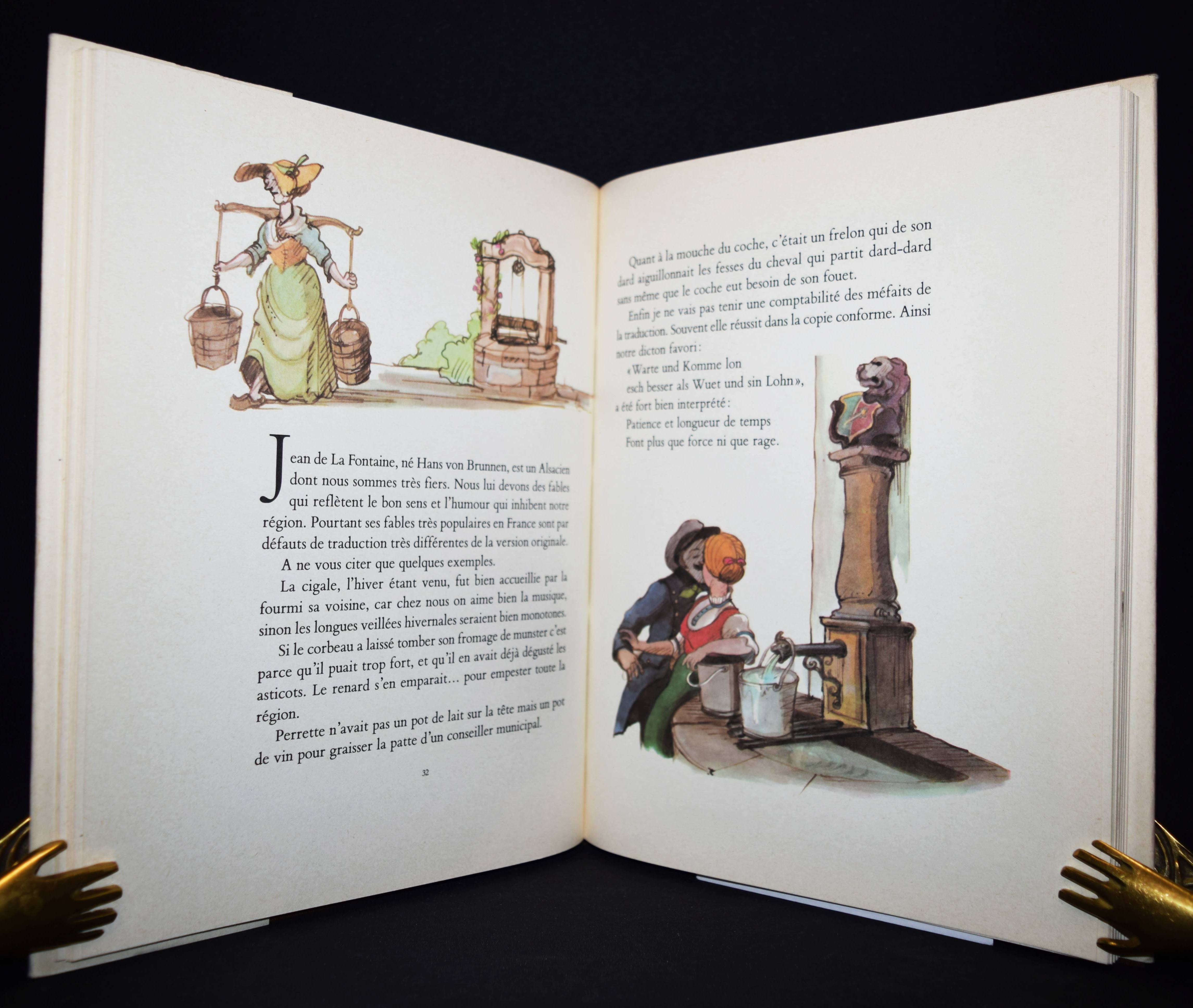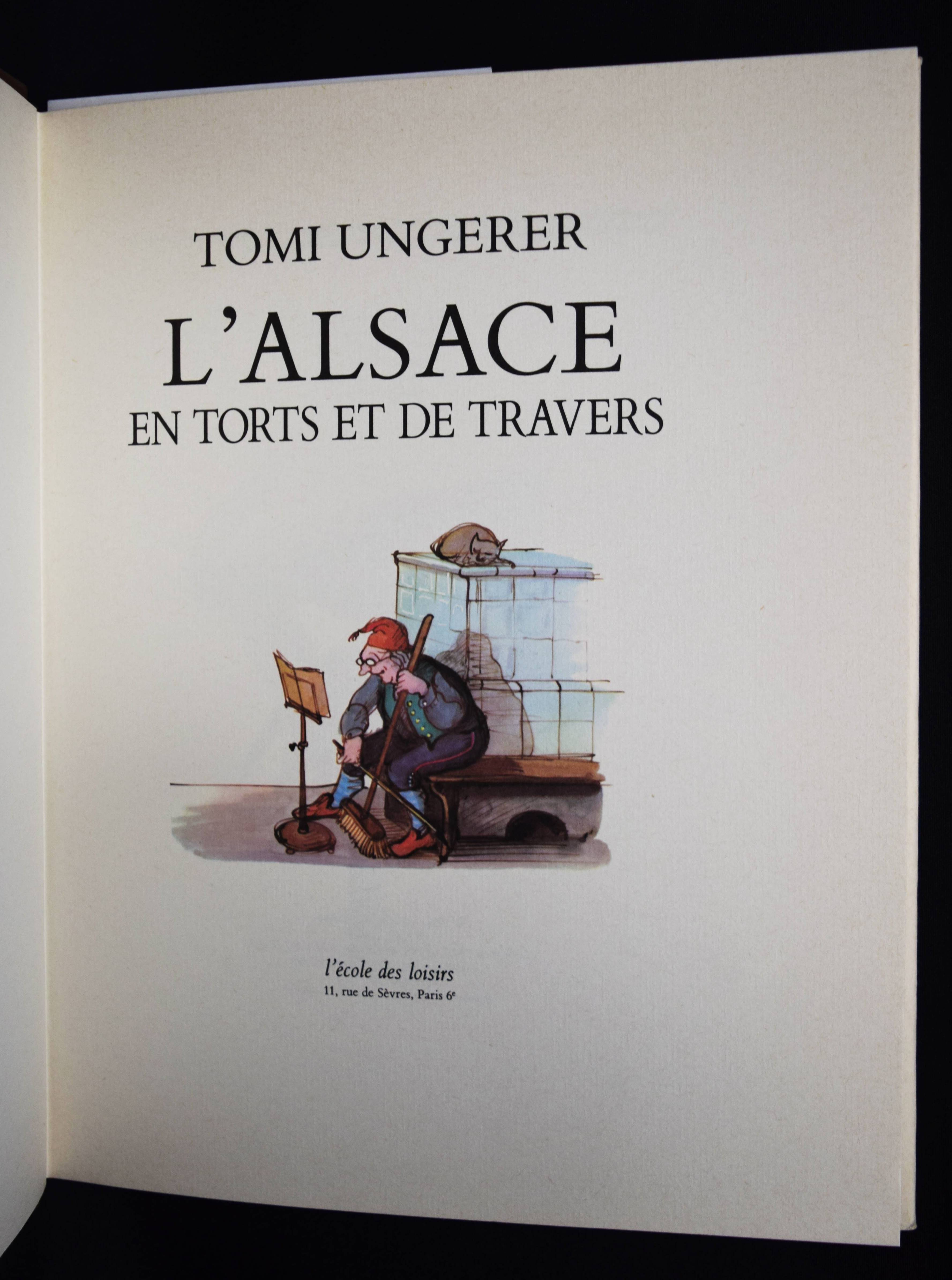 Ungerer, Tomi. L’ Alsace en torts et de travers. Paris, École des Loisirs 1988. 4°. 116 p. avec illustrations en couleur. Reliure en toile originale avec jaquette illustrée en couleur. Première édition avec belle envoi de T. Ungerer „Pour Francois T. Ungerer“. – „Ce livre, de façon exagérée, manifeste ce que je ressens en tant qu’Alsacien. Mais je ne suis qu’un Alsacien parmi d’autres… J’enfin, j’espéride que mes batifollations, sans queue et sans trop de têtes, rédigées du coq à l’âme sauront vous fendre un sourire dans le visage.“ (T. Ungerer). – Très bon exemplaire.