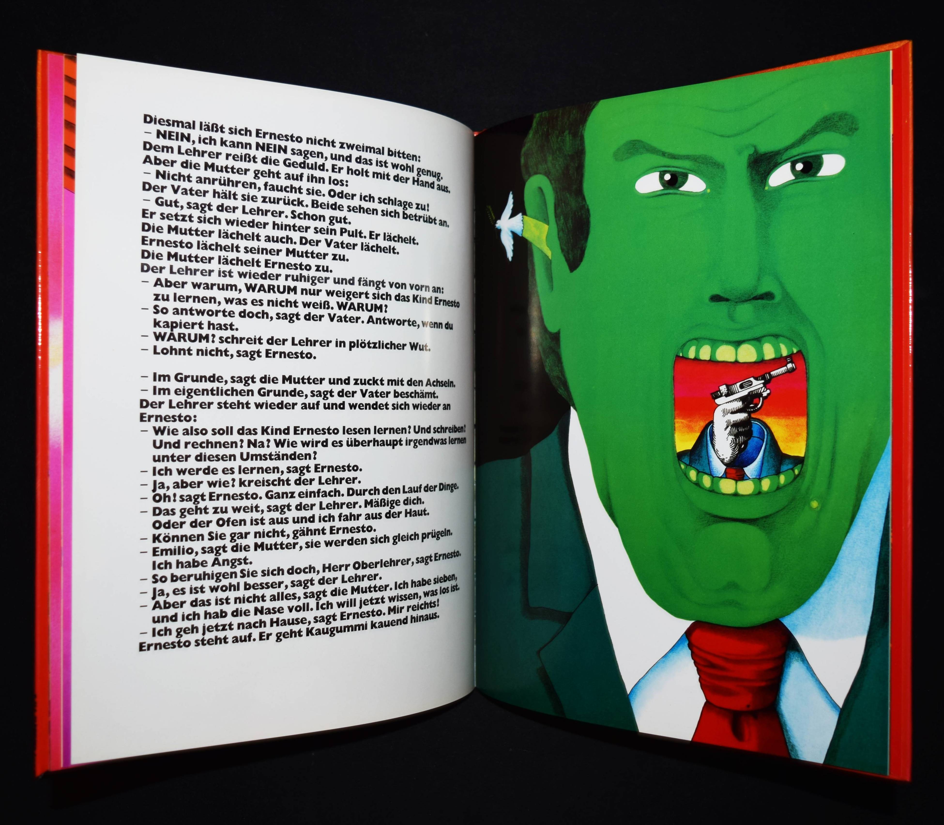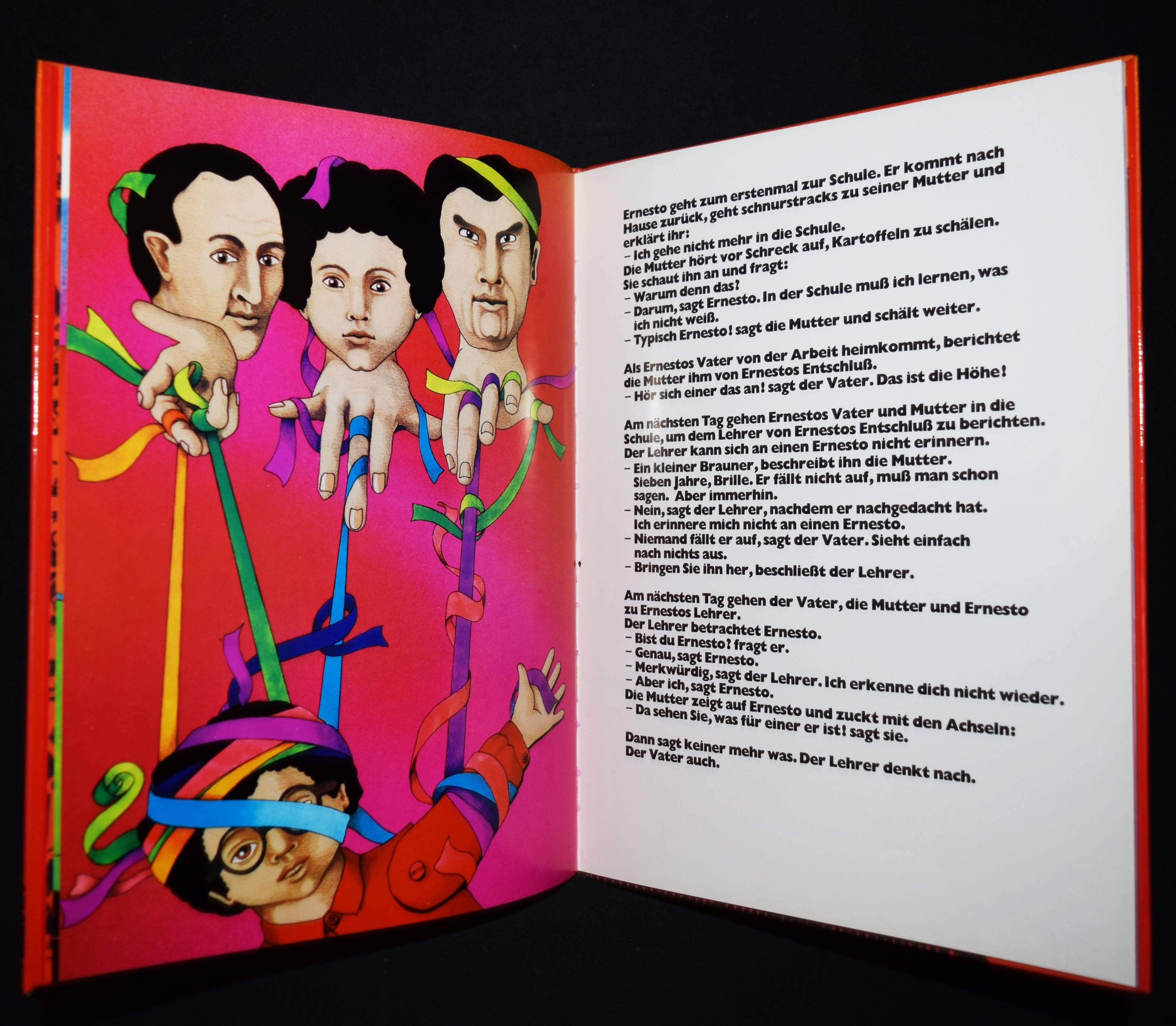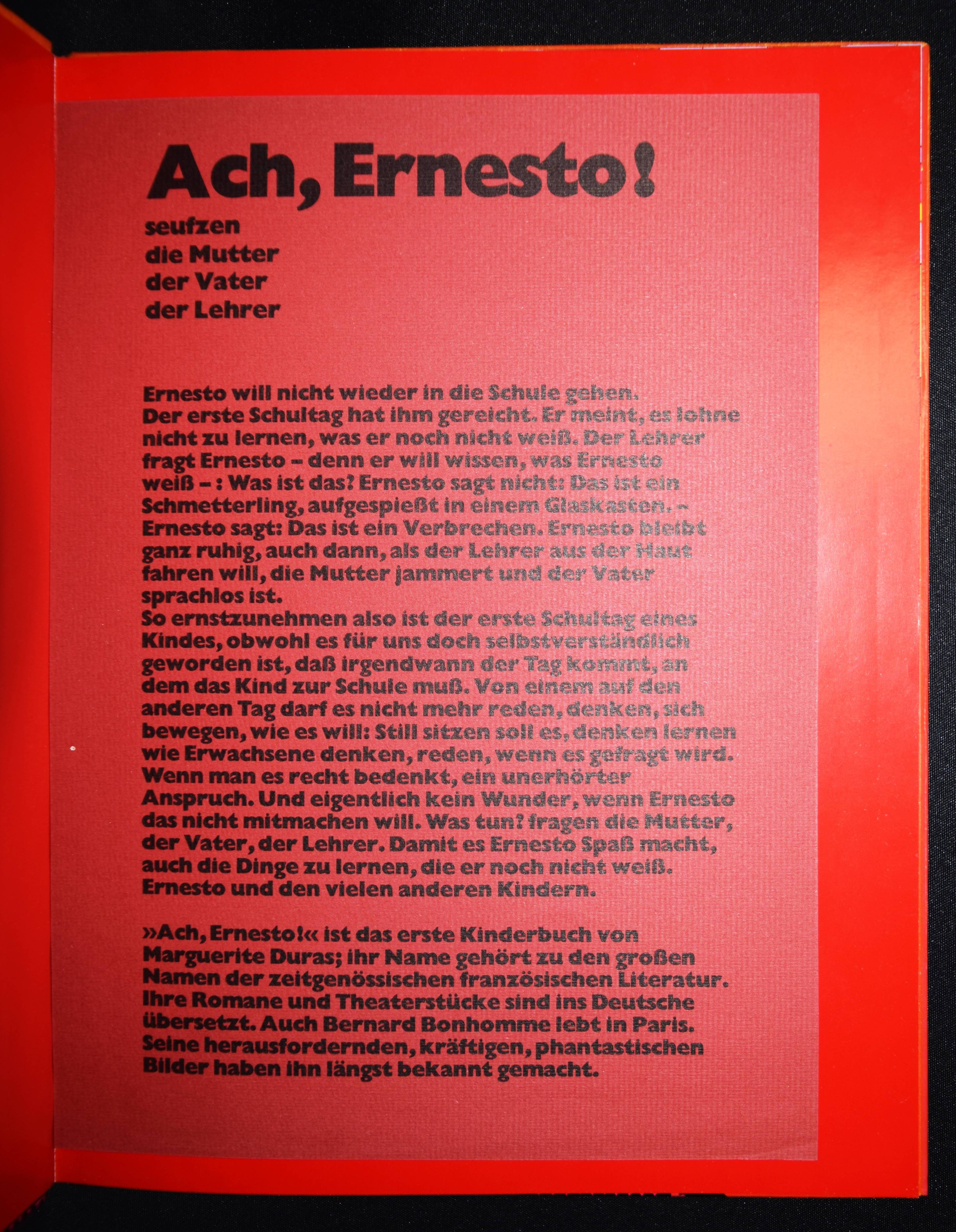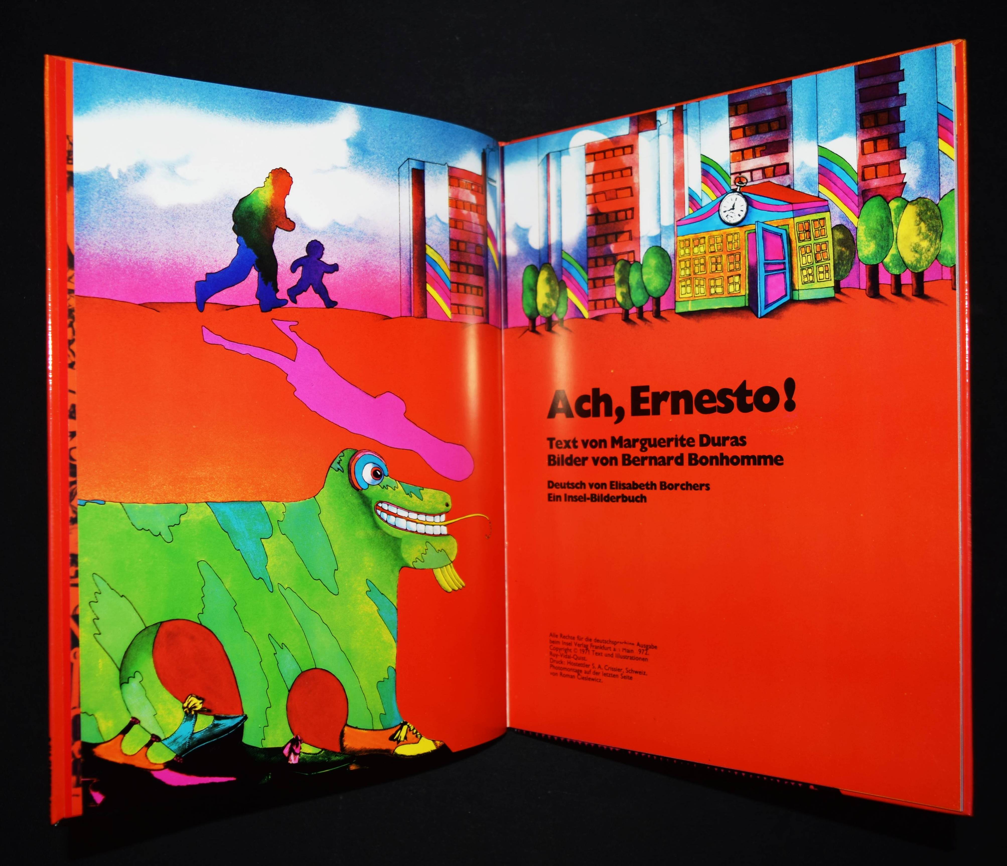 Duras, Marguerite. Ach, Ernesto! Bilder von Bernhard Bonhomme. Deutsch von Elisabeth Borchers. Frankfurt, Insel Verlag (1972). 4°. 14 unbez. Bl. mit farb. Illustrationen u. 1 farb. Fotomontage von Roman Cieslewicz sowie 1 Beilagen-Blatt (Verlags-Werbung). Farbig illustr. Orig.-Pappband. Bilderwelt 2709. Weismann S. 2. Vgl. Harvey-Volat. Duras-Bibliography A 27 (frz. Ausg.). – Erste deutsche Ausgabe. – „Harlin Quist (Verleger der franz. Originalausgabe, erschienen im selben Jahr) schafft – in der unbeständigen Atmosphäre des Pin Push Studio – in Frankreich eine neue visuelle Ästhetik für Kinderbilderbücher, indem er der Phantasie bei der Illustration einen möglichst großen Spielraum läßt. damit stellt er sich gegen das traditionelle Kinderbuch, dessen imaginäre Welt nur auf sich selbst bezogen war. Da das wirkliche Leben des Kindes im auslaufenden 20. Jahrhundert mit der Welt der Werbung, mit provozierenden Formen, aggressieven Farben und ungewöhnlichen Gedankenassoziationen konfrontiert ist, muß das Kinderbilderbuch eine Welt darstellen, deren Formen mit der Vergangenheit brechen.“ (L. Noesser in Bilderwelt). – Schönes Exemplar des seltenen Pop-Art-Bilderbuchs mit dem meist fehlenden Beilagen-Blatt.