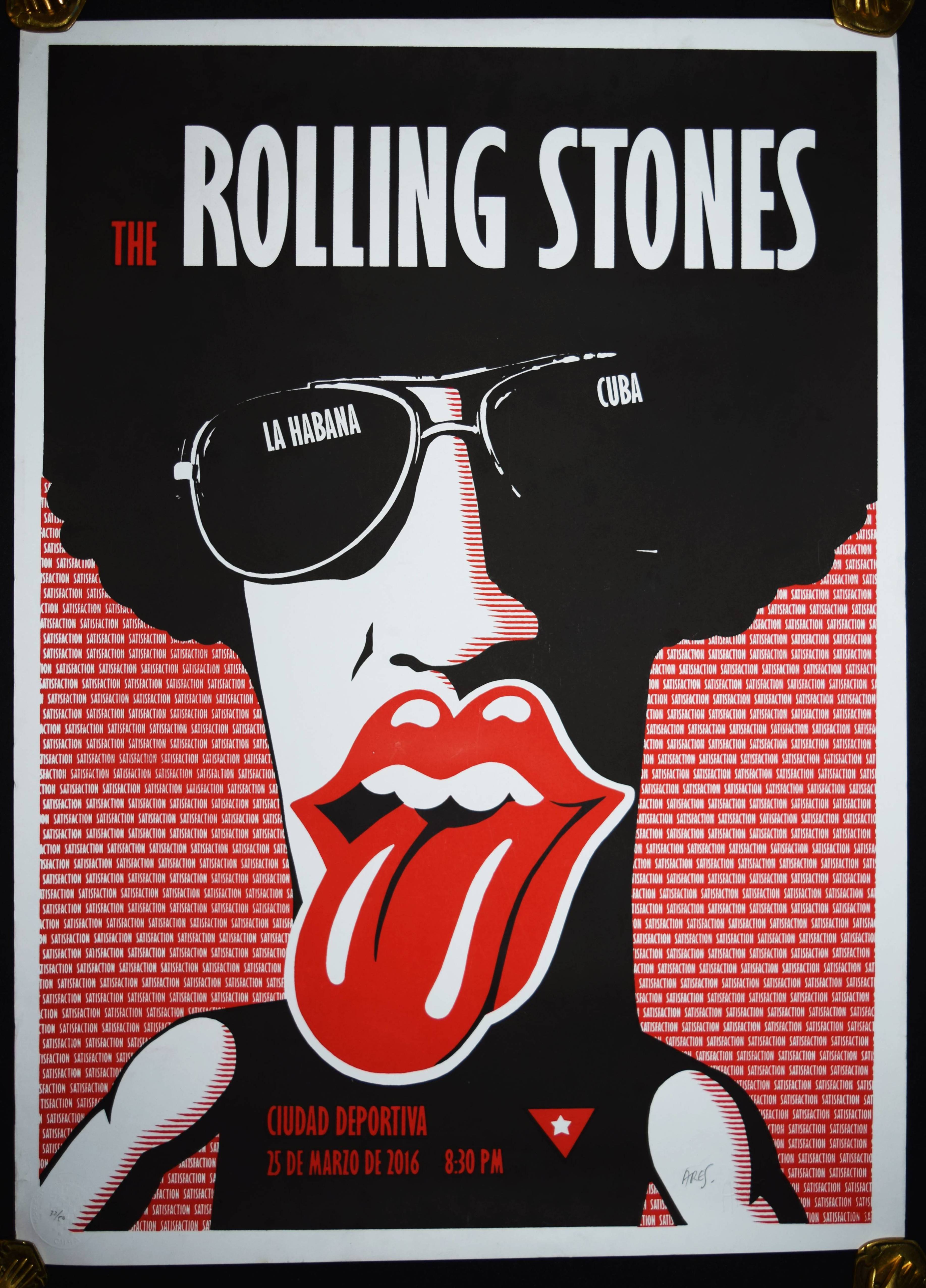 Rolling Stones – Ares (d. i. Hernandez Aristides, geb. 1963 in Havanna). Plakat, The Rolling Stones, La Habana, Cuba, Ciudad Deportiva 25 de Marzo de 2016, 8:30 PM. Farb-Serigraphie / silkscreen-print in colour, 70 x 50 cm. Havanna (2016). Eines von 50 num. Exemplaren; von Ares signiert. – „Das kostenlose Open-Air-Konzert der Band im Sportkomplex „Ciudad Deportiva de la Habana“ mit geschätzten 500.000 Besuchern. Es war das erste Rockkonzert in Kuba vor einem derart großen Publikum. Die Planung des Konzerts fand während der América Latina Olé Tour 2016 der Rolling Stones statt. Als bekannt wurde, dass der damalige Präsident der Vereinigten Staaten, Barack Obama, als erster US-Präsident seit 88 Jahren Kuba besuchen werde, wurde das Konzert vom ursprünglich geplanten Termin am 20. März auf den 25. März 2016 verschoben. Kurz vor dem neuen Termin versuchte Papst Franziskus – erfolglos – eine erneute Verschiebung des Konzerts zu erreichen, da der 25. März 2016 Karfreitag war“ (Wikipedia).