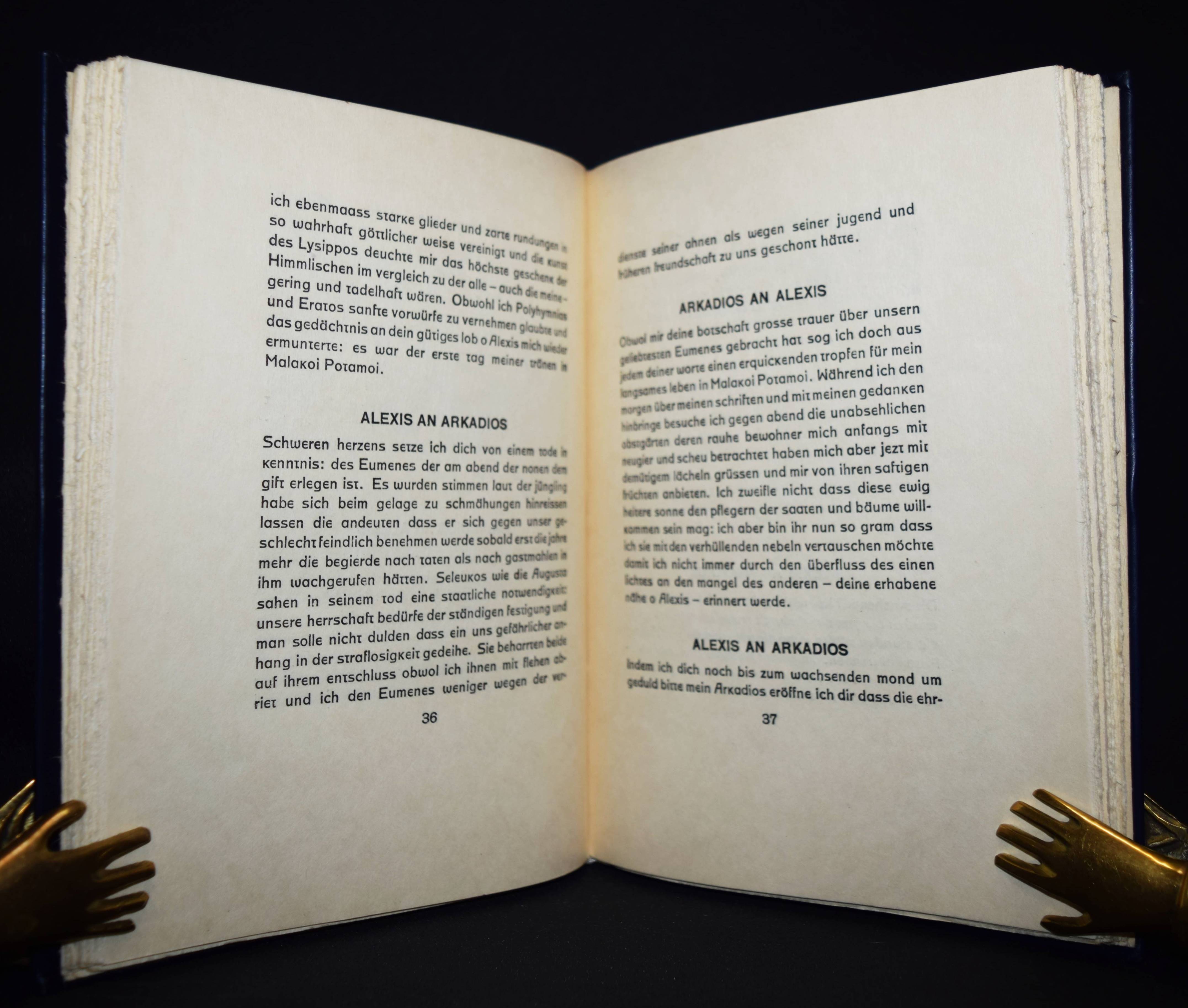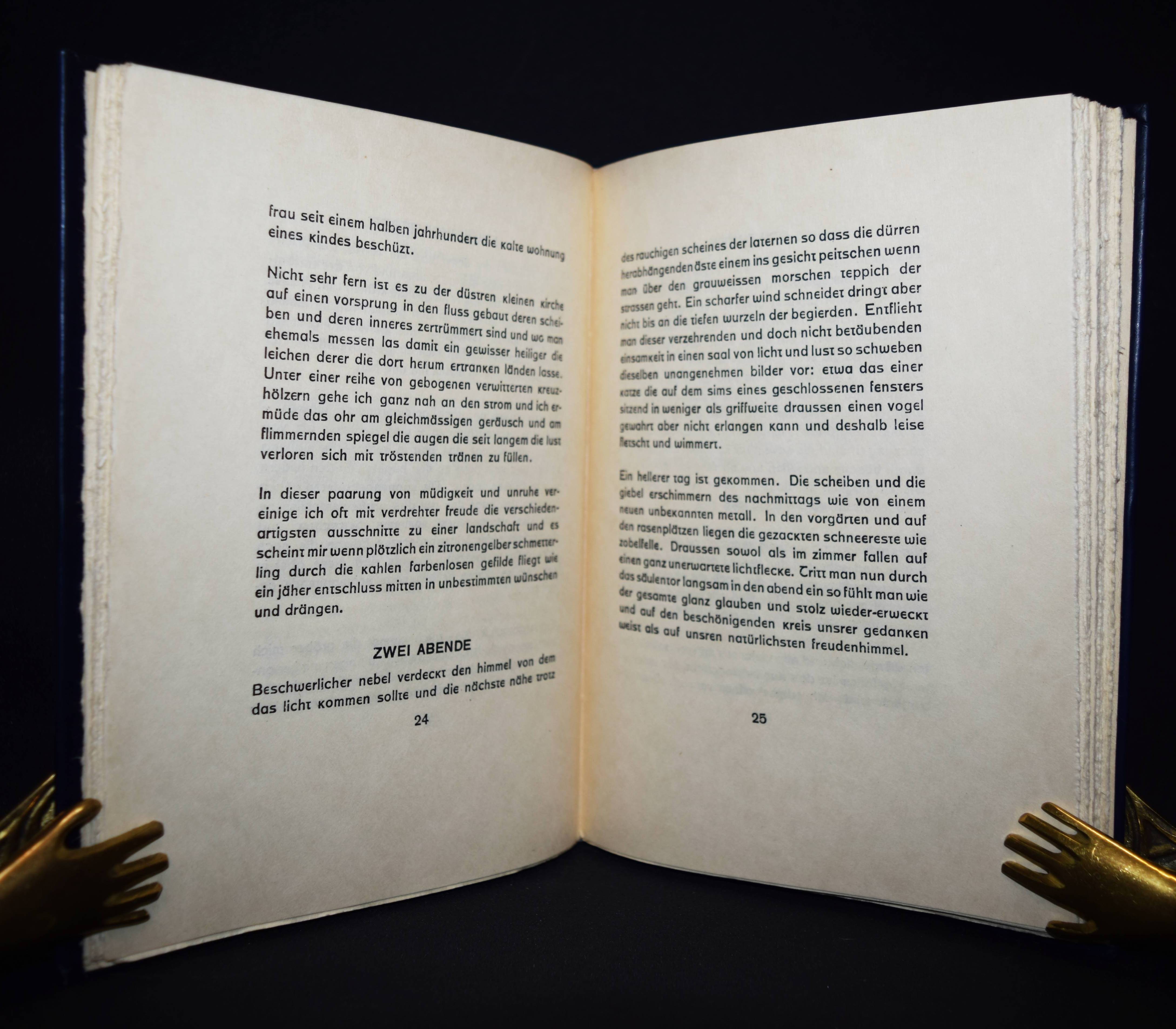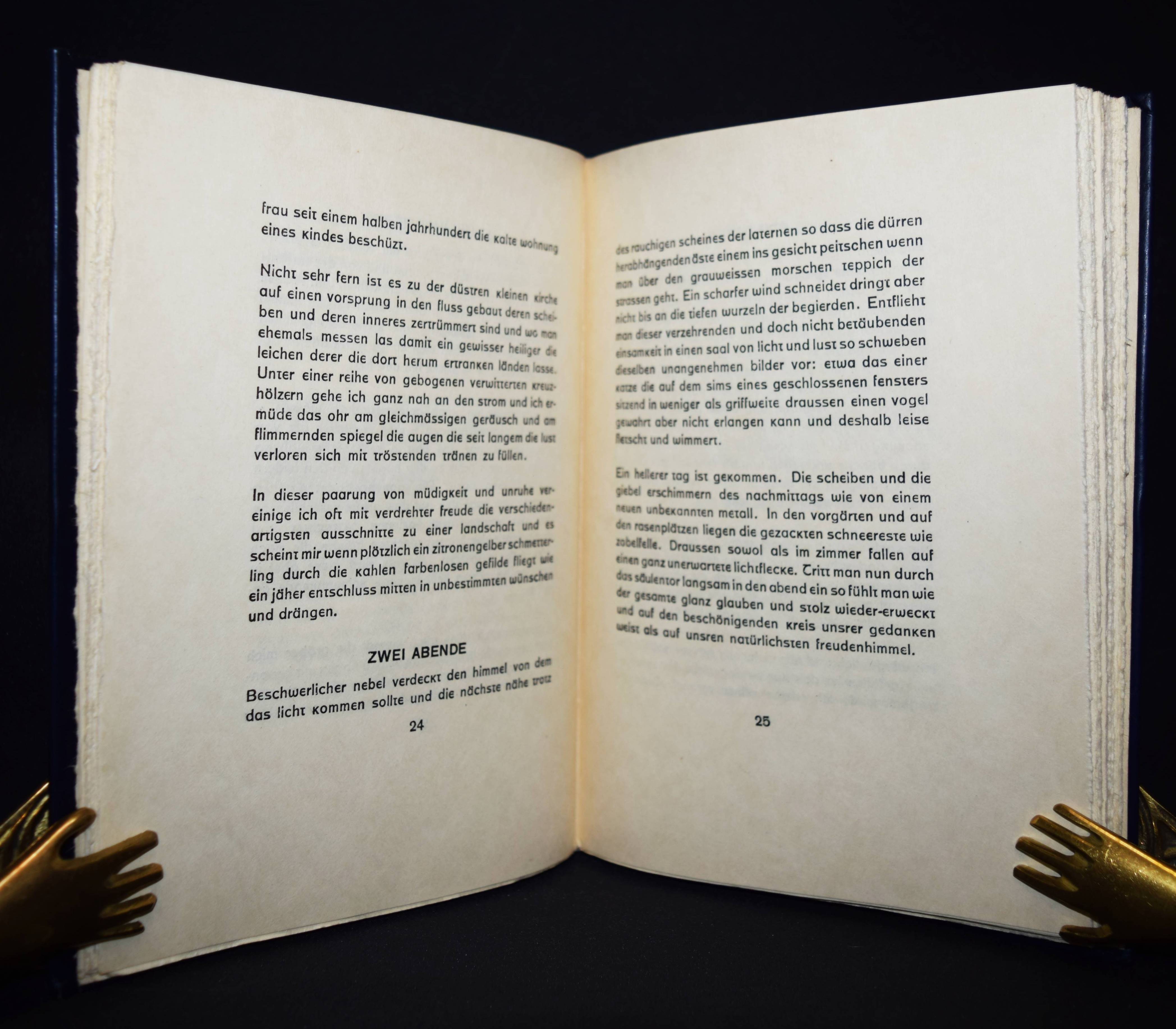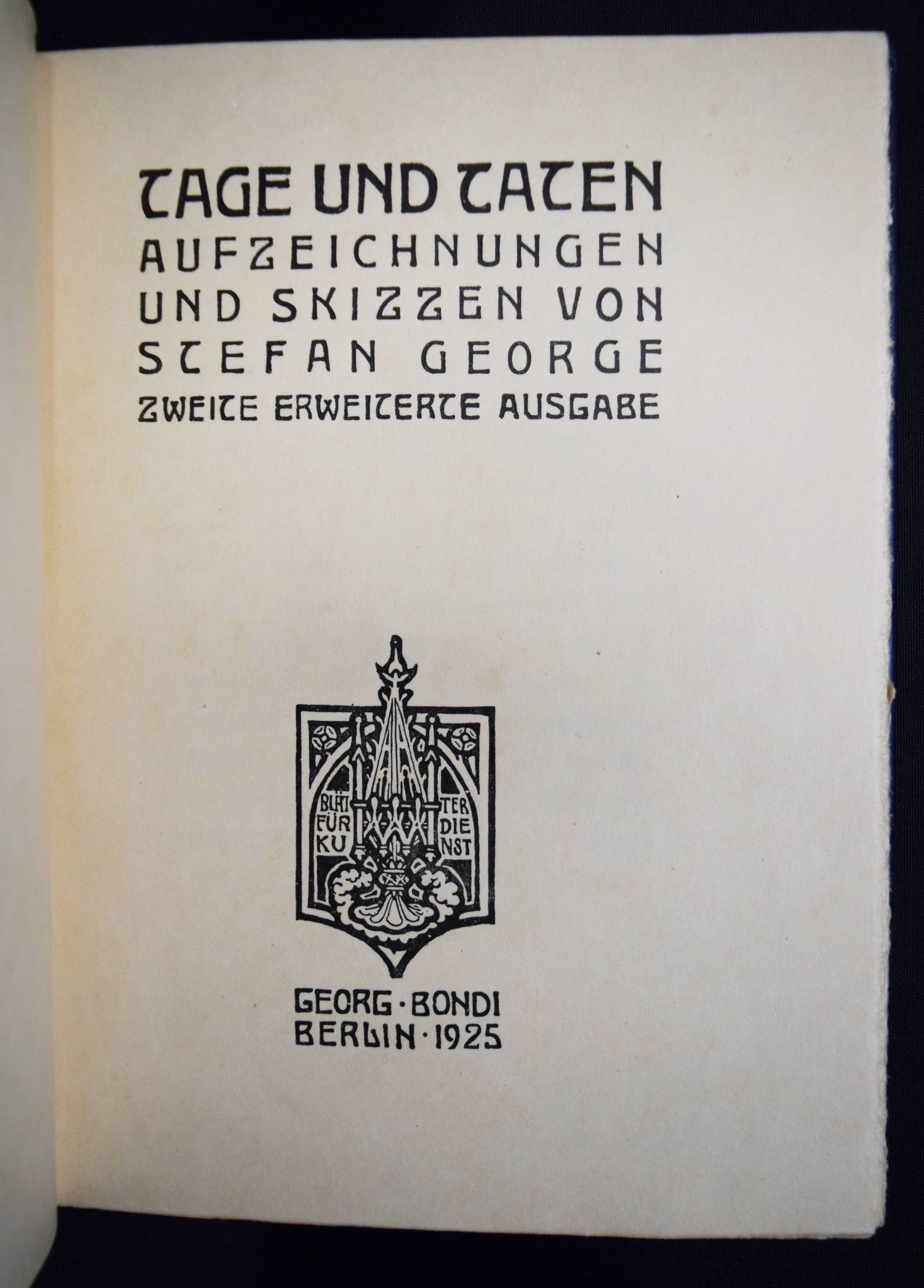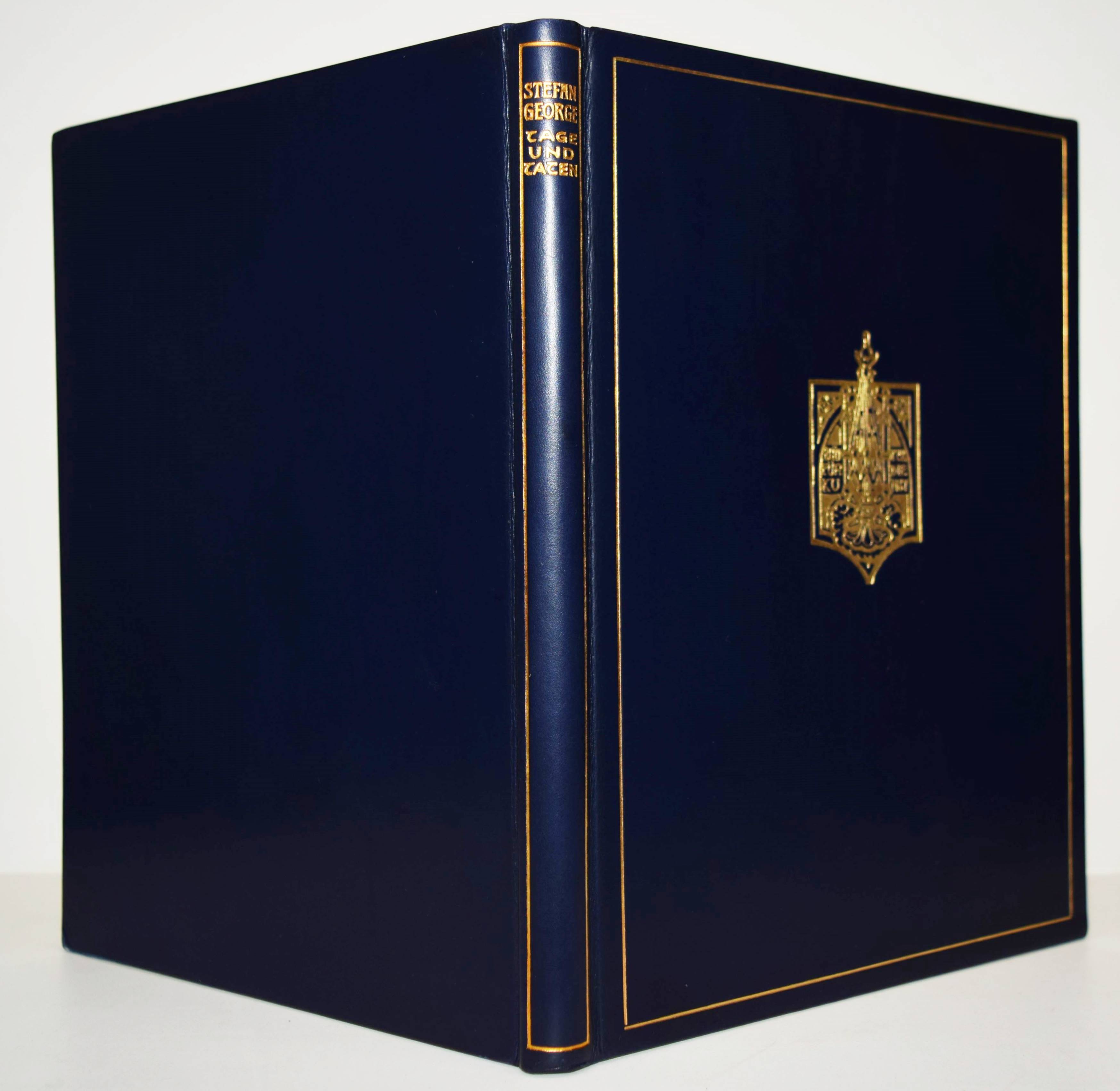 George, Stefan. Tage und Taten. Aufzeichnungen und Skizzen. 2. erw. Ausg. Berlin, Georg Bondi 1925. 8°. 93, (3) S. Dunkelblauer Orig.-Saffian-Lederband mit goldgepr. Rückentitel, Deckelfiletten, Deckelvignette und Kopfgoldschnitt (Entwurf: Melchior Lechter) mit Schutzumschlag und Pappschuber mit Rückenschild. (Blätter für die Kunst). Landmann 618. W.-G.² 52. – Vorzugsausgabe in Ganzleder. Gedruckt in der Stefan-George-Schrift bei Otto von Holten, Berlin auf Japanbütten. – „Die vorliegende erweiterte Ausgabe enthält alles vom Verfasser in ungebundener Rede geschriebene mit Ausnahme jedoch aller Vorworte aller Einleitungen und Merksprüche. Schwierig wäre aus diesen sein eigenes Anteil herauszulösen. Es würde auch eine ungebührende Beladung sein für dieses im Wesentlichen dichterische Werk“ (Vorrede der zweiten Ausgabe). – Der unbedruckte Schutzumschlag mit rückseitig geklebtem Randeinriss, sehr schönes Exemplar.