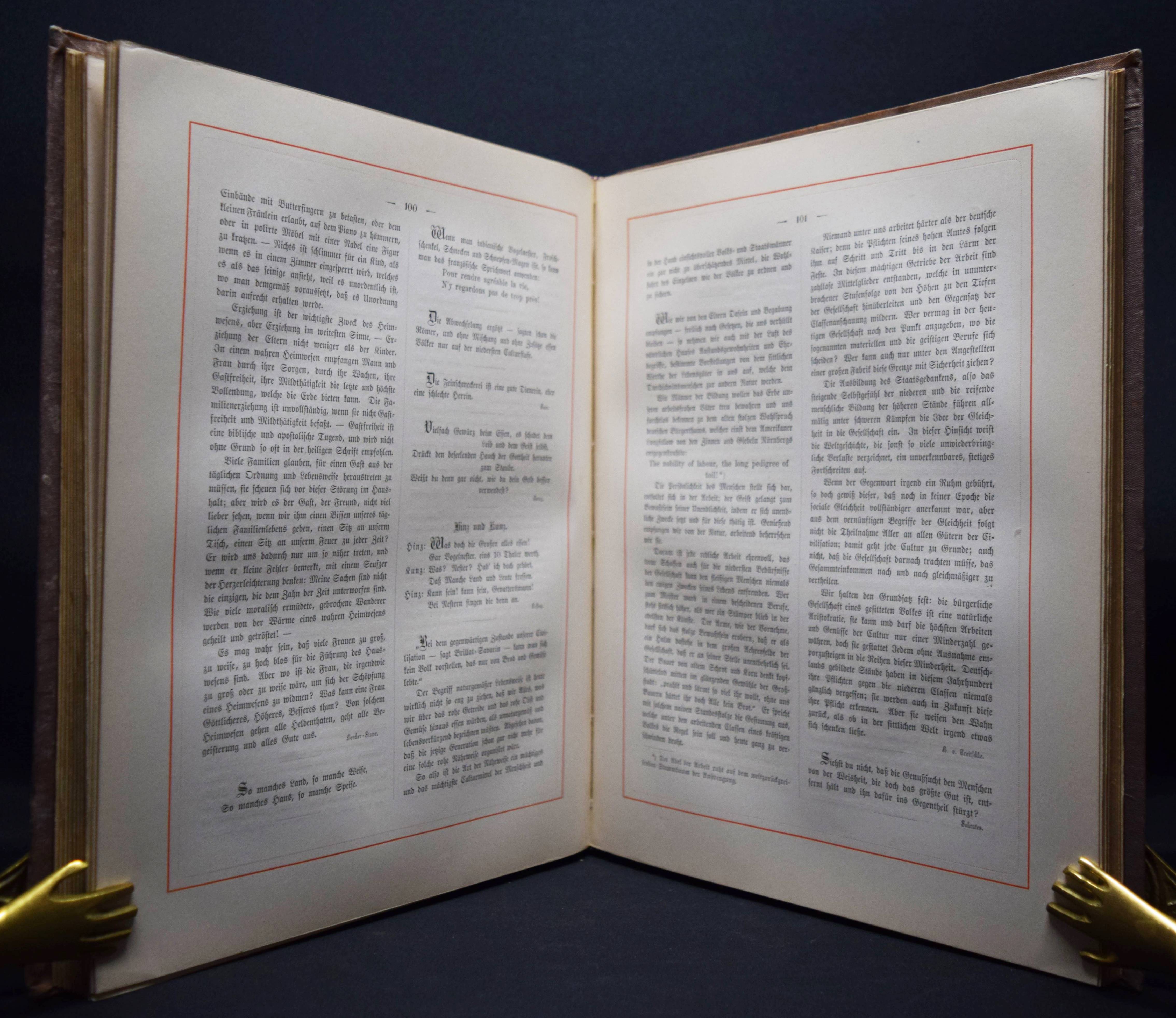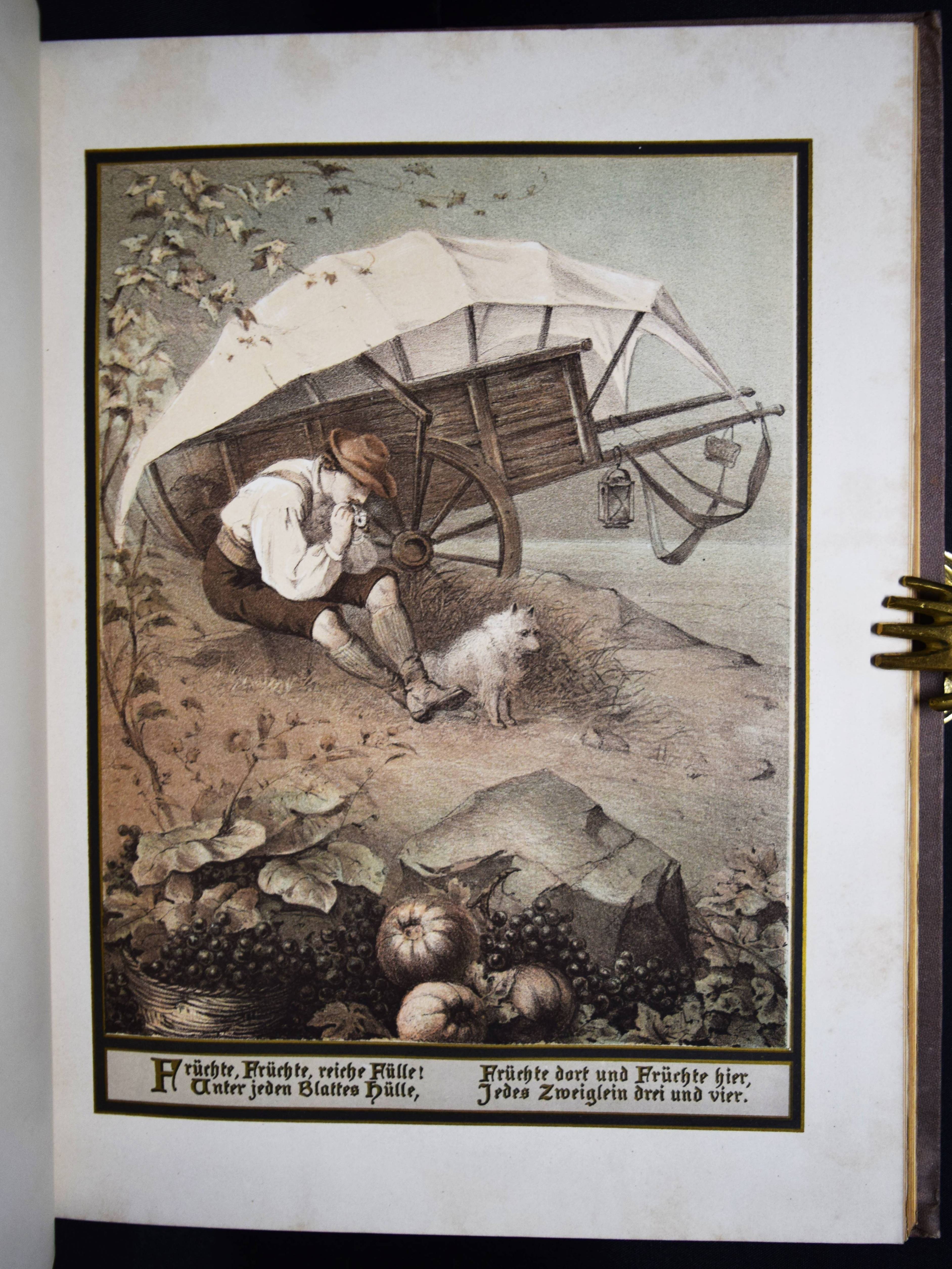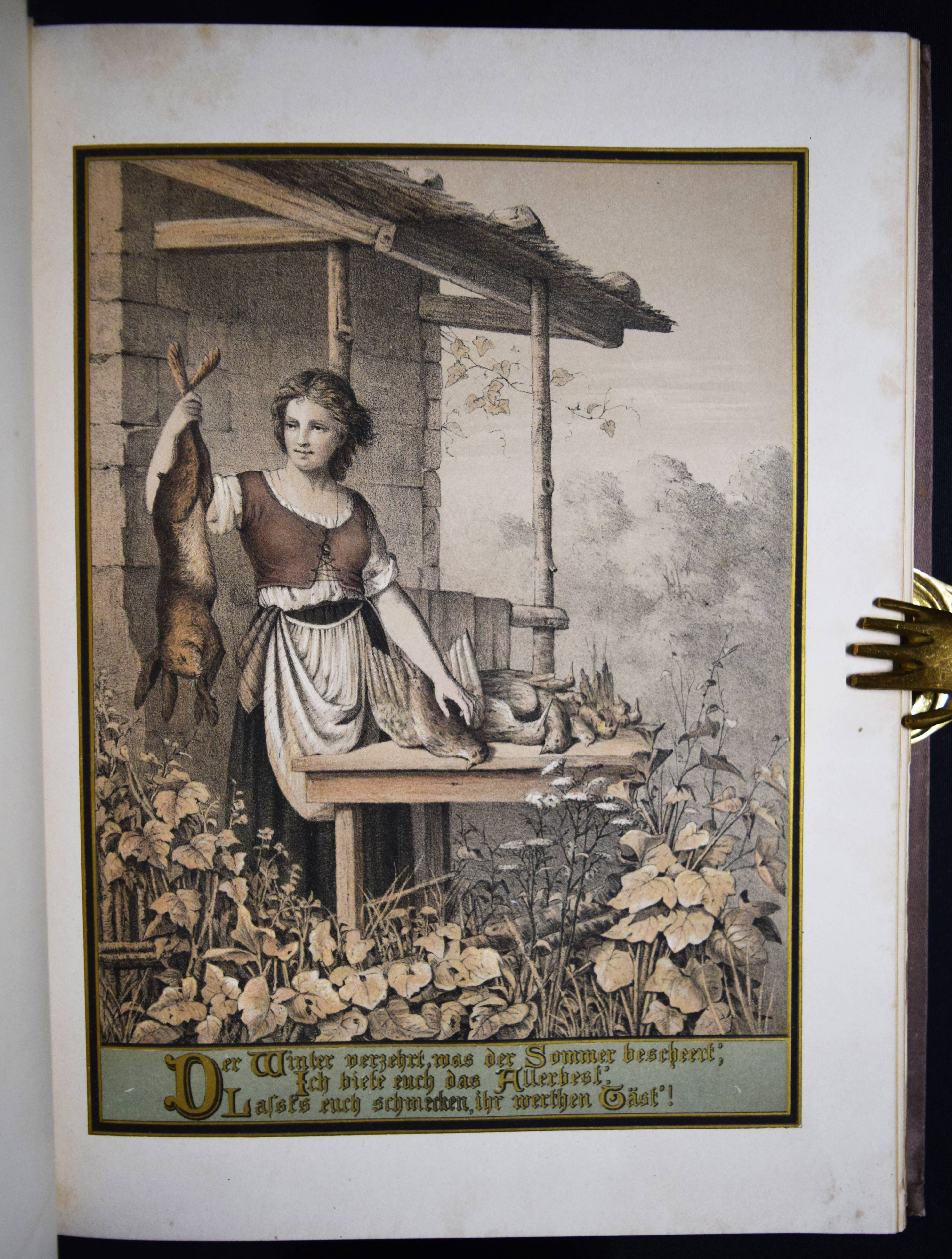 W(oringen), A(ngelica) v. Unser täglich Brot. Einige gute Worte alter und neuer Zeit für meine lieben jungen Freundinnen. Bremen, C. Ed. Müller (1876). 4°. [3] Bl., 143 S., [14] Bl. mit 14 (12 farb. lithogr., 2 Holzstich) Tafeln. Grüner Orig.-Leinenband mit goldgepr. Rücken- und Deckeltitel, dekorativer Rücken- und Deckelvergoldung und Goldschnitt. Horn-Arndt 625. Weiss 4292. – Einzige Ausgabe, selten. – „Prunkkochbuch mit dürftigem Rezeptteil. Das mit einem Preis von 60 Goldmark mit Abstand teuerste Kochbuch der Zeit“ (H.-U. Weiss). – Inhalt: „Die Tochter des Hauses. – Die Frau des Hauses. – Eigner Herd ist Goldes wert. – Feuer und Wasser dienen gern etc. – Werth des Geldes. – Sonst und Jetzt. – Mässigkeit und Genügsamkeit. – Feine Küche. – Ruhe nach der Arbeit. – Gastfreiheit und Schmuck der Tafel. – Getränke (mit einer Weinkarte).“ – Die schönen Tafeln mit romantischen Genreszenen. – Kapital und Fuß geringfügig bestossen, im Blattrand teils etwas fingerfleckig, gutes Exemplar.