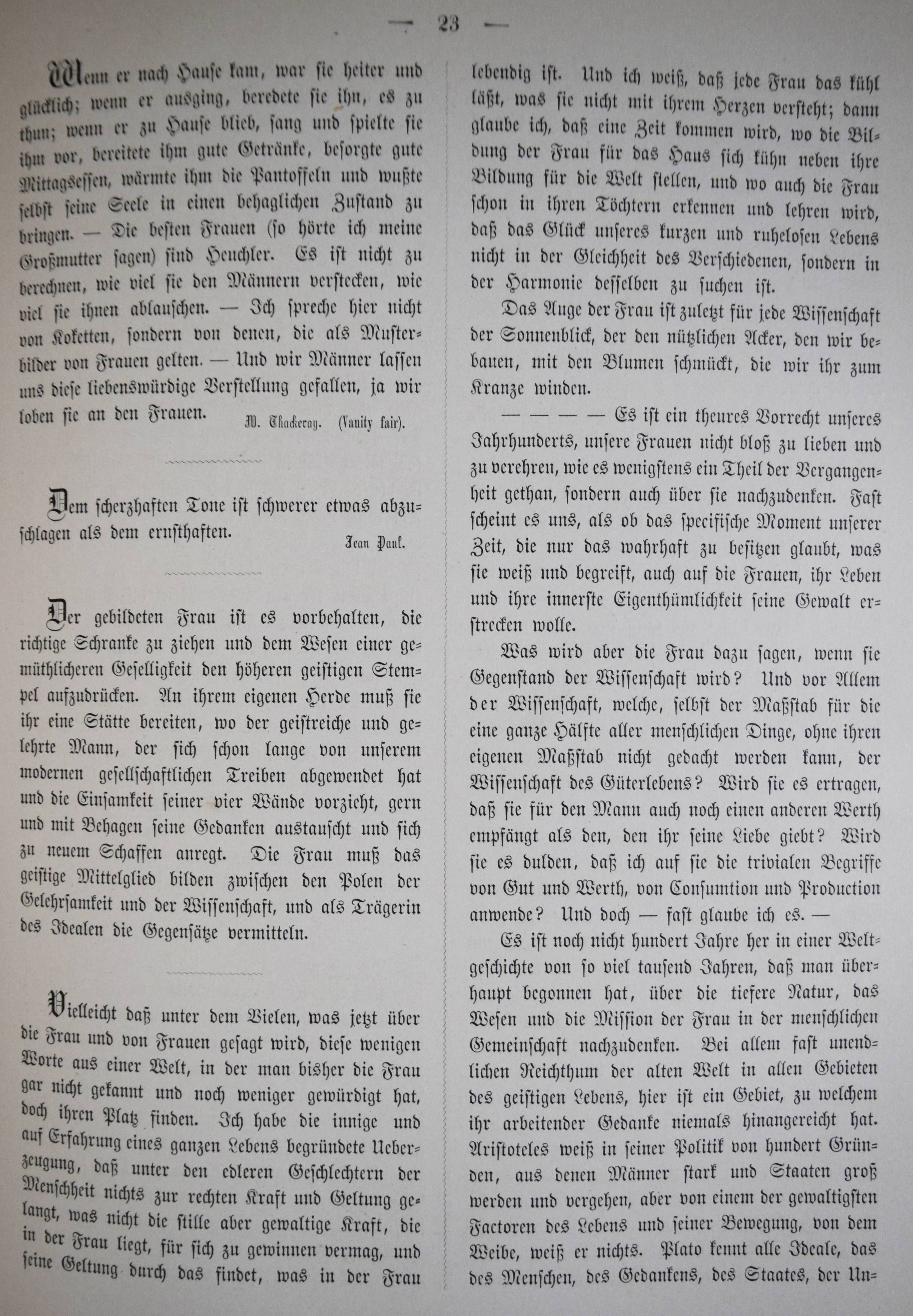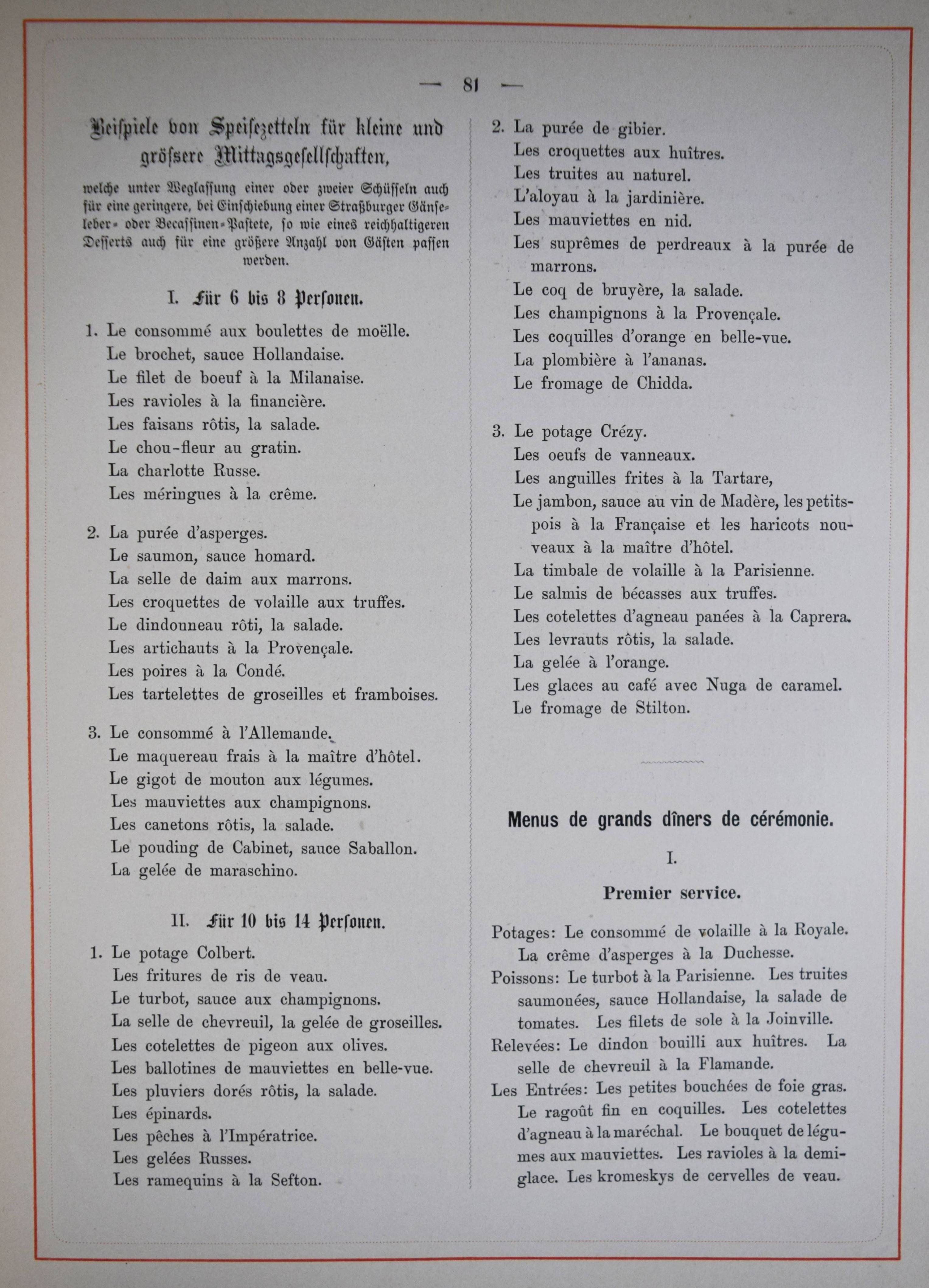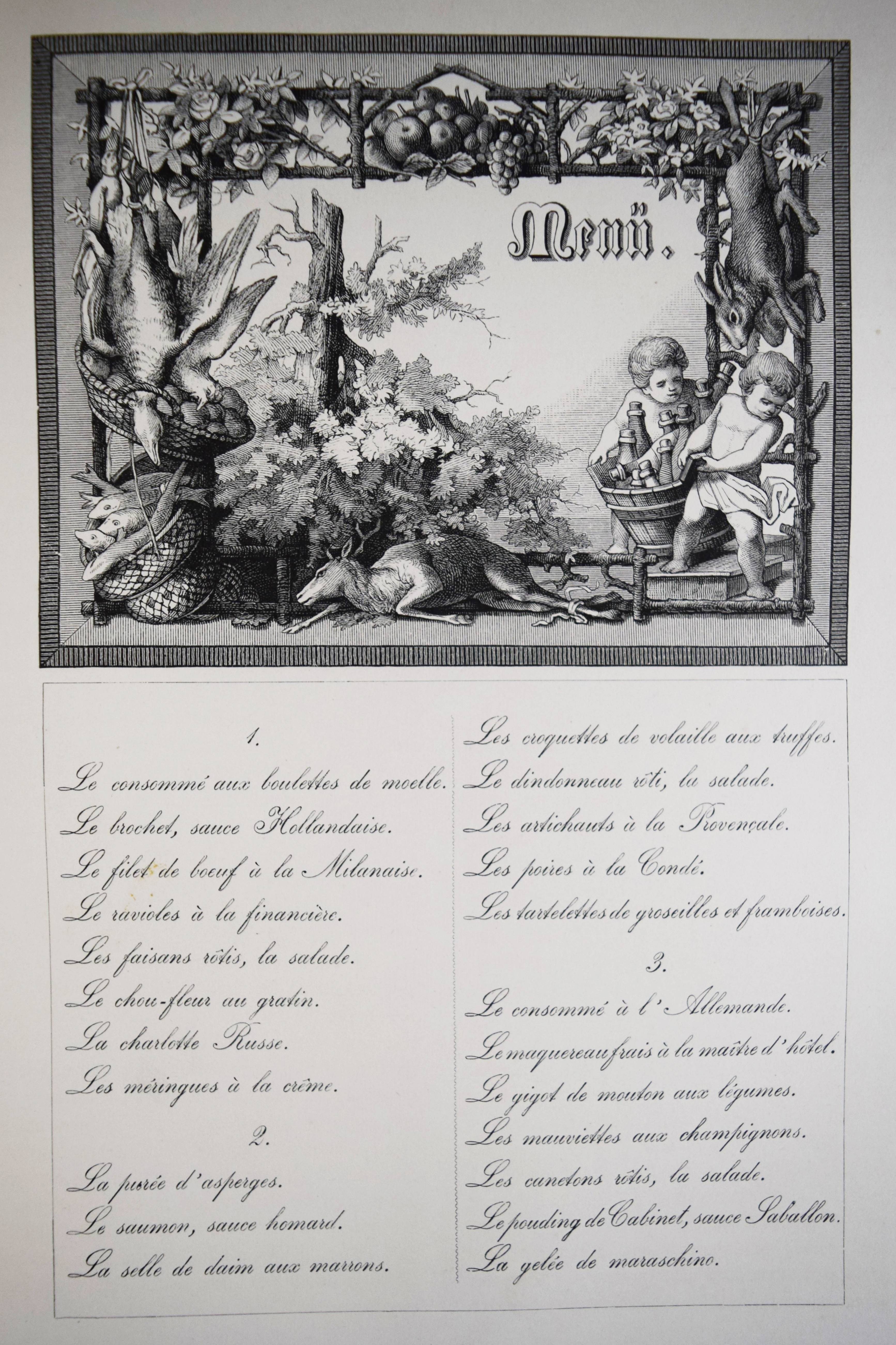 W(oringen), A(ngelica) v. Unser täglich Brot. Einige gute Worte alter und neuer Zeit für meine lieben jungen Freundinnen. Bremen, C. Ed. Müller (1876). 4°. [3] Bl., 143 S., [14] Bl. mit 14 (12 farb. lithogr., 2 Holzstich) Tafeln. Grüner Orig.-Leinenband mit goldgepr. Rücken- und Deckeltitel, dekorativer Rücken- und Deckelvergoldung und Goldschnitt. Horn-Arndt 625. Weiss 4292. – Einzige Ausgabe, selten. – „Prunkkochbuch mit dürftigem Rezeptteil. Das mit einem Preis von 60 Goldmark mit Abstand teuerste Kochbuch der Zeit“ (H.-U. Weiss). – Inhalt: „Die Tochter des Hauses. – Die Frau des Hauses. – Eigner Herd ist Goldes wert. – Feuer und Wasser dienen gern etc. – Werth des Geldes. – Sonst und Jetzt. – Mässigkeit und Genügsamkeit. – Feine Küche. – Ruhe nach der Arbeit. – Gastfreiheit und Schmuck der Tafel. – Getränke (mit einer Weinkarte).“ – Die schönen Tafeln mit romantischen Genreszenen. – Kapital und Fuß geringfügig bestossen, im Blattrand teils etwas fingerfleckig, gutes Exemplar.