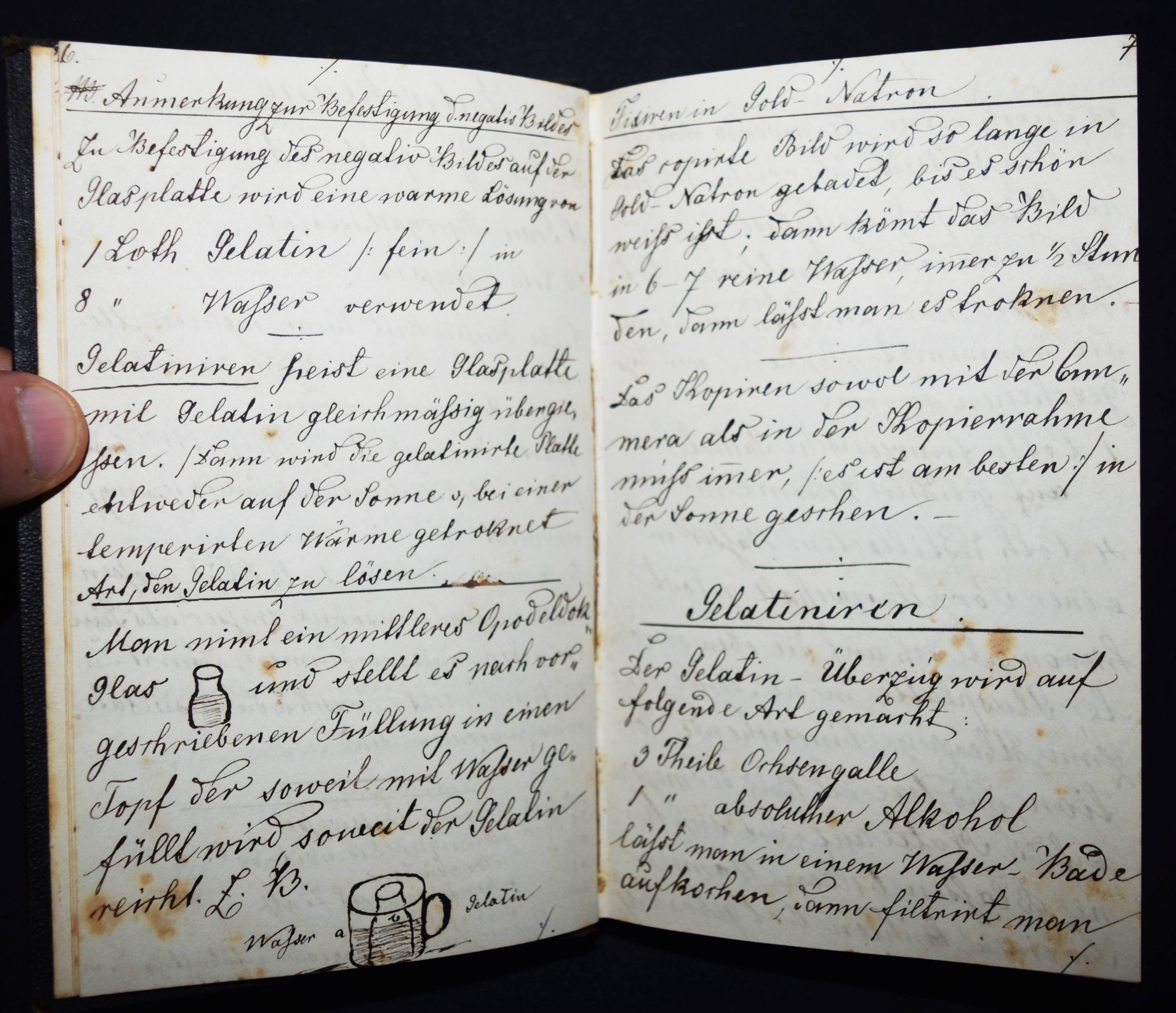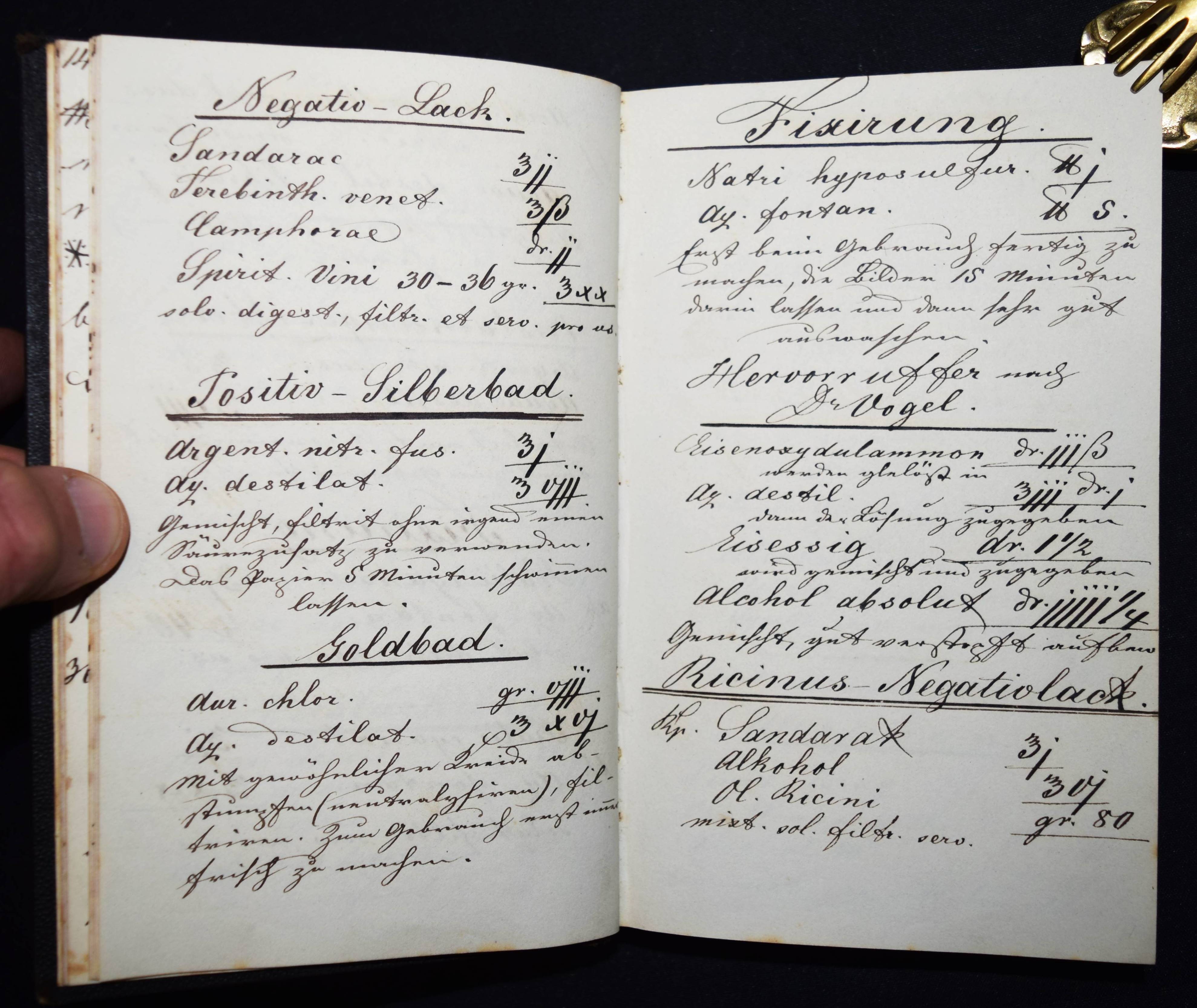 Fleschenberg, Arthur v. Anmerkungen. Recepte, Neuerungen, Erfindungen über Panotopie, Fotografie, Stereoscopie und Micro-Fotografie. Deutsche und lateinische Handschrift auf Papier. Ohne Ort (Wien ?) 1860. 8°. Titel, [27] beschriebene S. mit 2 kl. Zeichnungen und ca. 100 weitere teils beschriebene Blätter (meist mit Rezepten für Arzneimittel). Leinenband der Zeit mit Linienvergoldung. Interessantes frühes Rezeptbuch eines Amateur-Fotografen und Apothekers. – Mit Anleitungen und Rezepten: „Collodium Negativ“, „Silber-Bad“, „Entwicklung“, „Fixation“, „Gelatiren“, „Das Eiweißen der Bilder“, „Bereitung des Chlorgoldes (und) Chlor-Silbers“, „Panalopie. Glas und Leinwandbilder“, „Collodium für Panotopie“ etc. Der Verfasser gibt genaue Anweisungen, z. B. „Entwicklung. 1 Loth destilliertes Wasser, 2 Loth Alcohol-Absolut, 2 Loth Radical-Essig werden zusammen vermengt, und hier mit einer Reibsihale von Glas 3/4 Loth gereinigten Eisenvitriol und 3/4 Loth essig saures Bley, Bleizucker abgerieben…“ – Außerdem enthält das Buch noch zahlreiche pharmazeutische Rezepte: „Aqua Cologniens“, „Gallus-Tinte“, „Lac. Magnesiae“, „Pulver für Frau Hollaender“, „Prinzessen-Wasser“, „Keuchhusten-Pulver“ etc. – Stellenweise etwas braunfleckig, sonst sehr gut erhalten.