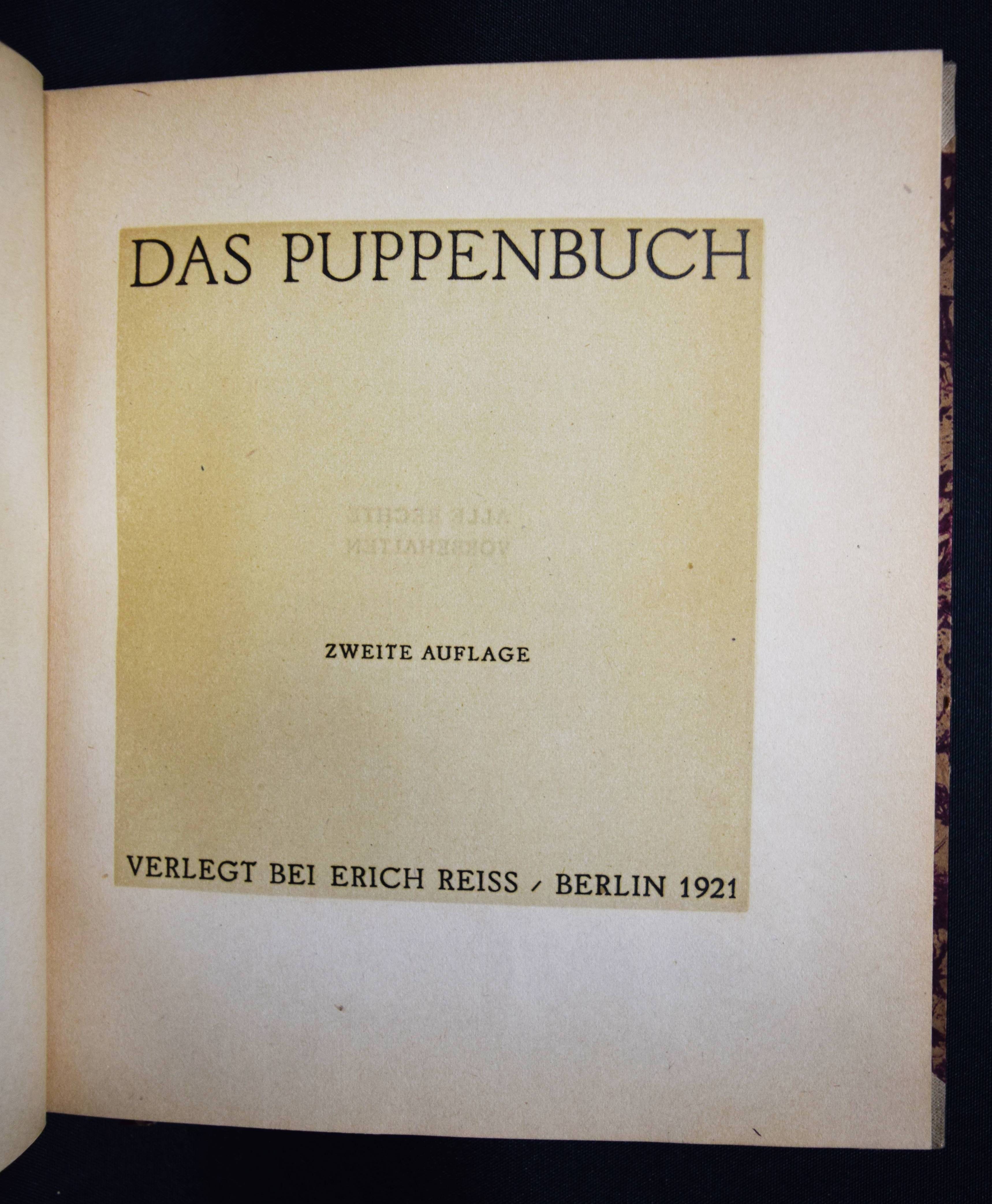 Däubler, Theodor, Kasimir Edschmid, René Schickele und Carlo Mierendorff. Das Puppenbuch. (Texte zu Puppen der Erna Pinner und Lotte Pritzel). 2. Aufl. Berlin, Reiss, 1921. 8°. [54] Bl. mit 32 mont. Tafeln nach Fotografien. Orig.-Halbleinenband mit goldgepr. Rückentitel (Entwurf und Anfertigung des Bezugspapiers: M. v. Steiger). Halbey 21.27. Lipperheide Ti 27. – Gedruckt bei Otto von Holten. Lotte Pritzel soll Hans Bellmer bei der Fertigung seiner „Puppe“ beraten haben. – Gutes Exemplar.