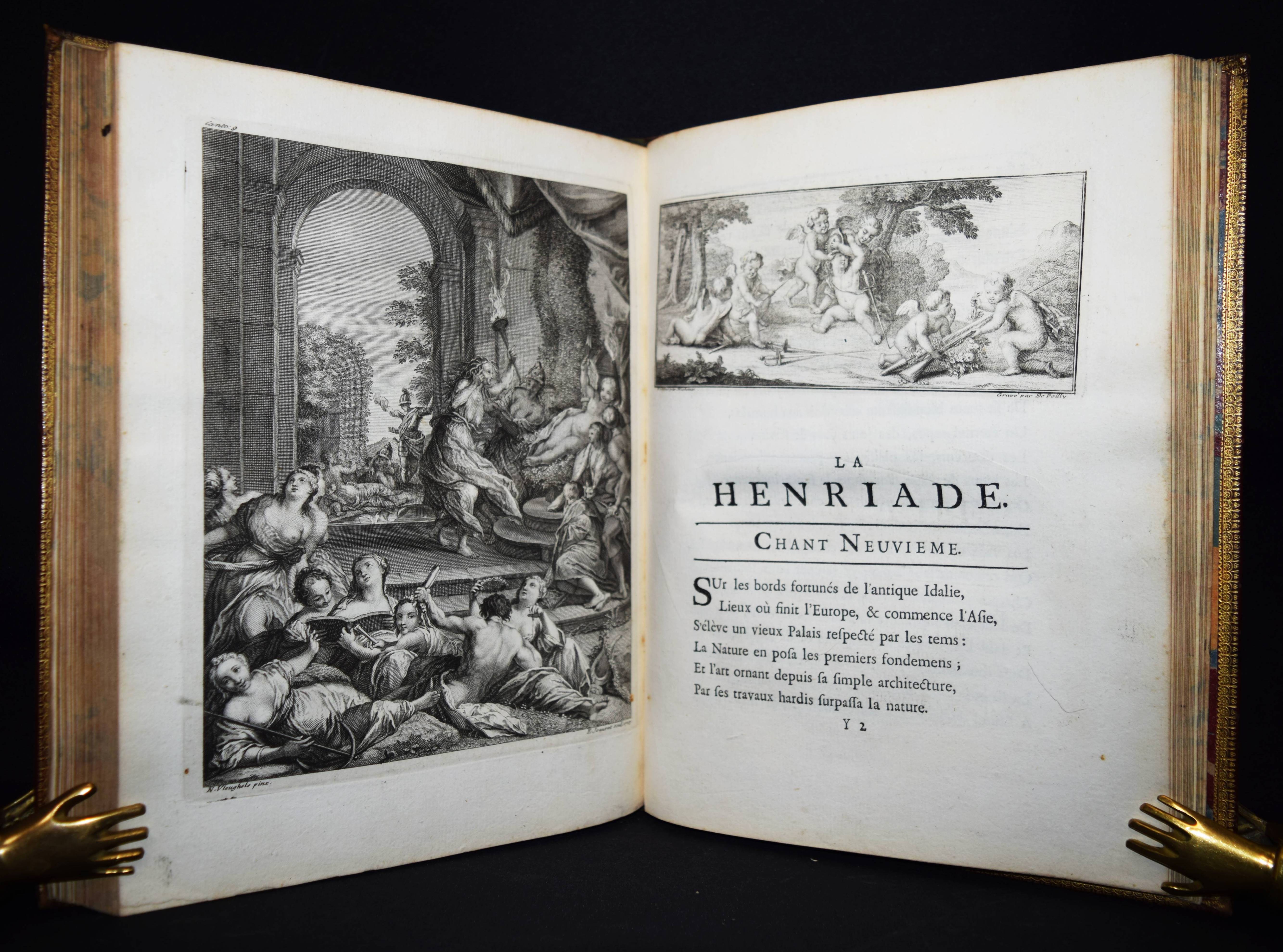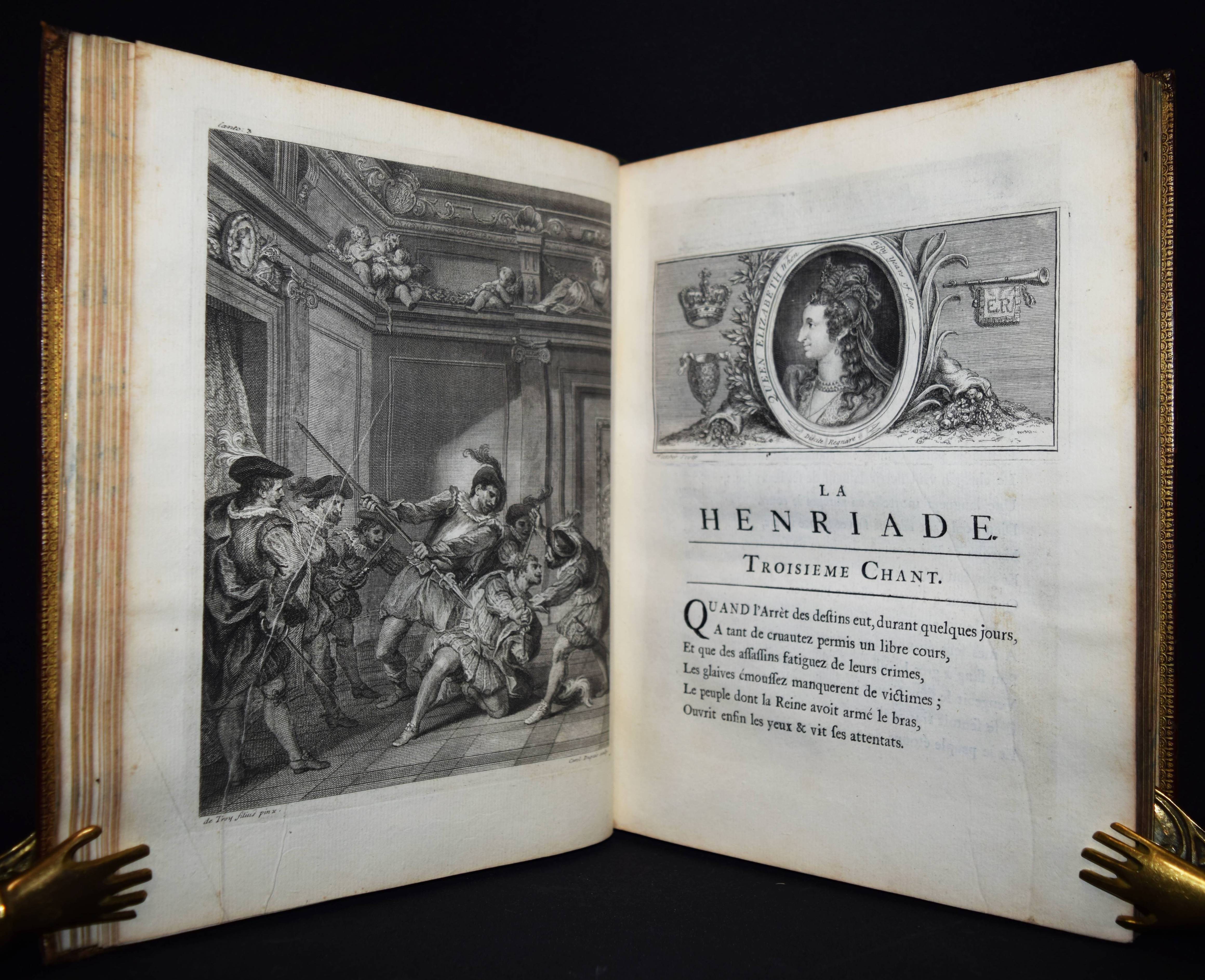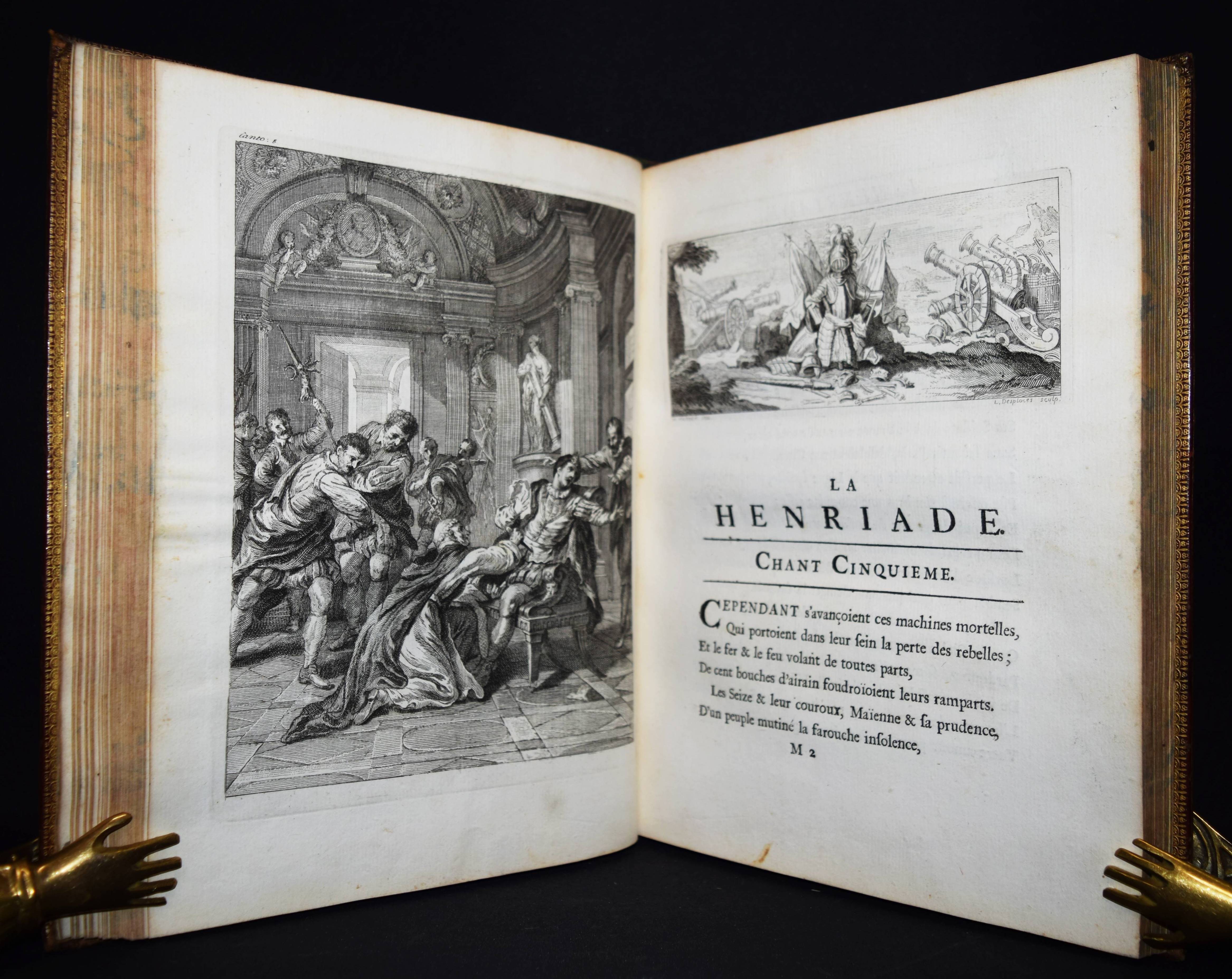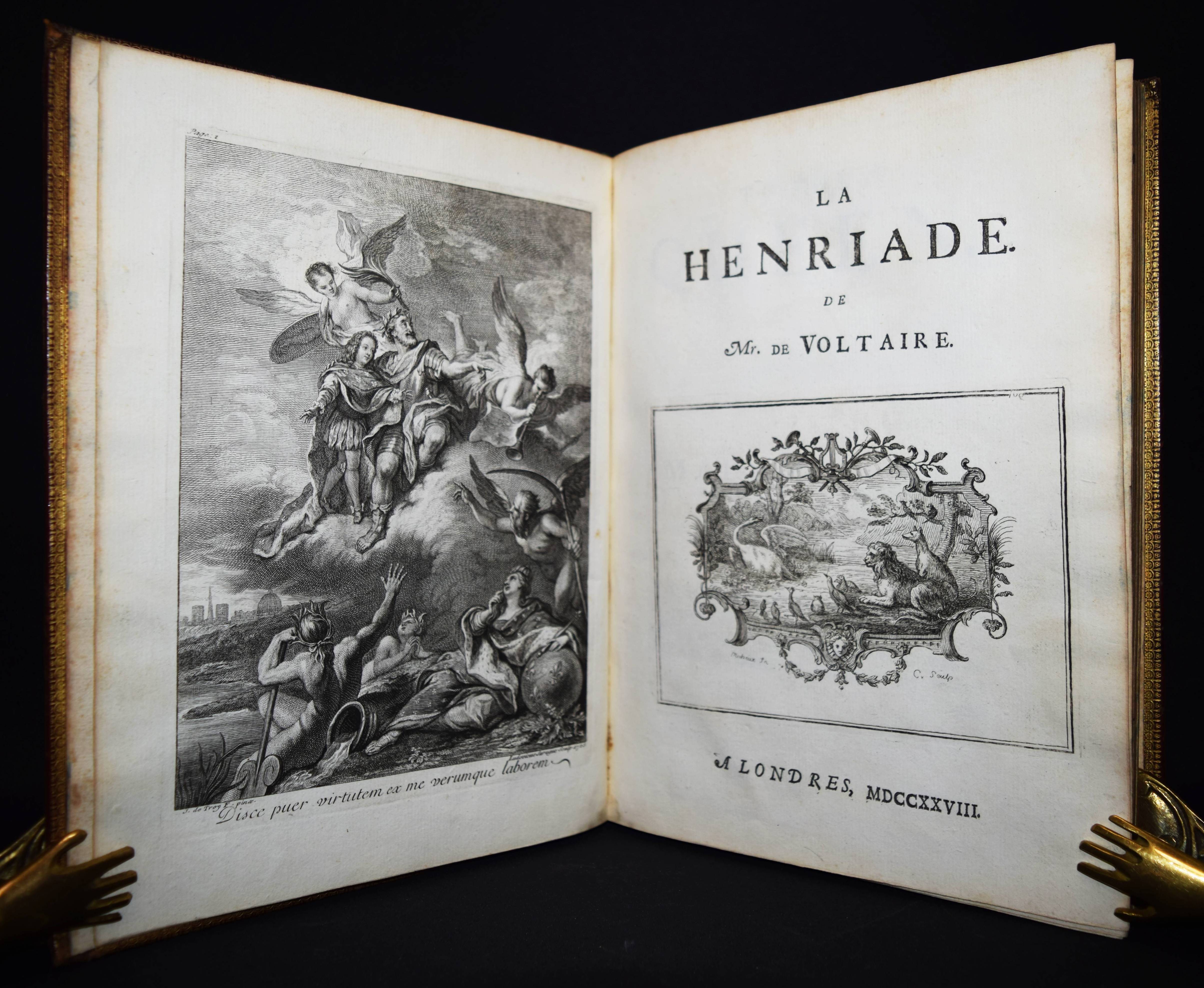 Voltaire, (Francois-Marie Arouet de). La Henriade. A Londres (London), o. Dr. 1728. 4° (29,5 x 23 cm.). [3] Bl., 202 S. mit gestoch. Frontspiz von Surugue nach J. de Troy, gestoch. Titelvignette, 10 gestoch. Kupfertafeln von Jeaurat, Dupuis, Desplaces, Cochin und Tardieu nach J. de Troy,Lemoine und Vleughels, 10 gestoch. Kopfvignetten Dupuis, de Poilly, Fletcher und Lépicié nach Micheux und 10 Schlussvignetten (Culs-de-lampe). Weinroter Maroquin-Lederband mit goldgepr. Rückenschild, floraler Rückenvergoldung, Deckelfiletten, Innenkantenvergoldung und Goldschnitt. Bengesco I, 365. Cohen/Ricci 1025. Le Petit, Bibliographie des éditions originales pp. 534-535. Sander 1998. – Erste vollständige und illustrierte Ausgabe mit zehn Gesängen (vorher nur neun). Erschien auch in kleinerem Format ohne die Kupfertafeln. Wie meist ohne die bei Bengesco erwähnte Subskribentenliste. Nach dem Titel mit der Widmung „To the Queen“ in englischer Sprache. – 1728 war Voltaire in England und hatte gerade einen schrecklichen Bankrott erlitten. Ludwig XV. ließ ihm zweitausend Kronen zukommen, und viele vermögenden Londoner subskribierten ein Exemplar der vorliegenden Ausgabe von La Henriade. Damit erhielt Voltaire sein Vermögen zurück. Da Ludwig XV. die Widmung abgelehnt hatte, ehrte Voltaire damit Königin Elisabeth, von deren Land und liberalen Institutionen er beeindruckt war. – “Première à avoir été soigneusement corrigée et revue par Voltaire, cette édition de luxe présente un texte parfois différent de celui de l’édition de 1723 et des suivantes, et partout ce texte est beaucoup plus correct. Cette belle édition peut donc être considérée comme la première à être réellement authentique. – La vignette en tête du „Chant troisième“ contient le portrait, en médaillon, de la reine Élisabeth d’Angleterre” (Le Petit). – Die Deckel stellenweise etwas tintenfleckig, sehr schönes prachtvoll gebundenes Exemplar aus der Bibliothek des Diplomaten Simon Harcourt (1714-1777), der 1768 bis 1772 britscher Botschafter in Paris war, mit dessen Wappen-Exlibris. – The covers somewhat ink-stained in places, a very fine, splendidly bound copy from the library of the diplomat Simon Harcourt (1714-1777), who was British ambassador in Paris from 1768 to 1772, with his armorial bookplate.