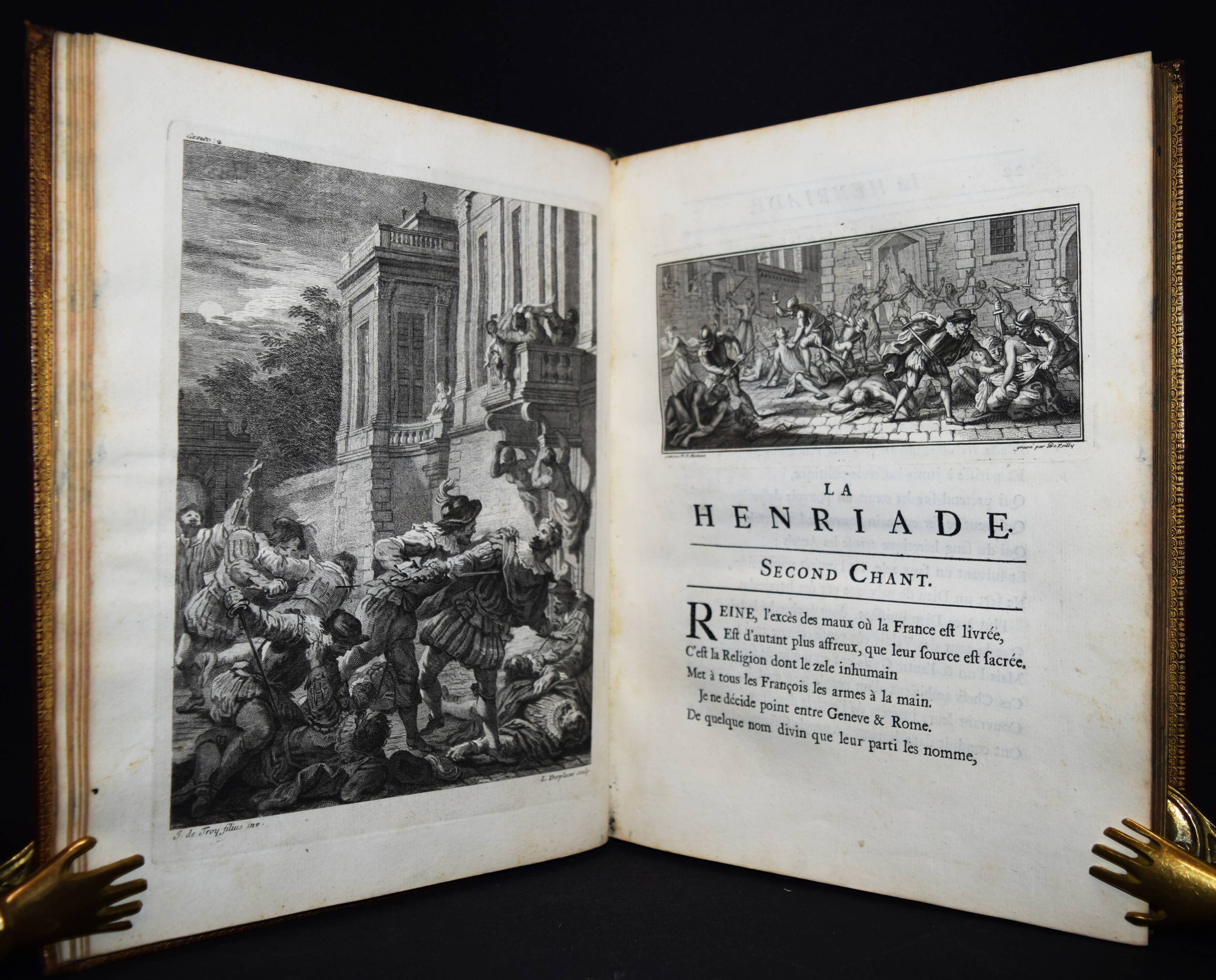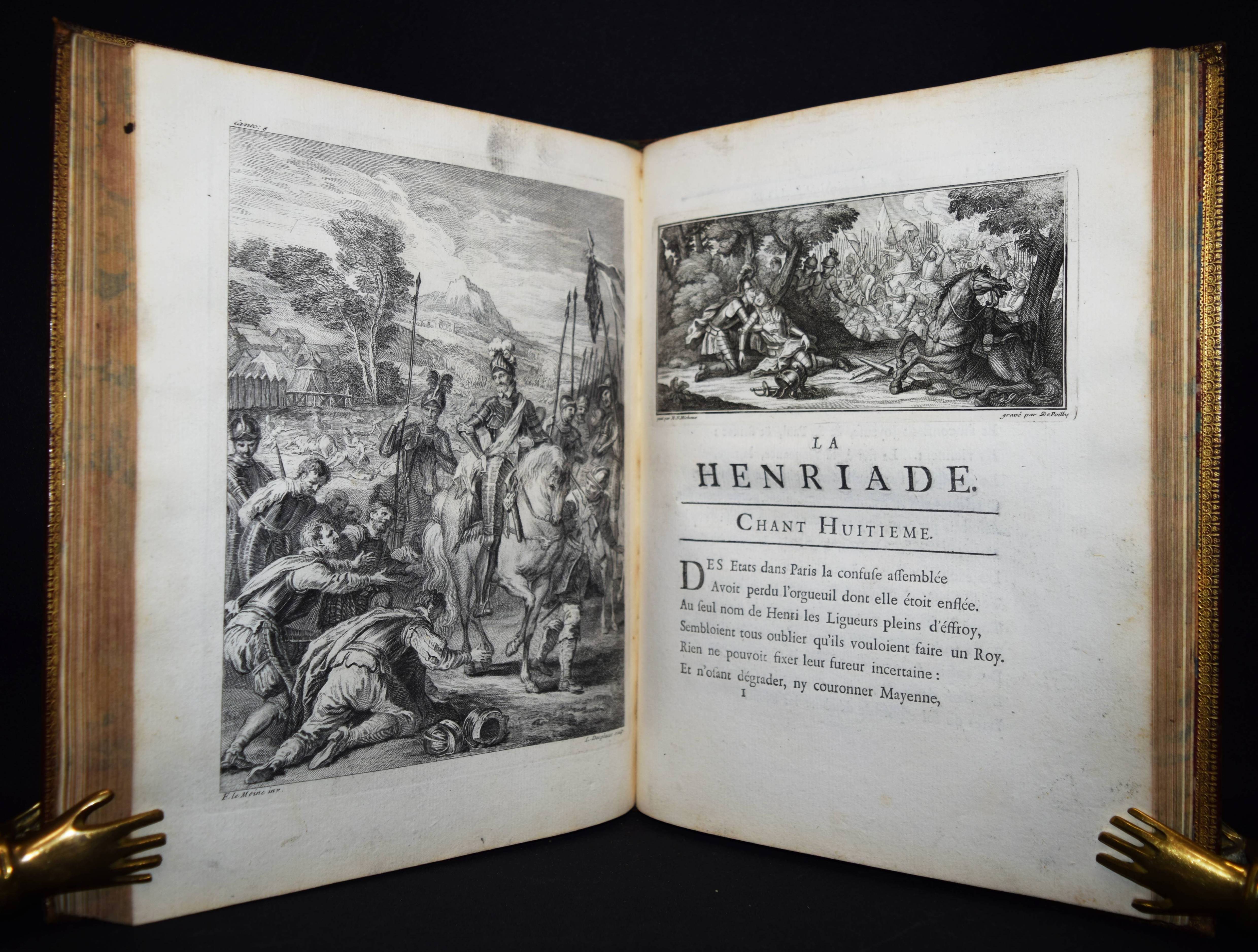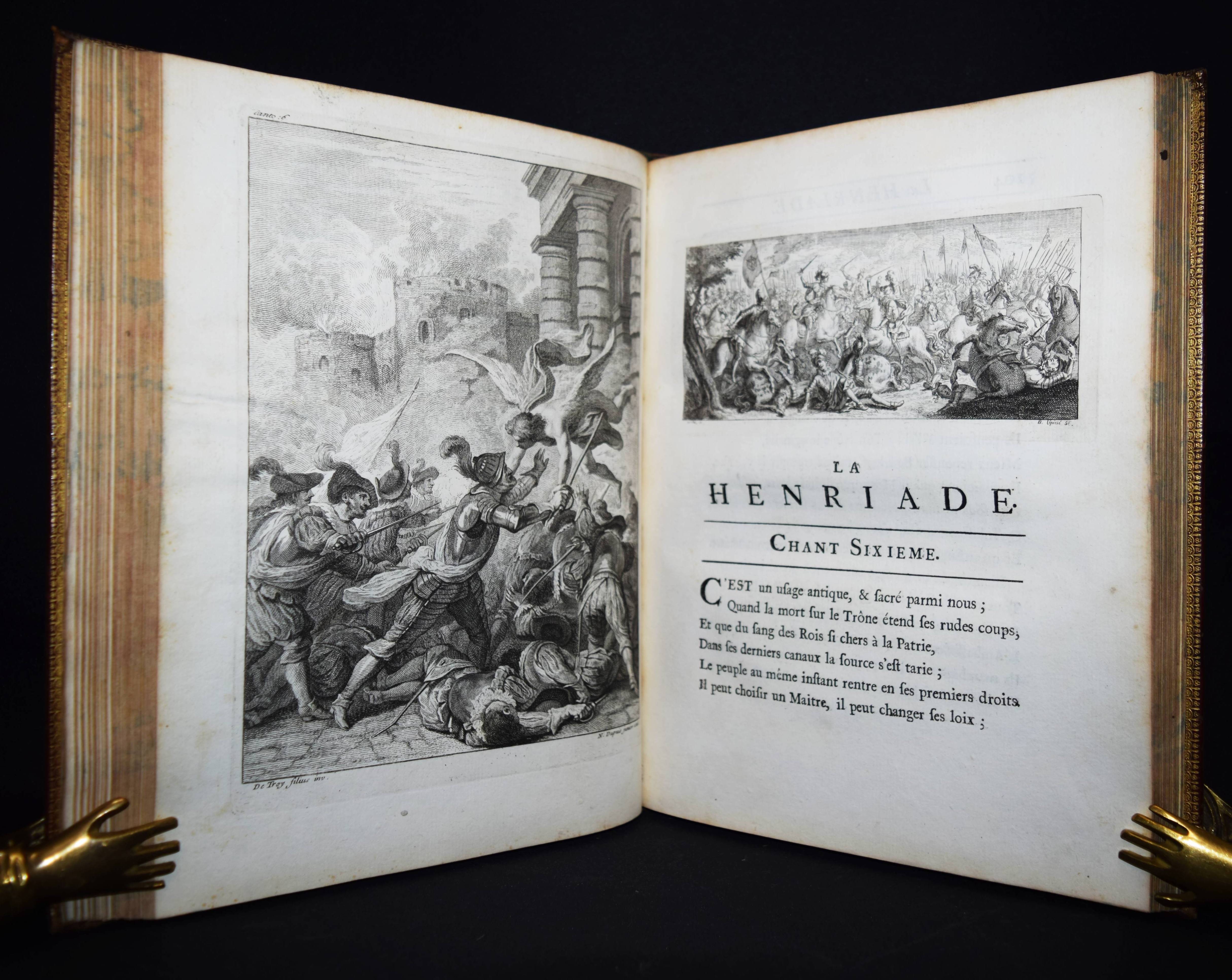 Voltaire, (Francois-Marie Arouet de). La Henriade. A Londres (London), o. Dr. 1728. 4° (29,5 x 23 cm.). [3] Bl., 202 S. mit gestoch. Frontspiz von Surugue nach J. de Troy, gestoch. Titelvignette, 10 gestoch. Kupfertafeln von Jeaurat, Dupuis, Desplaces, Cochin und Tardieu nach J. de Troy,Lemoine und Vleughels, 10 gestoch. Kopfvignetten Dupuis, de Poilly, Fletcher und Lépicié nach Micheux und 10 Schlussvignetten (Culs-de-lampe). Weinroter Maroquin-Lederband mit goldgepr. Rückenschild, floraler Rückenvergoldung, Deckelfiletten, Innenkantenvergoldung und Goldschnitt. Bengesco I, 365. Cohen/Ricci 1025. Le Petit, Bibliographie des éditions originales pp. 534-535. Sander 1998. – Erste vollständige und illustrierte Ausgabe mit zehn Gesängen (vorher nur neun). Erschien auch in kleinerem Format ohne die Kupfertafeln. Wie meist ohne die bei Bengesco erwähnte Subskribentenliste. Nach dem Titel mit der Widmung „To the Queen“ in englischer Sprache. – 1728 war Voltaire in England und hatte gerade einen schrecklichen Bankrott erlitten. Ludwig XV. ließ ihm zweitausend Kronen zukommen, und viele vermögenden Londoner subskribierten ein Exemplar der vorliegenden Ausgabe von La Henriade. Damit erhielt Voltaire sein Vermögen zurück. Da Ludwig XV. die Widmung abgelehnt hatte, ehrte Voltaire damit Königin Elisabeth, von deren Land und liberalen Institutionen er beeindruckt war. – “Première à avoir été soigneusement corrigée et revue par Voltaire, cette édition de luxe présente un texte parfois différent de celui de l’édition de 1723 et des suivantes, et partout ce texte est beaucoup plus correct. Cette belle édition peut donc être considérée comme la première à être réellement authentique. – La vignette en tête du „Chant troisième“ contient le portrait, en médaillon, de la reine Élisabeth d’Angleterre” (Le Petit). – Die Deckel stellenweise etwas tintenfleckig, sehr schönes prachtvoll gebundenes Exemplar aus der Bibliothek des Diplomaten Simon Harcourt (1714-1777), der 1768 bis 1772 britscher Botschafter in Paris war, mit dessen Wappen-Exlibris. – The covers somewhat ink-stained in places, a very fine, splendidly bound copy from the library of the diplomat Simon Harcourt (1714-1777), who was British ambassador in Paris from 1768 to 1772, with his armorial bookplate.