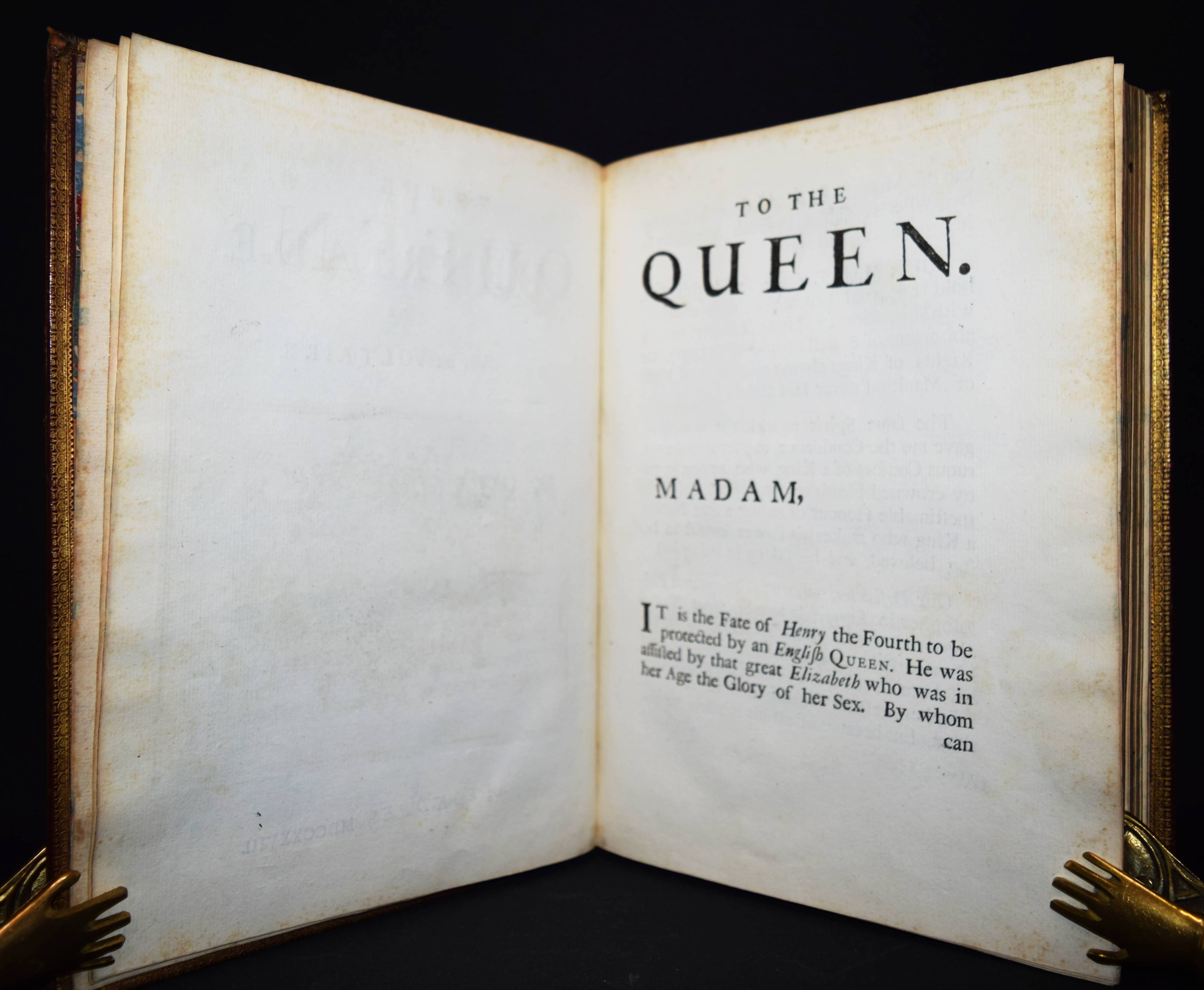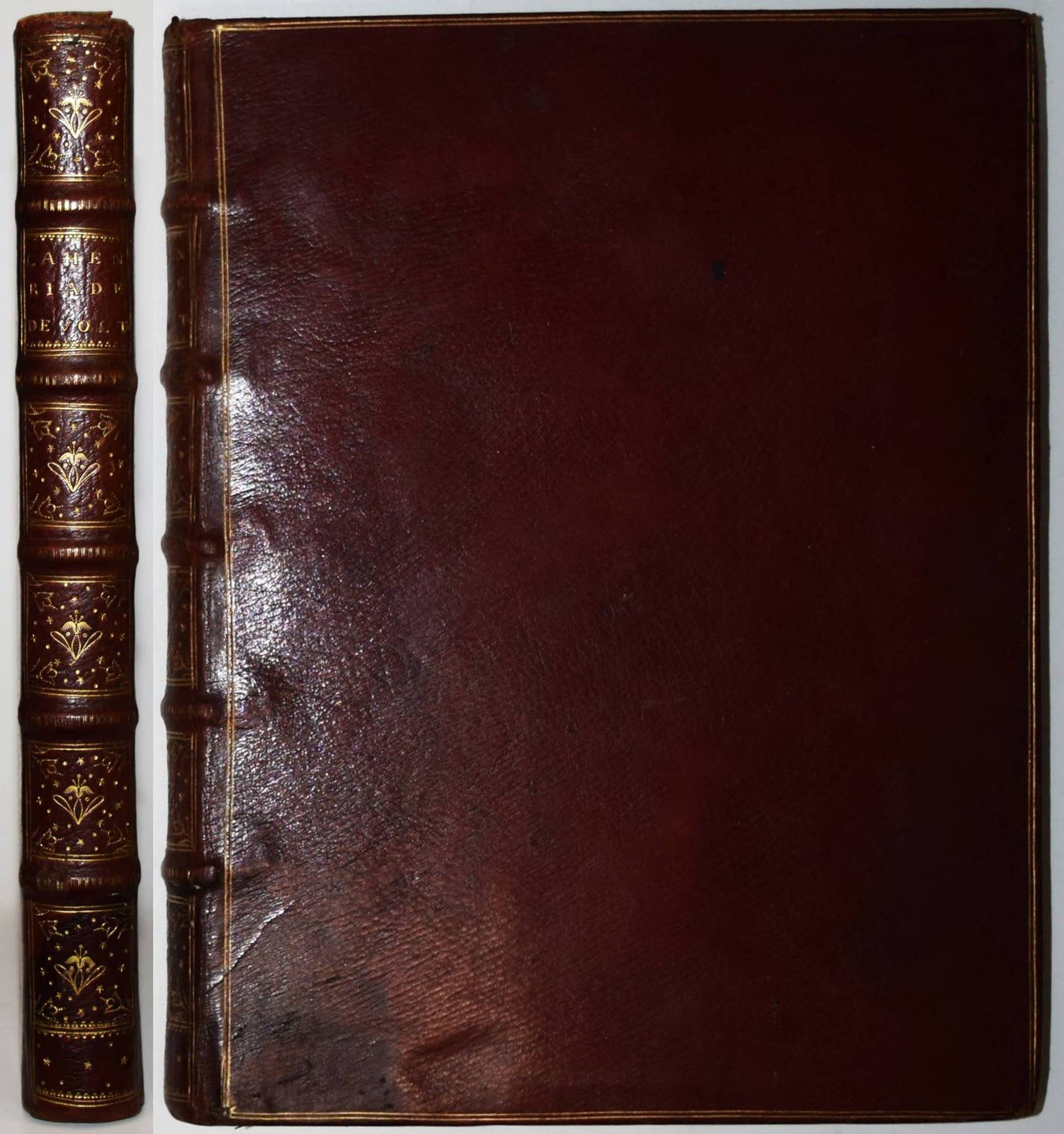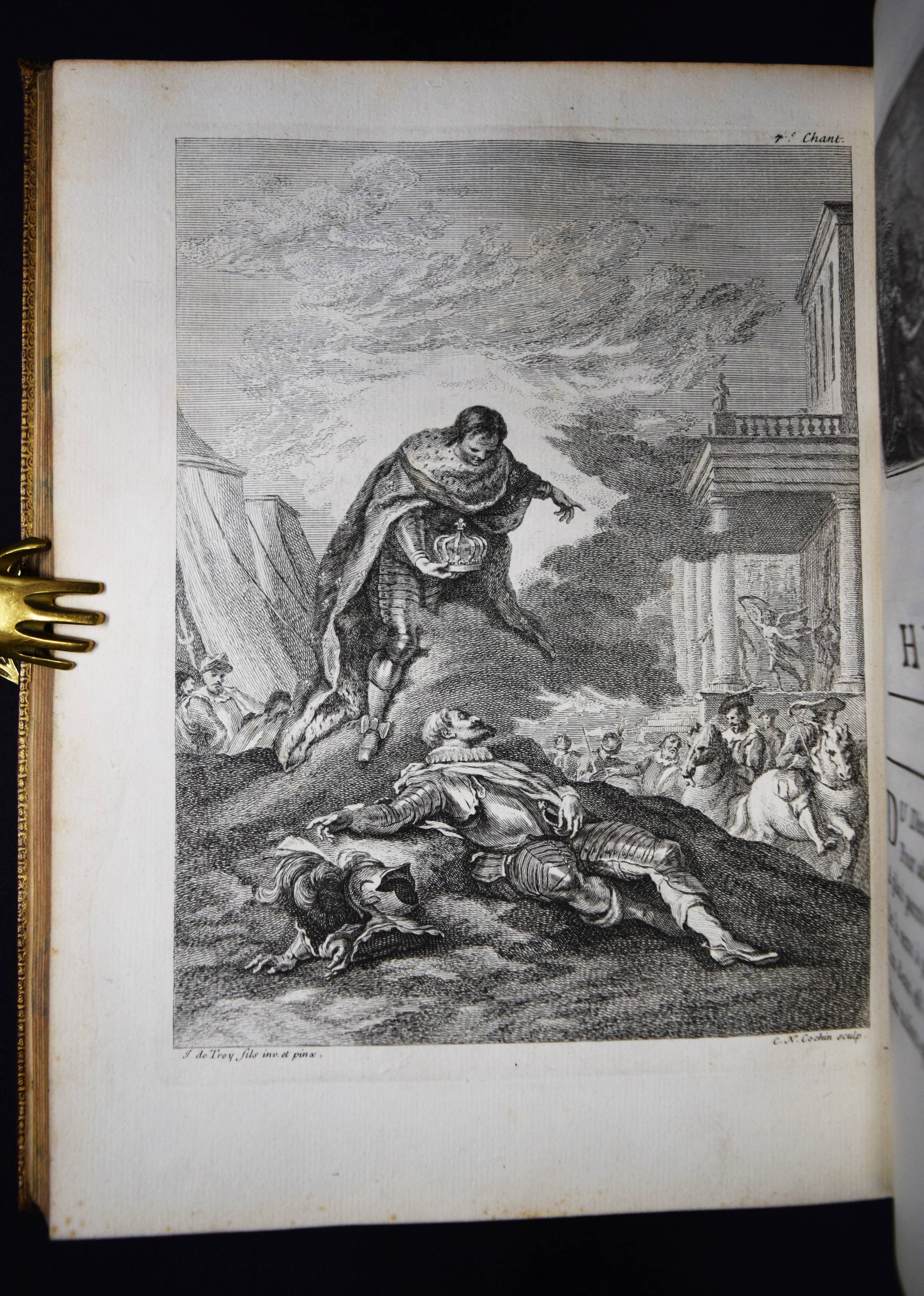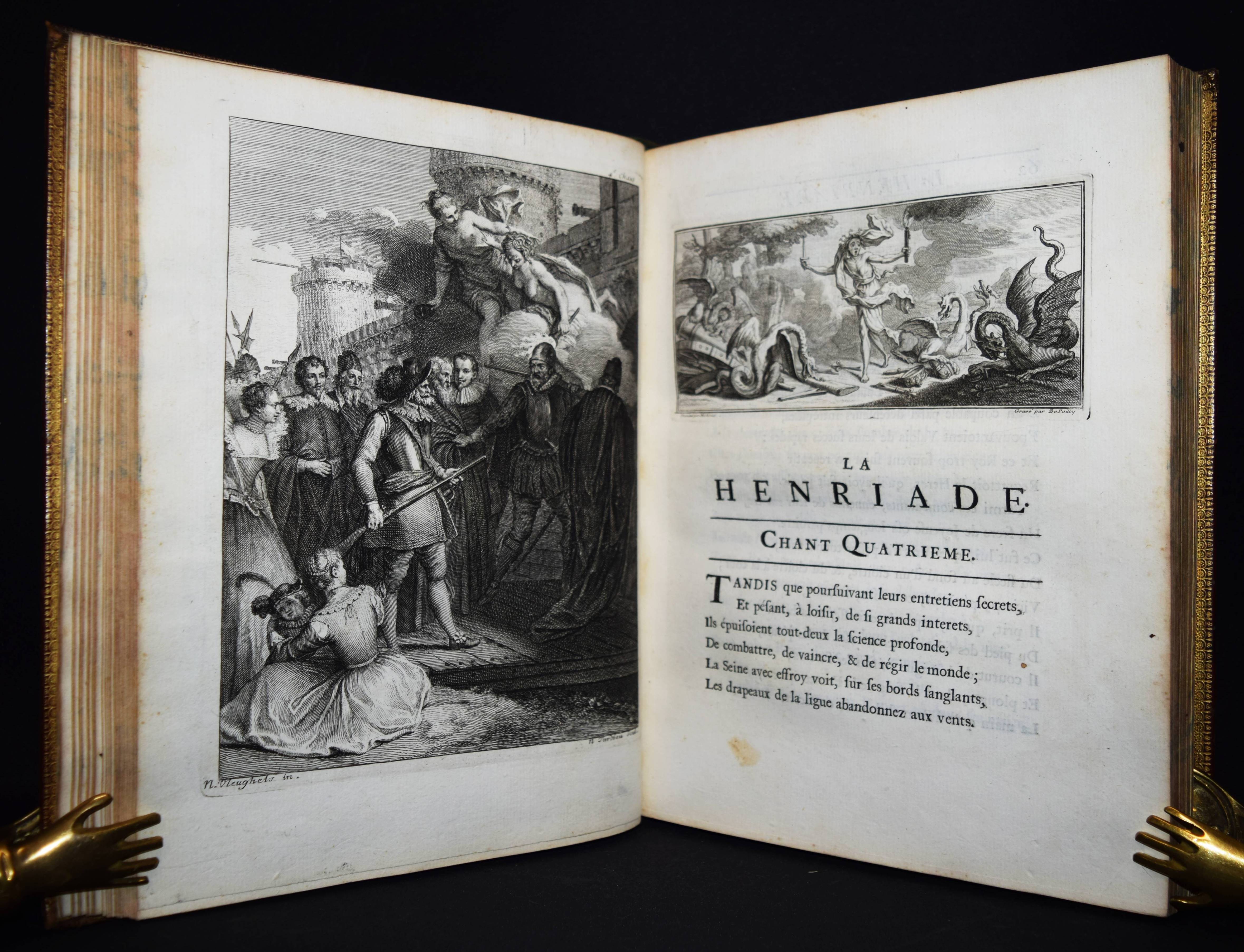 Voltaire, (Francois-Marie Arouet de). La Henriade. A Londres (London), o. Dr. 1728. 4° (29,5 x 23 cm.). [3] Bl., 202 S. mit gestoch. Frontspiz von Surugue nach J. de Troy, gestoch. Titelvignette, 10 gestoch. Kupfertafeln von Jeaurat, Dupuis, Desplaces, Cochin und Tardieu nach J. de Troy,Lemoine und Vleughels, 10 gestoch. Kopfvignetten Dupuis, de Poilly, Fletcher und Lépicié nach Micheux und 10 Schlussvignetten (Culs-de-lampe). Weinroter Maroquin-Lederband mit goldgepr. Rückenschild, floraler Rückenvergoldung, Deckelfiletten, Innenkantenvergoldung und Goldschnitt. Bengesco I, 365. Cohen/Ricci 1025. Le Petit, Bibliographie des éditions originales pp. 534-535. Sander 1998. – Erste vollständige und illustrierte Ausgabe mit zehn Gesängen (vorher nur neun). Erschien auch in kleinerem Format ohne die Kupfertafeln. Wie meist ohne die bei Bengesco erwähnte Subskribentenliste. Nach dem Titel mit der Widmung „To the Queen“ in englischer Sprache. – 1728 war Voltaire in England und hatte gerade einen schrecklichen Bankrott erlitten. Ludwig XV. ließ ihm zweitausend Kronen zukommen, und viele vermögenden Londoner subskribierten ein Exemplar der vorliegenden Ausgabe von La Henriade. Damit erhielt Voltaire sein Vermögen zurück. Da Ludwig XV. die Widmung abgelehnt hatte, ehrte Voltaire damit Königin Elisabeth, von deren Land und liberalen Institutionen er beeindruckt war. – “Première à avoir été soigneusement corrigée et revue par Voltaire, cette édition de luxe présente un texte parfois différent de celui de l’édition de 1723 et des suivantes, et partout ce texte est beaucoup plus correct. Cette belle édition peut donc être considérée comme la première à être réellement authentique. – La vignette en tête du „Chant troisième“ contient le portrait, en médaillon, de la reine Élisabeth d’Angleterre” (Le Petit). – Die Deckel stellenweise etwas tintenfleckig, sehr schönes prachtvoll gebundenes Exemplar aus der Bibliothek des Diplomaten Simon Harcourt (1714-1777), der 1768 bis 1772 britscher Botschafter in Paris war, mit dessen Wappen-Exlibris. – The covers somewhat ink-stained in places, a very fine, splendidly bound copy from the library of the diplomat Simon Harcourt (1714-1777), who was British ambassador in Paris from 1768 to 1772, with his armorial bookplate.