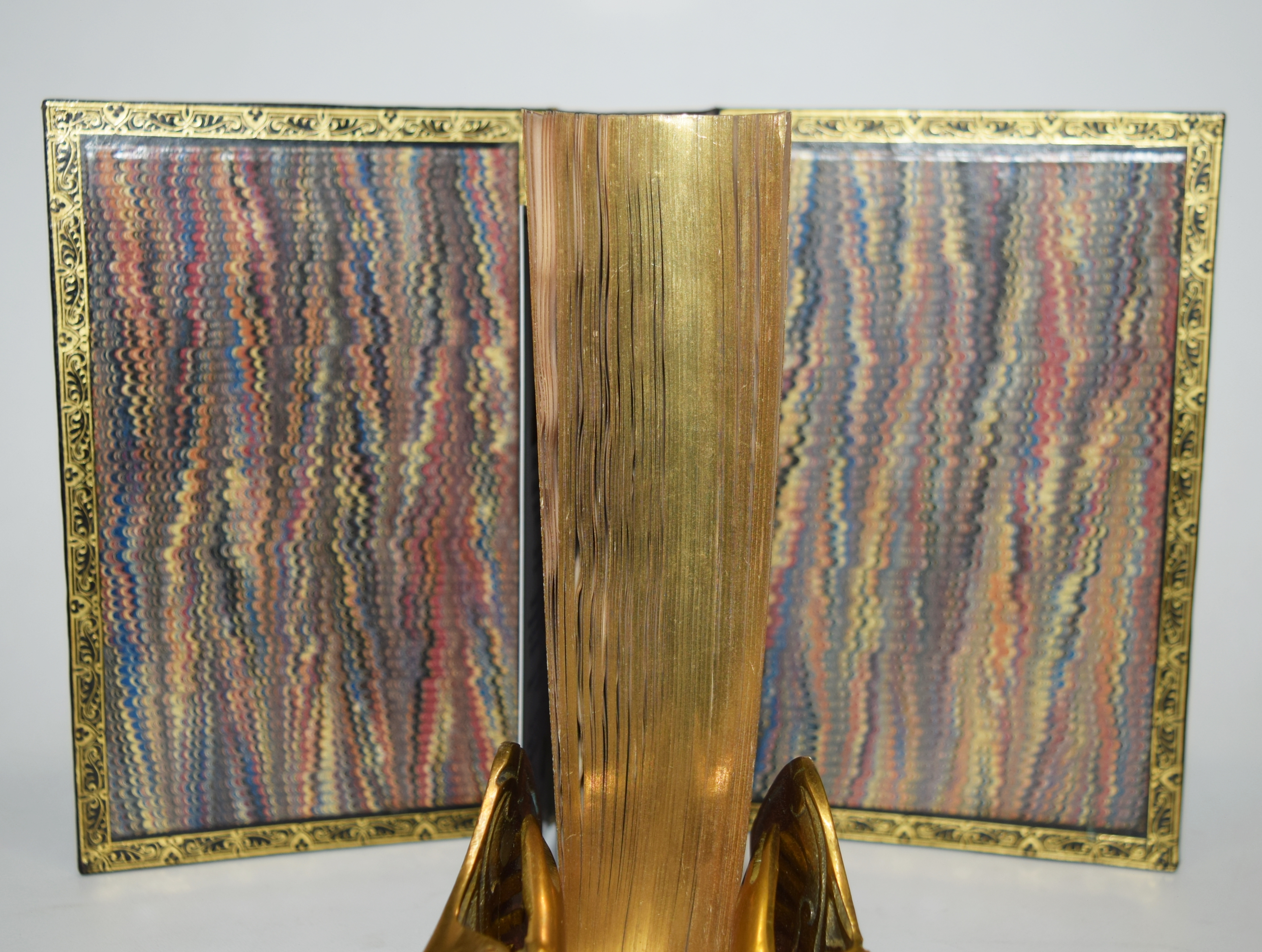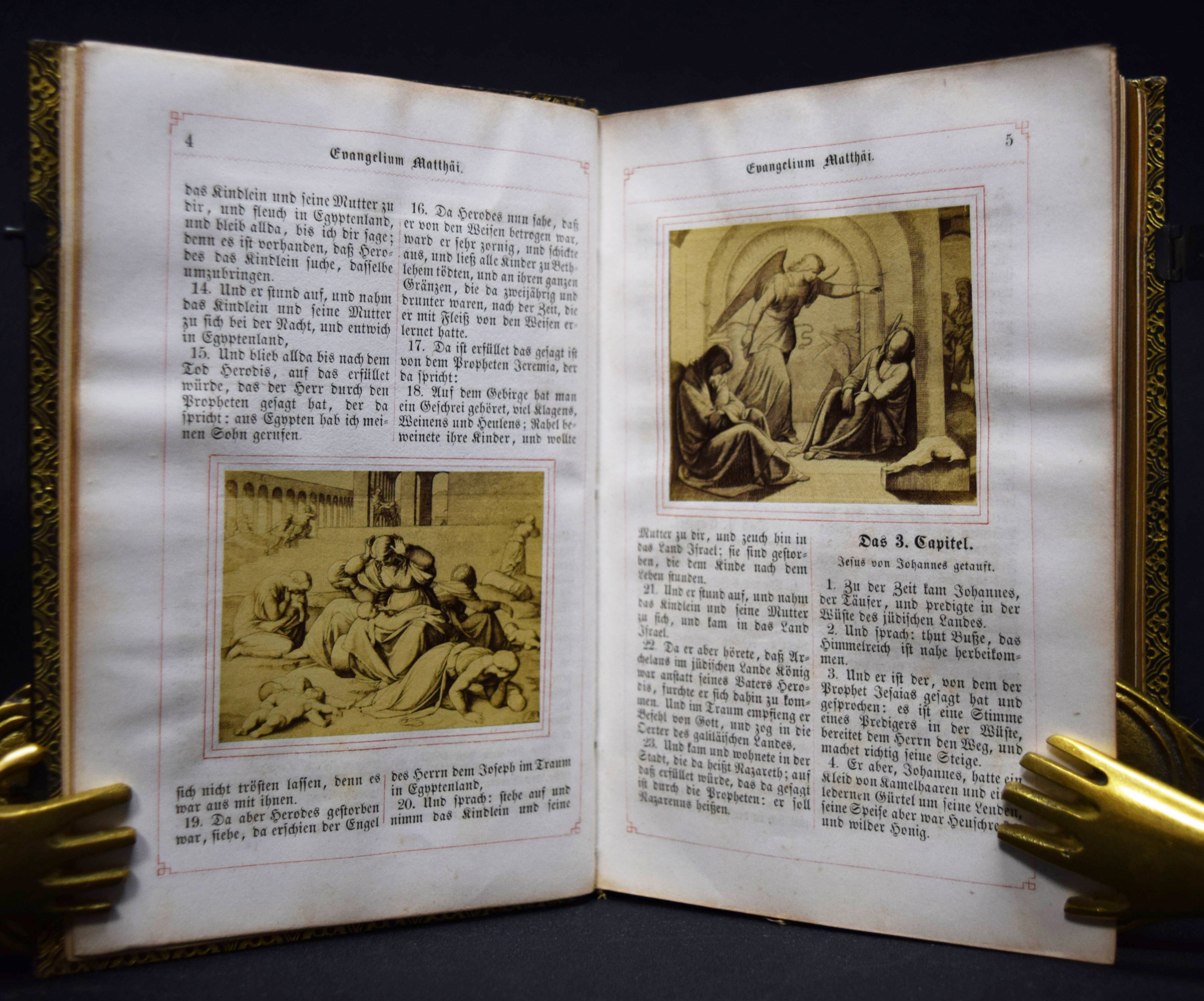 Albert – Luther, Martin (Übers.). Das Neue Testament unsers Herrn u. Heilandes Jesu Christi. Mit Photographien der ersten Künstler Deutschlands (u. a. Ludwig Richter, Rethel, Schnorr v. Carolsfeld, Strähuber und G. Jäger). Stuttgart u. München, Bibelanstalt der J. G. Cotta’schen Buchhandlung o. J. (1860). 8°. Titel in Rot und Schwarz, 484 S., [2] Bl. mit 44 (2 ganzs.) mont. Orig.-Photographien (Abuminabzüge, meist ca. 5,5 x 6 cm.) von Joseph Albert. Blindgepr. Chagrin-Ledereinband mit 8 goldgepr. Monogrammen „NT“ in den Ecken, Steh- und Innenkantenvergoldung und Goldschnitt. Heidtmann, Wie das Photo ins Buch kam 1444. – Die ersten deutschen Bibel-Illustrationen in Fotografie. 1869 erschien eine zweite Ausgabe, ergänzt mit „Der Psalter“ bei Brockhaus in Leipzig. 1850 erschien bei Cotta eine Quartausgabe mit den Illustrationen in Holzschnitten. J. Albert (1825-1886), seit 1858 Hofphotograph in München und „Meister der Reproduktionsphotographie“ (F. Heidtmann), stattete bereits 1859 eine Prachtausgabe von Schillers Gedichten für Cotta mit Fotografien aus. – „Kein anderer etablierter Verlag beschäftigte sich damals in nennenswertem Umfange mit der Illustration durch Photographien. Für dieses Gebiet entstanden vielmehr neue Verlage, wie die von Schauer, Bruckmann, Hanfstaengl und Albert. Cotta war illustrationstechnisch interessiert und pflegte auch ein wenig das schöne illustrierte Buch, er stand auch neuen technischen Entwicklungen auf dem Bereich der Buchherstellung aufgeschlossen gegenüber. Der riesige und enorm reiche Verlag hatte neben ‚Schöner Literatur‘ ein breites Programm mit Titeln aus allen Fachgebieten, so auch Medizin und Kunst. Was Cotta ¡m einzelnen bewog, die Photographie in so verschiedenen Fachgebieten einzusetzen und warum Cotra nicht weiter mit Photographien illustrierte Bücher herausgab, ist nicht bekannt. möglicherweise bestanden Zweifel hinsichtlich der Haltbarkeit der Photographien, ein damals viel diskutiertes Thema, obwohl es mit Albert als Fachmann sicher keinen Grund für diese Befürchtungen gab. Oder aber die (zu) teuren Bände waren einfach kein Geschäft“ (F. Heidtmann S. 83). – Stellenweise etwas braunfleckig, sehr gutes Exemplar.