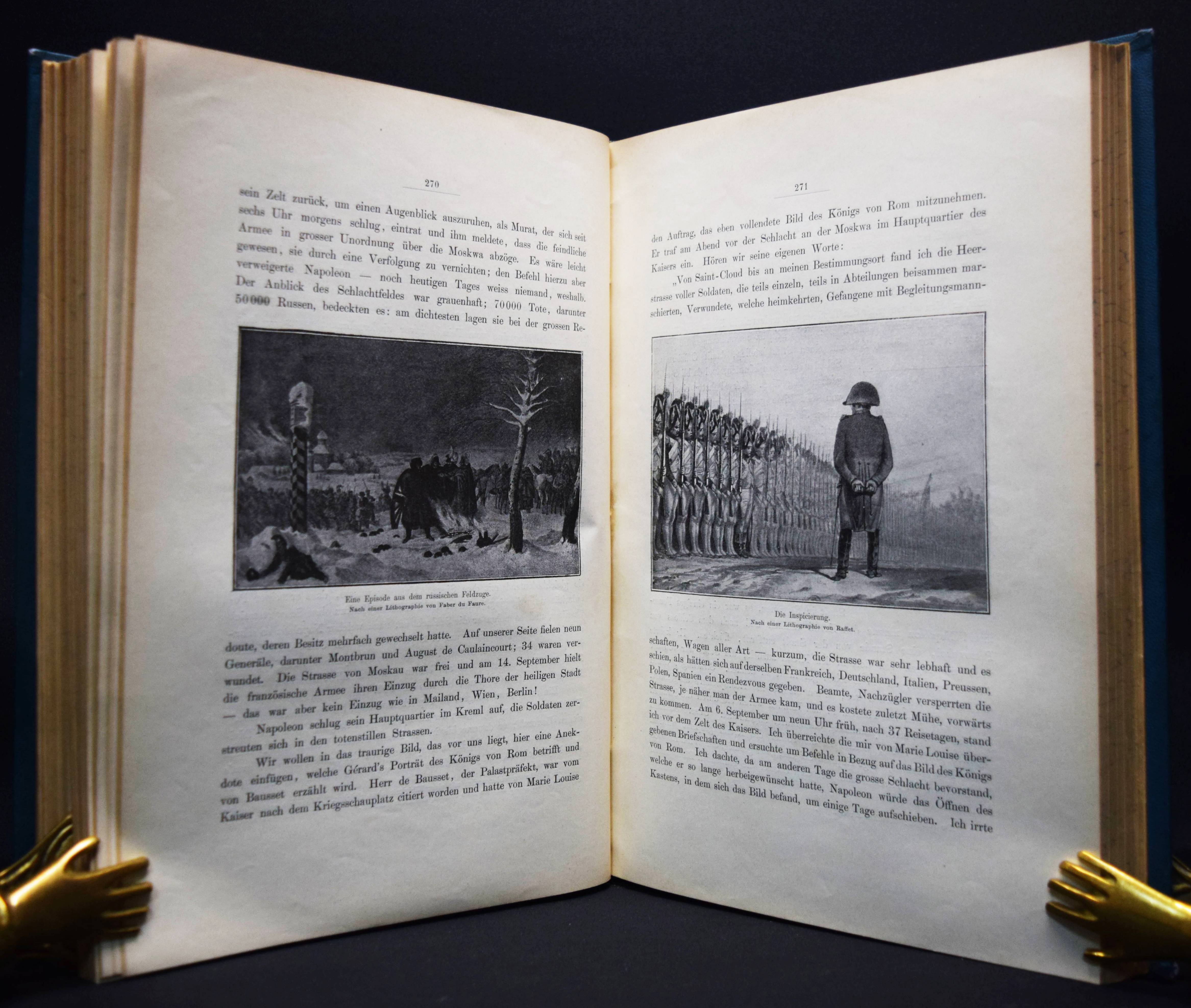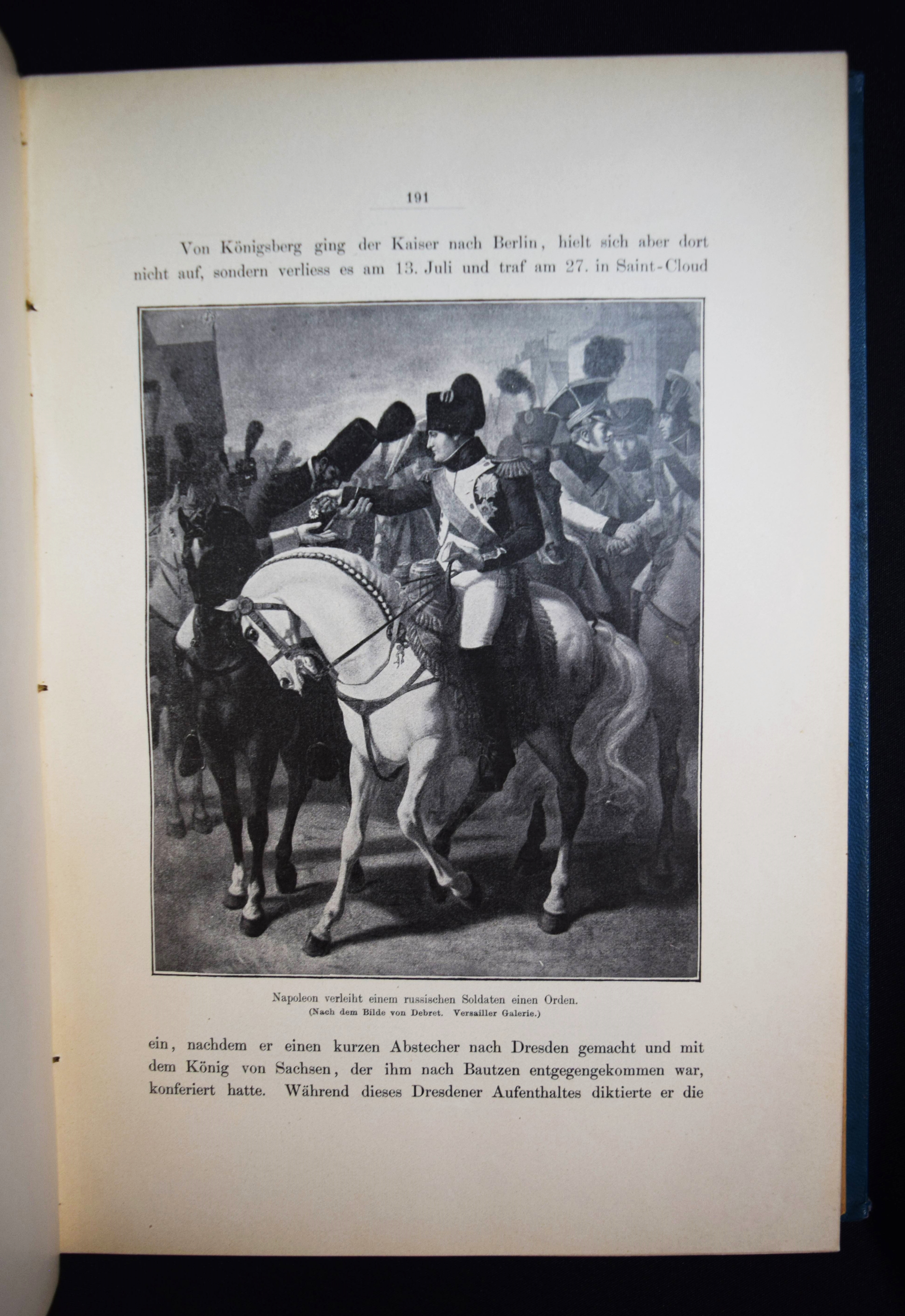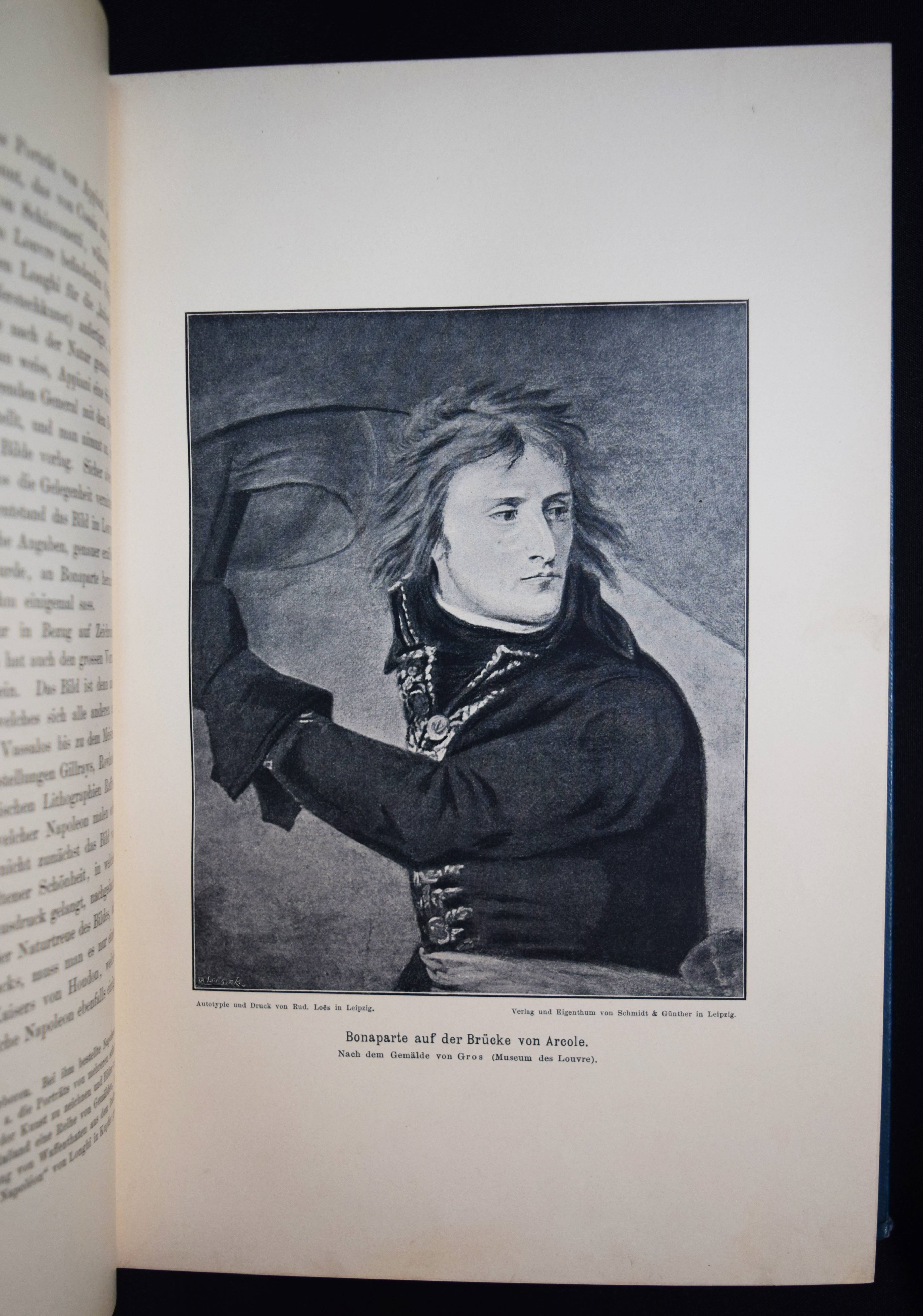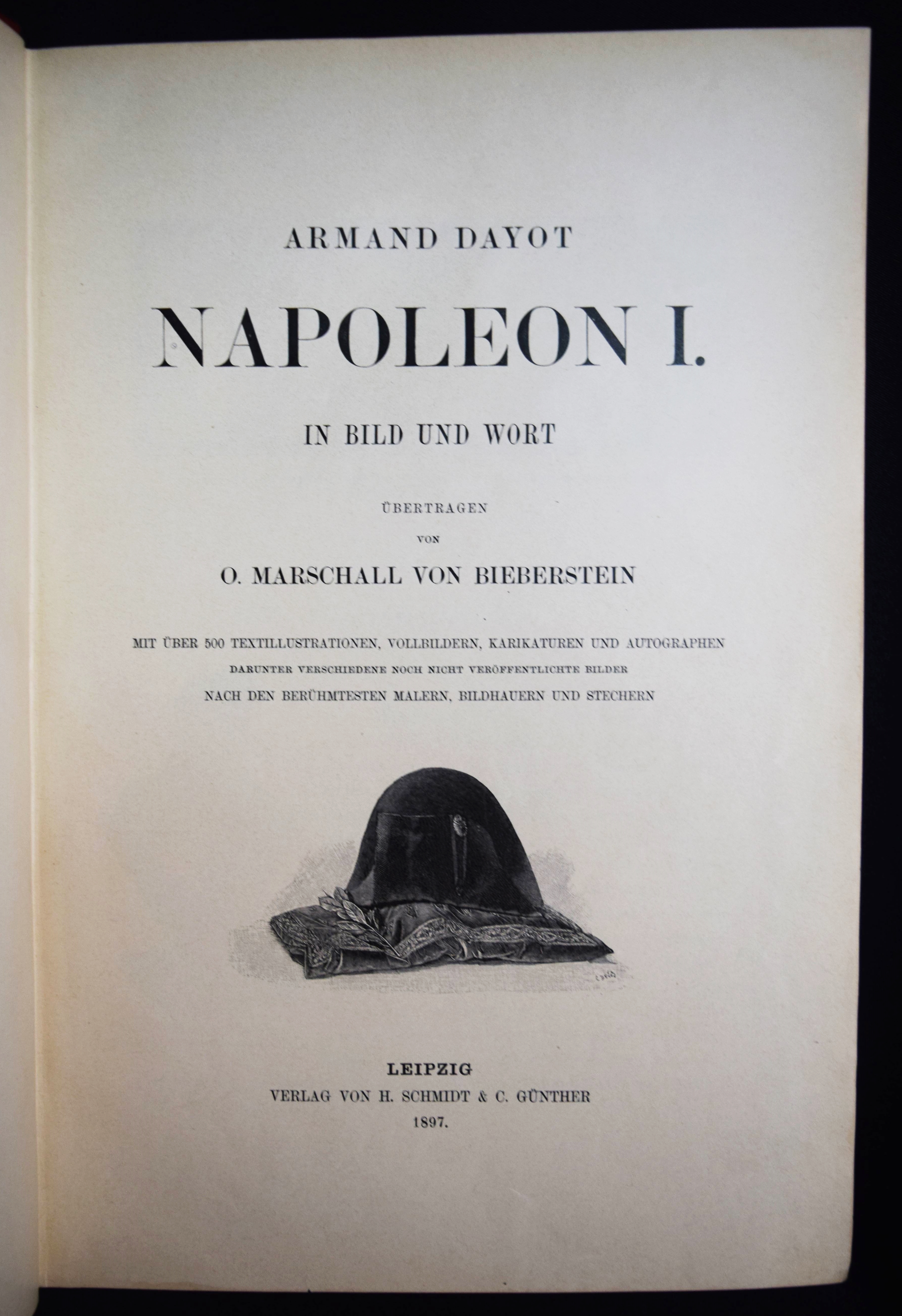 Dayot, Armand. Napoleon in Bild und Wort. Übertragen von O. Marschall von Bieberstein. Mit über 500 Textillustrationen, Vollbildern, Karikaturen und Autographen darunter verschiedene noch nicht veröfftliche Bilder nach den berühmtesten Malern, Bilderhauern und Stechern. Leipzig, Schmidt & Günther 1897. 4°. 504 S. mit über 500 Abb., meist nach Holzstichen. Weinroter Orig.-Halbleinenband mit goldgepr. Rücken- und Deckeltitel, mit Leder bezogenen Deckeln in Türkis und mont. Deckelmonogramm in Bakelit. Erste deutsche Ausgabe. – Das montierte Deckel-Monogramm mit kleiner Fehlstelle, sehr gutes Exemplar im dekorativen Luxus-Einband.