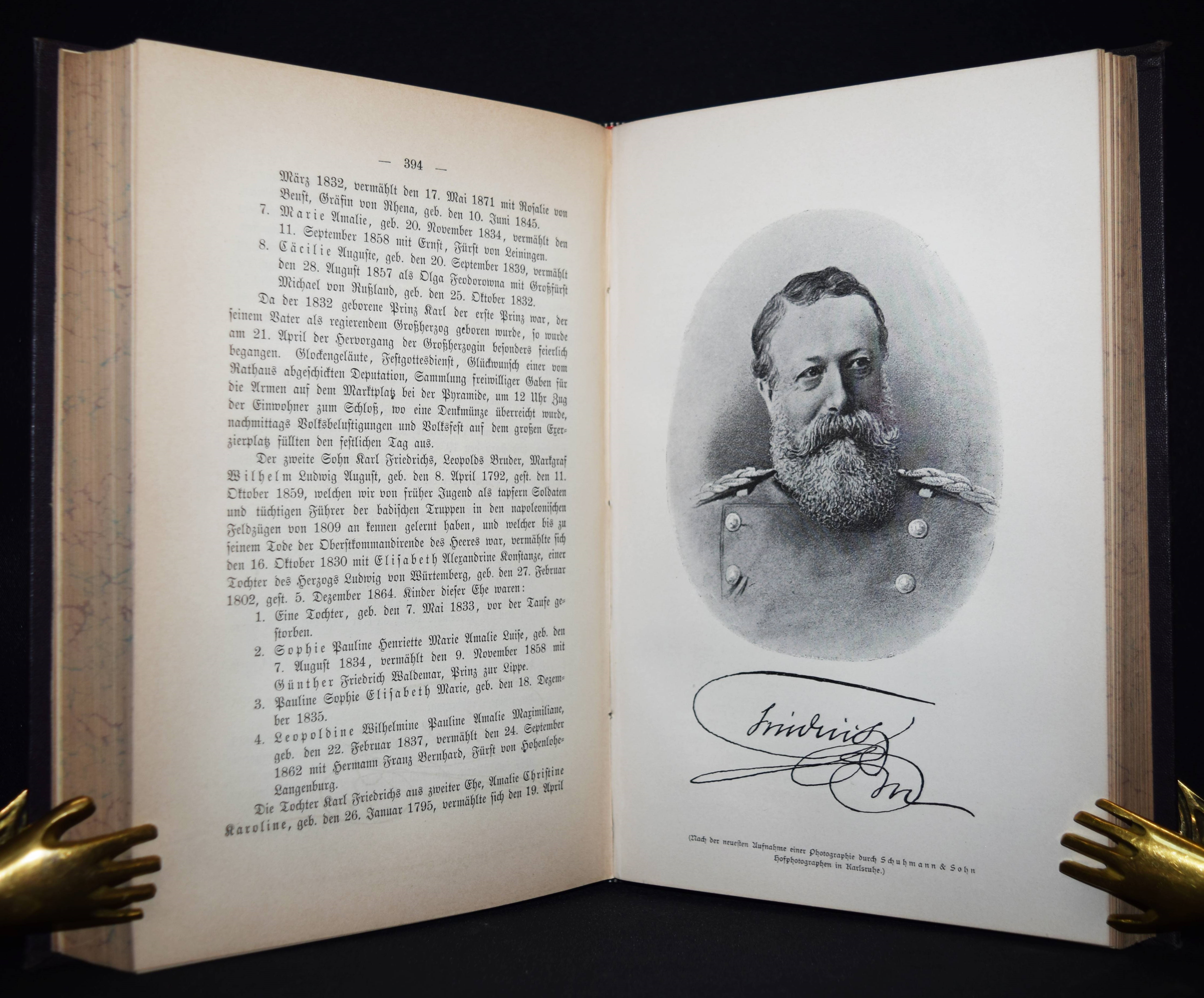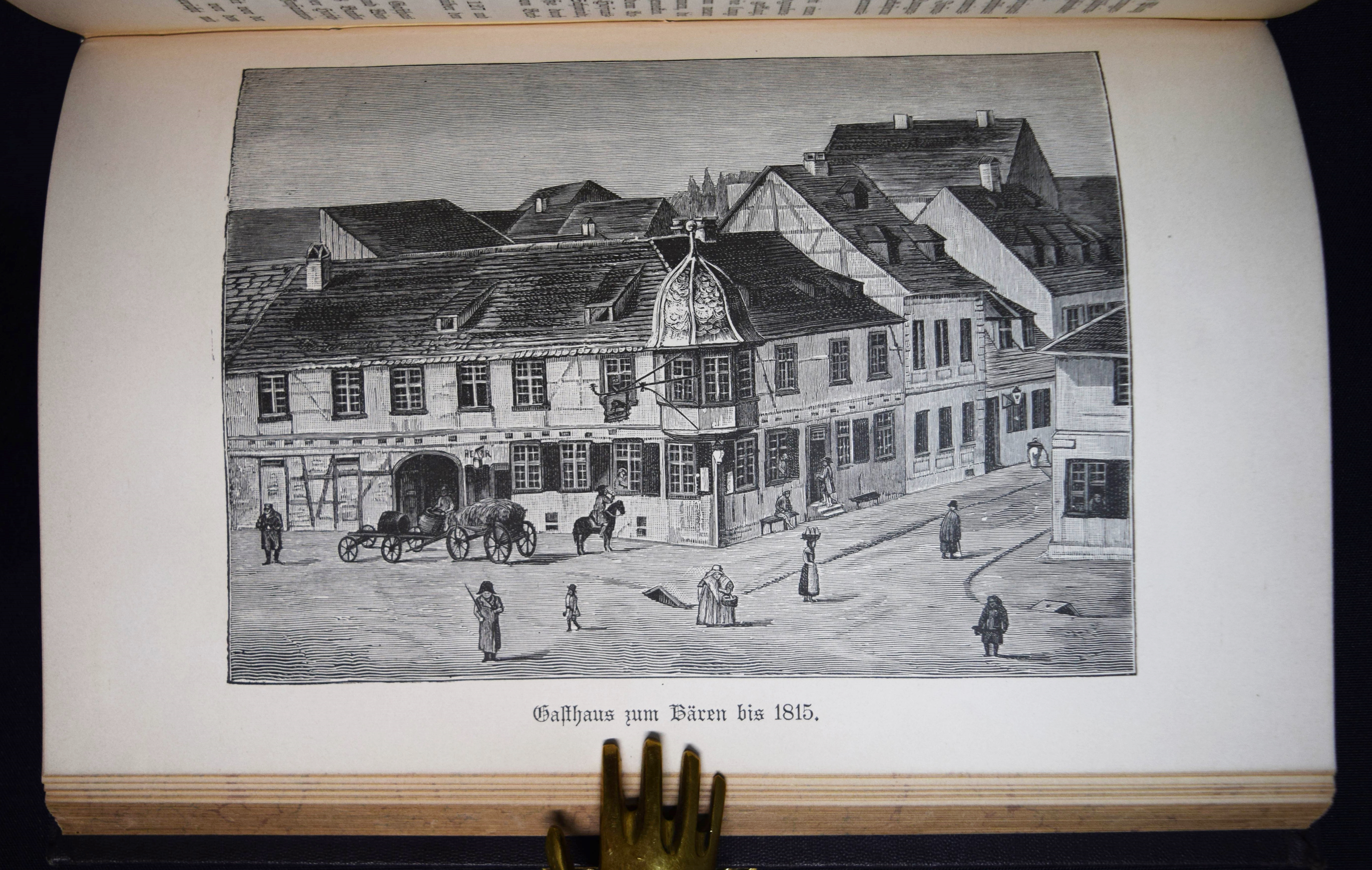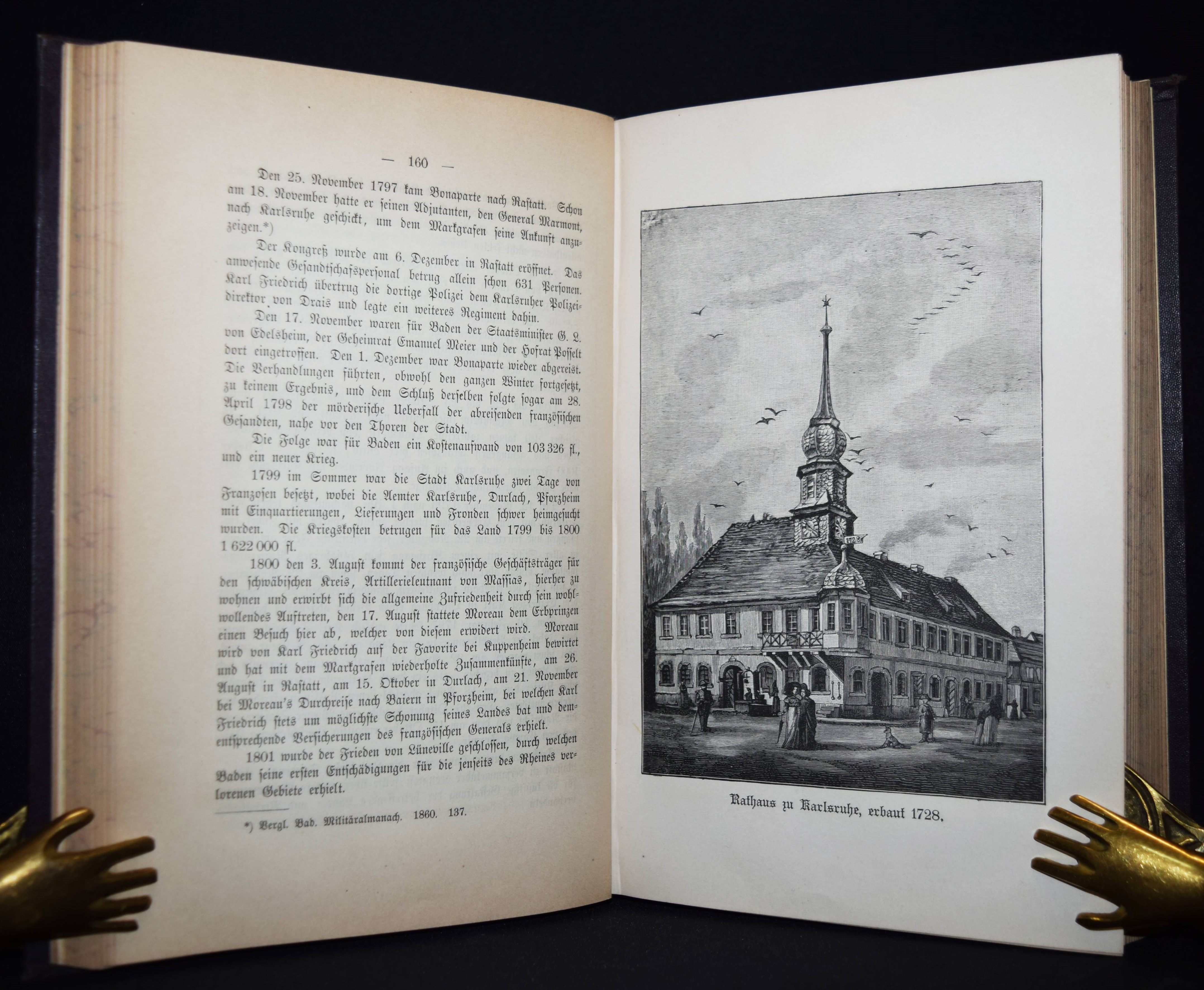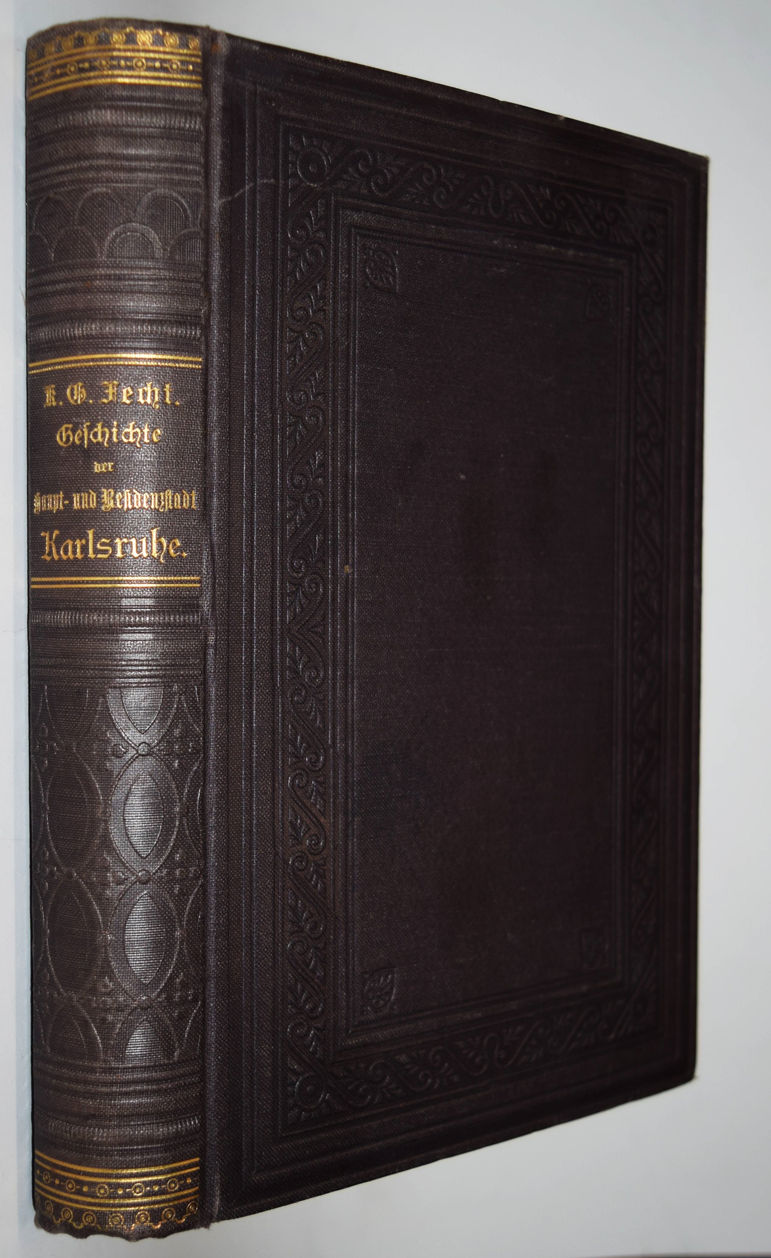 Karlsruhe – Fecht, K(arl) G(ustav). Geschichte der Haupt- und Residenzstadt Karlsruhe. Im Auftrag der Städtischen Archiv-Kommission bearbeitet. Karlsruhe, Macklot 1887. Gr.-8° (23,5 x 15,5 cm.). 4 Bl., 604, XX, VIII S., 1 Bl. mit zahlr. (1 gefalt.) Tafeln. Blindgepr. Orig.-Leinenband mit goldgepr. Rückentitel und dezenter Rückenvergoldung. Seltene Originalausgabe. – Sehr schönes sauberes Exemplar.