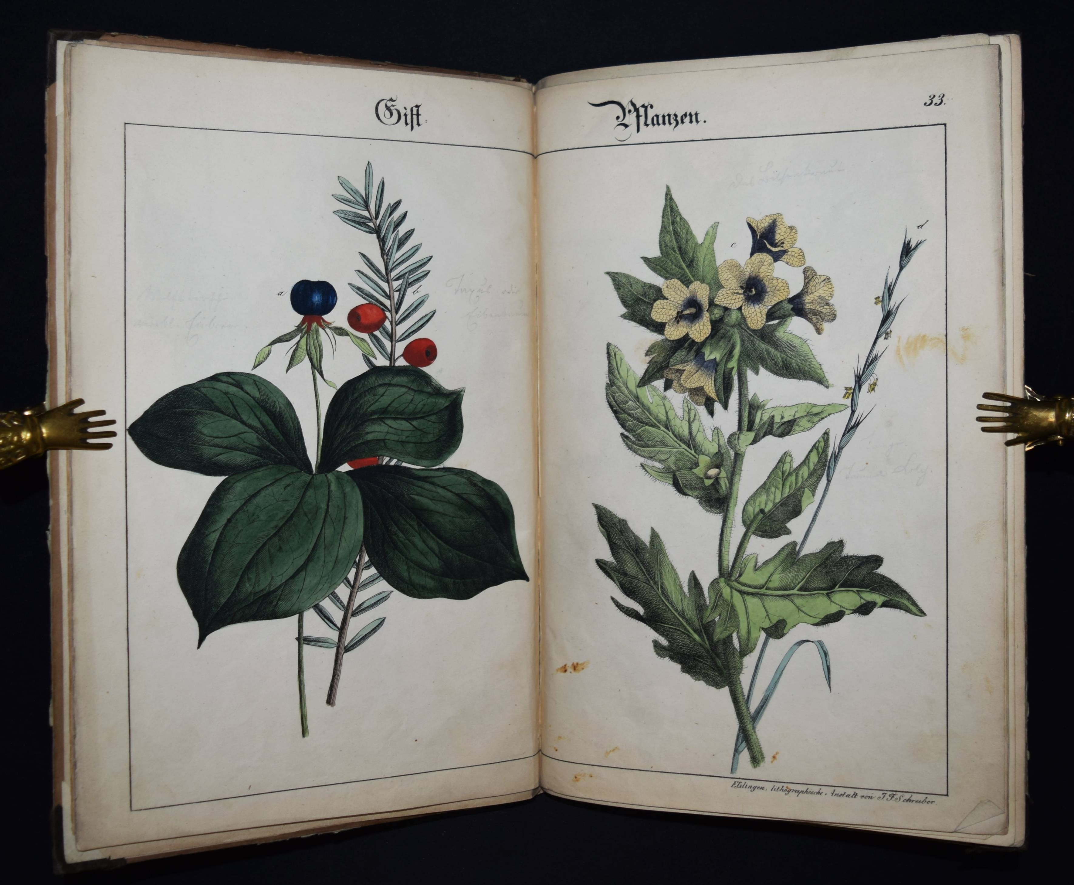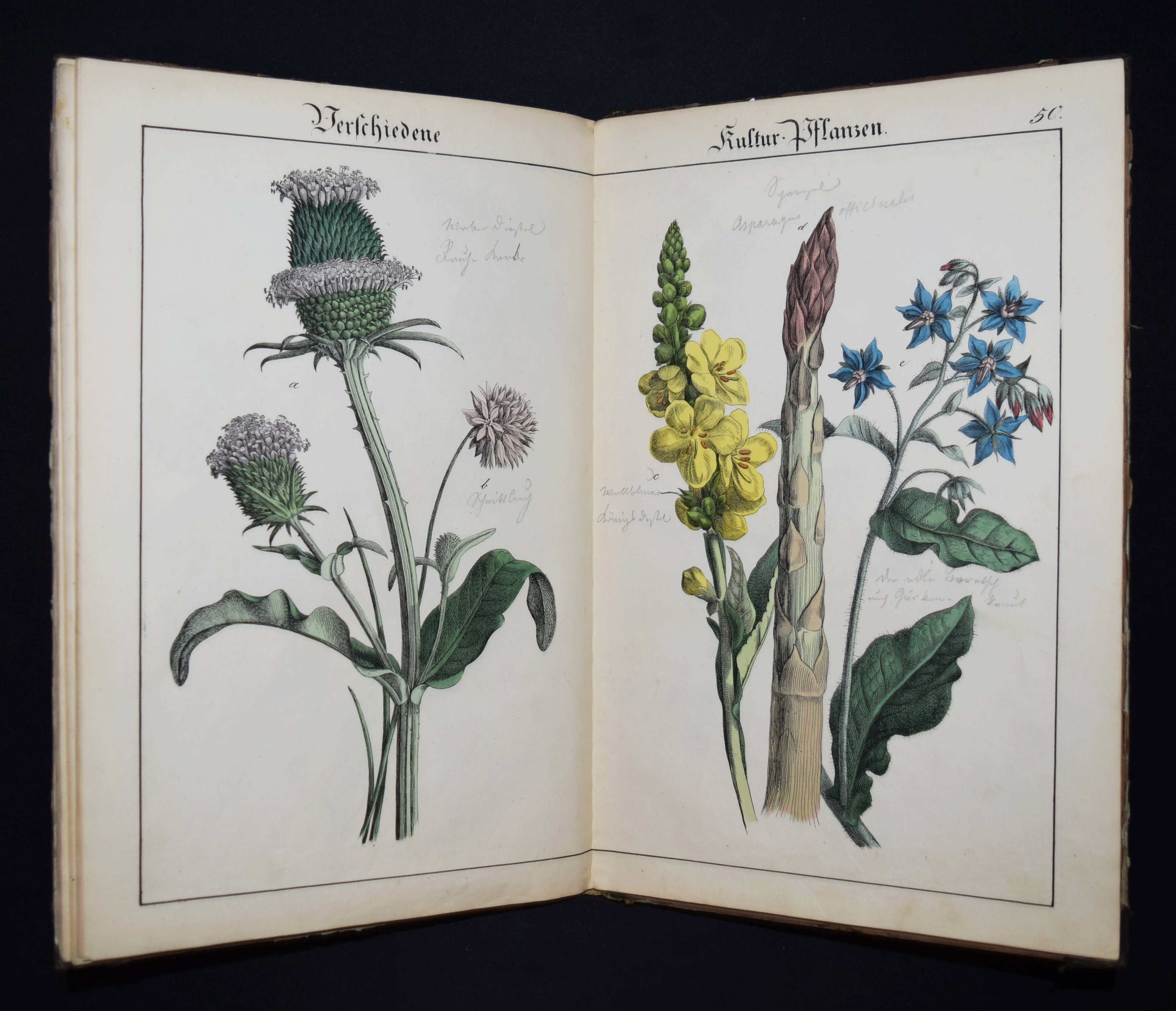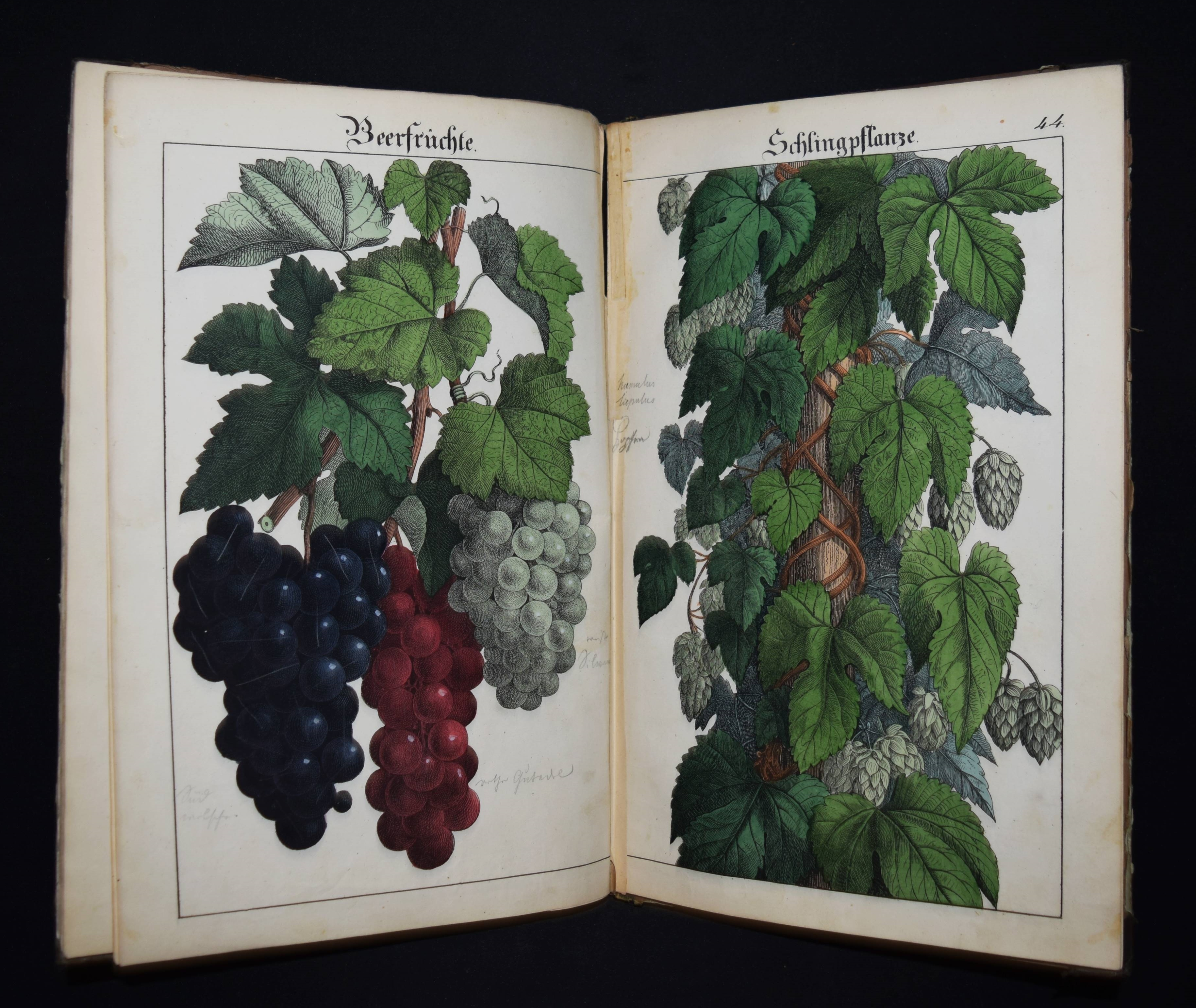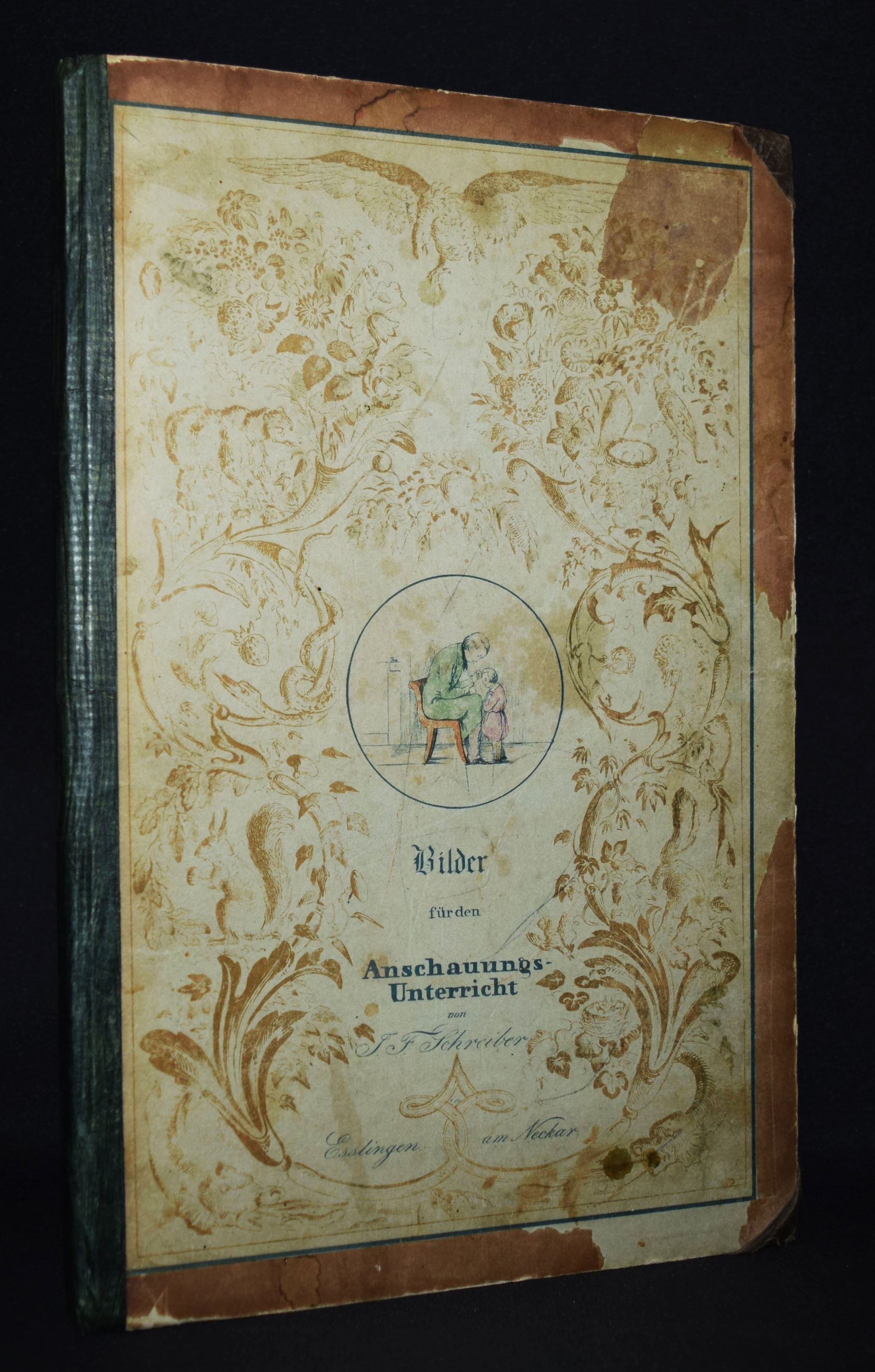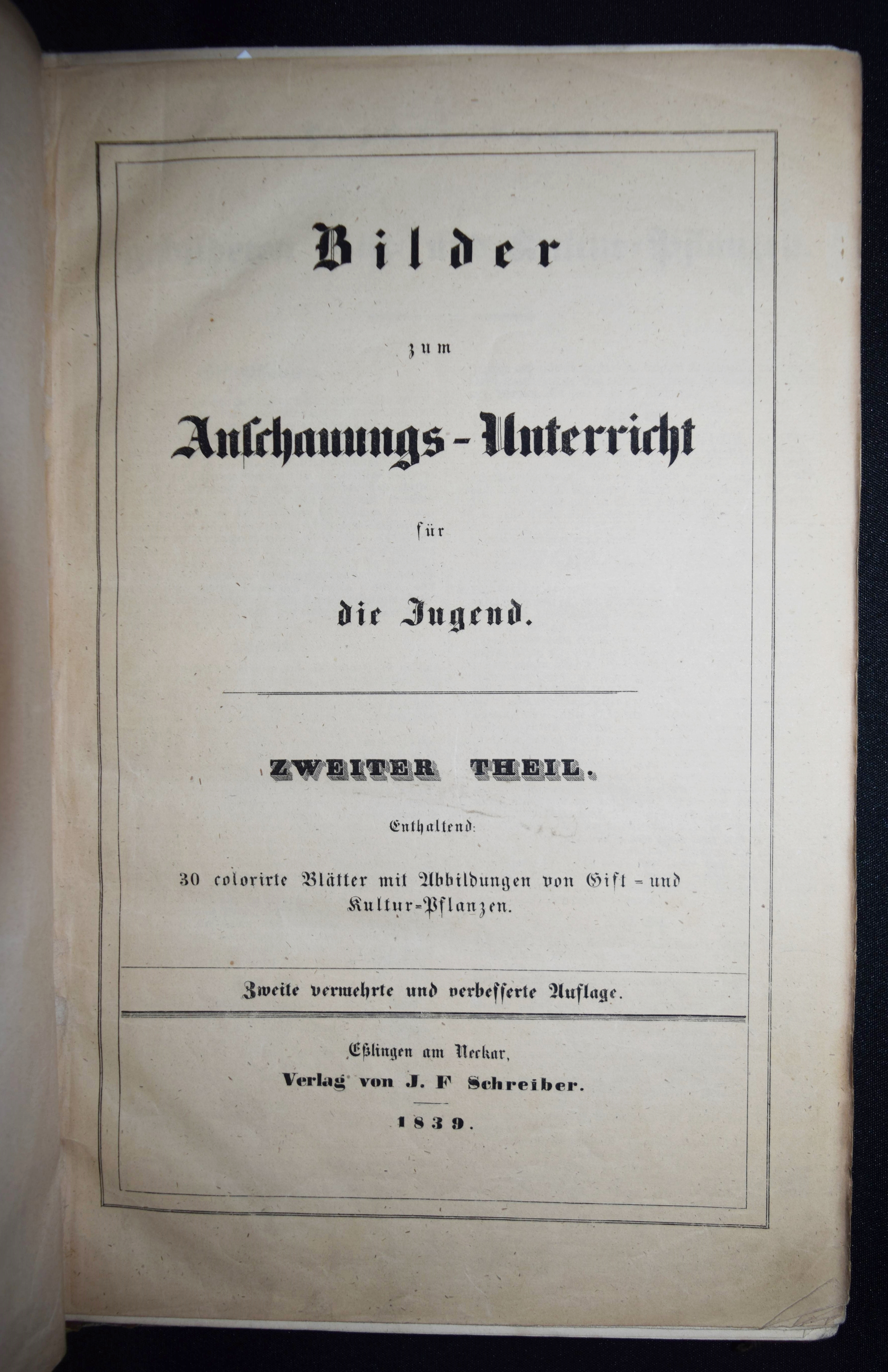 Schreiber, J(akob) F(erdinand) (Hrsg.). 30 Bilder zum Anschauungs-Unterricht für die Jugend. II. Theil (von 3) enthaltend: gegen 30 colorirte (!) Blätter mit Abbildungen von Gift- und Kulturpflanzen. 2. vermehrte und verbesserte Auflage. Esslingen, J. F. Schreiber 1839. 4°. Titel, 6, 2 S. und 30 doppelblattgr. handkol. lithogr. Tafeln. Farbig illustrierter Orig.-Pappband. Bilderwelt 1210. Seebaß II, 1815. Wegehaupt II, 338, III, 322 u. IV, 470. – Der zweite Teil des erfolgreichen Anschauungs-Bilderbuchs des Schreiber-Verlags mit schönen Darstellungen von Bäumen, Blumen, Obst, Gemüse, Getreide, Pilzen, etc. – Rücken restauriert, Deckel etwas fleckig, Textblätter etwas braunfleckig, eine Tafel (Weintrauben) im oberen Drittel im Falz aufgeplatzt, die Tafeln meist nur im Rand etwas braun- und fingerfleckig, die meisten Abbildungen mit zeitgenöss. Bezeichnungen in Bleistift, gutes Exemplar.