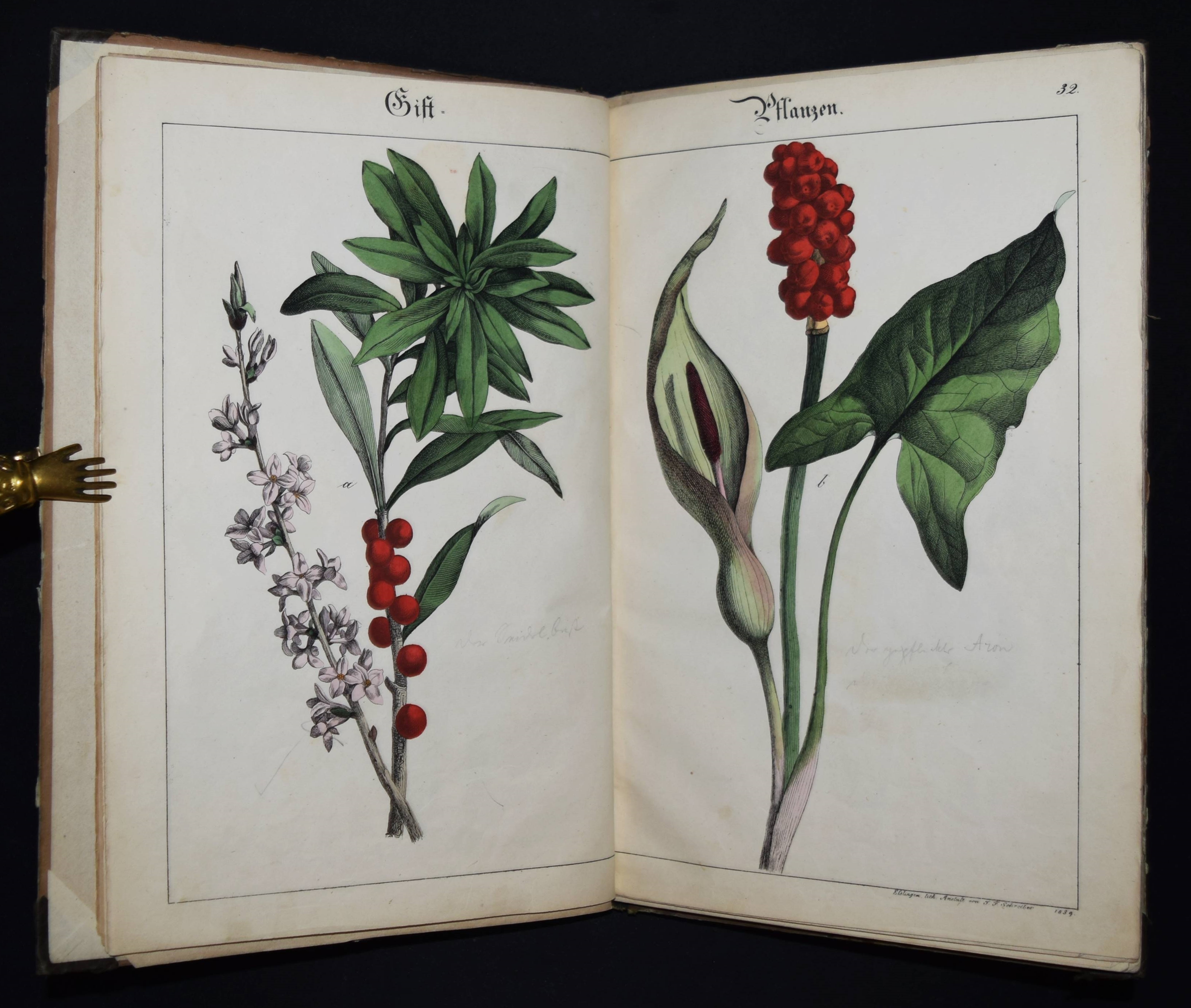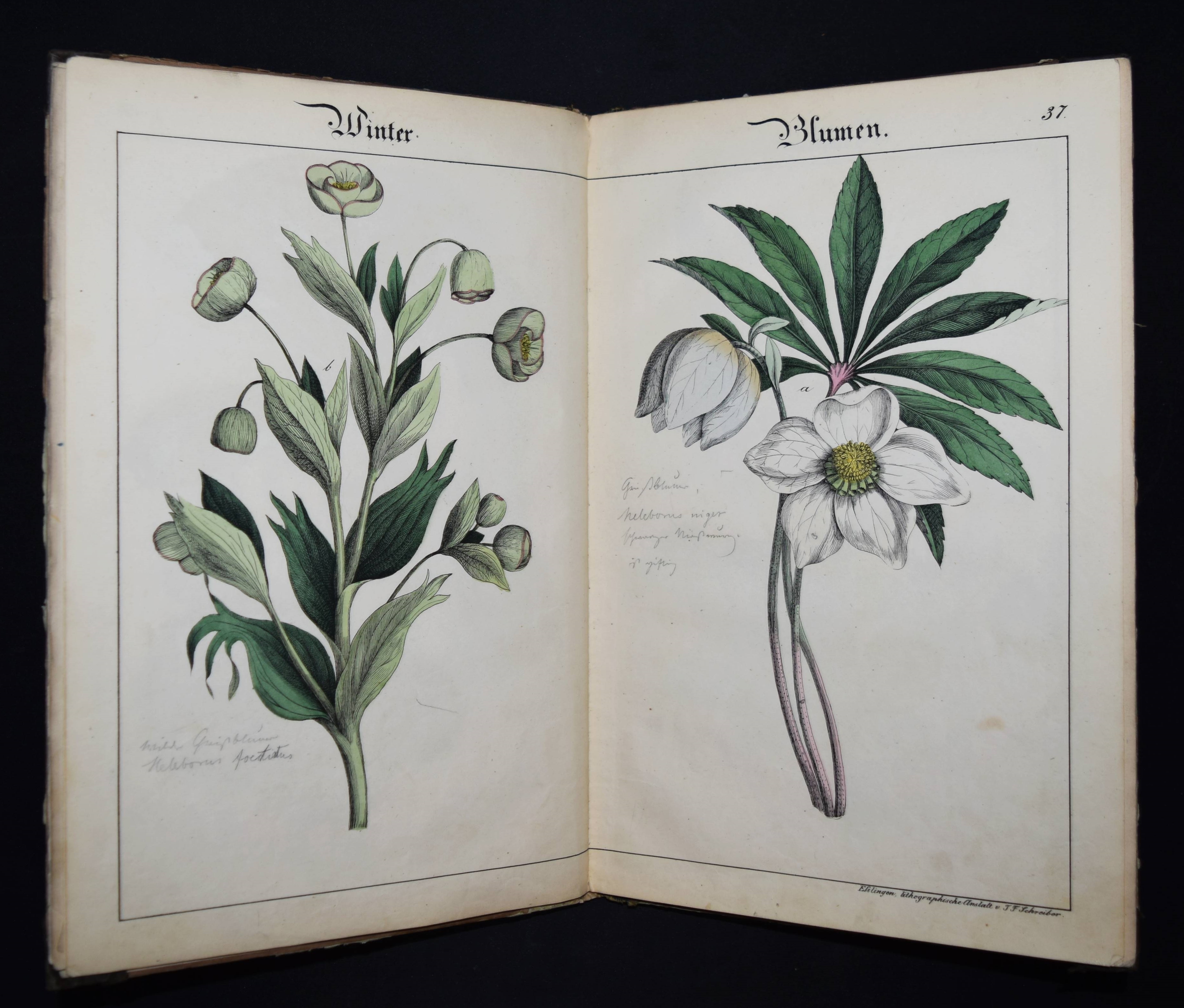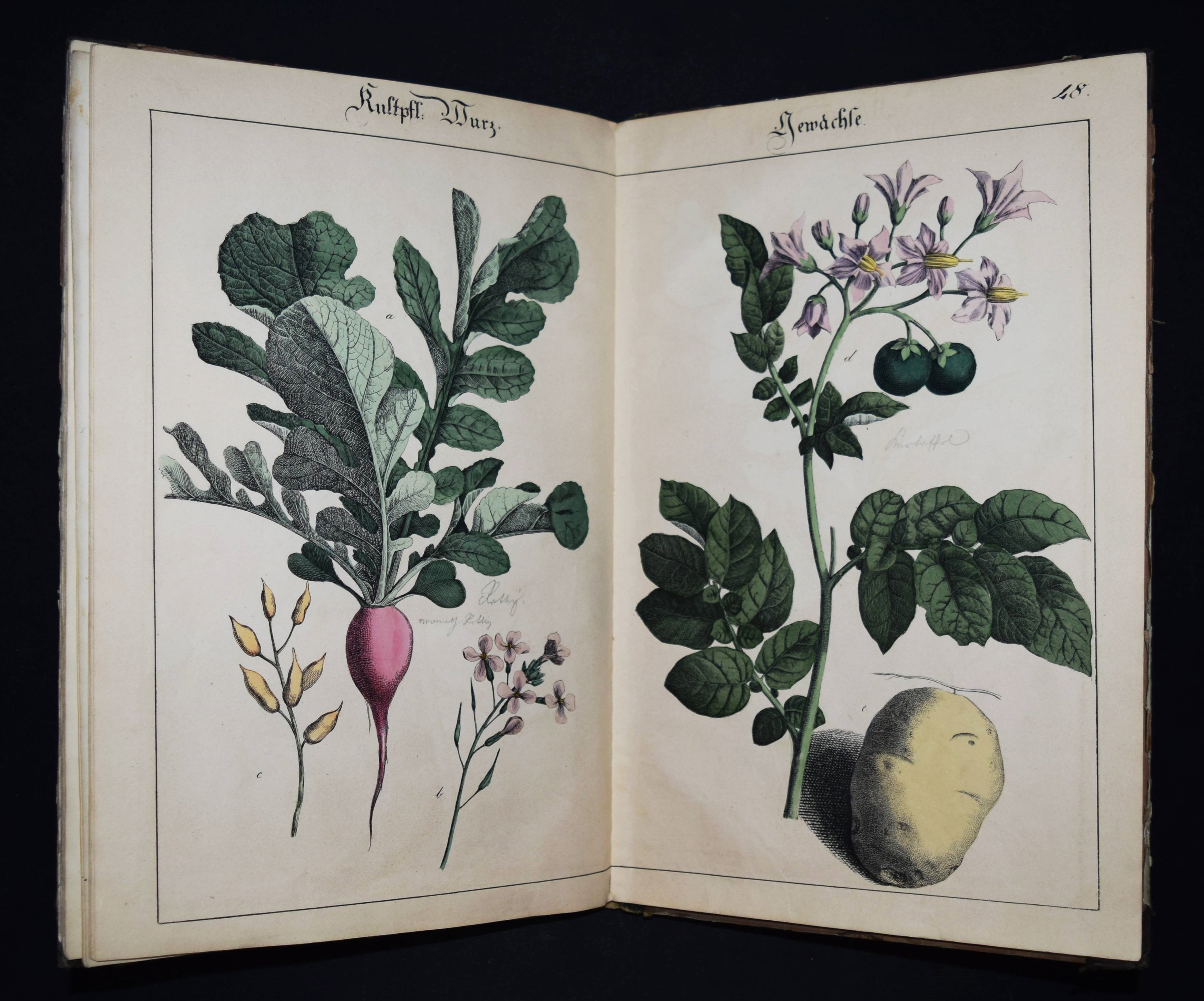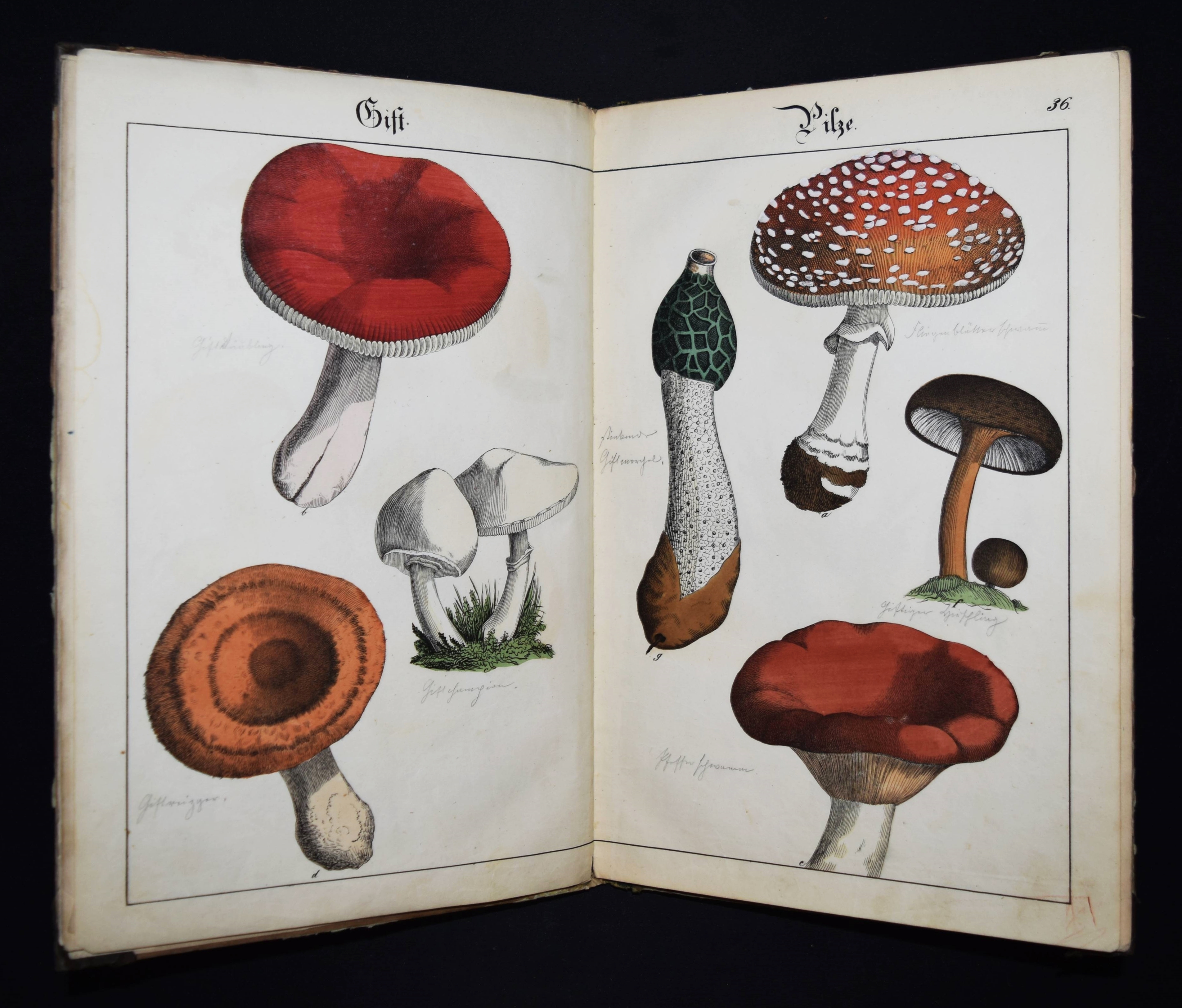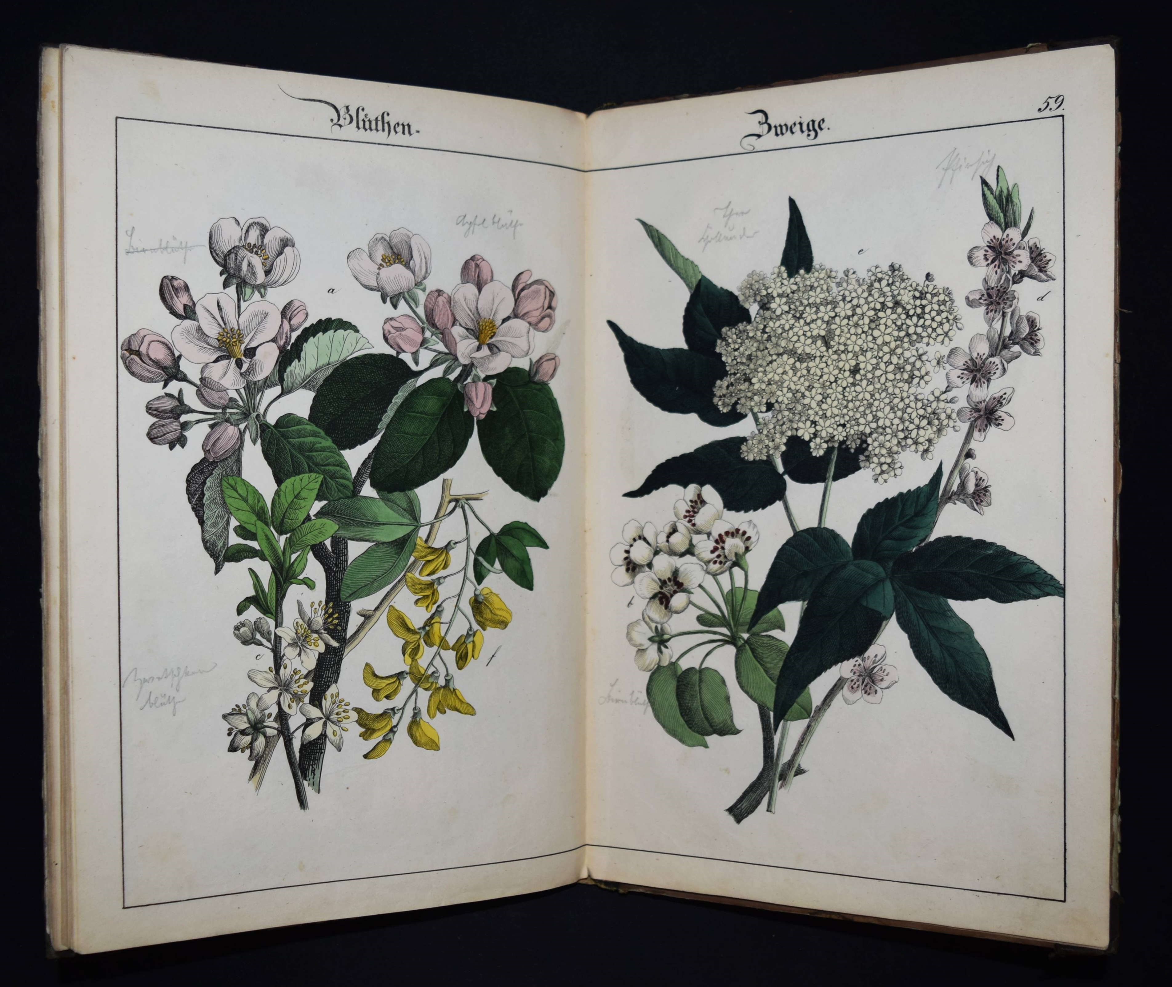 Schreiber, J(akob) F(erdinand) (Hrsg.). 30 Bilder zum Anschauungs-Unterricht für die Jugend. II. Theil (von 3) enthaltend: gegen 30 colorirte (!) Blätter mit Abbildungen von Gift- und Kulturpflanzen. 2. vermehrte und verbesserte Auflage. Esslingen, J. F. Schreiber 1839. 4°. Titel, 6, 2 S. und 30 doppelblattgr. handkol. lithogr. Tafeln. Farbig illustrierter Orig.-Pappband. Bilderwelt 1210. Seebaß II, 1815. Wegehaupt II, 338, III, 322 u. IV, 470. – Der zweite Teil des erfolgreichen Anschauungs-Bilderbuchs des Schreiber-Verlags mit schönen Darstellungen von Bäumen, Blumen, Obst, Gemüse, Getreide, Pilzen, etc. – Rücken restauriert, Deckel etwas fleckig, Textblätter etwas braunfleckig, eine Tafel (Weintrauben) im oberen Drittel im Falz aufgeplatzt, die Tafeln meist nur im Rand etwas braun- und fingerfleckig, die meisten Abbildungen mit zeitgenöss. Bezeichnungen in Bleistift, gutes Exemplar.