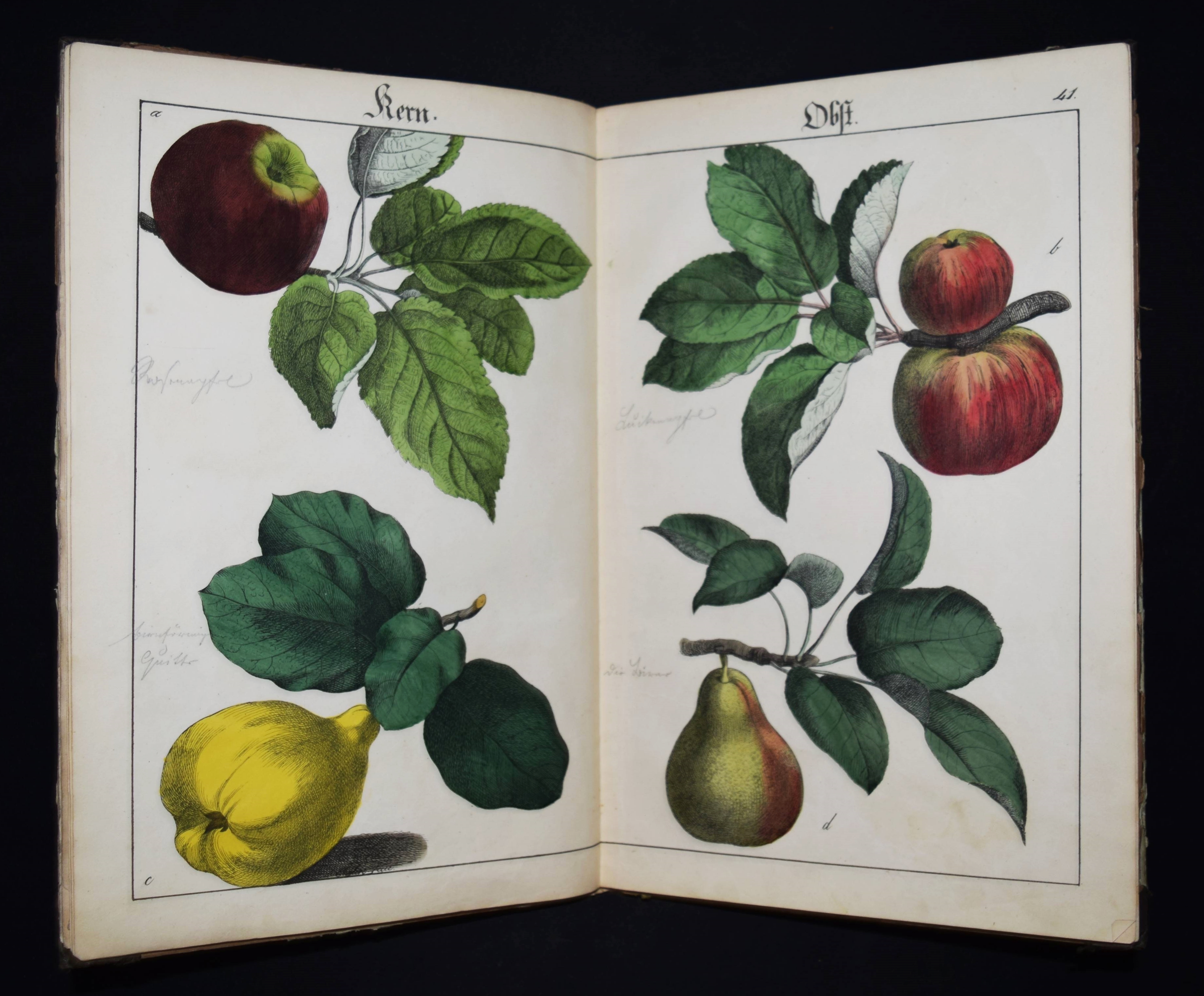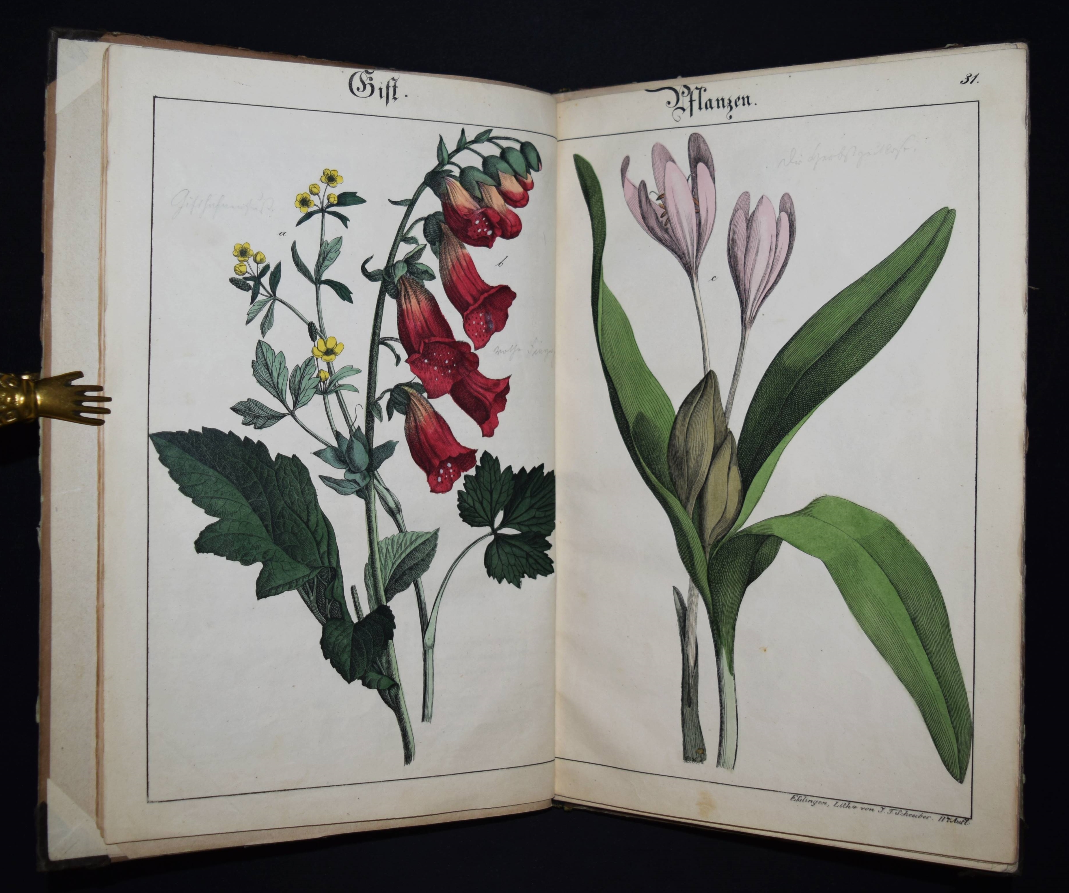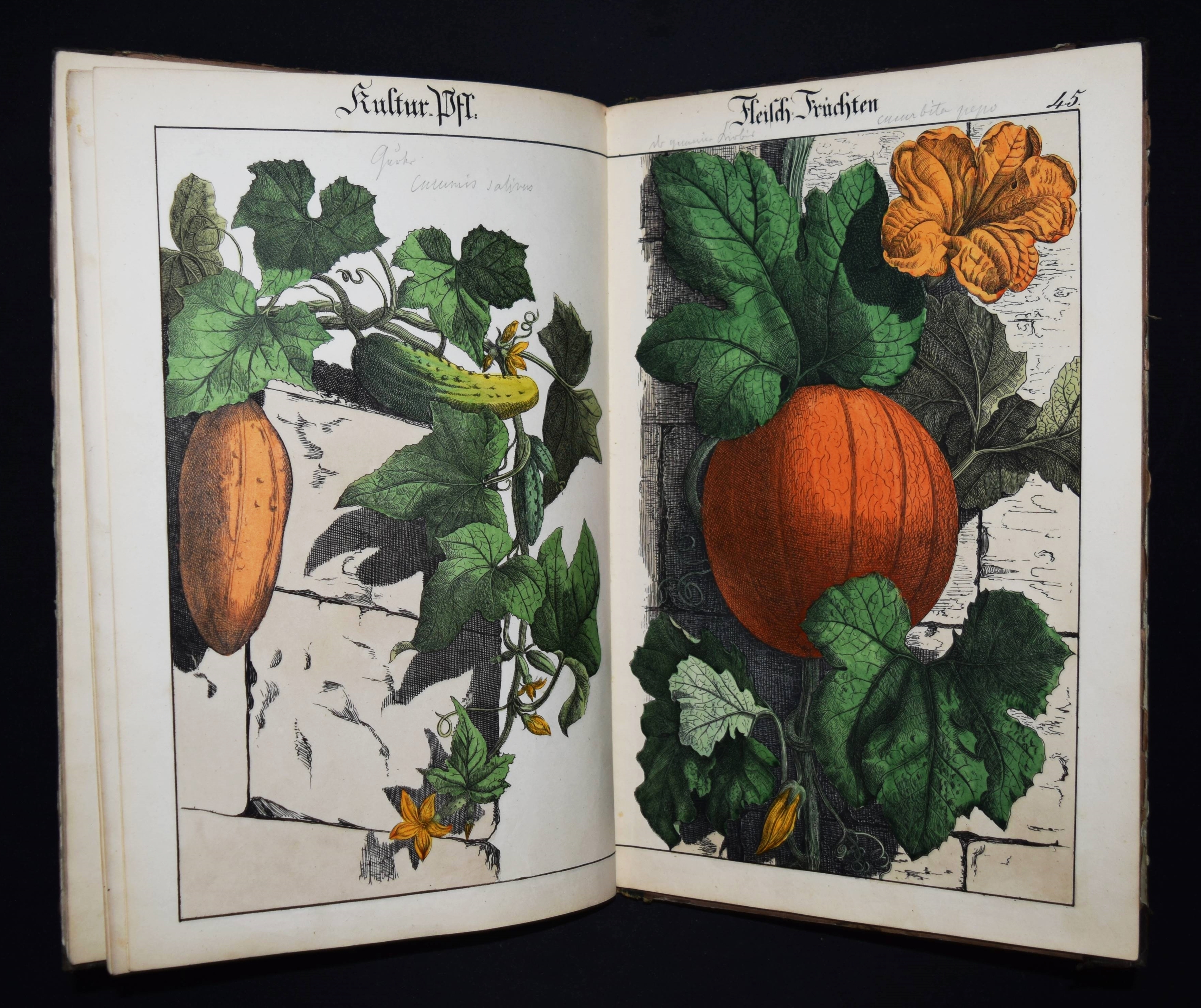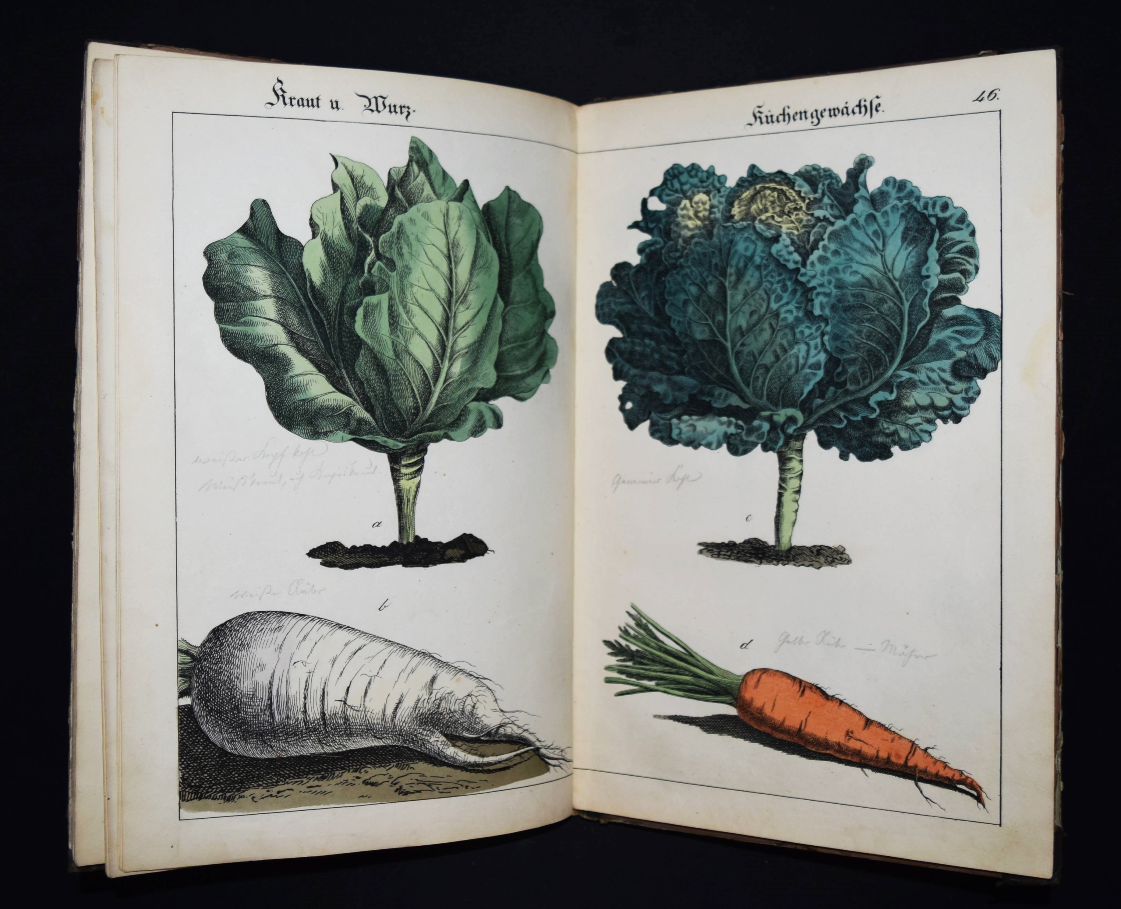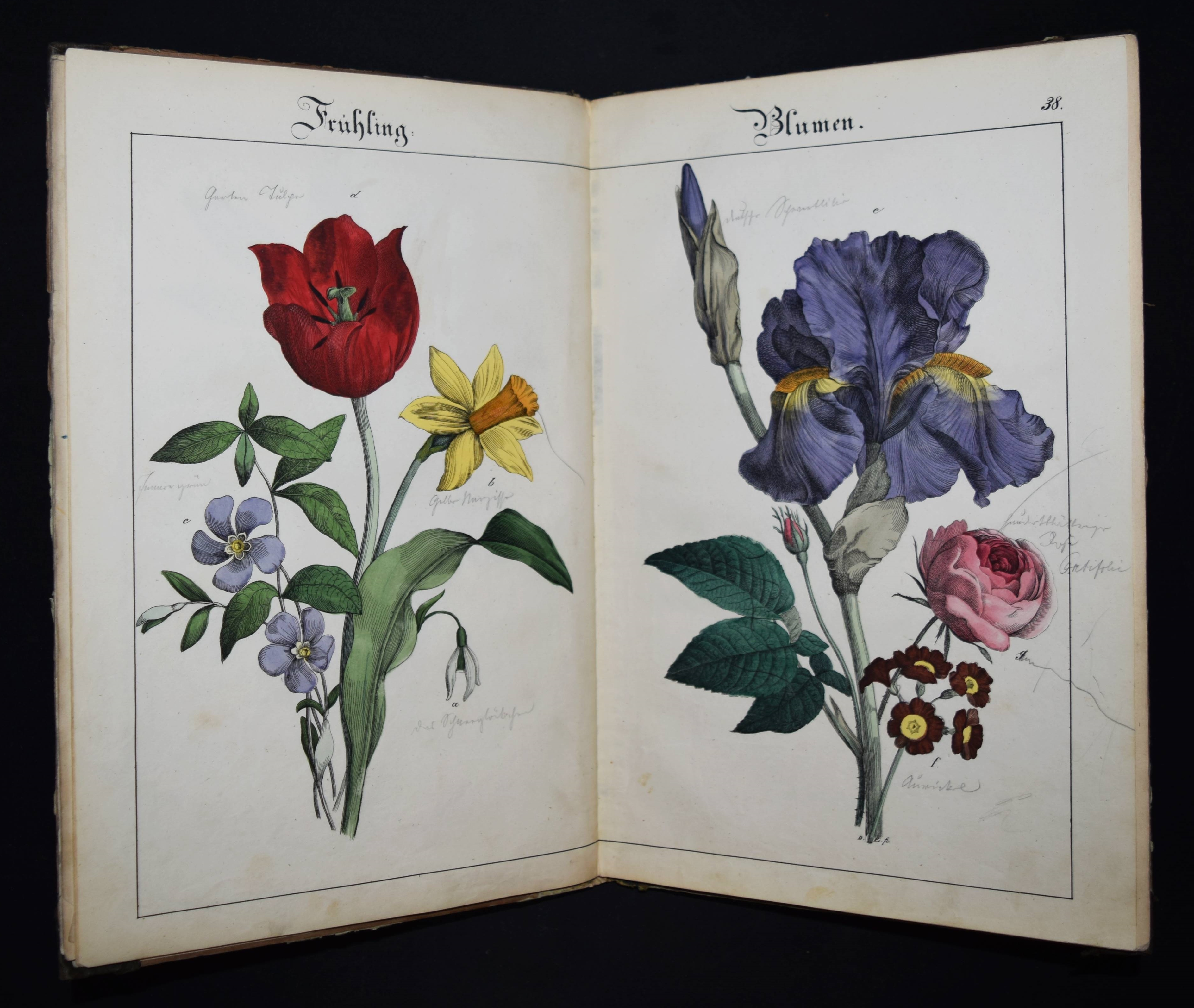 Schreiber, J(akob) F(erdinand) (Hrsg.). 30 Bilder zum Anschauungs-Unterricht für die Jugend. II. Theil (von 3) enthaltend: gegen 30 colorirte (!) Blätter mit Abbildungen von Gift- und Kulturpflanzen. 2. vermehrte und verbesserte Auflage. Esslingen, J. F. Schreiber 1839. 4°. Titel, 6, 2 S. und 30 doppelblattgr. handkol. lithogr. Tafeln. Farbig illustrierter Orig.-Pappband. Bilderwelt 1210. Seebaß II, 1815. Wegehaupt II, 338, III, 322 u. IV, 470. – Der zweite Teil des erfolgreichen Anschauungs-Bilderbuchs des Schreiber-Verlags mit schönen Darstellungen von Bäumen, Blumen, Obst, Gemüse, Getreide, Pilzen, etc. – Rücken restauriert, Deckel etwas fleckig, Textblätter etwas braunfleckig, eine Tafel (Weintrauben) im oberen Drittel im Falz aufgeplatzt, die Tafeln meist nur im Rand etwas braun- und fingerfleckig, die meisten Abbildungen mit zeitgenöss. Bezeichnungen in Bleistift, gutes Exemplar.