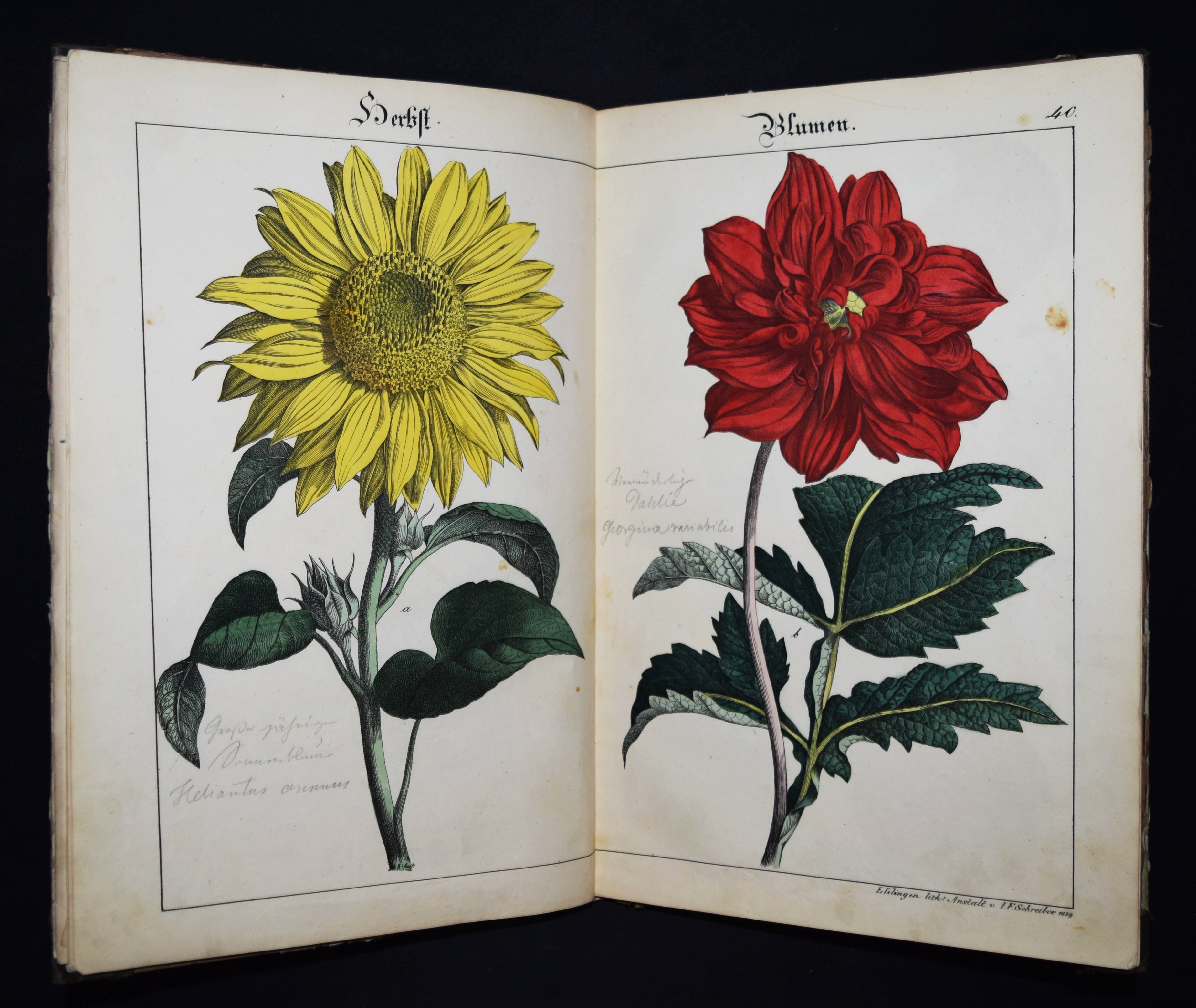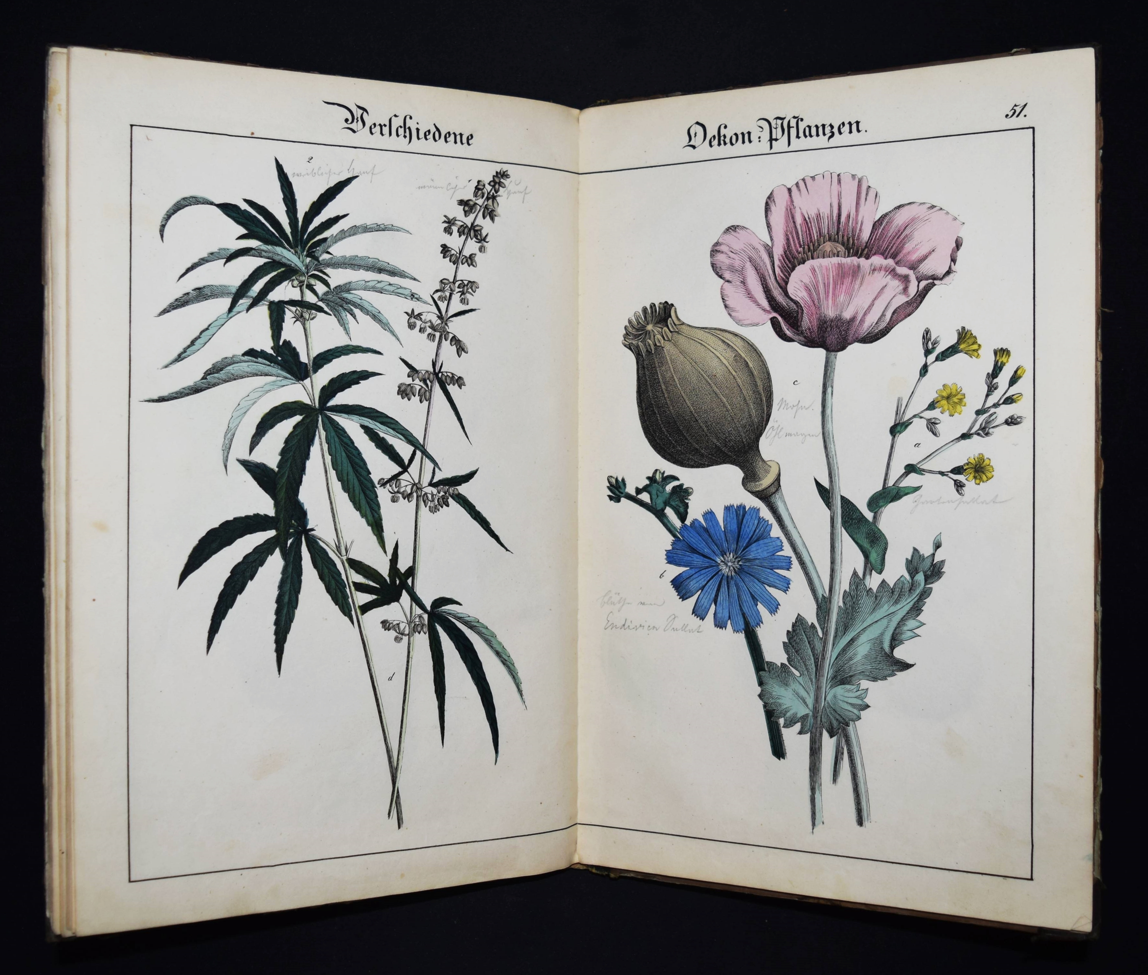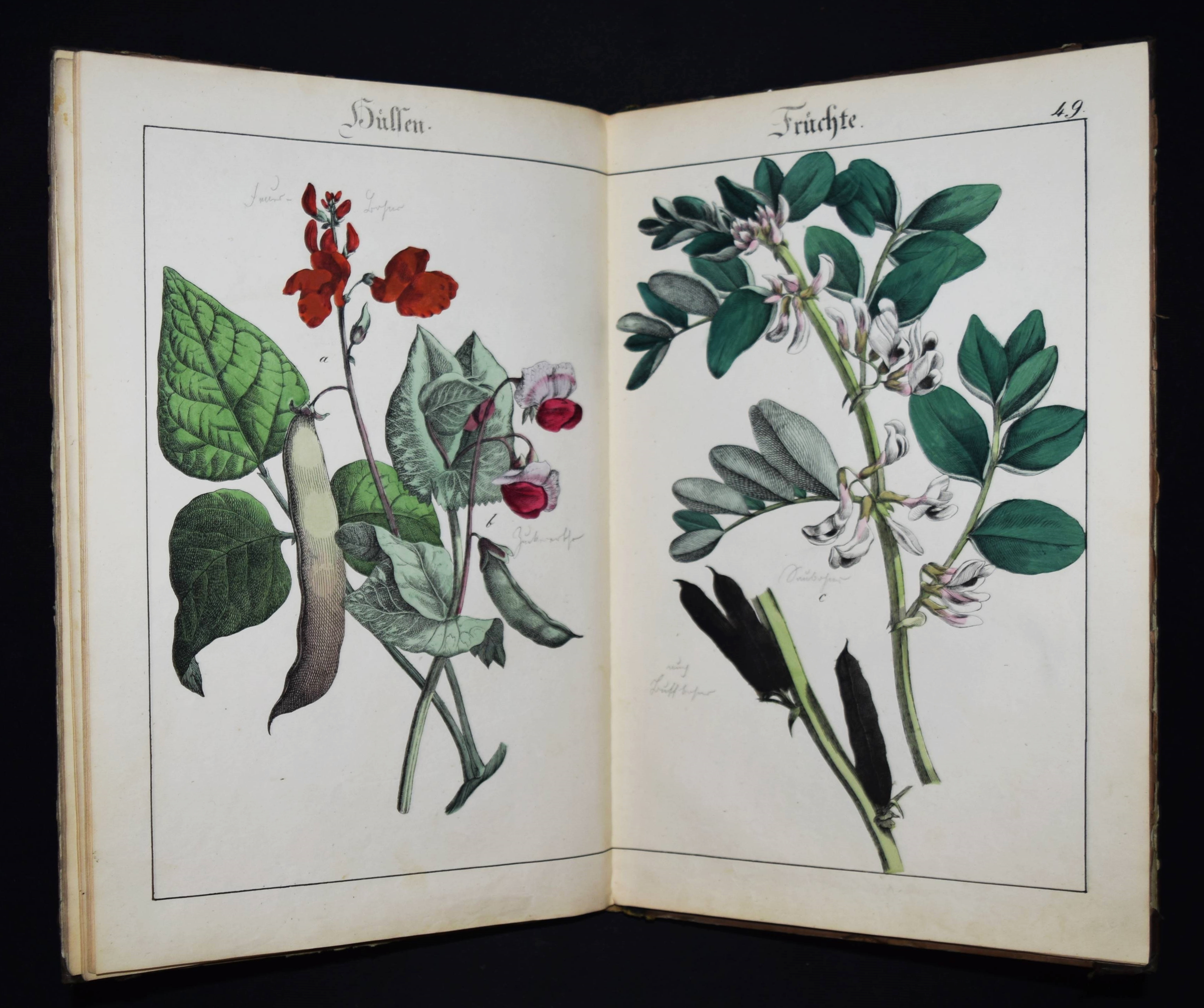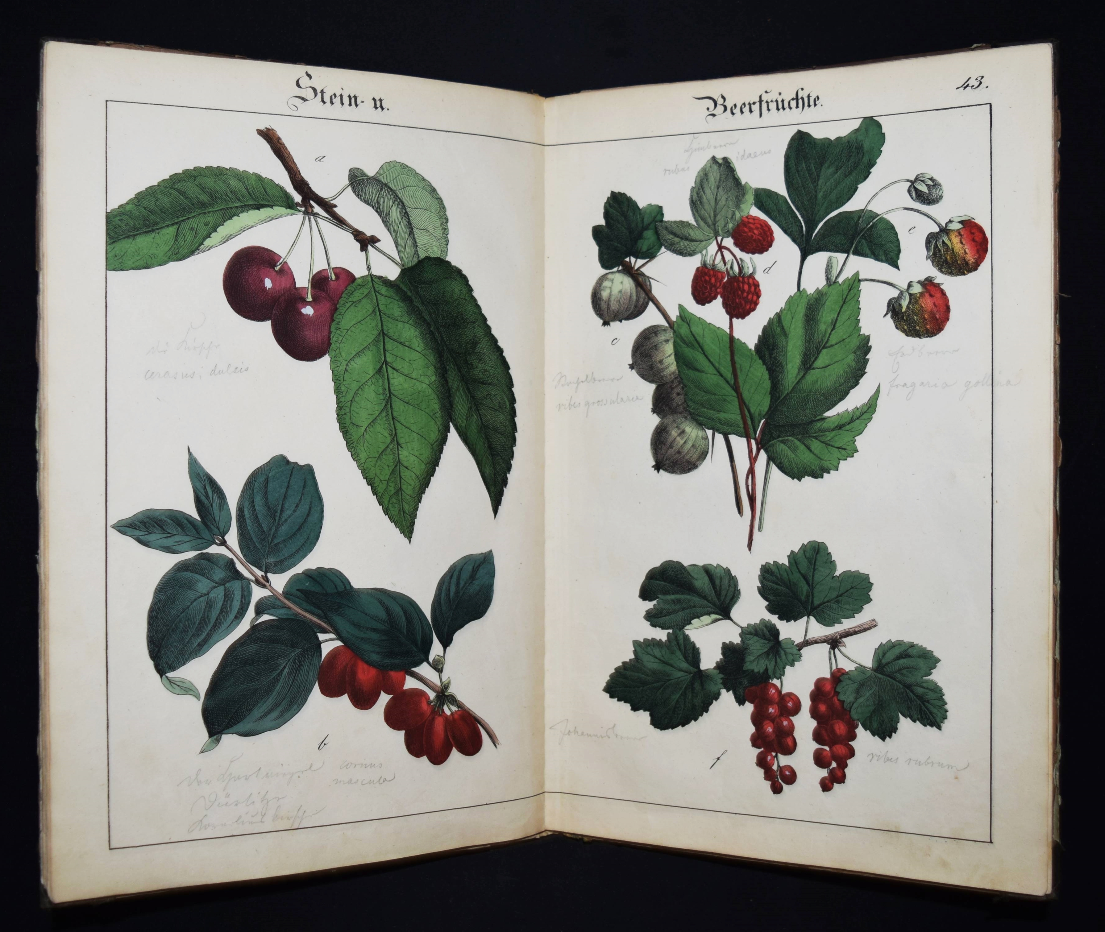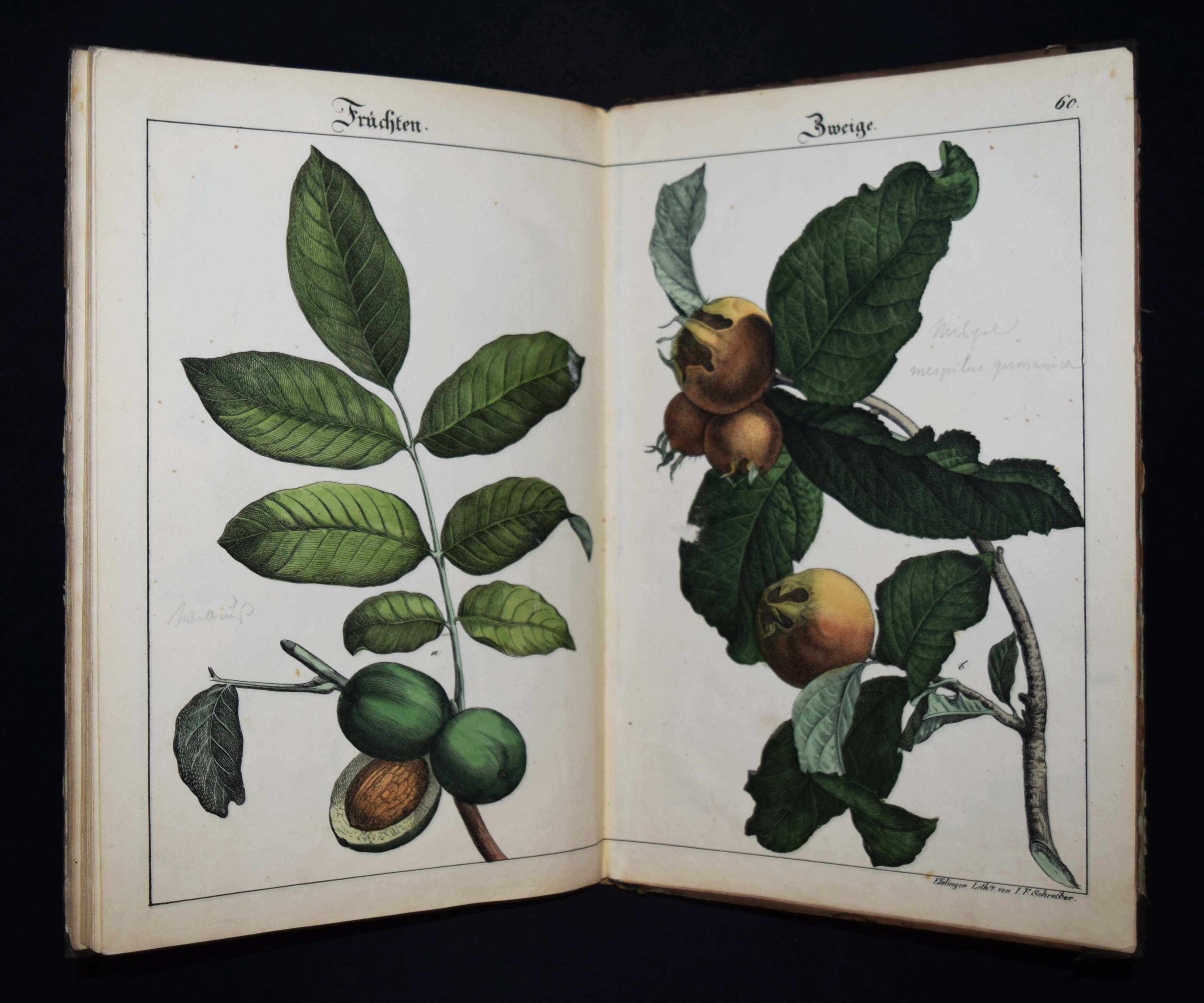 Schreiber, J(akob) F(erdinand) (Hrsg.). 30 Bilder zum Anschauungs-Unterricht für die Jugend. II. Theil (von 3) enthaltend: gegen 30 colorirte (!) Blätter mit Abbildungen von Gift- und Kulturpflanzen. 2. vermehrte und verbesserte Auflage. Esslingen, J. F. Schreiber 1839. 4°. Titel, 6, 2 S. und 30 doppelblattgr. handkol. lithogr. Tafeln. Farbig illustrierter Orig.-Pappband. Bilderwelt 1210. Seebaß II, 1815. Wegehaupt II, 338, III, 322 u. IV, 470. – Der zweite Teil des erfolgreichen Anschauungs-Bilderbuchs des Schreiber-Verlags mit schönen Darstellungen von Bäumen, Blumen, Obst, Gemüse, Getreide, Pilzen, etc. – Rücken restauriert, Deckel etwas fleckig, Textblätter etwas braunfleckig, eine Tafel (Weintrauben) im oberen Drittel im Falz aufgeplatzt, die Tafeln meist nur im Rand etwas braun- und fingerfleckig, die meisten Abbildungen mit zeitgenöss. Bezeichnungen in Bleistift, gutes Exemplar.