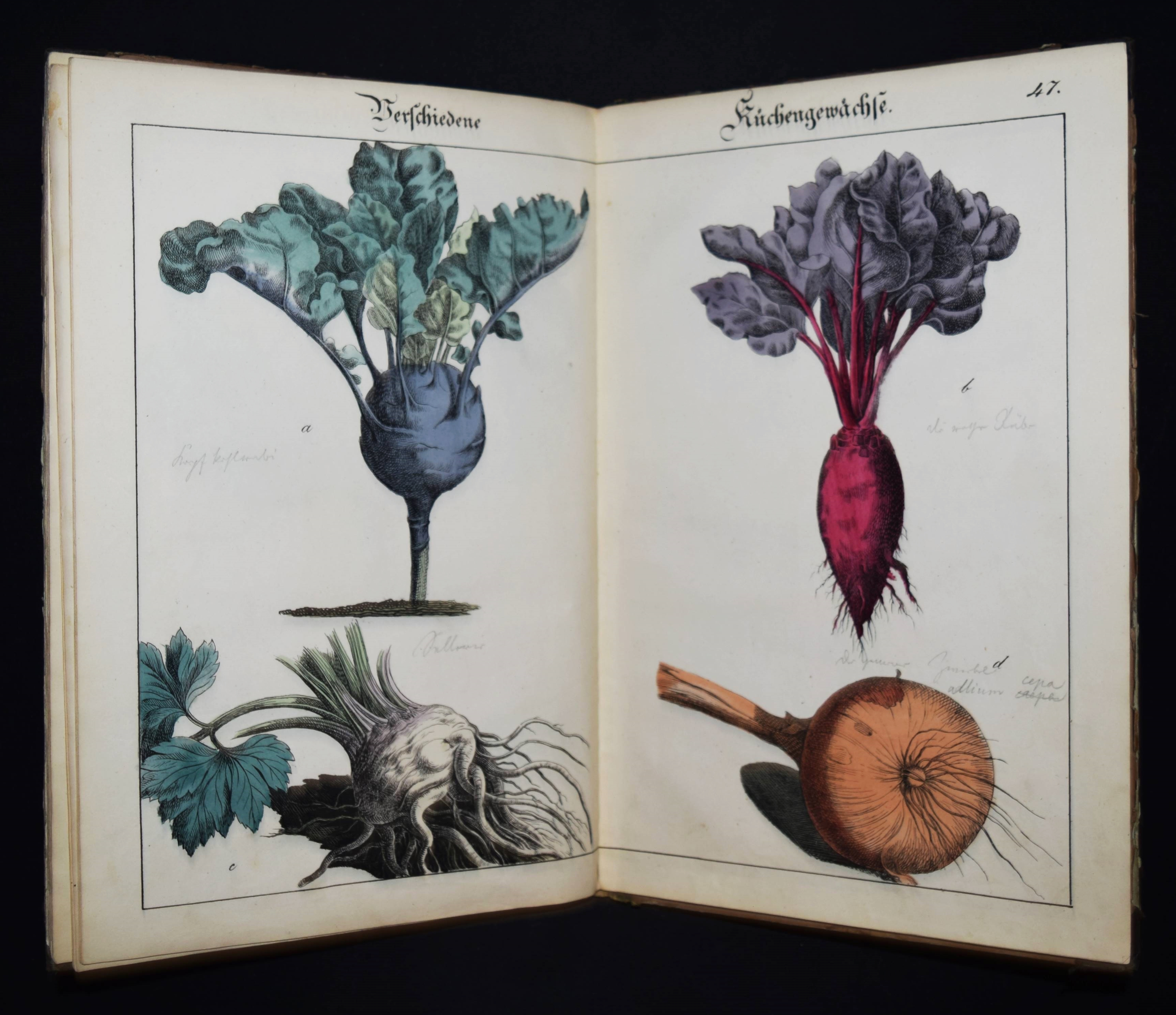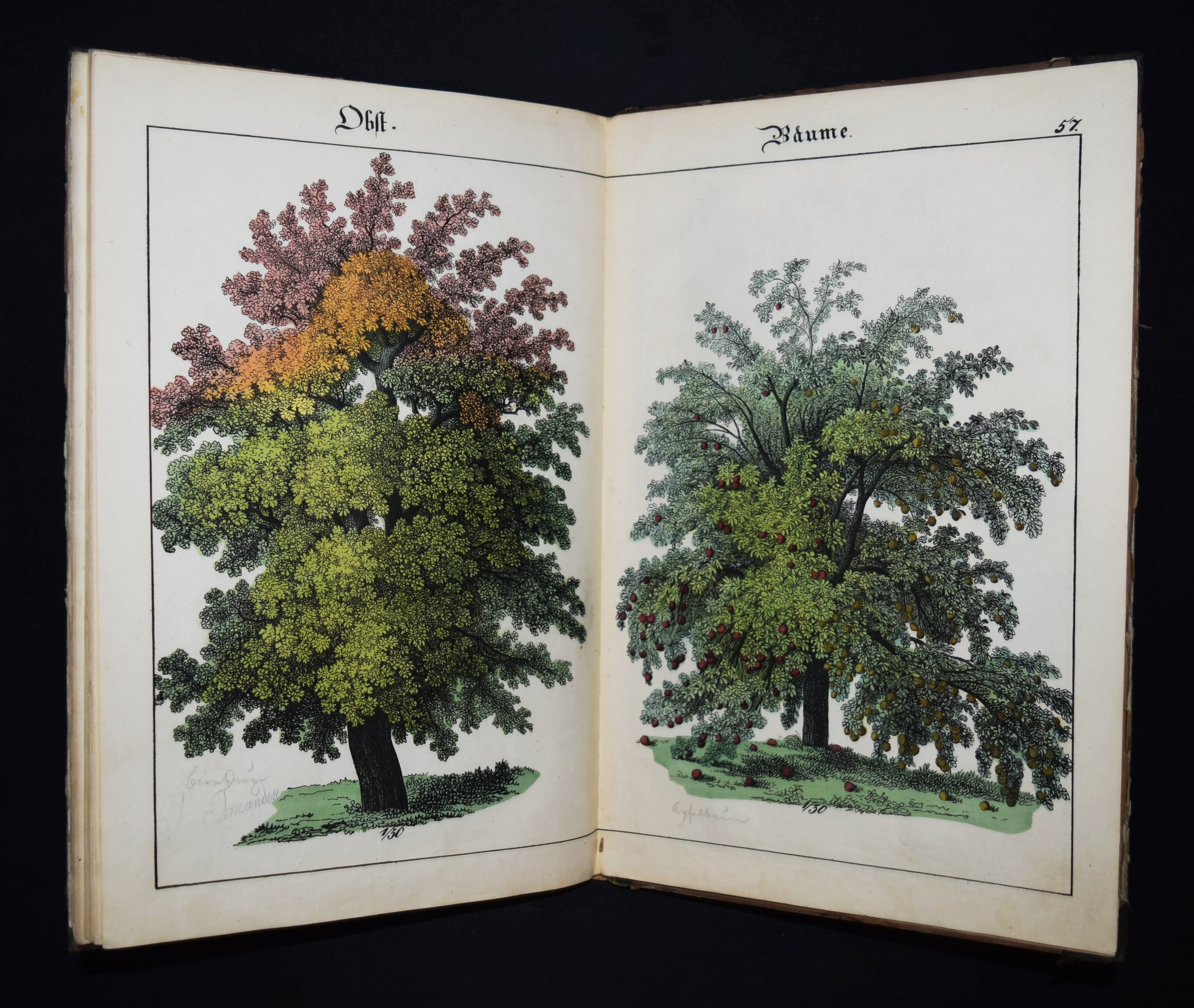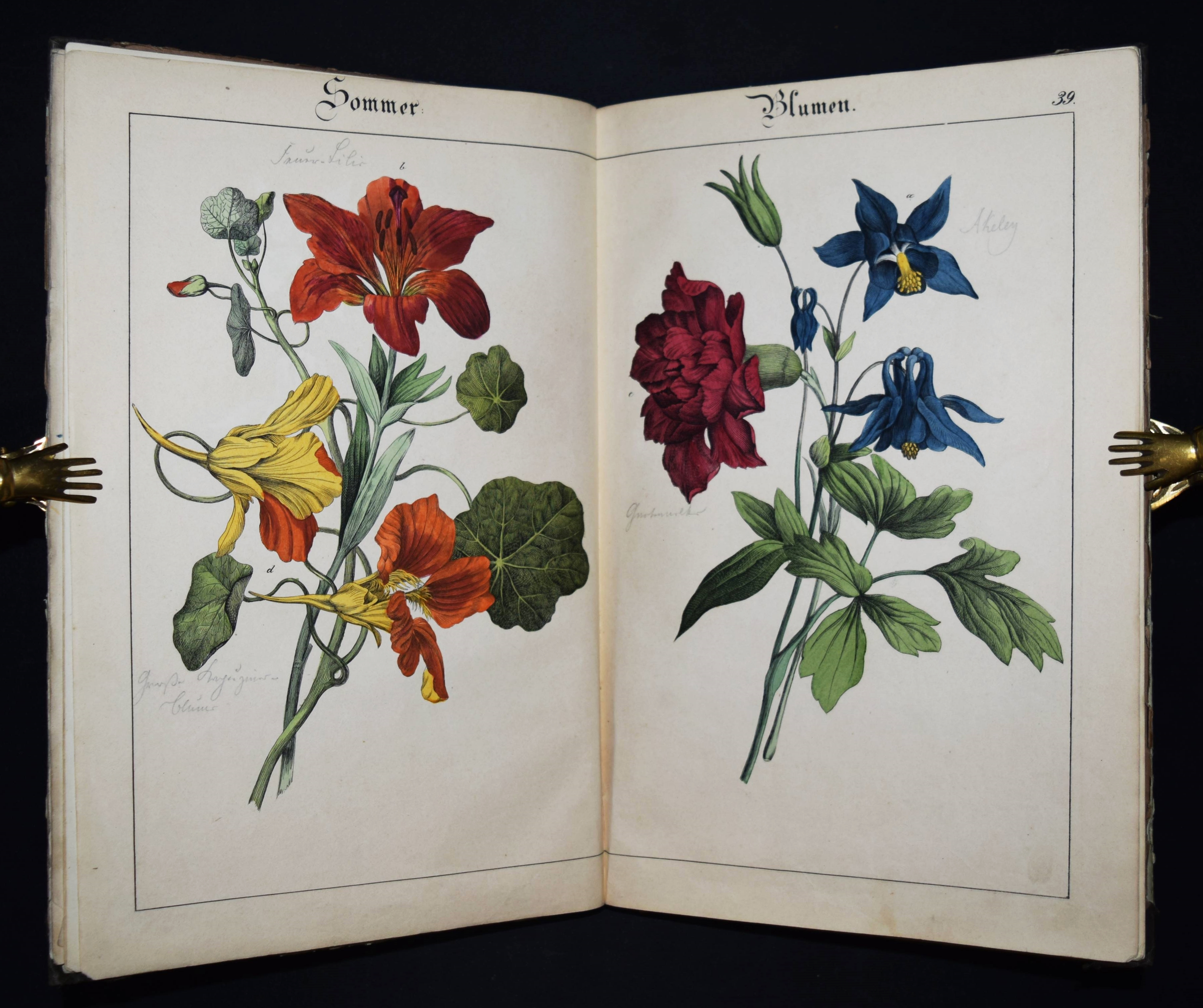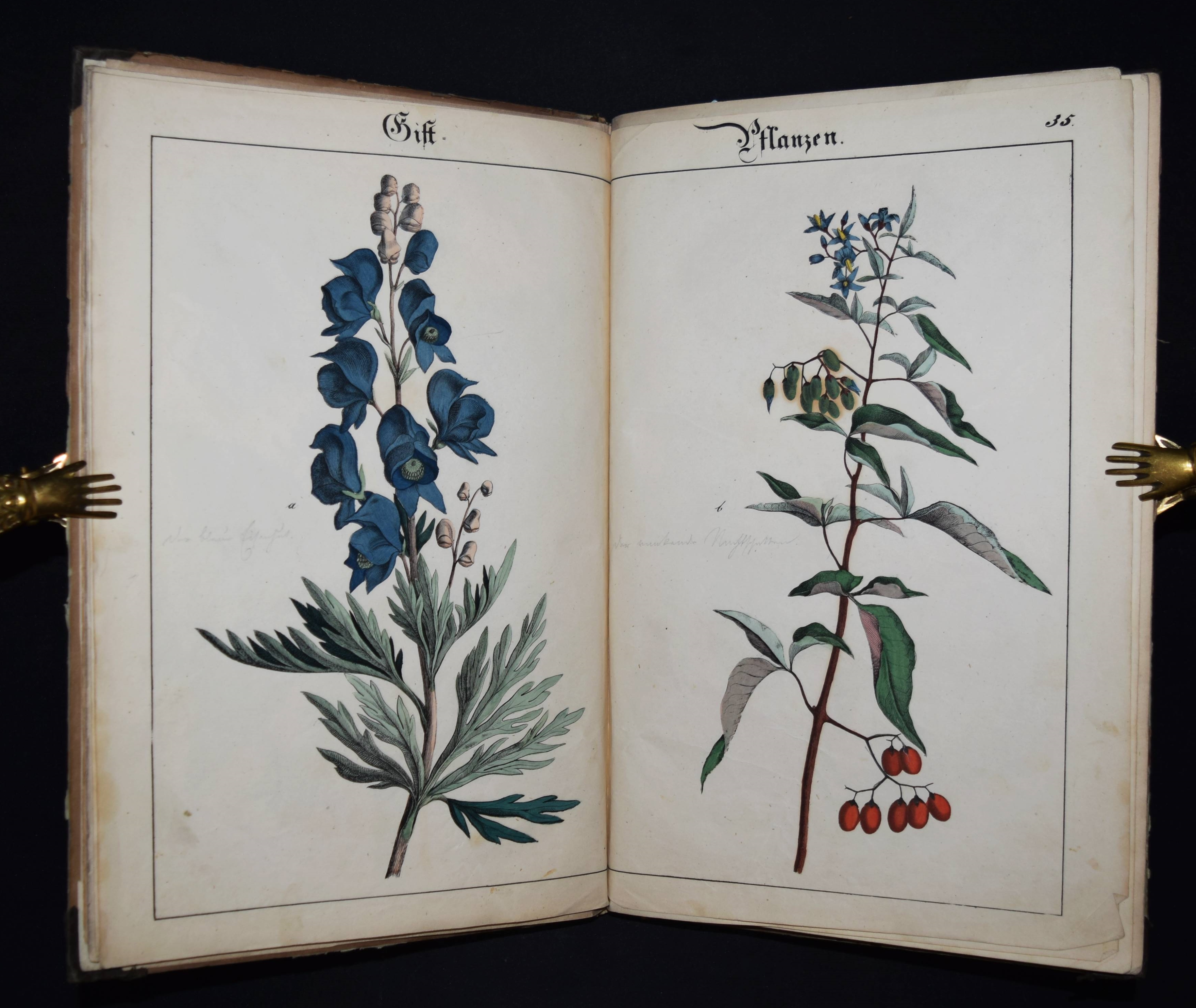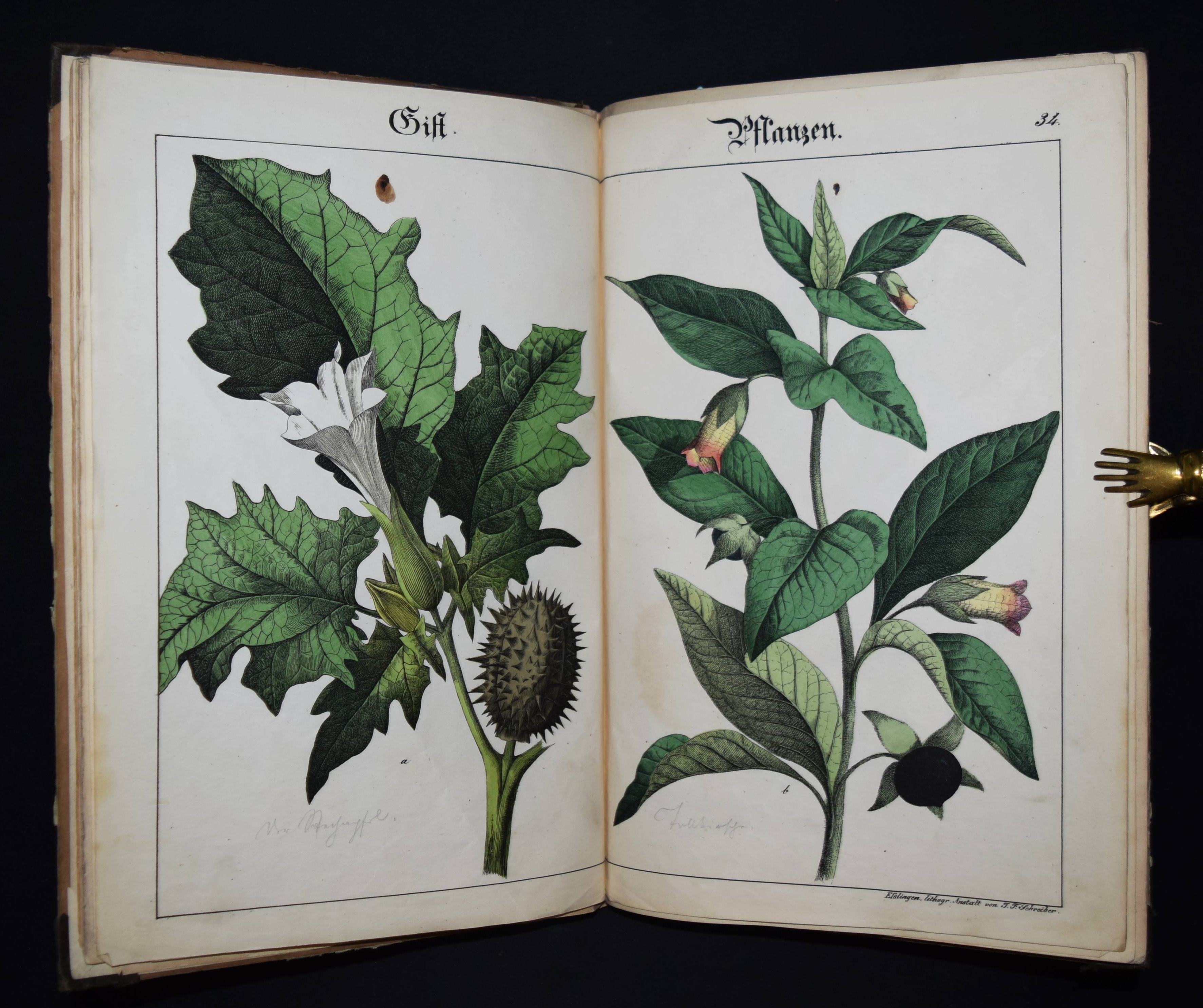 Schreiber, J(akob) F(erdinand) (Hrsg.). 30 Bilder zum Anschauungs-Unterricht für die Jugend. II. Theil (von 3) enthaltend: gegen 30 colorirte (!) Blätter mit Abbildungen von Gift- und Kulturpflanzen. 2. vermehrte und verbesserte Auflage. Esslingen, J. F. Schreiber 1839. 4°. Titel, 6, 2 S. und 30 doppelblattgr. handkol. lithogr. Tafeln. Farbig illustrierter Orig.-Pappband. Bilderwelt 1210. Seebaß II, 1815. Wegehaupt II, 338, III, 322 u. IV, 470. – Der zweite Teil des erfolgreichen Anschauungs-Bilderbuchs des Schreiber-Verlags mit schönen Darstellungen von Bäumen, Blumen, Obst, Gemüse, Getreide, Pilzen, etc. – Rücken restauriert, Deckel etwas fleckig, Textblätter etwas braunfleckig, eine Tafel (Weintrauben) im oberen Drittel im Falz aufgeplatzt, die Tafeln meist nur im Rand etwas braun- und fingerfleckig, die meisten Abbildungen mit zeitgenöss. Bezeichnungen in Bleistift, gutes Exemplar.