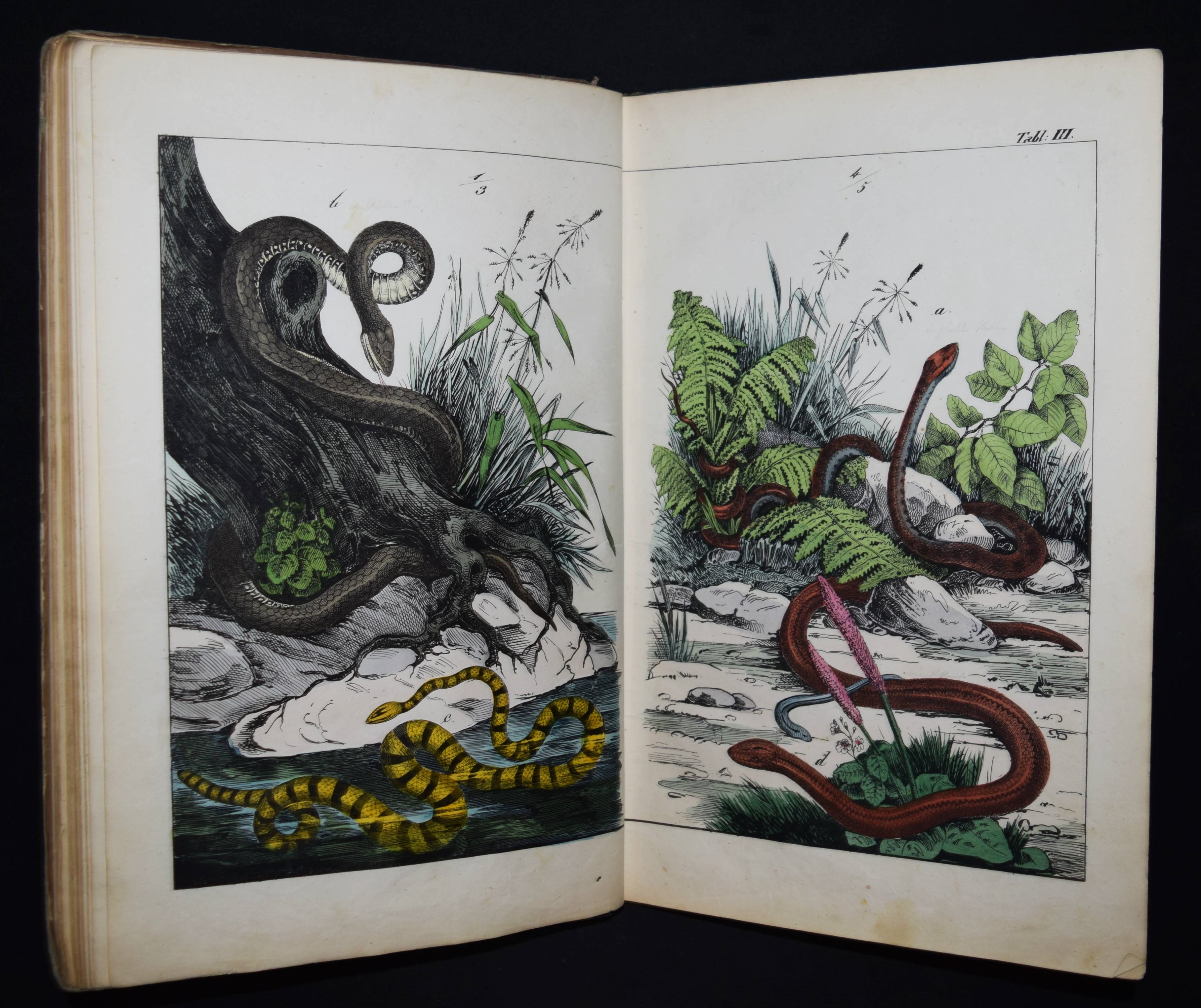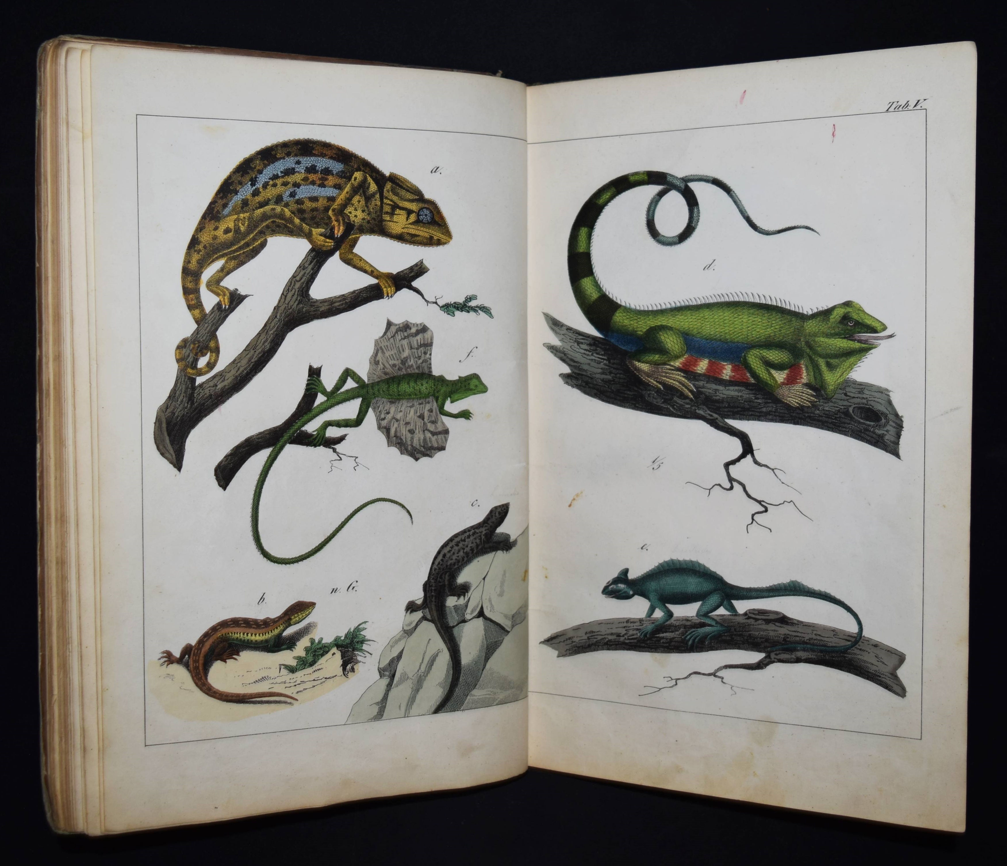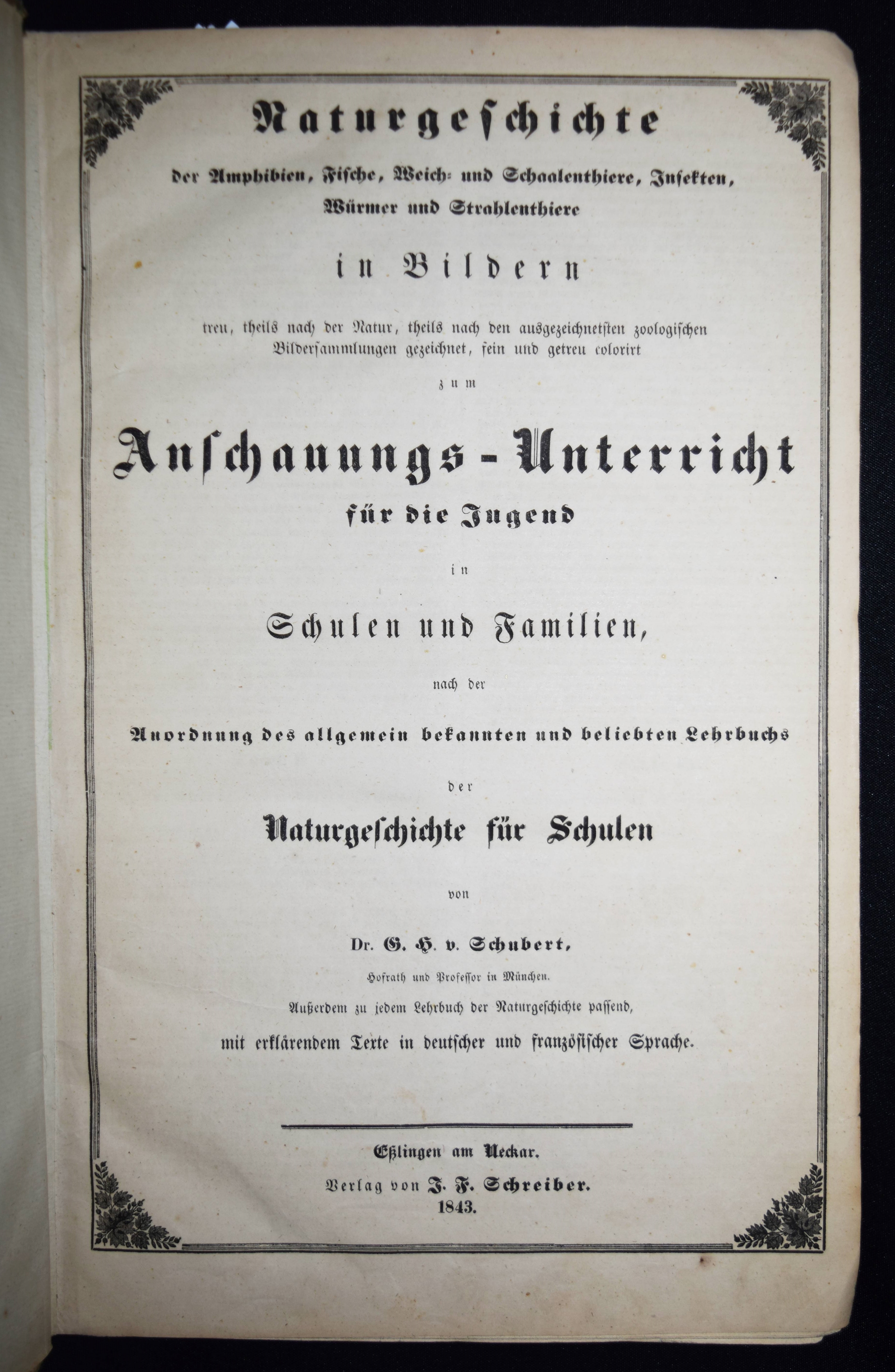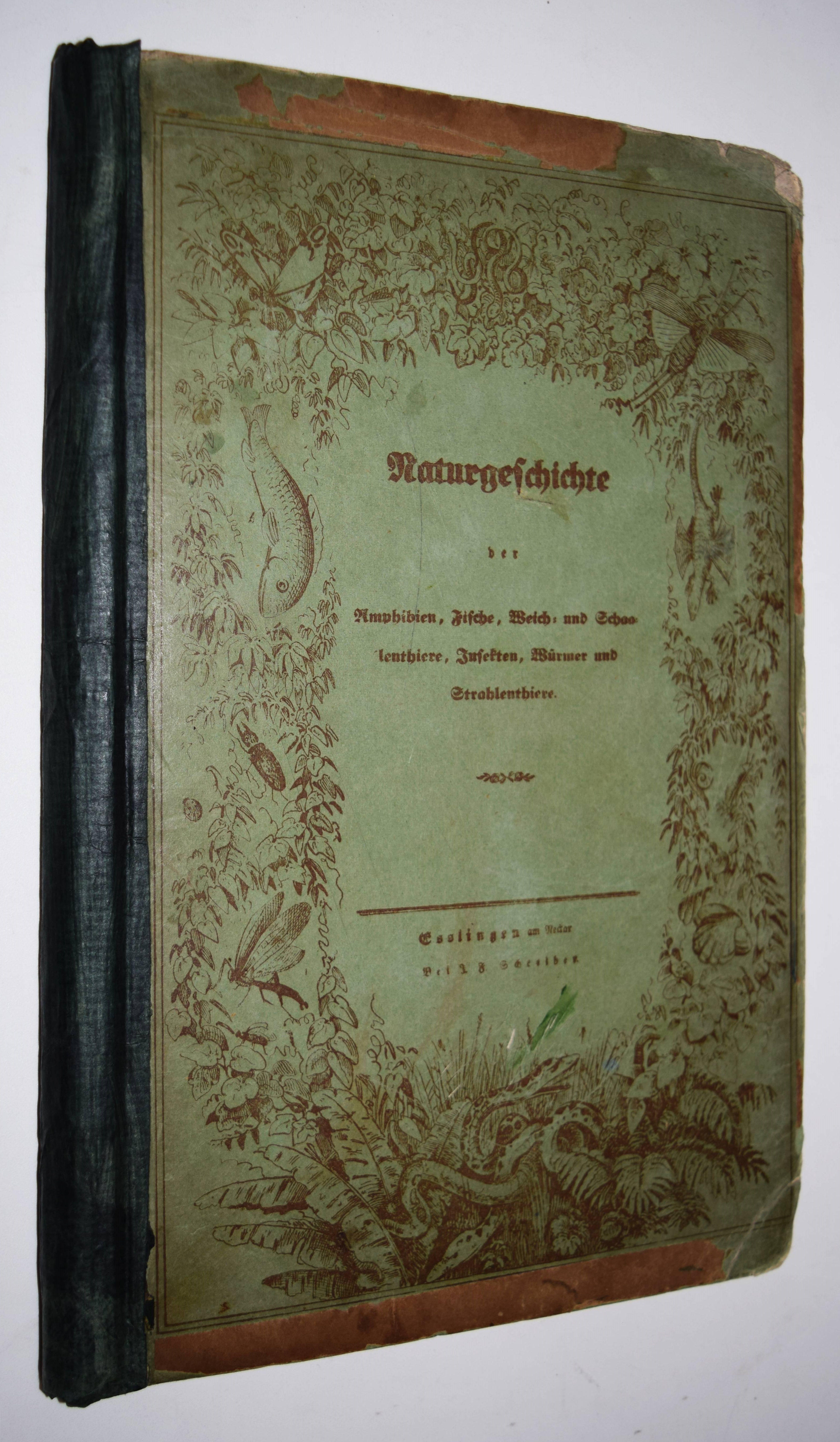 | Schubert, G(otthilf) H(einrich) v. Naturgeschichte der Amphibien, Fische, Weich- und Schaalenthiere, Insekten, Würmer und Strahlenthiere in Bildern. Treu, theils nach der Natur, theils nach den ausgezeichnetsten zoologischen Bildersammlungen gezeichnet, fein und getreu colorirt zum Anschauungs-Unterricht für die Jugend in Schulen und Familien, nach der Anordnung des allgemein bekannten und beliebten Lehrbuchs der Naturgeschichte für Schulen. Außerdem zu jedem Lehrbuch der Naturgeschichte passend, mit erklärendem Texte in deutscher und französischer Sprache. Esslingen am Neckar, J. F. Schreiber 1843. 4°. Titel, 23 S. und 30 doppelblattgr. lithogr. handkolorierte Tafeln. Illustrierter Orig.-Pappband. Nissen, ZBI 3760. Vgl. Wegehaupt II, 2291 (spät. Ausg.). – Seltene erste Ausgabe, eines der schönsten deutschen Amphibien- und Fischbücher des 19. Jahrhunderts. – Die schönen doppelblattgroßen Tafeln zeigen verschiedene Tiere wie Schlangen, Krokodile, Frösche, Schildkröten, Fische, Muscheln, Quallen etc. – Das Anschauungs-Werk erlebte bis 1887 zehn Auflagen. – Rücken restauriert, Deckel etwas berieben und angestaubt, die Tafeln nur teils im Rand etwas fingerfleckig, sehr gutes Exemplar.