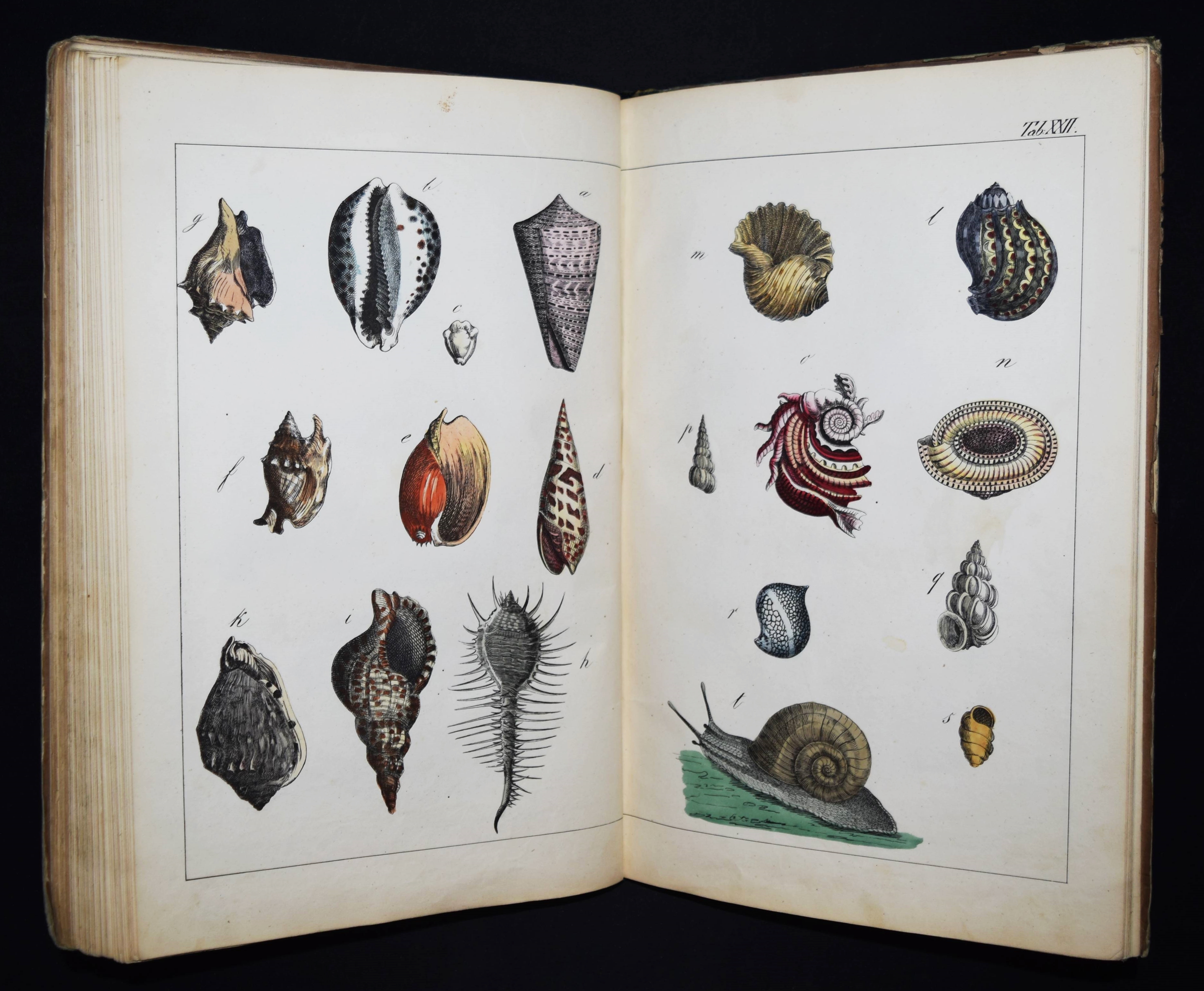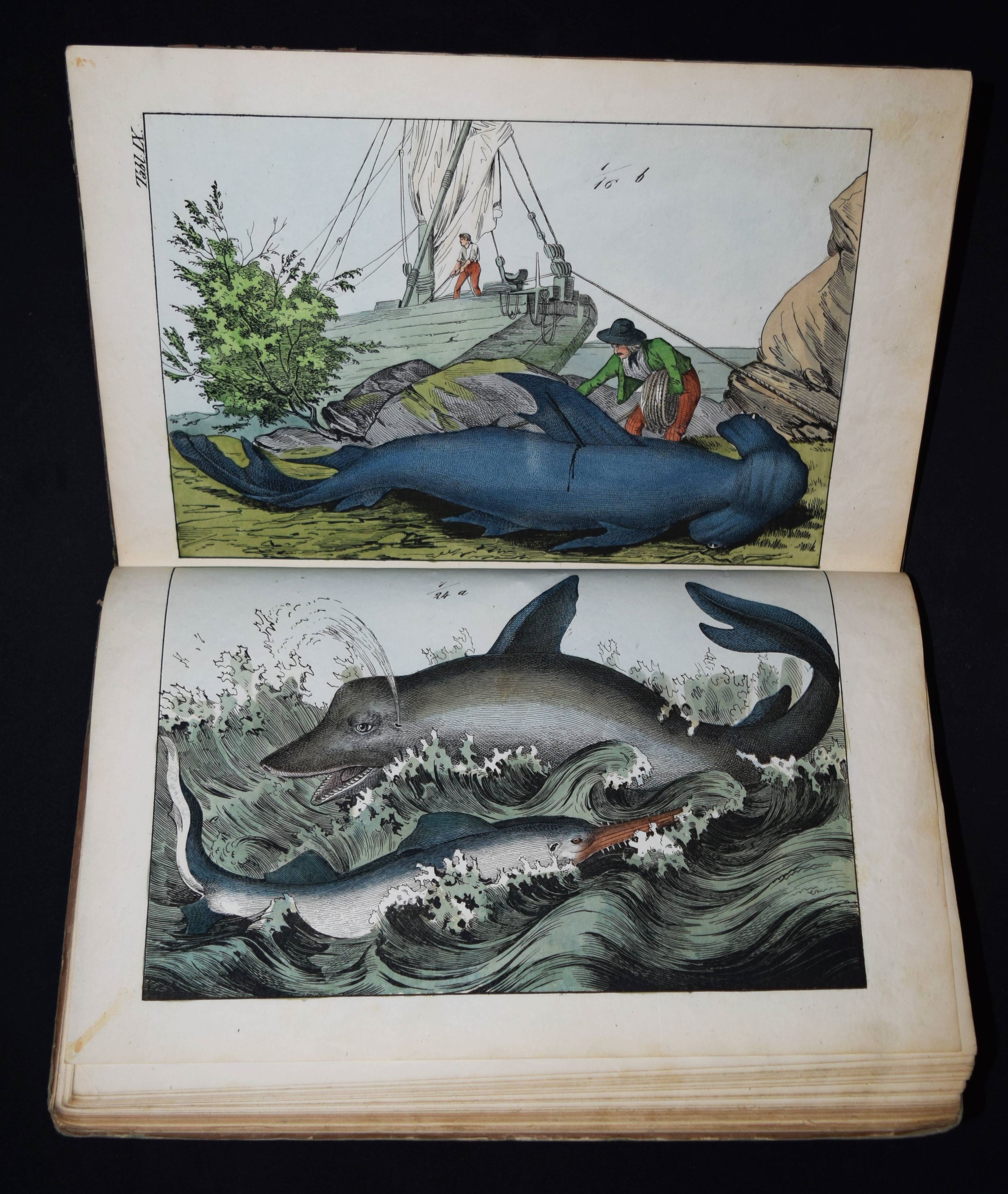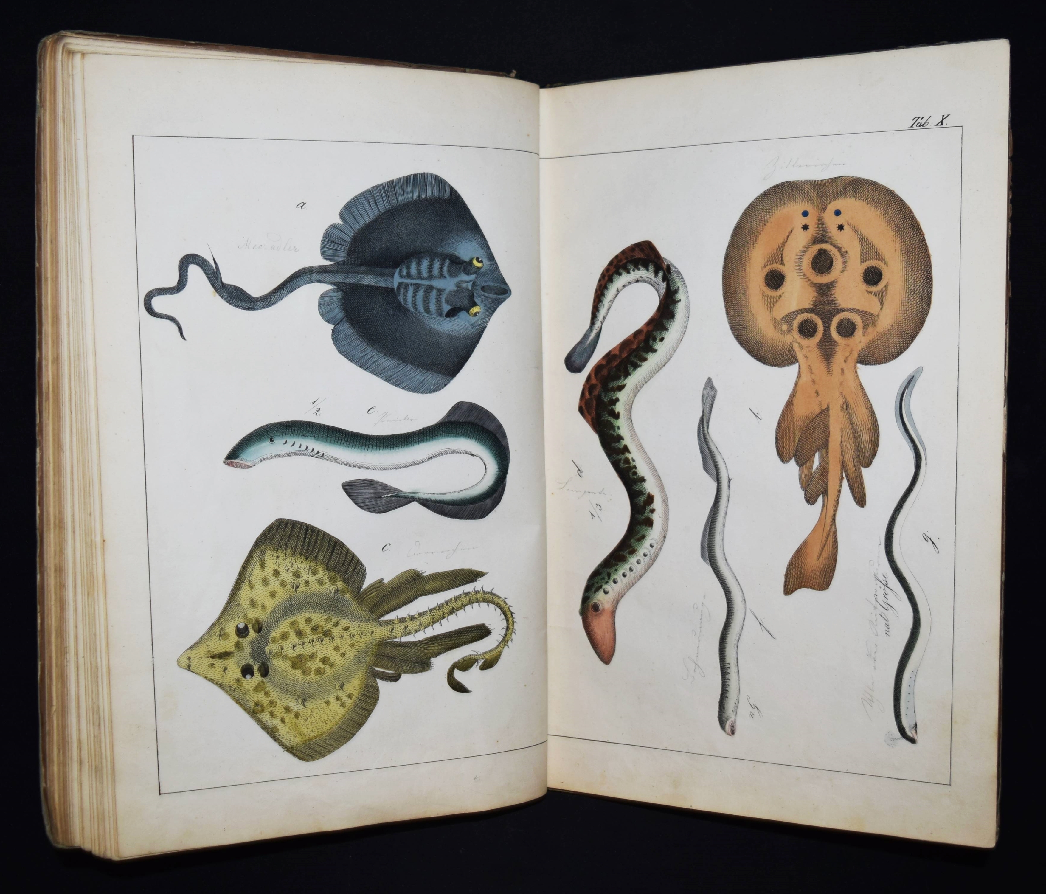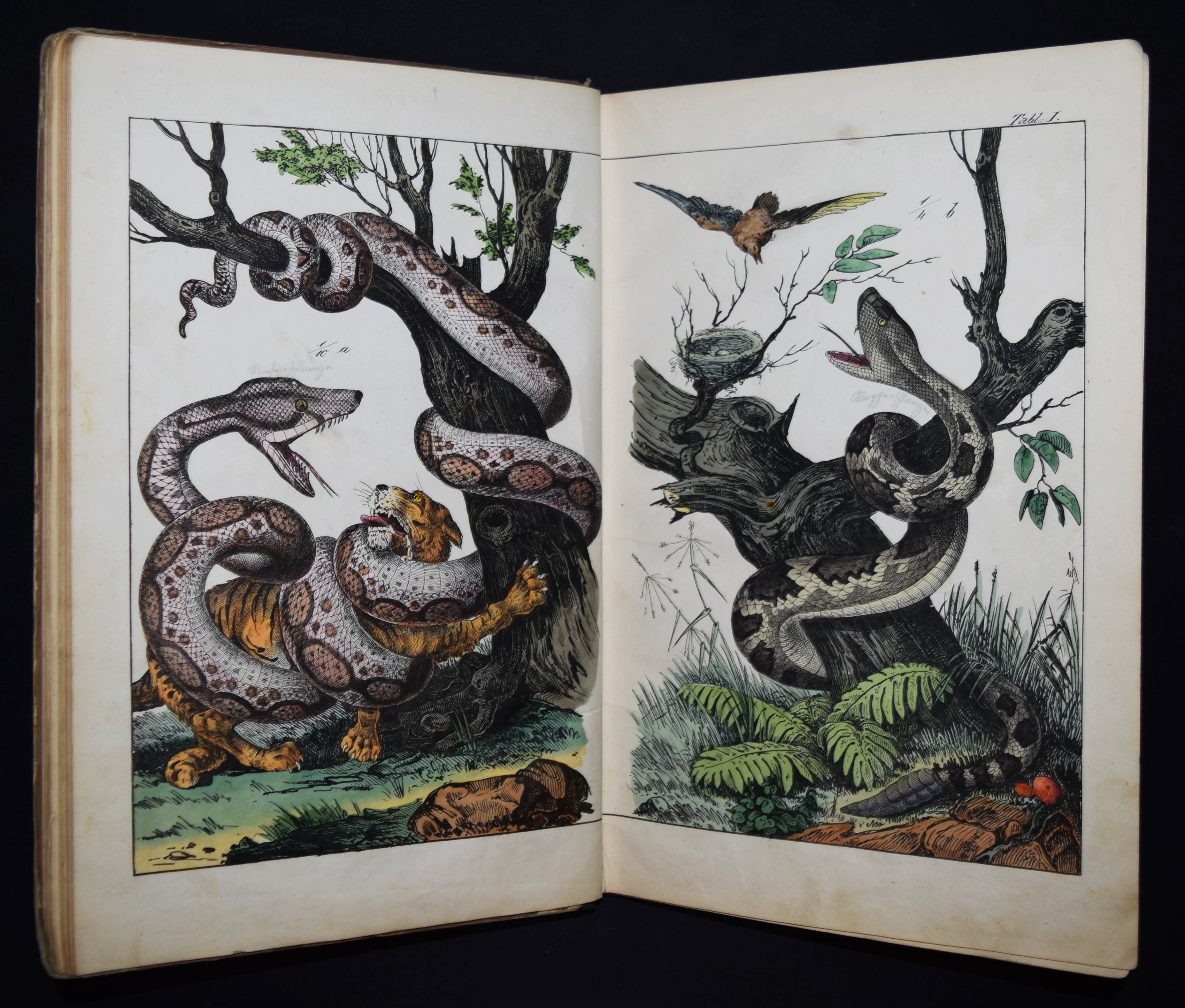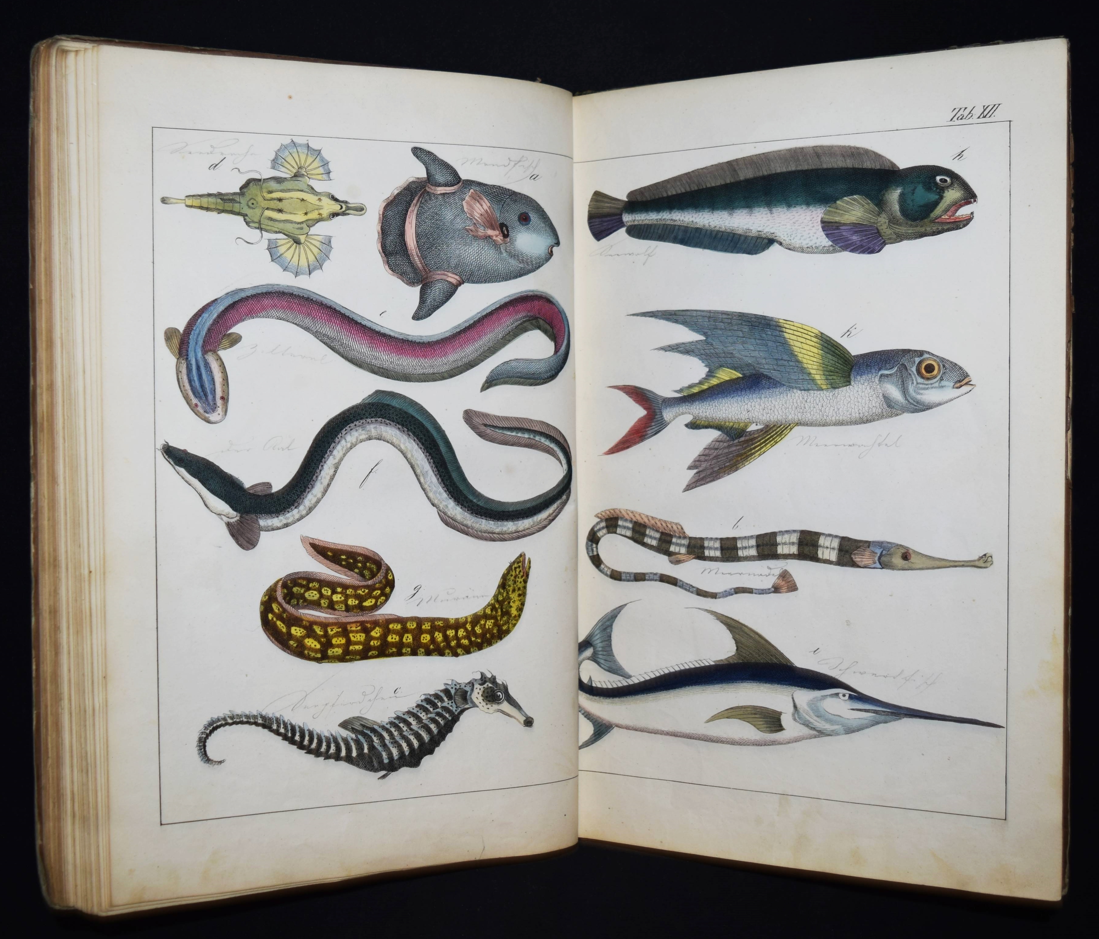 | Schubert, G(otthilf) H(einrich) v. Naturgeschichte der Amphibien, Fische, Weich- und Schaalenthiere, Insekten, Würmer und Strahlenthiere in Bildern. Treu, theils nach der Natur, theils nach den ausgezeichnetsten zoologischen Bildersammlungen gezeichnet, fein und getreu colorirt zum Anschauungs-Unterricht für die Jugend in Schulen und Familien, nach der Anordnung des allgemein bekannten und beliebten Lehrbuchs der Naturgeschichte für Schulen. Außerdem zu jedem Lehrbuch der Naturgeschichte passend, mit erklärendem Texte in deutscher und französischer Sprache. Esslingen am Neckar, J. F. Schreiber 1843. 4°. Titel, 23 S. und 30 doppelblattgr. lithogr. handkolorierte Tafeln. Illustrierter Orig.-Pappband. Nissen, ZBI 3760. Vgl. Wegehaupt II, 2291 (spät. Ausg.). – Seltene erste Ausgabe, eines der schönsten deutschen Amphibien- und Fischbücher des 19. Jahrhunderts. – Die schönen doppelblattgroßen Tafeln zeigen verschiedene Tiere wie Schlangen, Krokodile, Frösche, Schildkröten, Fische, Muscheln, Quallen etc. – Das Anschauungs-Werk erlebte bis 1887 zehn Auflagen. – Rücken restauriert, Deckel etwas berieben und angestaubt, die Tafeln nur teils im Rand etwas fingerfleckig, sehr gutes Exemplar.