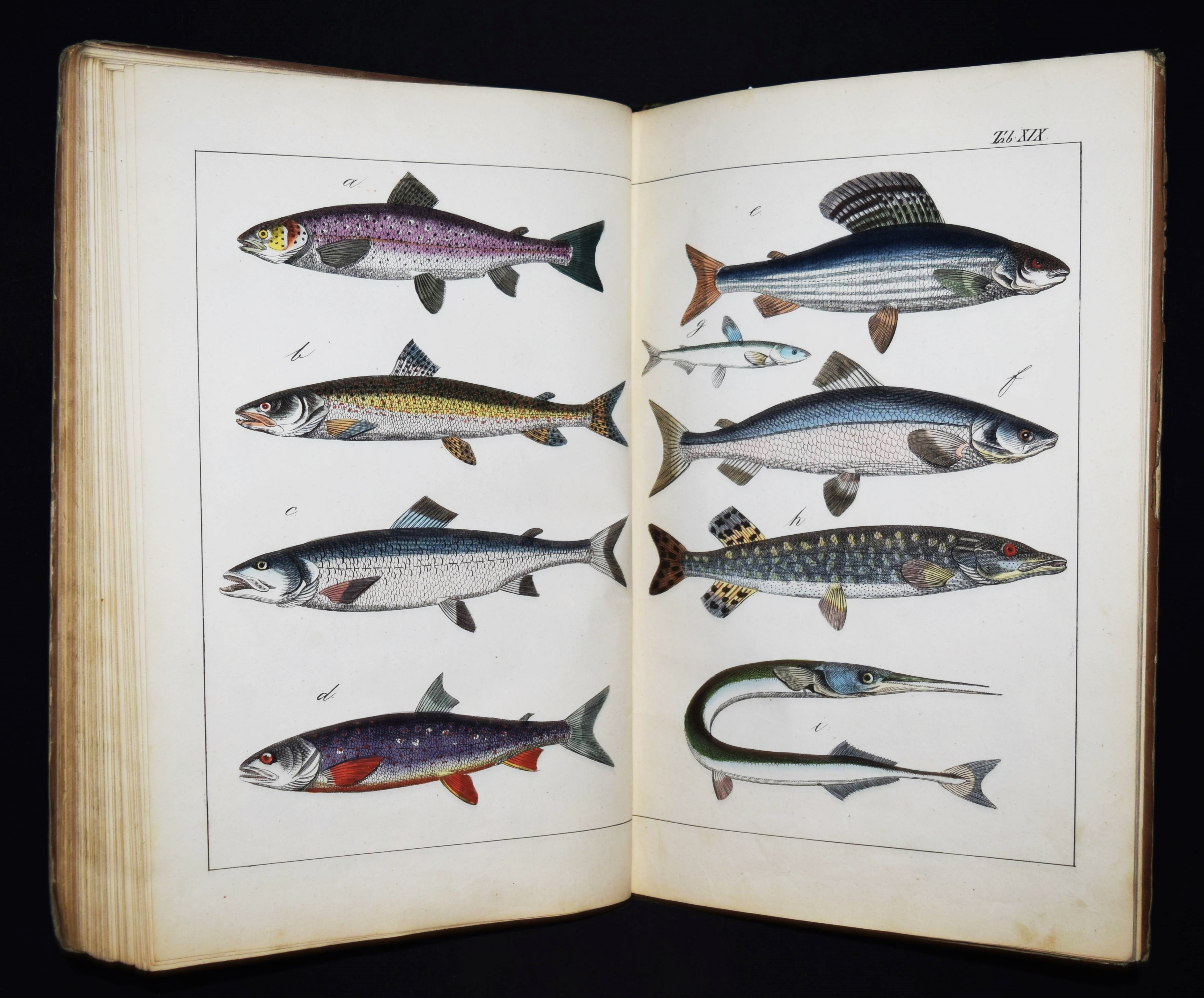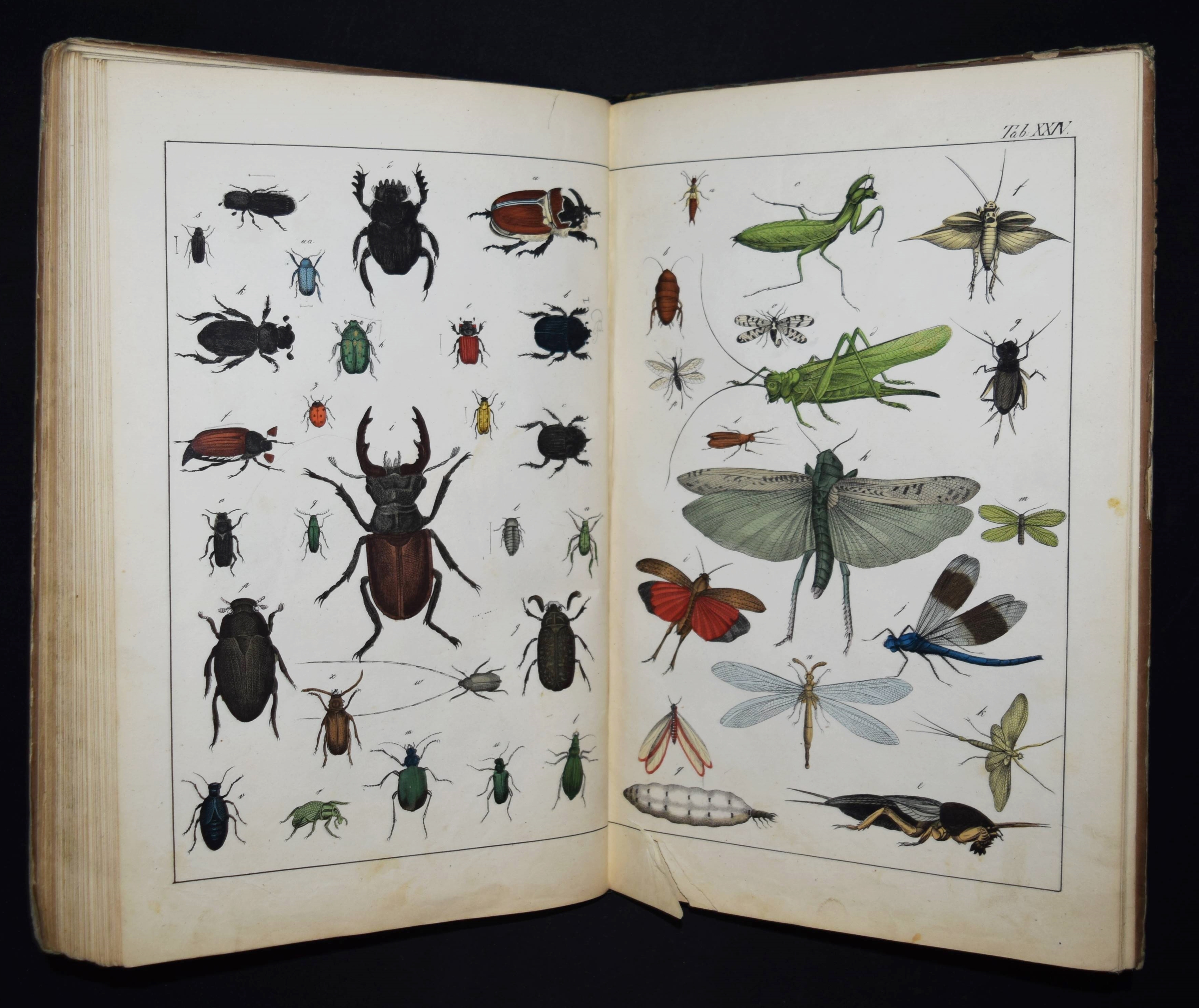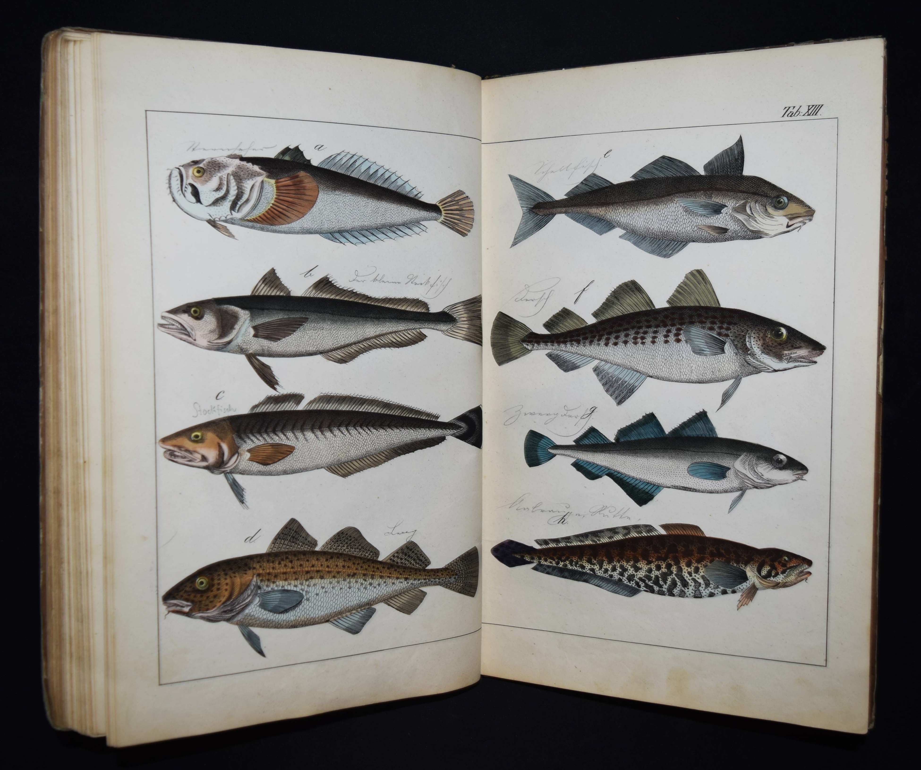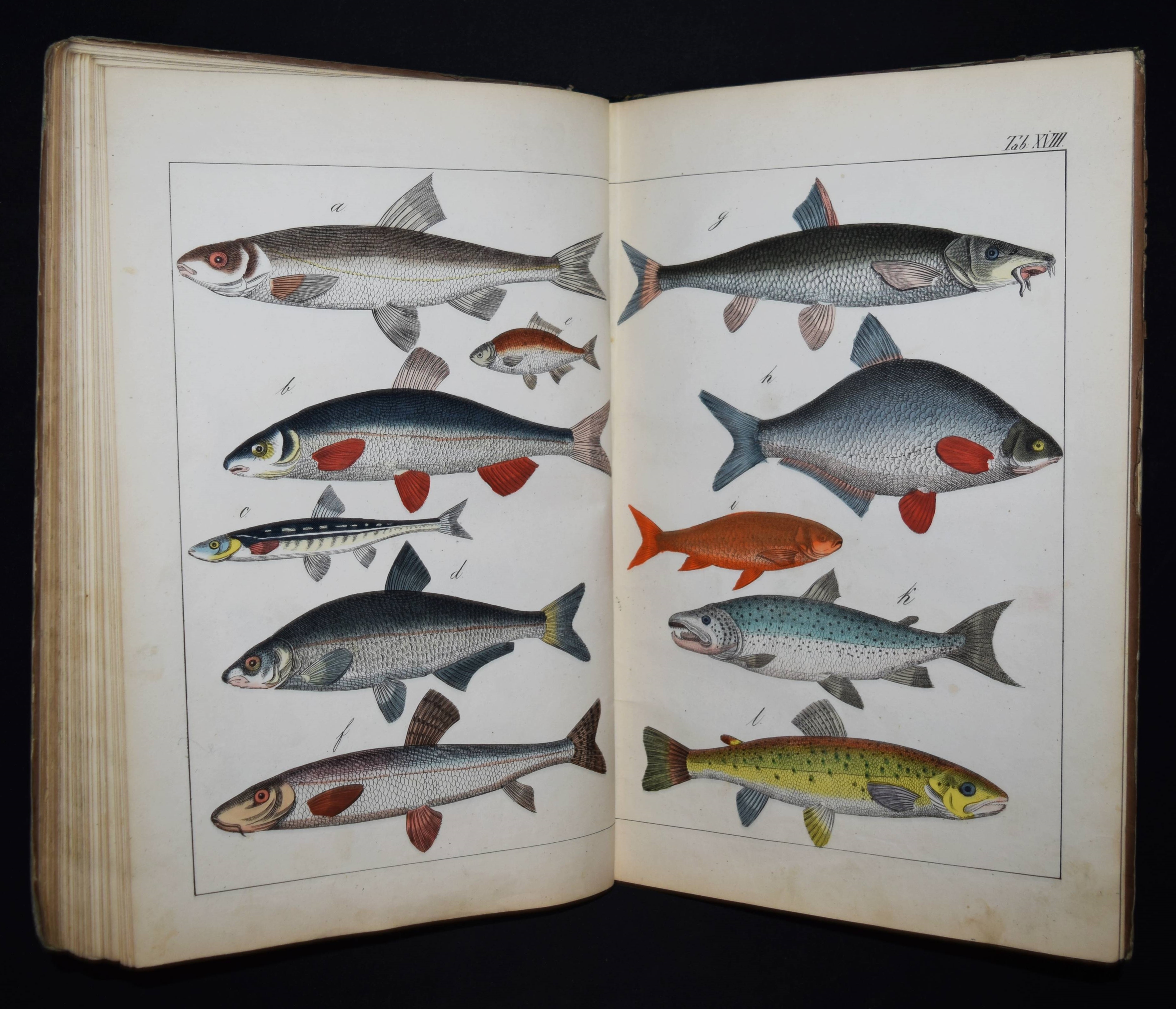 | Schubert, G(otthilf) H(einrich) v. Naturgeschichte der Amphibien, Fische, Weich- und Schaalenthiere, Insekten, Würmer und Strahlenthiere in Bildern. Treu, theils nach der Natur, theils nach den ausgezeichnetsten zoologischen Bildersammlungen gezeichnet, fein und getreu colorirt zum Anschauungs-Unterricht für die Jugend in Schulen und Familien, nach der Anordnung des allgemein bekannten und beliebten Lehrbuchs der Naturgeschichte für Schulen. Außerdem zu jedem Lehrbuch der Naturgeschichte passend, mit erklärendem Texte in deutscher und französischer Sprache. Esslingen am Neckar, J. F. Schreiber 1843. 4°. Titel, 23 S. und 30 doppelblattgr. lithogr. handkolorierte Tafeln. Illustrierter Orig.-Pappband. Nissen, ZBI 3760. Vgl. Wegehaupt II, 2291 (spät. Ausg.). – Seltene erste Ausgabe, eines der schönsten deutschen Amphibien- und Fischbücher des 19. Jahrhunderts. – Die schönen doppelblattgroßen Tafeln zeigen verschiedene Tiere wie Schlangen, Krokodile, Frösche, Schildkröten, Fische, Muscheln, Quallen etc. – Das Anschauungs-Werk erlebte bis 1887 zehn Auflagen. – Rücken restauriert, Deckel etwas berieben und angestaubt, die Tafeln nur teils im Rand etwas fingerfleckig, sehr gutes Exemplar.