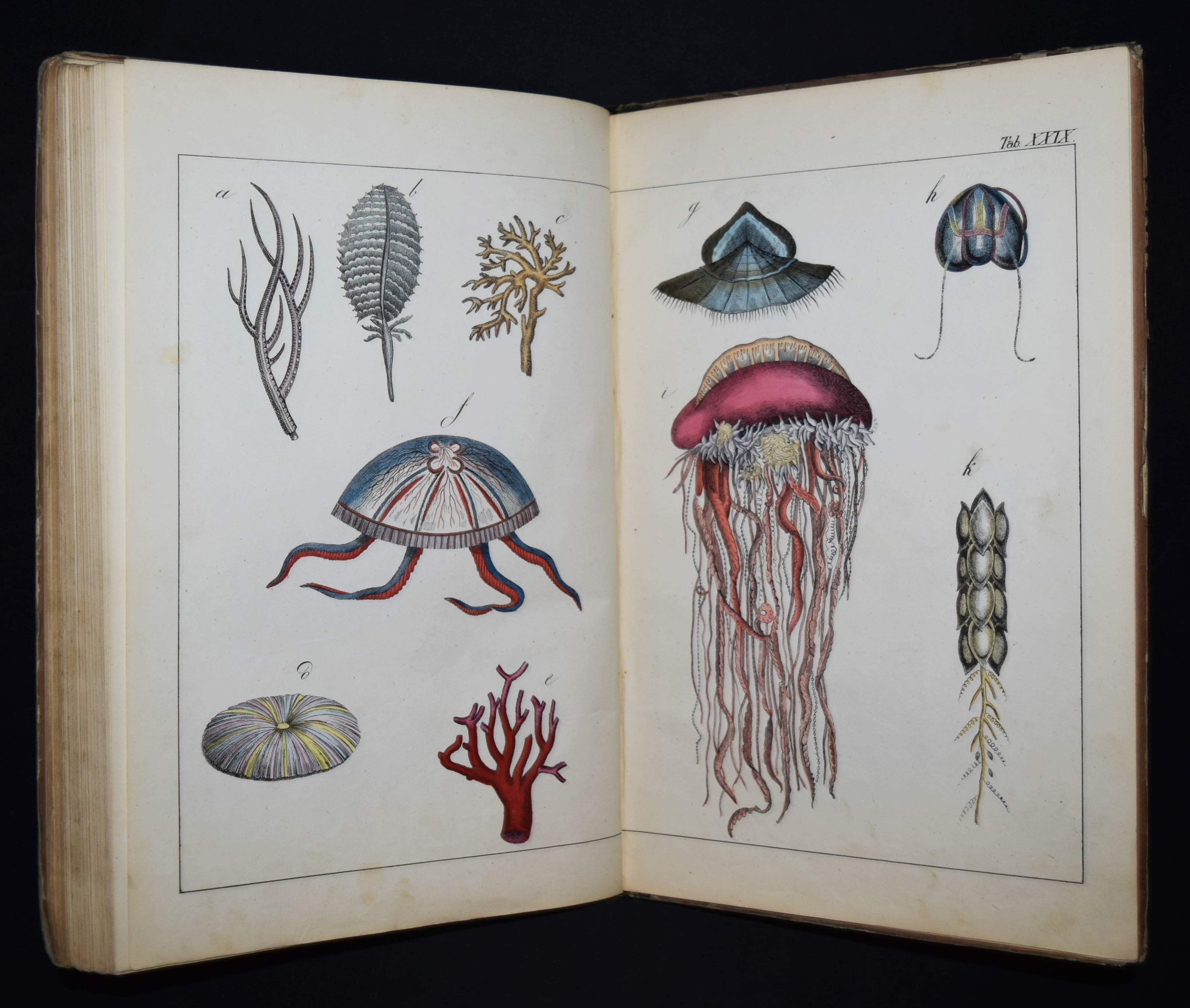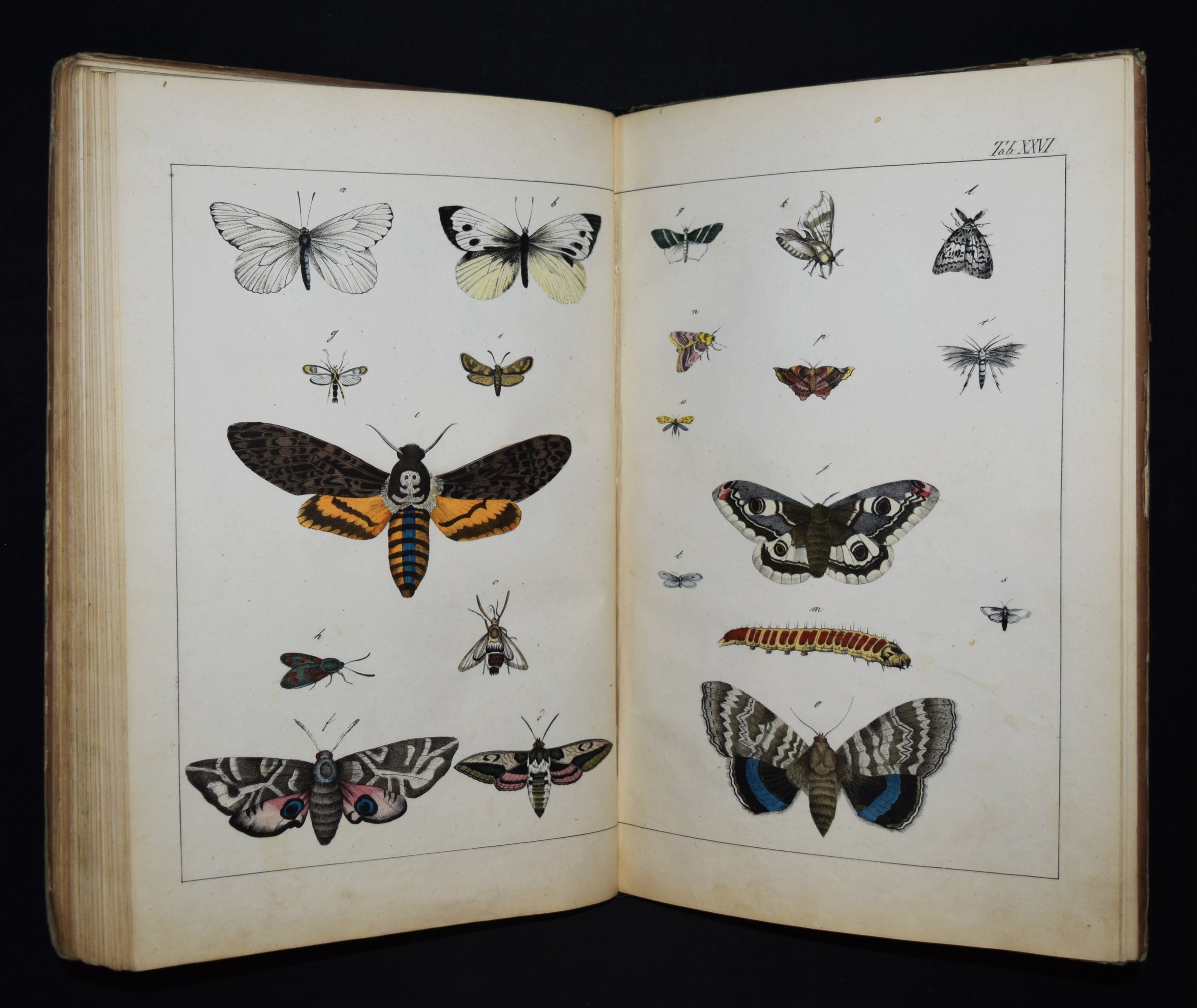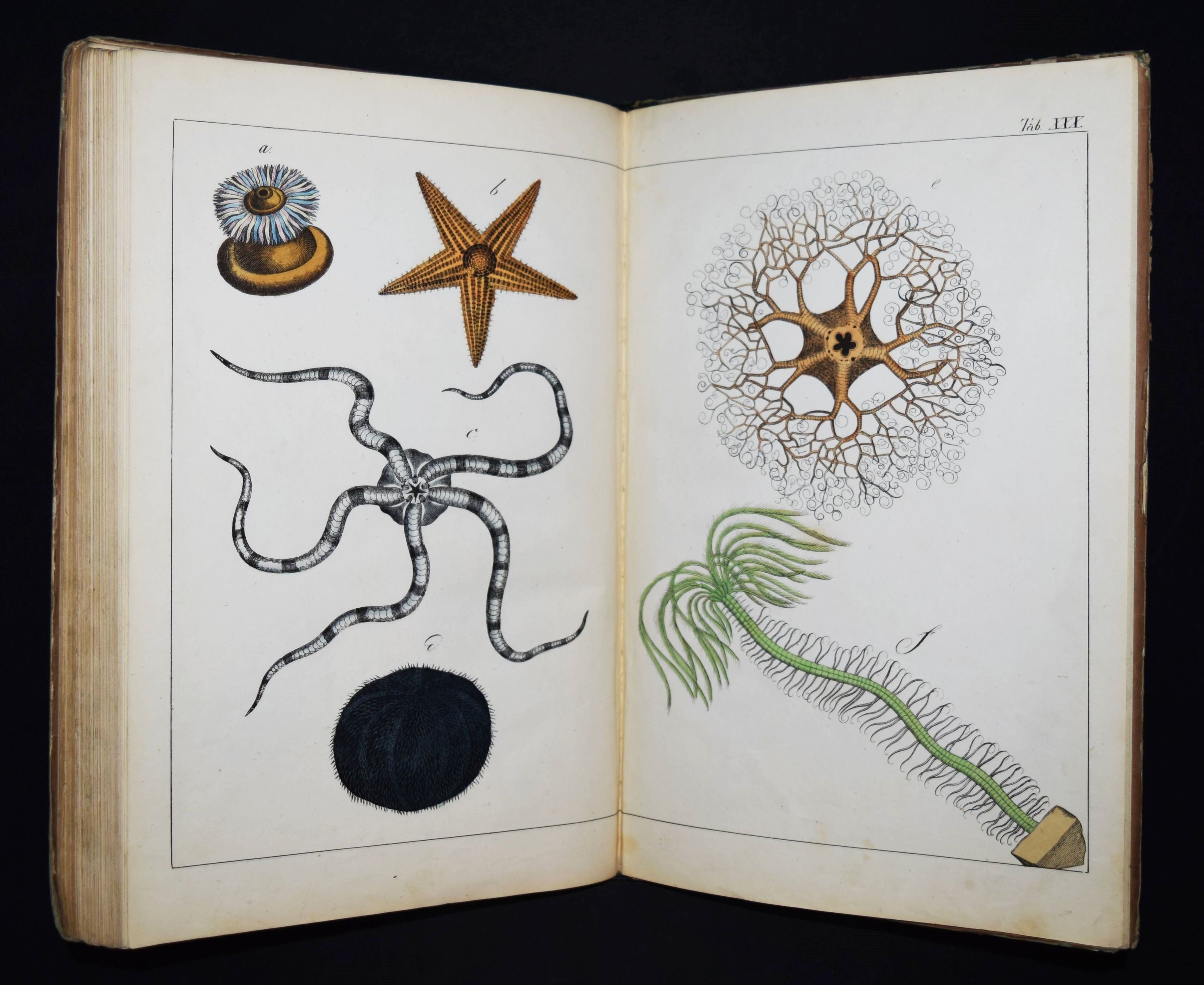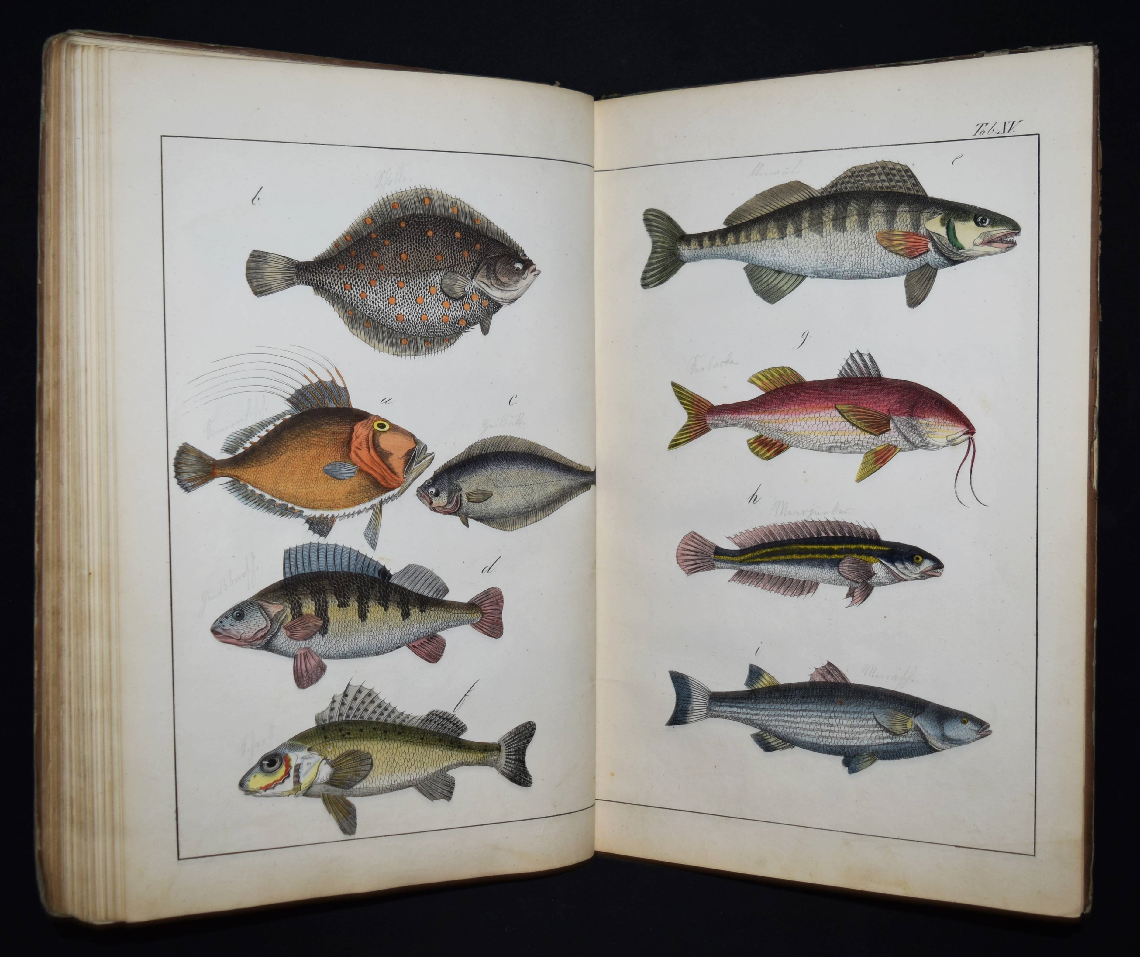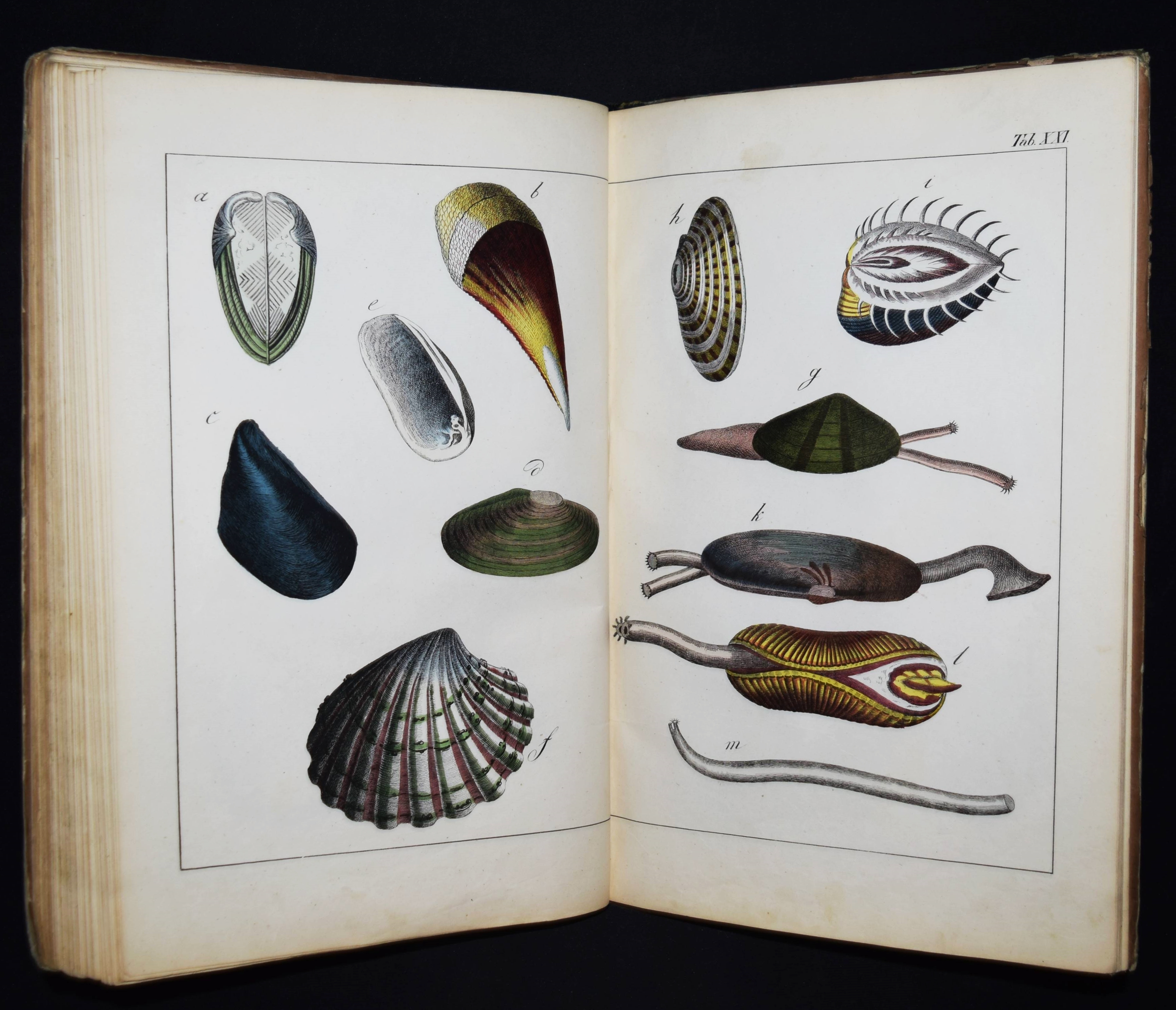 | Schubert, G(otthilf) H(einrich) v. Naturgeschichte der Amphibien, Fische, Weich- und Schaalenthiere, Insekten, Würmer und Strahlenthiere in Bildern. Treu, theils nach der Natur, theils nach den ausgezeichnetsten zoologischen Bildersammlungen gezeichnet, fein und getreu colorirt zum Anschauungs-Unterricht für die Jugend in Schulen und Familien, nach der Anordnung des allgemein bekannten und beliebten Lehrbuchs der Naturgeschichte für Schulen. Außerdem zu jedem Lehrbuch der Naturgeschichte passend, mit erklärendem Texte in deutscher und französischer Sprache. Esslingen am Neckar, J. F. Schreiber 1843. 4°. Titel, 23 S. und 30 doppelblattgr. lithogr. handkolorierte Tafeln. Illustrierter Orig.-Pappband. Nissen, ZBI 3760. Vgl. Wegehaupt II, 2291 (spät. Ausg.). – Seltene erste Ausgabe, eines der schönsten deutschen Amphibien- und Fischbücher des 19. Jahrhunderts. – Die schönen doppelblattgroßen Tafeln zeigen verschiedene Tiere wie Schlangen, Krokodile, Frösche, Schildkröten, Fische, Muscheln, Quallen etc. – Das Anschauungs-Werk erlebte bis 1887 zehn Auflagen. – Rücken restauriert, Deckel etwas berieben und angestaubt, die Tafeln nur teils im Rand etwas fingerfleckig, sehr gutes Exemplar.