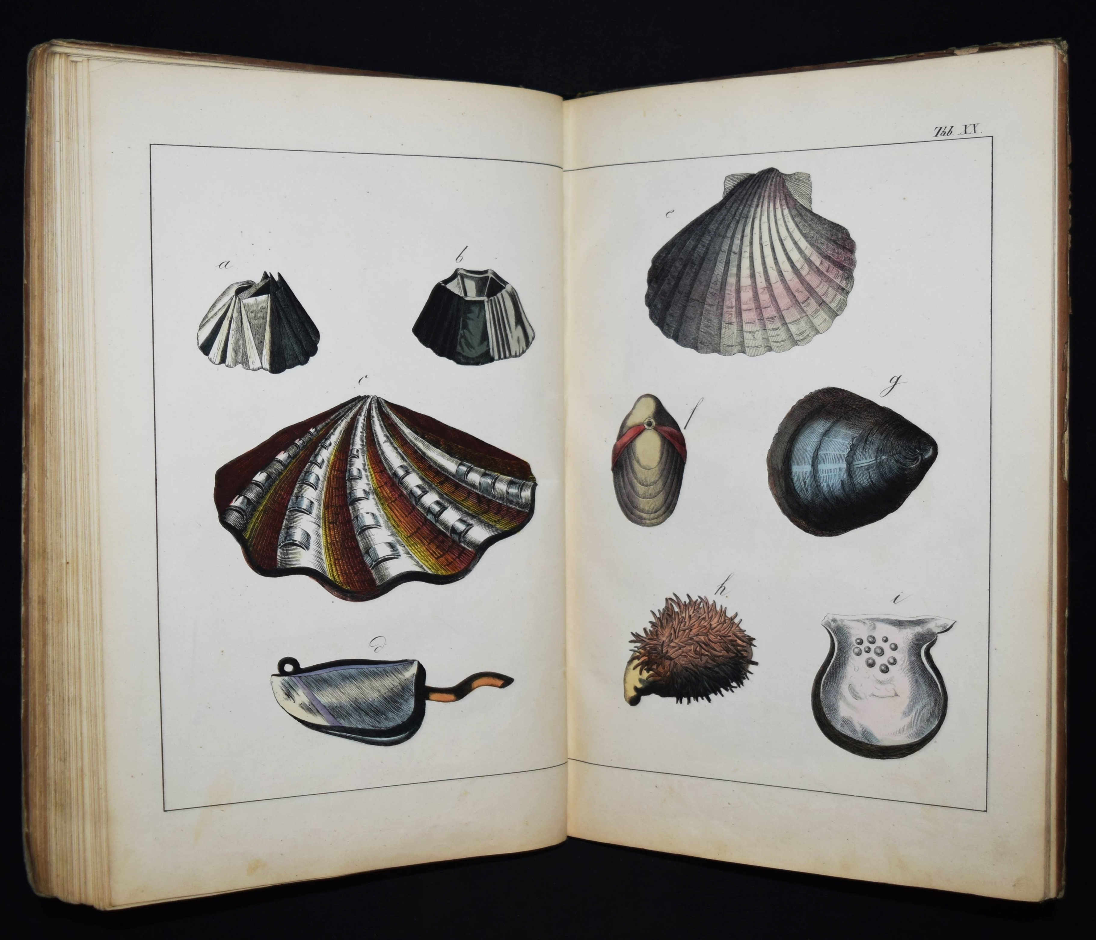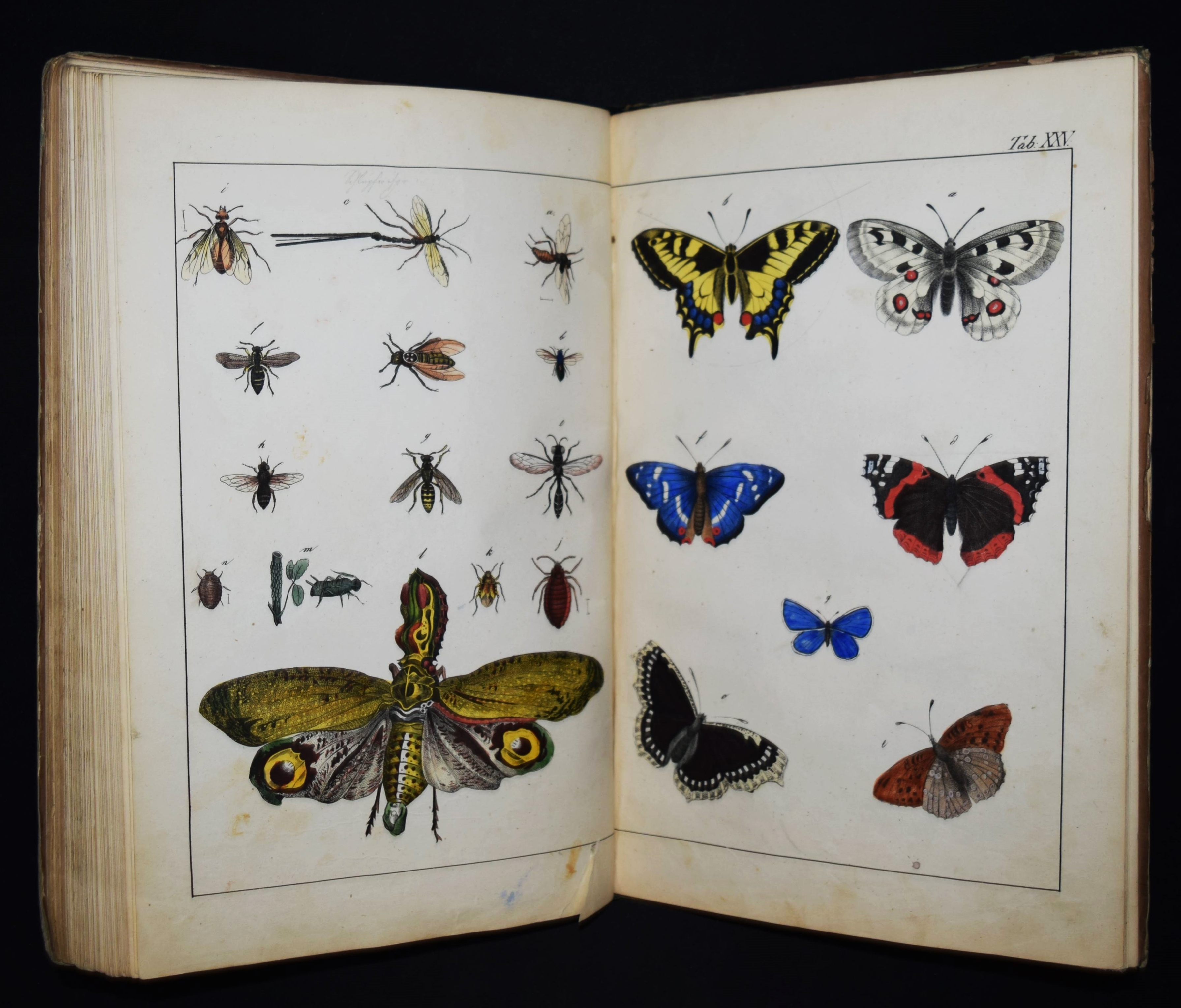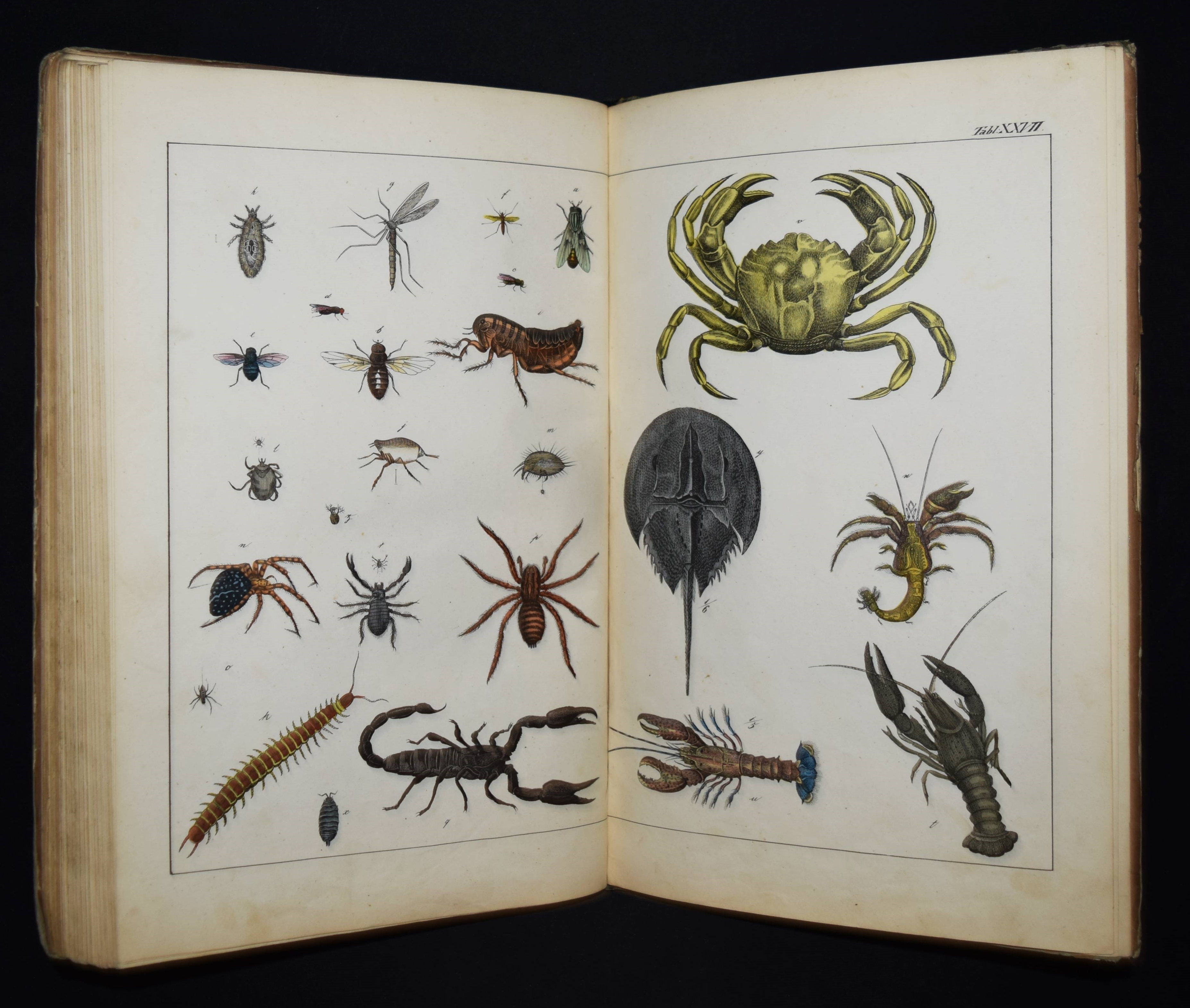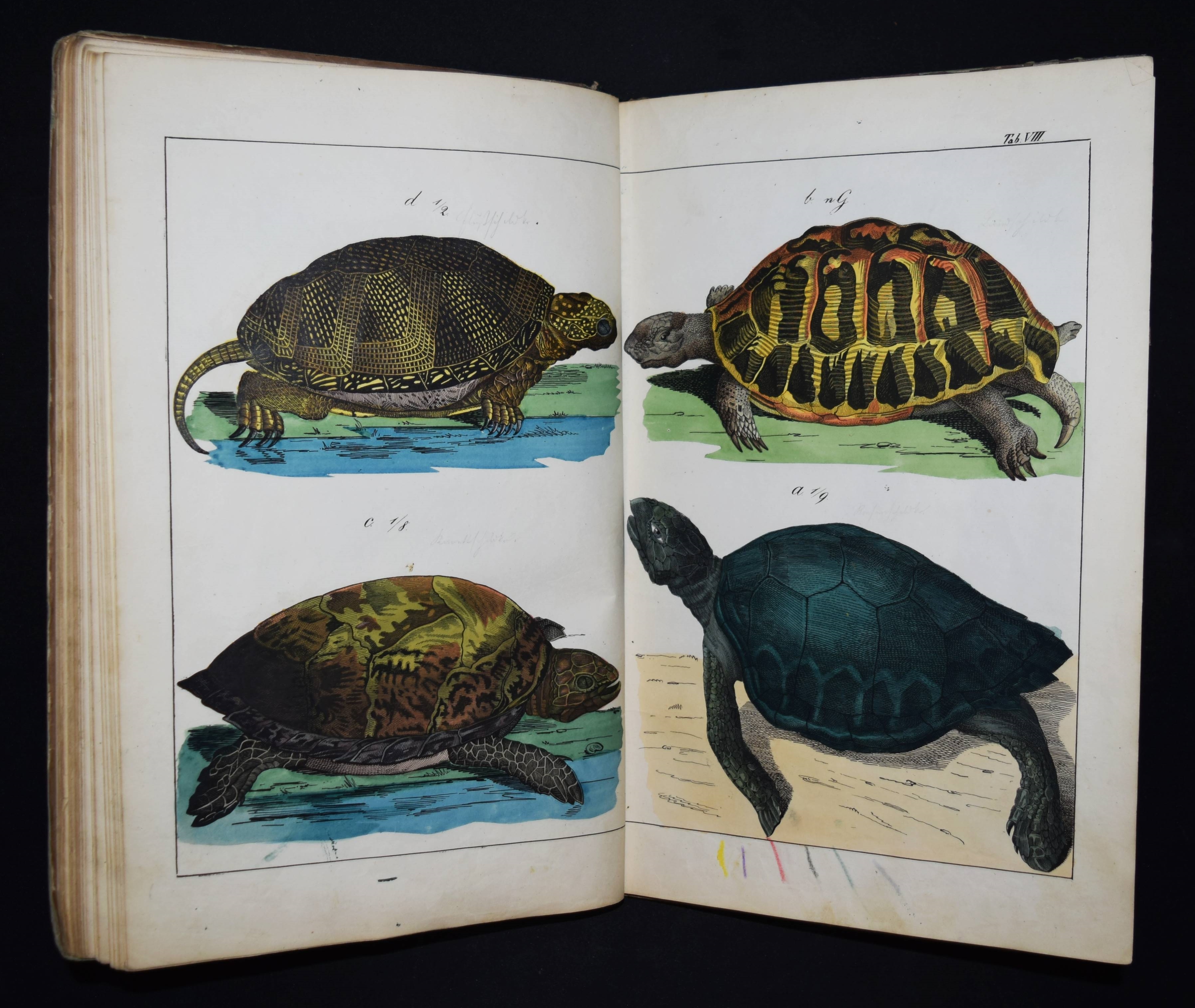 | Schubert, G(otthilf) H(einrich) v. Naturgeschichte der Amphibien, Fische, Weich- und Schaalenthiere, Insekten, Würmer und Strahlenthiere in Bildern. Treu, theils nach der Natur, theils nach den ausgezeichnetsten zoologischen Bildersammlungen gezeichnet, fein und getreu colorirt zum Anschauungs-Unterricht für die Jugend in Schulen und Familien, nach der Anordnung des allgemein bekannten und beliebten Lehrbuchs der Naturgeschichte für Schulen. Außerdem zu jedem Lehrbuch der Naturgeschichte passend, mit erklärendem Texte in deutscher und französischer Sprache. Esslingen am Neckar, J. F. Schreiber 1843. 4°. Titel, 23 S. und 30 doppelblattgr. lithogr. handkolorierte Tafeln. Illustrierter Orig.-Pappband. Nissen, ZBI 3760. Vgl. Wegehaupt II, 2291 (spät. Ausg.). – Seltene erste Ausgabe, eines der schönsten deutschen Amphibien- und Fischbücher des 19. Jahrhunderts. – Die schönen doppelblattgroßen Tafeln zeigen verschiedene Tiere wie Schlangen, Krokodile, Frösche, Schildkröten, Fische, Muscheln, Quallen etc. – Das Anschauungs-Werk erlebte bis 1887 zehn Auflagen. – Rücken restauriert, Deckel etwas berieben und angestaubt, die Tafeln nur teils im Rand etwas fingerfleckig, sehr gutes Exemplar.