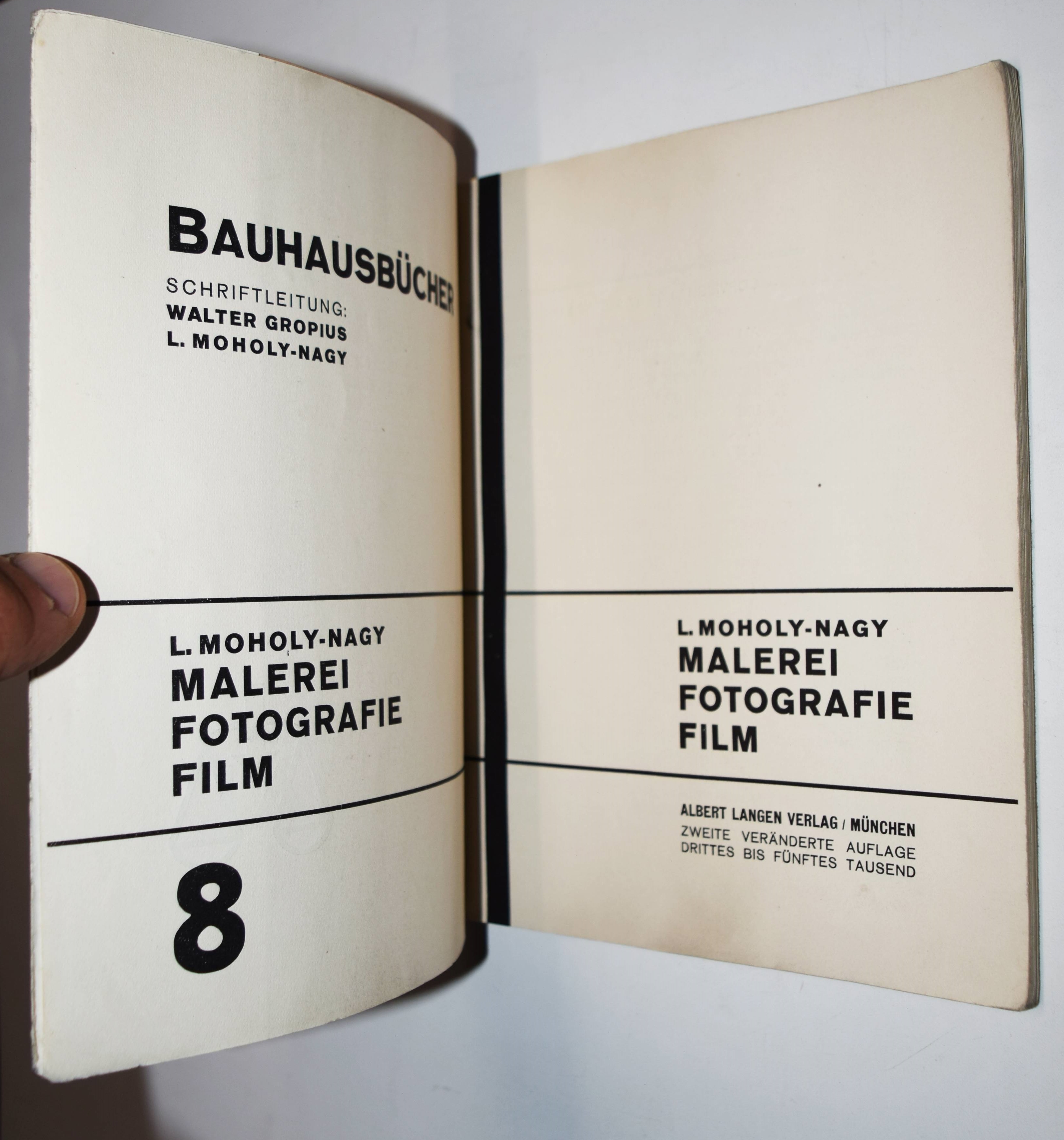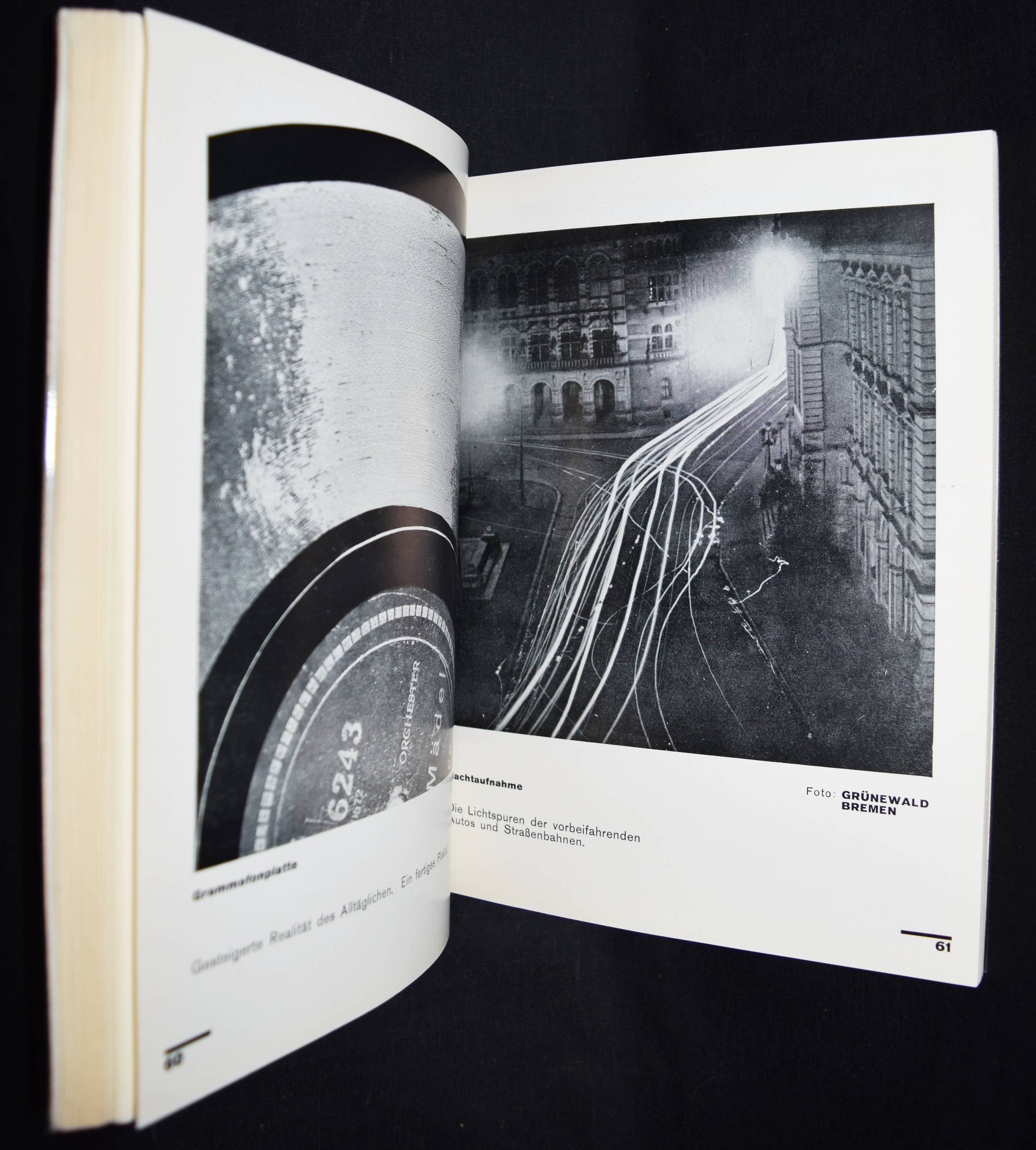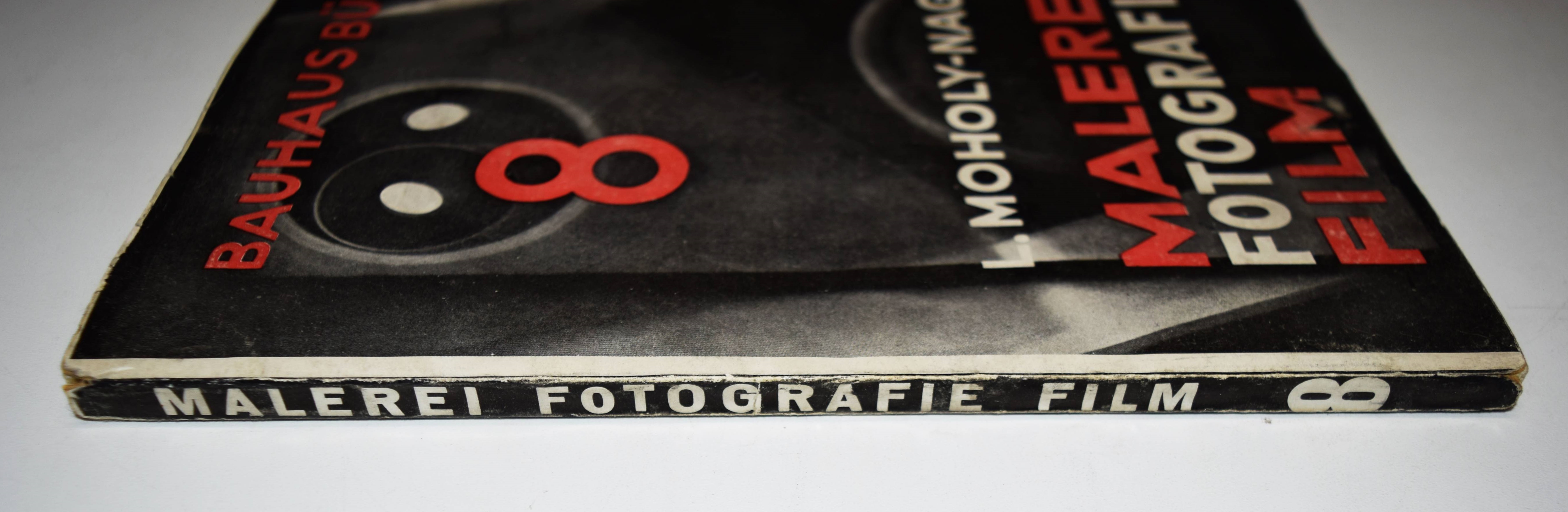 Moholy-Nagy, László. Malerei, Photographie, Film. 2. veränd. Aufl. (3.-5. Tsd.). München, Albert Langen (1927). Gr.-8°. 140 S. mit zahlr. Abbildungen nach Aufnahmen von A. Stieglitz, F. M. Duncan, C. Rudolf, A. Renger-Patzsch, L. Moholy-Nagy, Man Ray H. Höch u. a. Orig.-Kartonumschlag mit illustr. Schutzumschlag in moderner Leinen-Buchkassette mit goldgepr. Lederrückenschild. (Bauhausbücher, Band 8). Auer 121. Bolliger VI, 54. Fleischmann 22. Heidtmann 5011. Heiting/Jaeger I, 164-173 (ausf., mit mehreren Abb.). Koetzle 307 f. Parr/Badger I, 92/93. The Open Book 60 f. Roth, The Book of 101 Books 44 f. Wingler 575. – Bahnbrechendes Werk, in dem Moholy-Nagy erstmals 1925 die Themen Geschichte und Technik der Fotografie und besonders die moderne Bildgestaltung behandelt. Das Bildmaterial, darunter zahlreichen Fotogramme und Fotomontagen, stammt von Moholy-Nagy, Hannah Höch, Albert Renger-Patzsch, P. Citroen, Man Ray und anderen. Mit zahlreichen Anwendungsbeispielen aus Buchillustration, Werbung und Propaganda. – Das Werk ist „Kunstwerk und Pamphlet, Erfahrungsbericht und Vision. Das Buch propagiert die ‚neue visuelle Literatur‘ und ist gleichzeitig ihr erster Versuch … Moholys Entscheidung für die zweite Auflage ist verständlich, hatte er doch Text- und Bildteil gestrafft, neueste Fotos von ihm selbst eingefügt und Überholtes gestrichen. Sein Buch sollte aktuell sein … Der Aufwand für Bauhausbuch 8, dem dicksten und teuersten der 1. Serie, war erheblich … 1927, als es schon die Neuauflage gab, war die erste noch nicht einmal vergriffen“ (U. Brüning in Heiting/Jaeger). – „Moholy’s futurist enthusiasm for the fusion of art and technology and „the new culture of light,“ which would replace hand work (including painting) with eye and mind work (optics: photography and film) is still infectious, and the English translation of Malerei, Photographie, Film has never gone out of print. When Moholy-Nagy emigrated to the United States in 1937, he had tremendous influence on photographic education and practice in this country“ (A. Roth). – „Moholys Fotografie war … kein ‚Fach‘-Medium, sondern ein allgemeines Mittel des reformierten künstlerischen Ausdrucks. … Moholys künstlerisches Credo stellte auch die Fotografie absolut in den Rahmen seiner pädagogischen Absicht des ‚Neuen Sehens‘.“ (A. Haus in Koetzle). – Schutzumschlag am Vorderdeckel im unteren Rand restauriert, sehr schönes Exemplar. – A groundbreaking work in which Moholy-Nagy first dealt with the history and technology of photography and, in particular, modern image design in 1925. The pictorial material, including numerous photograms and photomontages, comes from Moholy-Nagy, Hannah Höch, Albert Renger-Patzsch, P. Citroen, Man Ray and others. With numerous examples of use from book illustration, advertising and propaganda. – The work is „a work of art and a pamphlet, a report of experience and a vision. The book propagates the ‘new visual literature’ and is at the same time its first attempt … Moholy’s decision for the second edition is understandable, as he had streamlined the text and picture sections, added his own latest photos and deleted outdated material. He wanted his book to be up to date … The effort for Bauhaus Book 8, the thickest and most expensive of the first series, was considerable … In 1927, when the new edition was published, the first edition was not even out of print“ (U. Brüning in Heiting/Jaeger). – – “Moholy’s futurist enthusiasm for the fusion of art and technology and ”the new culture of light,“ which would replace hand work (including painting) with eye and mind work (optics: photography and film) is still infectious, and the English translation of Malerei, Photographie, Film has never gone out of print. When Moholy-Nagy emigrated to the United States in 1937, he had tremendous influence on photographic education and practice in this country“ (A. Roth). – „Moholy’s photography was … not a ‘specialized’ medium, but a general means of reformed artistic expression. … Moholy’s artistic credo also placed photography absolutely within the framework of his pedagogical intention of ‘New Vision’.“ (A. Haus in Koetzle). – Dust jacket restored at lower edge of front cover, very nice copy.