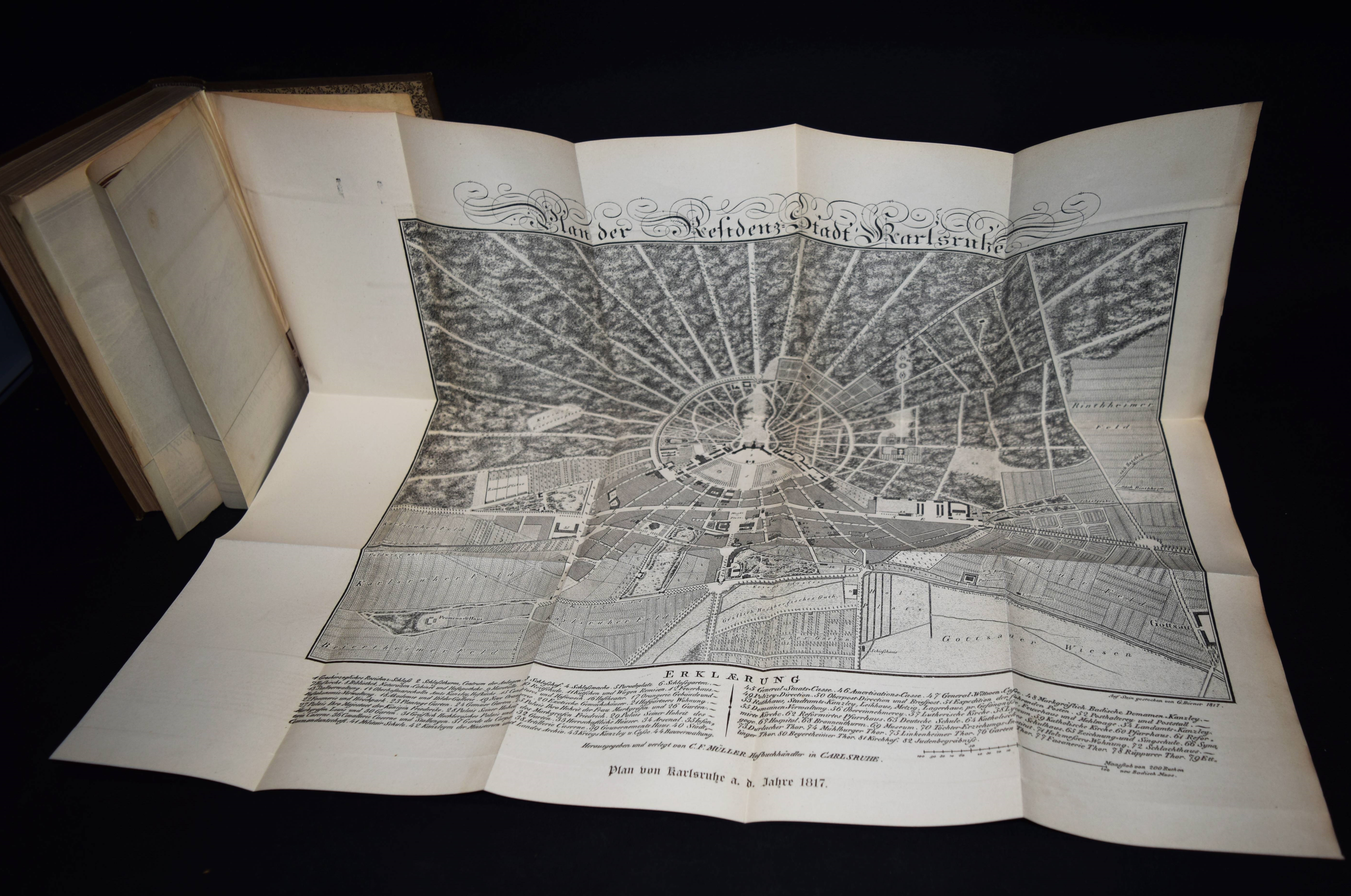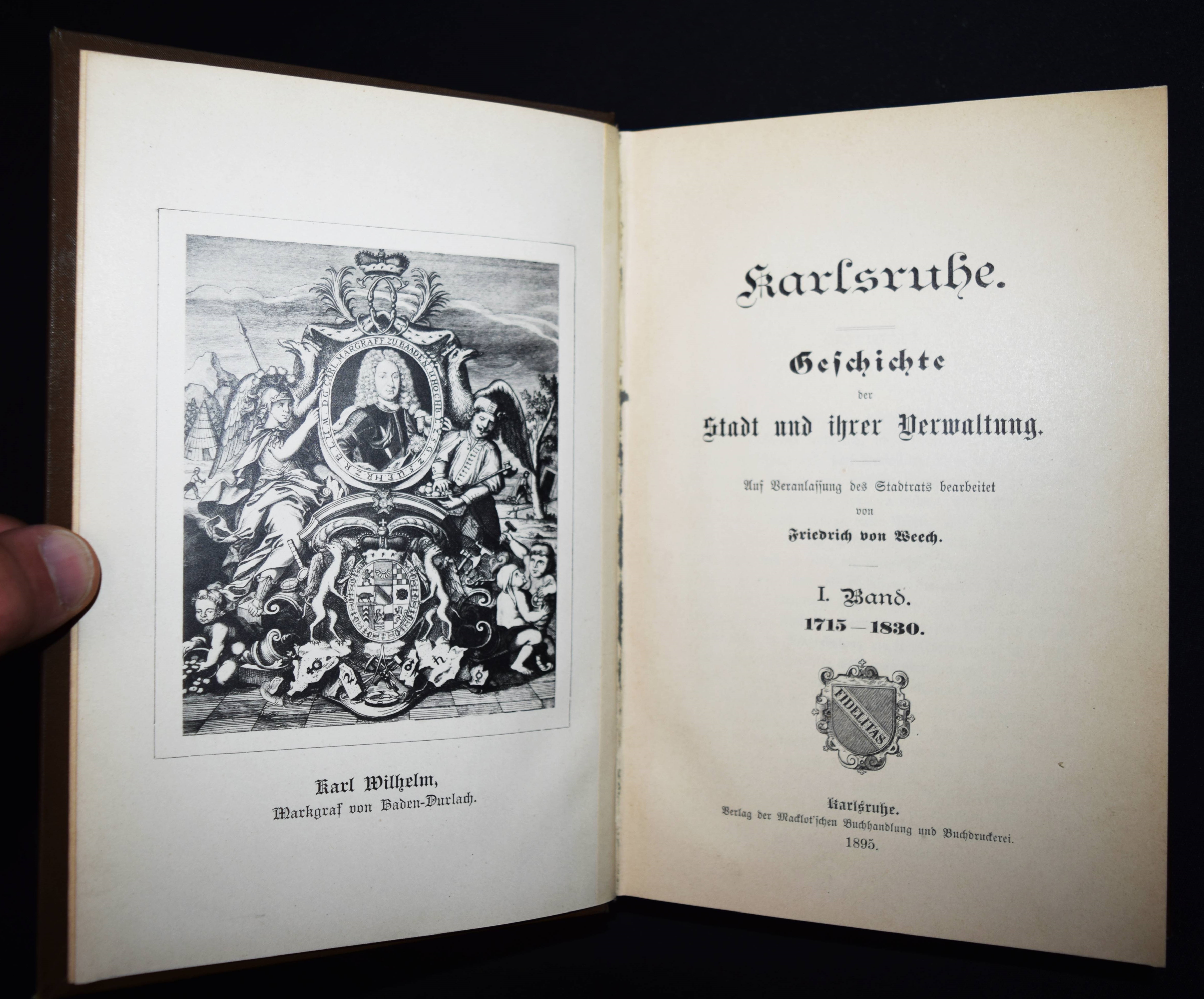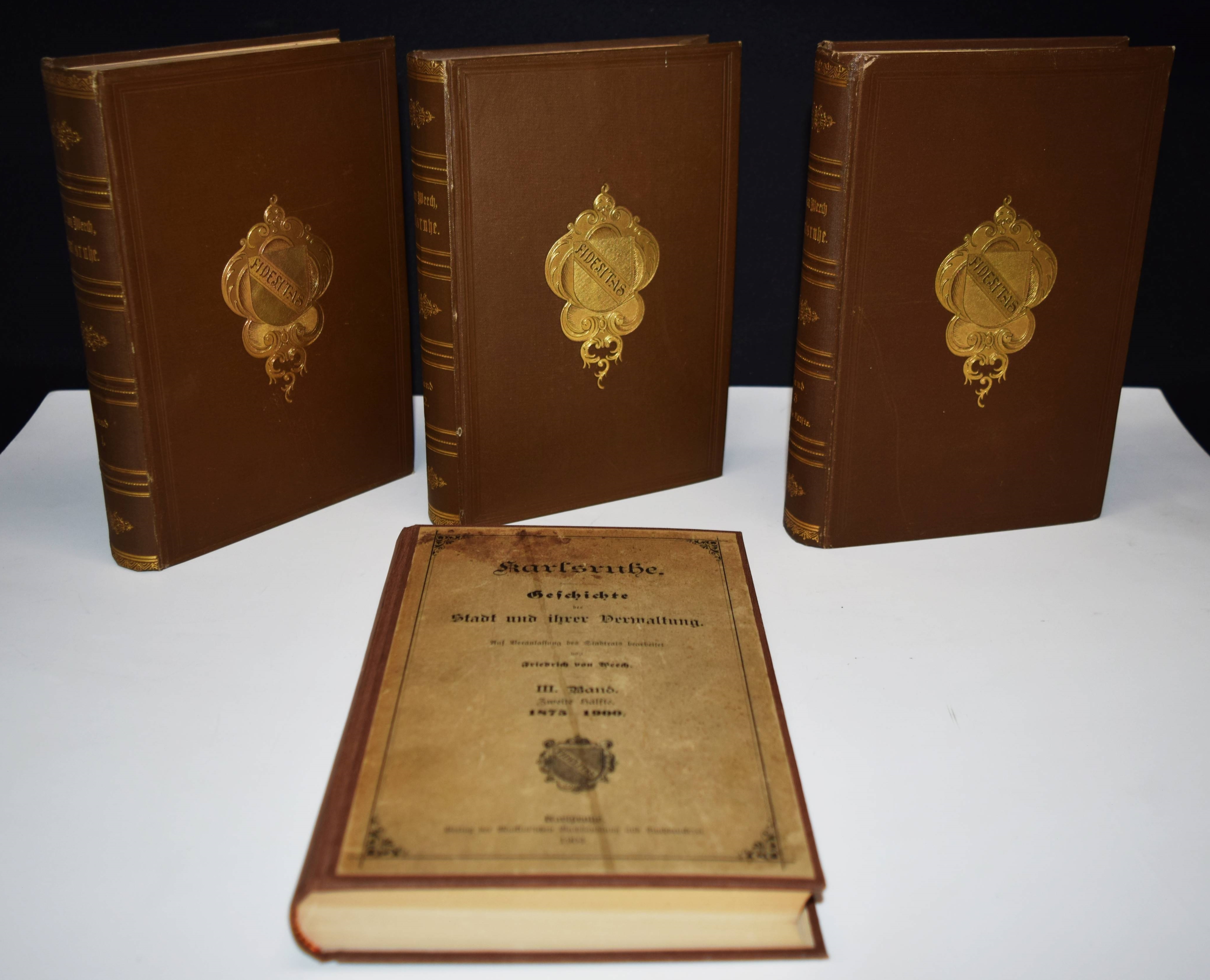 Karlsruhe – Weech, Friedrich v. Karlsruhe. Geschichte der Stadt und ihrer Verwaltung. Auf Veranlassung des Stadtrats bearbeitet. 3 Bände in 4. Karlsruhe, Macklot 1895-1904. Gr.-8°. Mit 2 Frontisp. und zahlr., teils gefalt. Tafeln und Plänen. Orig.-Leinenbände mit goldgepr. Rückentiteln, Rückenvergoldung und goldgepr. Deckelvignetten (Stadtwappen), sowie Leinenband mit mont. Orig.-Umschlag (Band III/2). Lautenschlager 28045. – Erste und einzige Ausgabe der umfassenden Stadtgeschichte von der Gründung bis 1900. – I. 1715-1830. – II. 1830-1852. – III, 1. 1852-1874. – III, 2. 1875-1900. – Gelenke etwas berieben, Vorderdeckel von Band III/2 etwas fleckig, gutes Exemplar des komplett seltenen Werks.