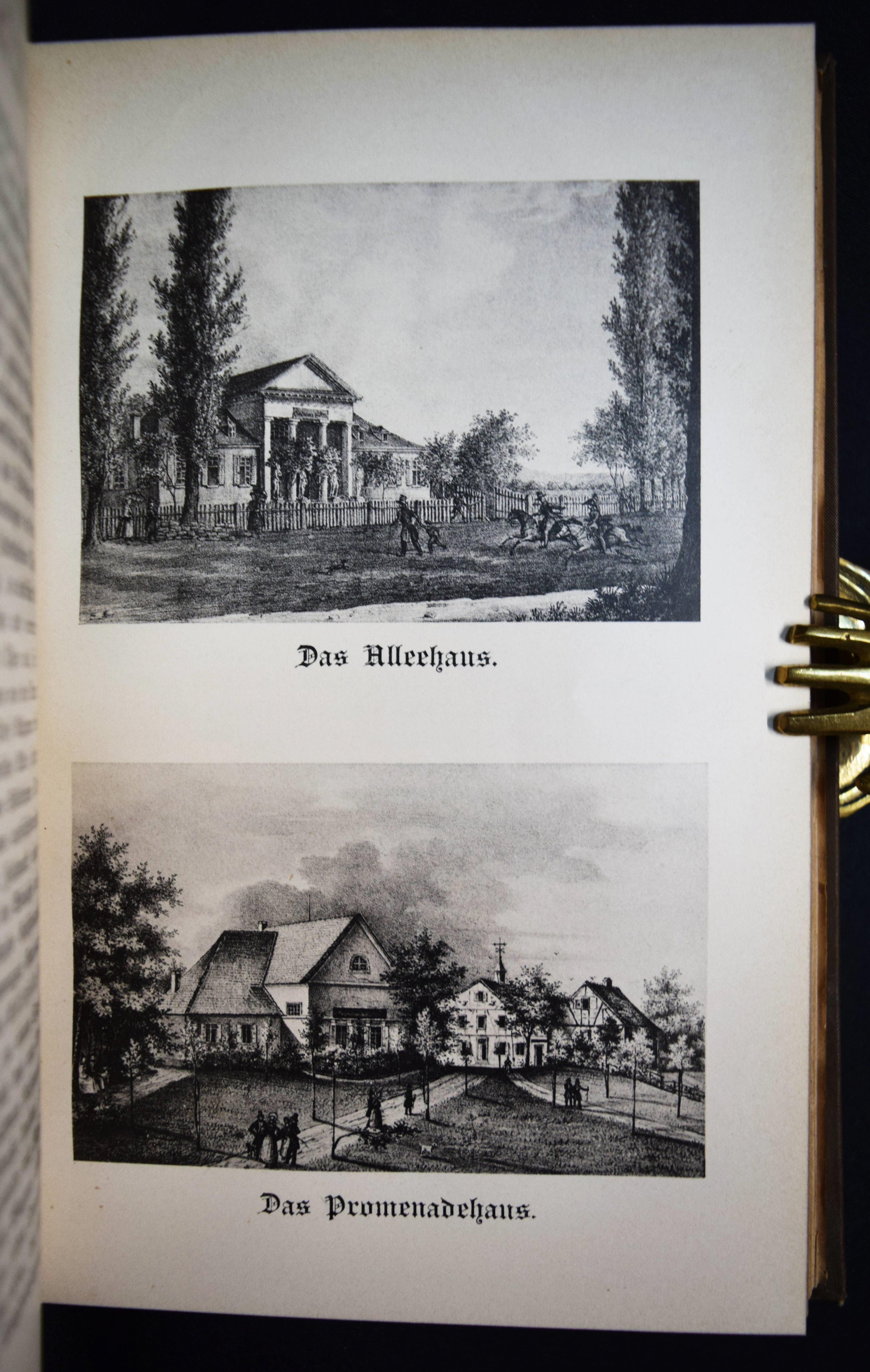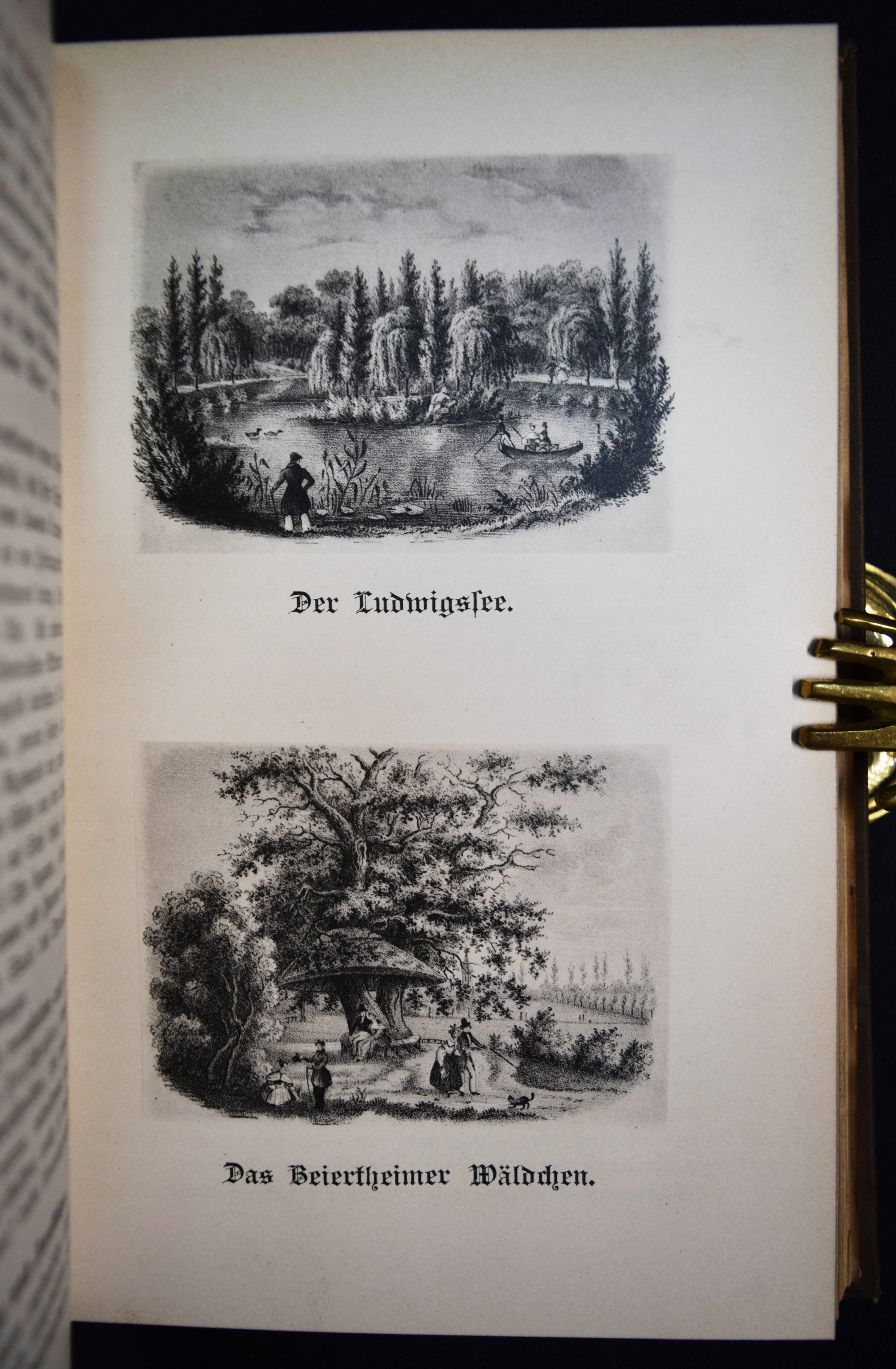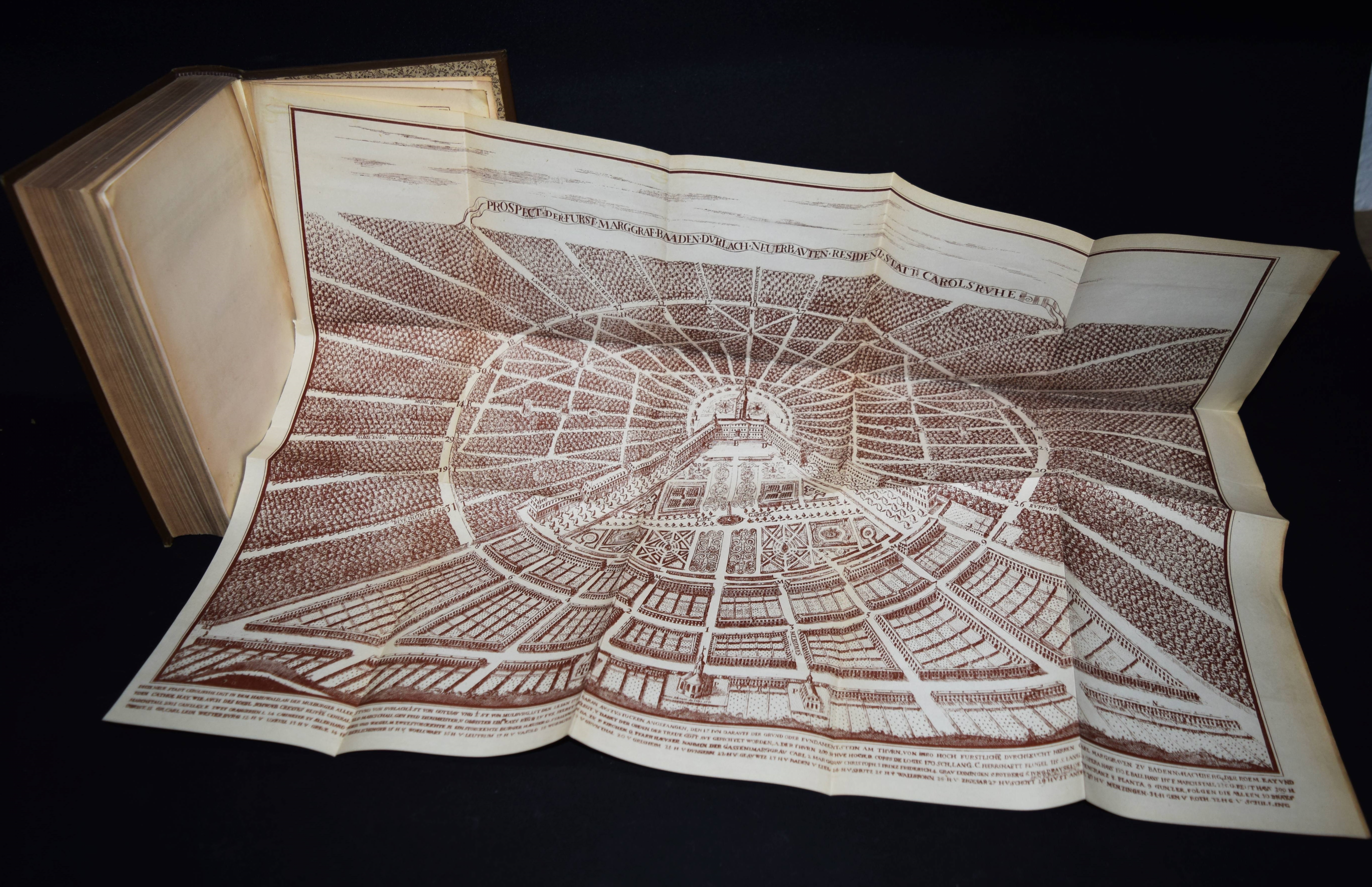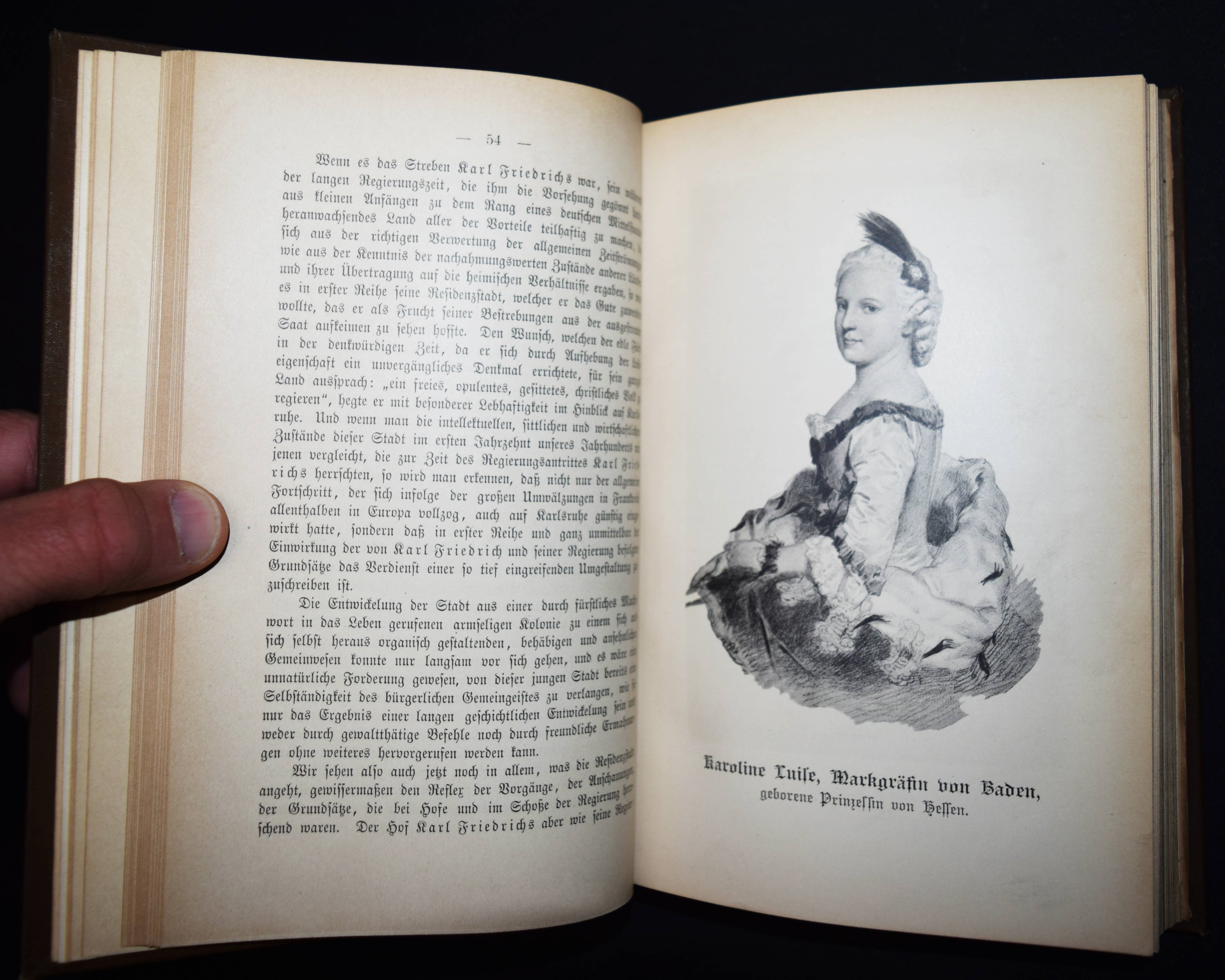 Karlsruhe – Weech, Friedrich v. Karlsruhe. Geschichte der Stadt und ihrer Verwaltung. Auf Veranlassung des Stadtrats bearbeitet. 3 Bände in 4. Karlsruhe, Macklot 1895-1904. Gr.-8°. Mit 2 Frontisp. und zahlr., teils gefalt. Tafeln und Plänen. Orig.-Leinenbände mit goldgepr. Rückentiteln, Rückenvergoldung und goldgepr. Deckelvignetten (Stadtwappen), sowie Leinenband mit mont. Orig.-Umschlag (Band III/2). Lautenschlager 28045. – Erste und einzige Ausgabe der umfassenden Stadtgeschichte von der Gründung bis 1900. – I. 1715-1830. – II. 1830-1852. – III, 1. 1852-1874. – III, 2. 1875-1900. – Gelenke etwas berieben, Vorderdeckel von Band III/2 etwas fleckig, gutes Exemplar des komplett seltenen Werks.