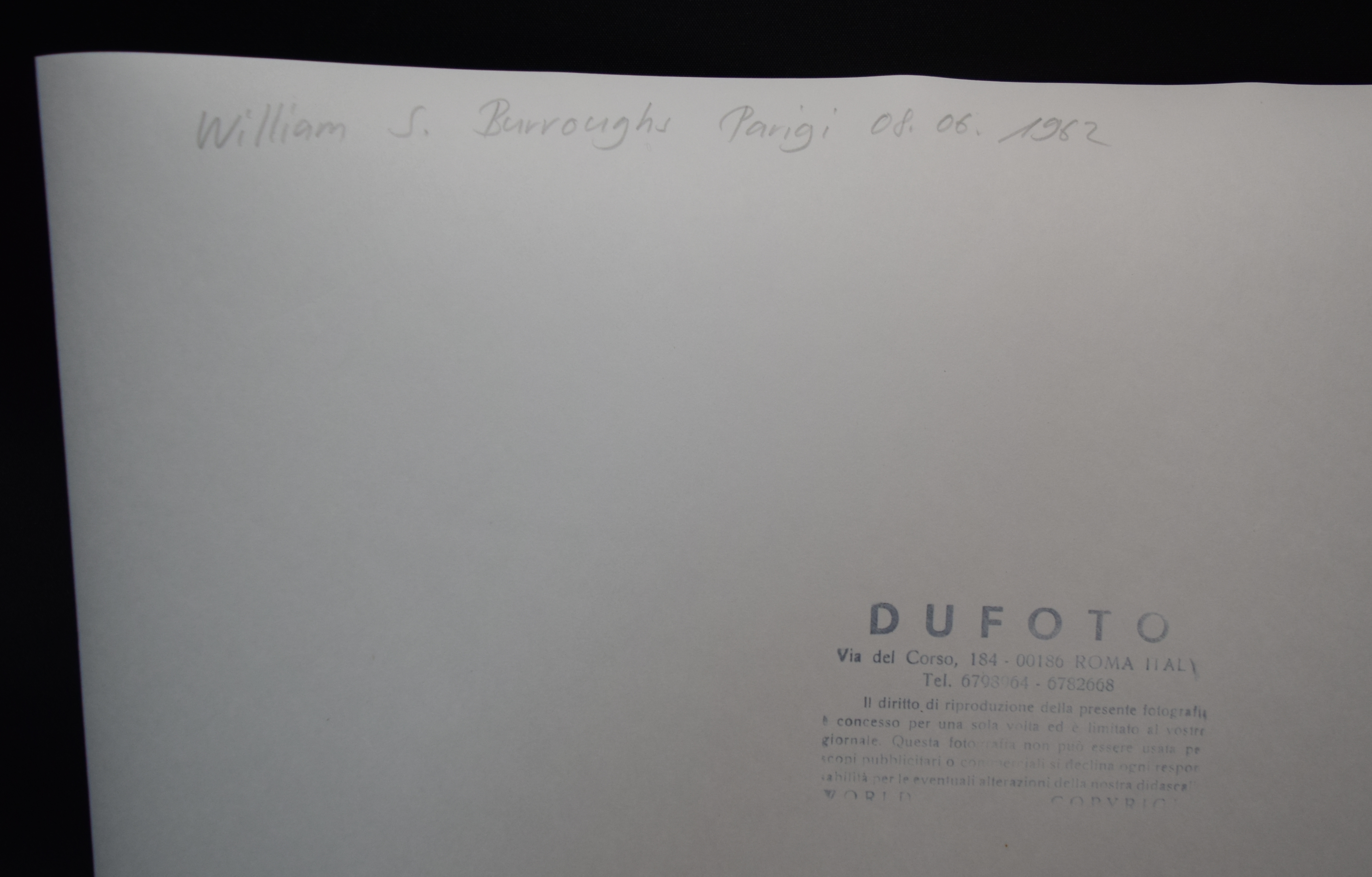 Beat Generation – William S(eward) Burroughs (1914-1997, US-amerikanischer Schriftsteller). Orig.-Portrait-Photographie von Aldo Durazzi (Silbergelatine / Silver gelatine). Paris 8. 6. 1962. Format: 30 x 40 cm. W. S. Burroughs bei den Bouquinisten am Seineufer in Paris im Sommer 1962. – Burroughs wurde mit seinem 1959 erschienenen Roman „Naked Lunch“ bekannt; er lebte damals zeitweise in Paris und Tanger. 1961 und 1962 erschien seine „Nova“-Trilogie. – Der bedeutende ital. Photograph A. Durazzi gründete 1956 in Rom die Agentur Dufoto. Seit den 70er Jahren war er Fotokorrespondet für „Time Life“ und „National Geographic“. – „Der Begriff „Beat Generation“ wurde etwa 1948 von Kerouac eingeführt, der so sein soziales Umfeld im Gespräch mit John Clellon Holmes beschrieb. Holmes veröffentlichte 1952 Go, einen frühen Roman über die Beat Generation, und das Manifest This is the beat generation in der Sunday New York Times. Das Adjektiv beat aus dem Slang der Kriminellen, den Herbert Huncke in die Gruppe um Kerouac, Ginsberg und Burroughs einbrachte, hatte die Bedeutungen „besiegt“, „müde“ und „heruntergekommen“, aber Kerouac prägte zusätzlich die Bedeutungen „euphorisch“ (upbeat), „seligmachend“ (beatific) und in Bezug auf Musik, vor allem Bebop, auch being on the beat („im Rhythmus sein“)“ (Wikipedia). – Rückseitig mit Stempel einer italienischen Foto-Agentur, wohl späterer Abzug. – W. S. Burroughs at the bouquinistes on the banks of the Seine in Paris in the summer of 1962. – Burroughs became famous with his novel “Naked Lunch”, published in 1959; he was living in Paris and Tangier at the time. His “Nova” trilogy was published in 1961 and 1962. – The important ital. Photographer A. Durazzi founded the Dufoto agency in Rome in 1956. From the 1970s he was a photo correspondent for “Time Life” and “National Geographic”. – “The term ”Beat Generation“ was introduced around 1948 by Kerouac, who used it to describe his social environment in a conversation with John Clellon Holmes. Holmes published Go, an early novel about the Beat Generation, in 1952 and the manifesto This is the beat generation in the Sunday New York Times. The adjective beat from the slang of the criminals, which Herbert Huncke brought into the group around Kerouac, Ginsberg and Burroughs, had the meanings “defeated”, “tired” and “run-down”, but Kerouac also coined the meanings “euphoric” (upbeat), ‘beatific’ (beatific) and, in relation to music, especially bebop, also being on the beat (“being in the rhythm”)“ (Wikipedia). – Stamp of an Italian photo agency on the reverse, probably a later print.