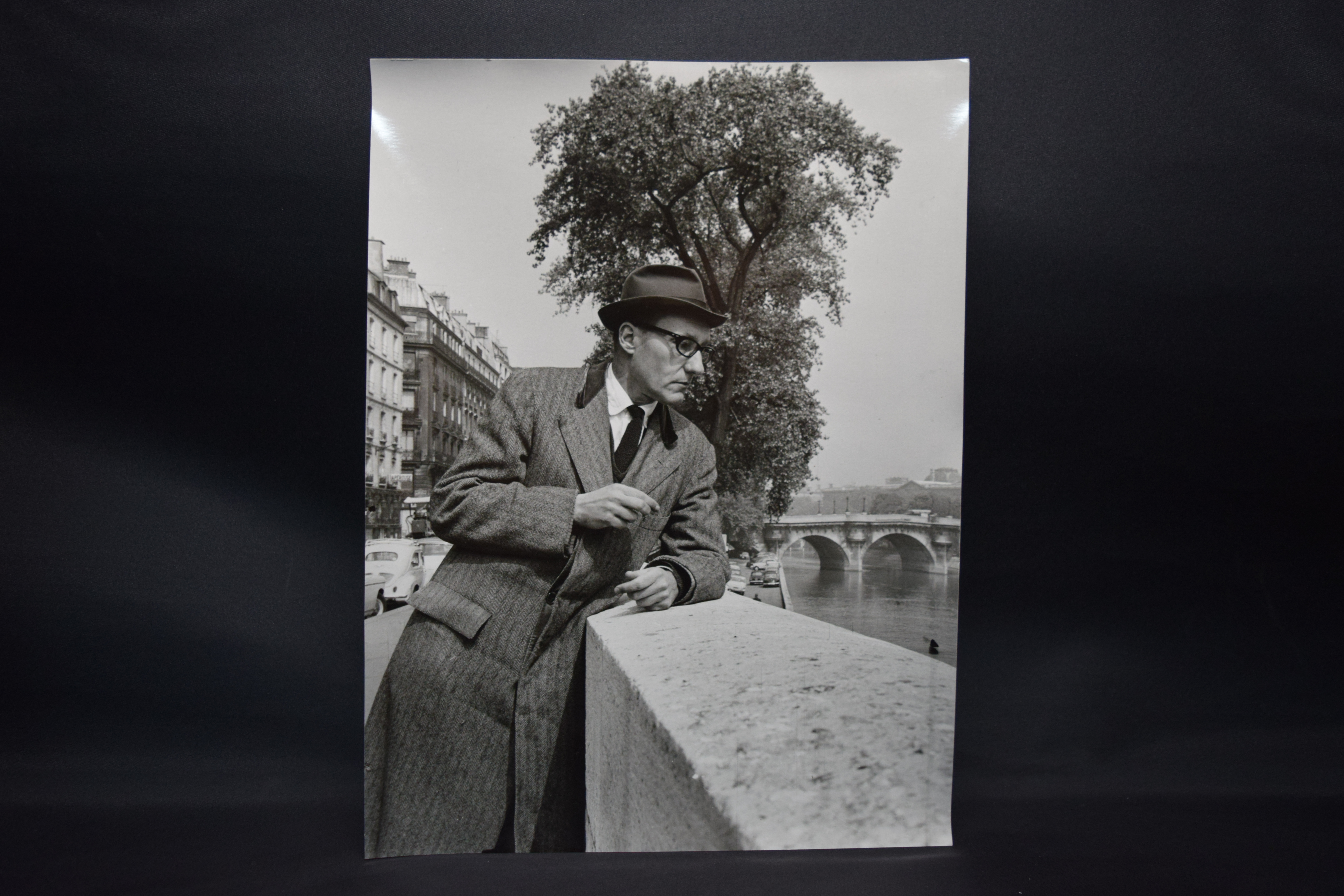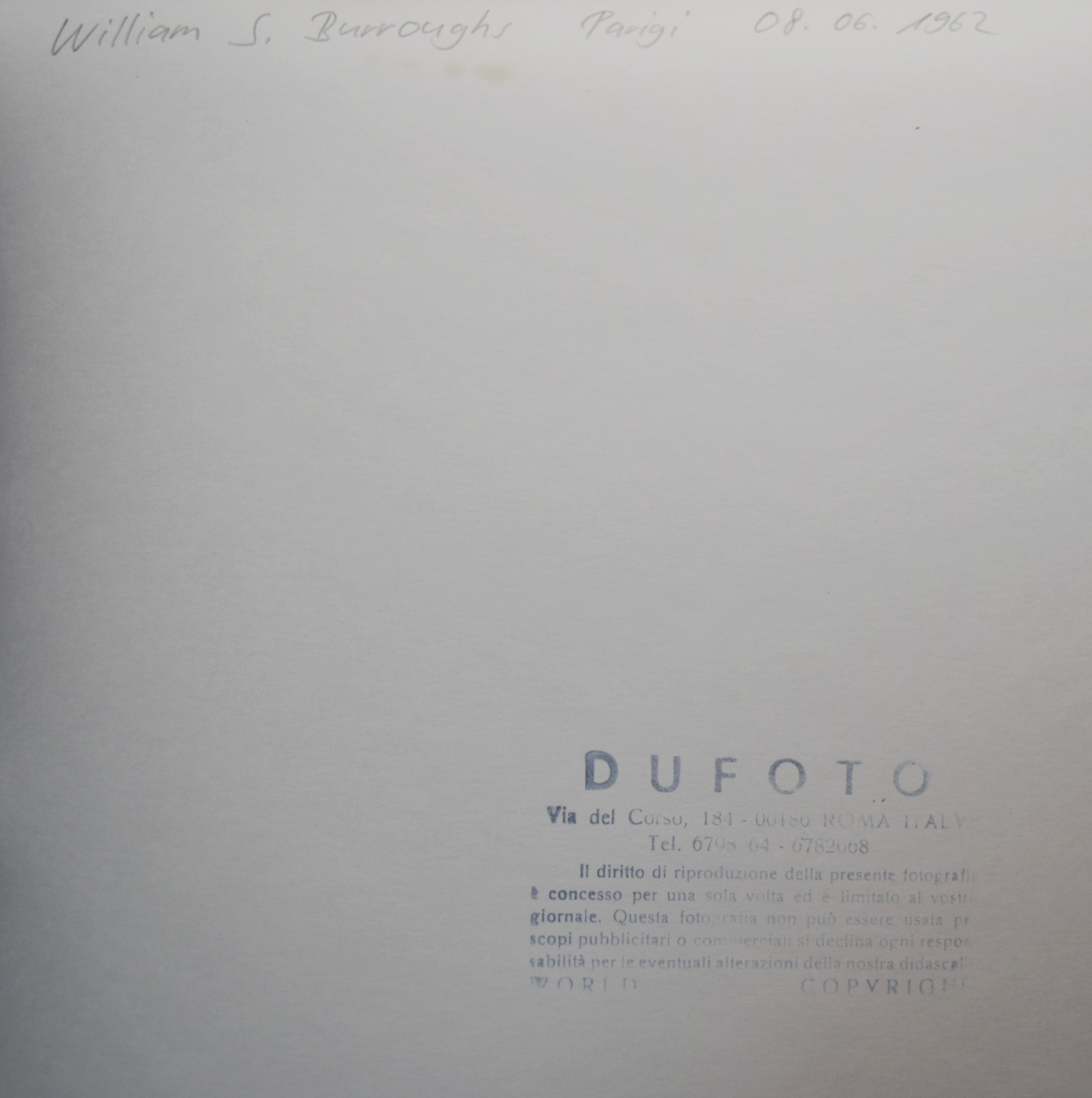 Beat Generation – William S(eward) Burroughs (1914-1997, US-amerikanischer Schriftsteller). Orig.-Portrait-Photographie von Aldo Durazzi (Silbergelatine / Silver gelatine). Paris 8. 6. 1962. Format: 40 x 30 cm. W. S. Burroughs am Seineufer in Paris im Sommer 1962. – Burroughs wurde mit seinem 1959 erschienenen Roman „Naked Lunch“ bekannt; er lebte damals zeitweise in Paris und Tanger. 1961 und 1962 erschien seine „Nova“-Trilogie. – Der bedeutende ital. Photograph A. Durazzi gründete 1956 in Rom die Agentur Dufoto. Seit den 70er Jahren war er Fotokorrespondet für „Time Life“ und „National Geographic“. – „Der Begriff „Beat Generation“ wurde etwa 1948 von Kerouac eingeführt, der so sein soziales Umfeld im Gespräch mit John Clellon Holmes beschrieb. Holmes veröffentlichte 1952 Go, einen frühen Roman über die Beat Generation, und das Manifest This is the beat generation in der Sunday New York Times. Das Adjektiv beat aus dem Slang der Kriminellen, den Herbert Huncke in die Gruppe um Kerouac, Ginsberg und Burroughs einbrachte, hatte die Bedeutungen „besiegt“, „müde“ und „heruntergekommen“, aber Kerouac prägte zusätzlich die Bedeutungen „euphorisch“ (upbeat), „seligmachend“ (beatific) und in Bezug auf Musik, vor allem Bebop, auch being on the beat („im Rhythmus sein“)“ (Wikipedia). – Rückseitig mit Stempel einer italienischen Foto-Agentur, wohl späterer Abzug. – W. S. Burroughs on the banks of the Seine in Paris in the summer of 1962. – Burroughs became famous with his novel “Naked Lunch”, published in 1959; he was living in Paris and Tangier at the time. His “Nova” trilogy was published in 1961 and 1962. – The important ital. Photographer A. Durazzi founded the Dufoto agency in Rome in 1956. From the 1970s he was a photo correspondent for “Time Life” and “National Geographic”. – “The term ”Beat Generation“ was introduced around 1948 by Kerouac, who used it to describe his social environment in a conversation with John Clellon Holmes. Holmes published Go, an early novel about the Beat Generation, in 1952 and the manifesto This is the beat generation in the Sunday New York Times. The adjective beat from the slang of the criminals, which Herbert Huncke brought into the group around Kerouac, Ginsberg and Burroughs, had the meanings “defeated”, “tired” and “run-down”, but Kerouac also coined the meanings “euphoric” (upbeat), ‘beatific’ (beatific) and, in relation to music, especially bebop, also being on the beat (“being in the rhythm”)“ (Wikipedia). – Stamp of an Italian photo agency on the reverse, probably a later print.
