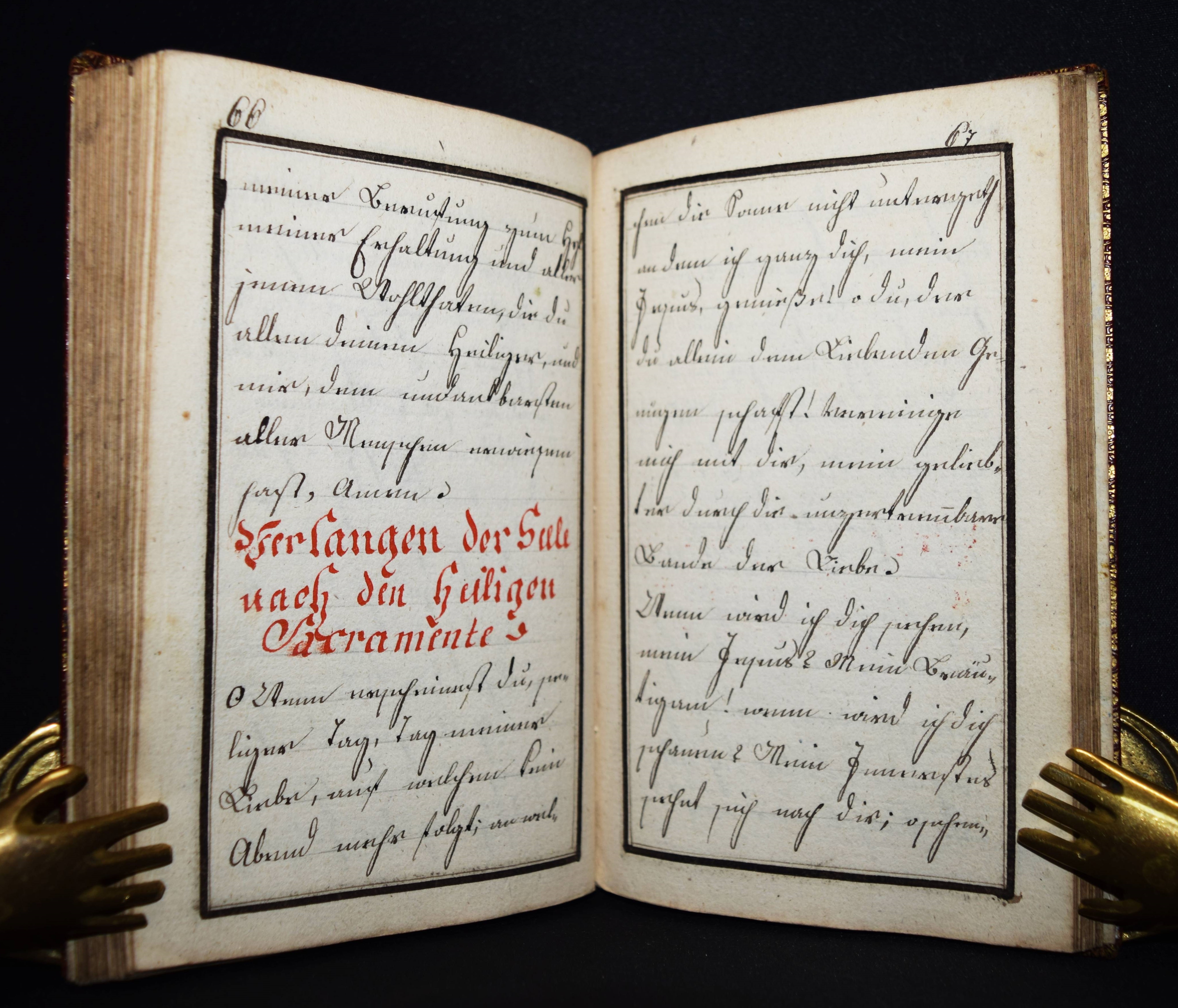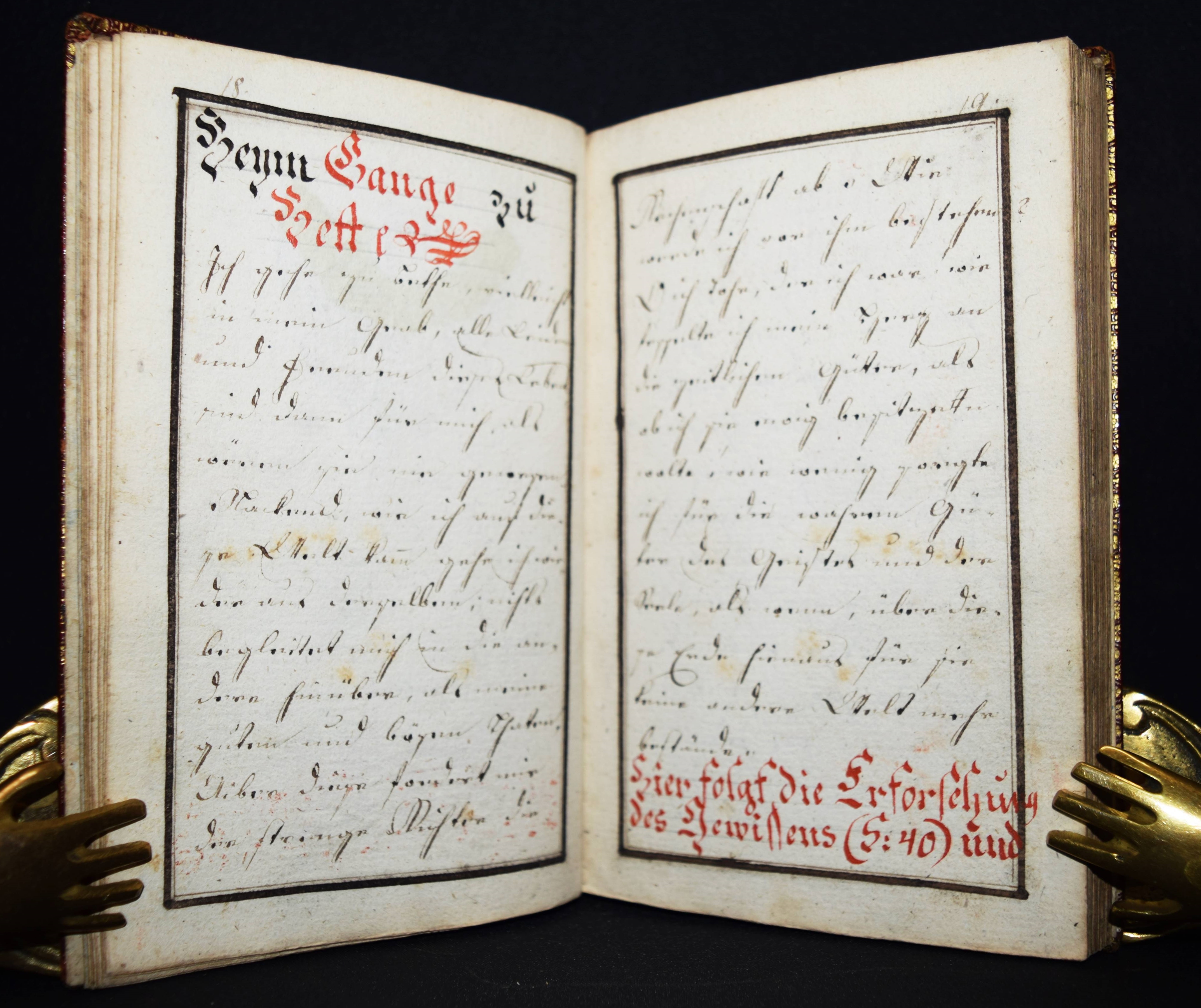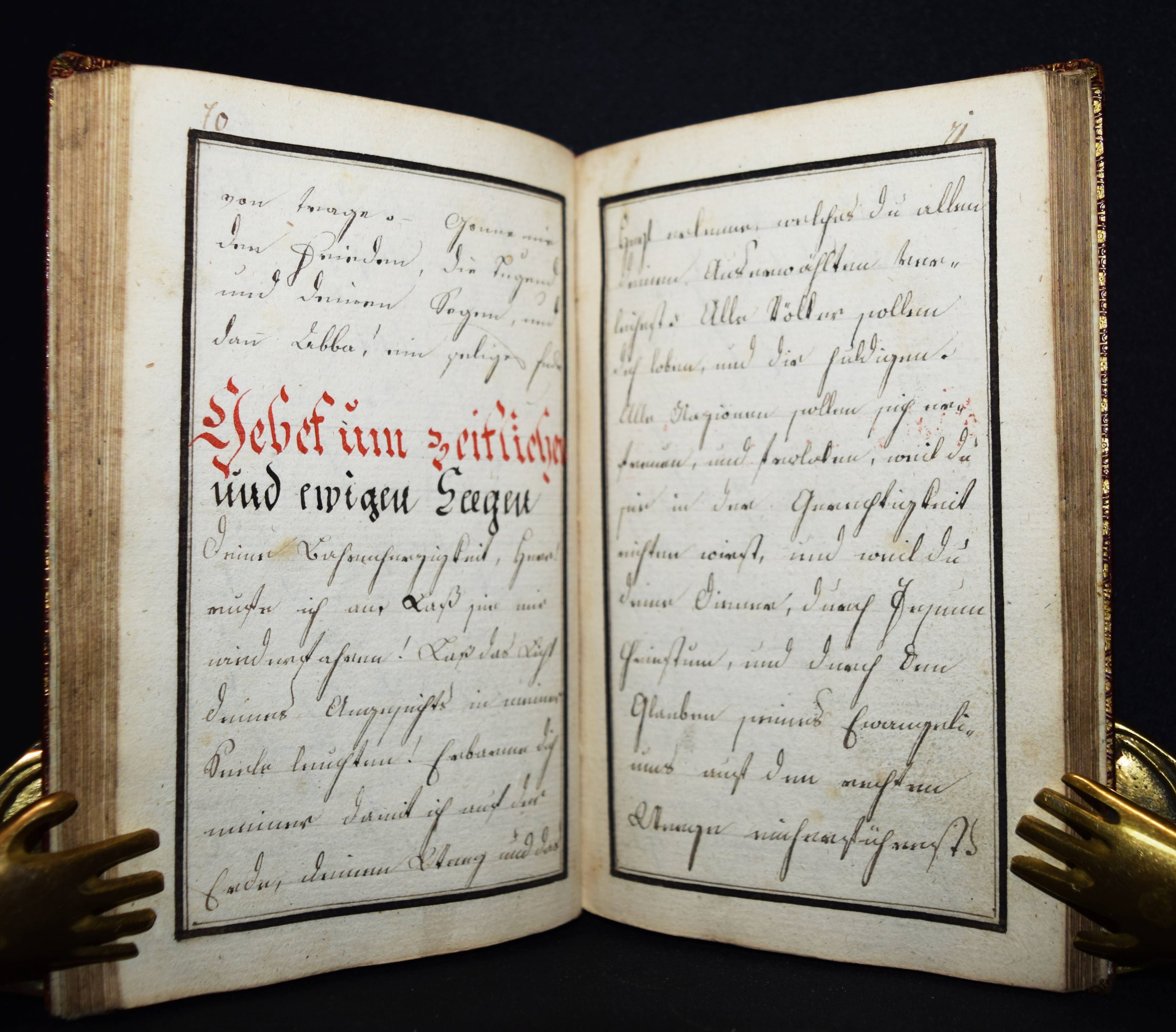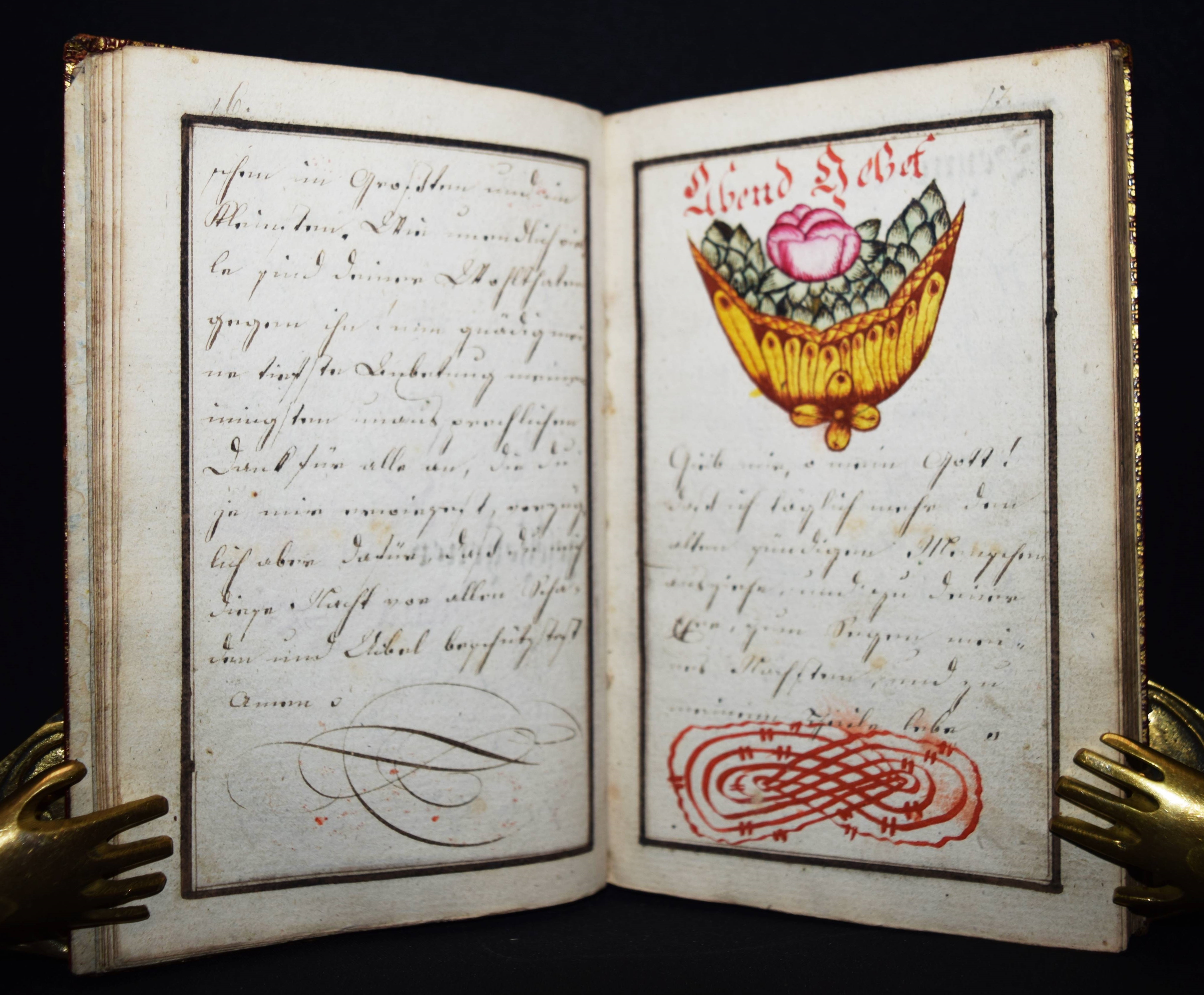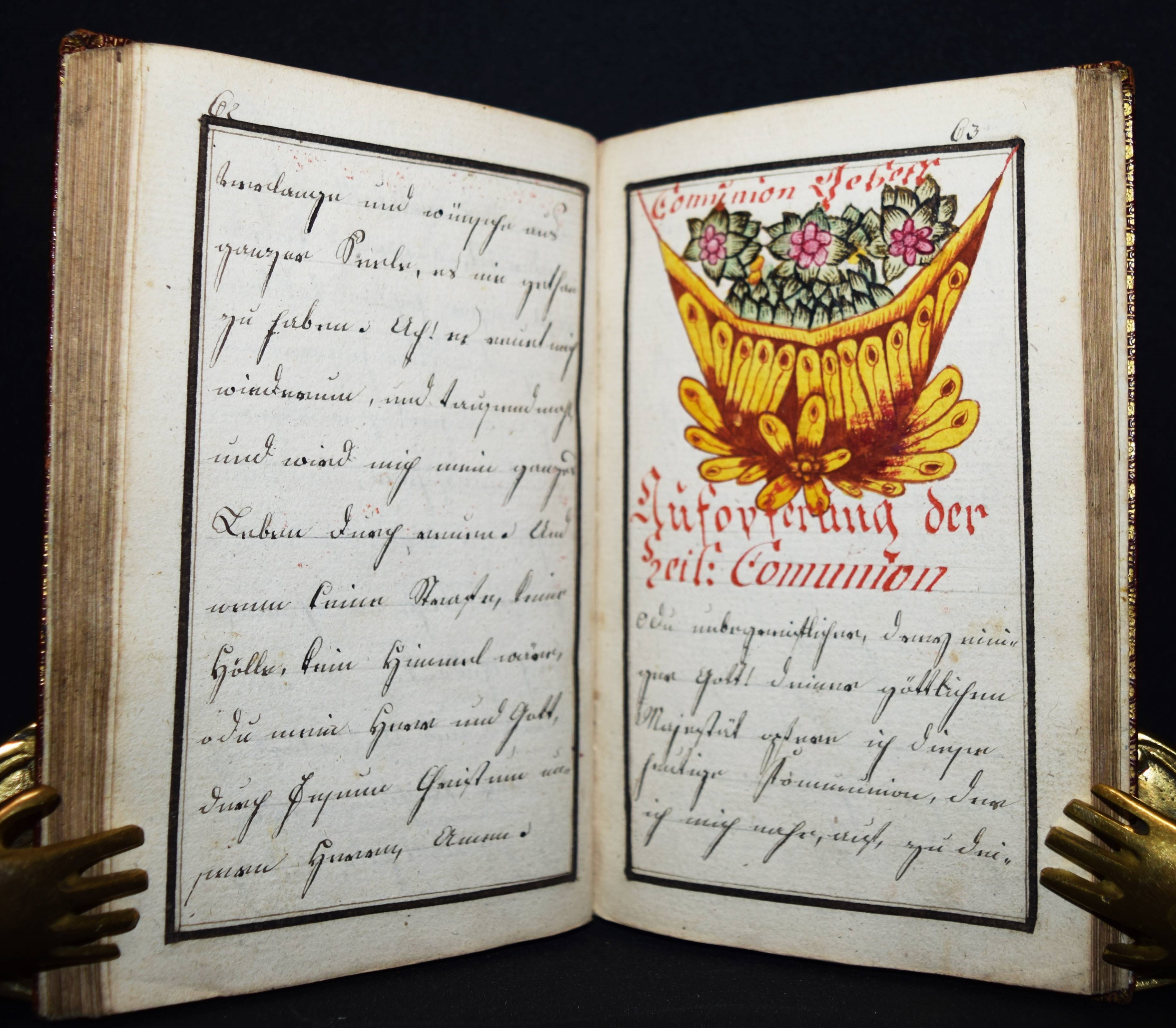 Himlischer (!) Seelenschatz. Hier enthalten sind Morgen-, Abend-, Meß, Beicht und Cominion Gebether, wie auch die Litaney z. allen Heiligen, … – Deutsche Handschrift auf Papier. O. O. (Süddeutschland) um 1790. Kl.-8° (17 x 10,5 cm.). 130 S. mit Überschriften in Schwarz und Rot, farbig illustr. Titel und 10 (3 ganzs.) Aquarellen mit floralen Motiven. Weinroter Maroquin-Lederband mit reicher Deckel- und Innenkantenvergoldung und Goldschnitt. Prachtvoll gebundenes Gebetbuch des Spät-Barock mit 40 Gebeten in sauberer Kurrentschrift. – Rücken unauffällig erneuert, stellenweise etwas fingerfleckig, sonst sehr gut erhalten.