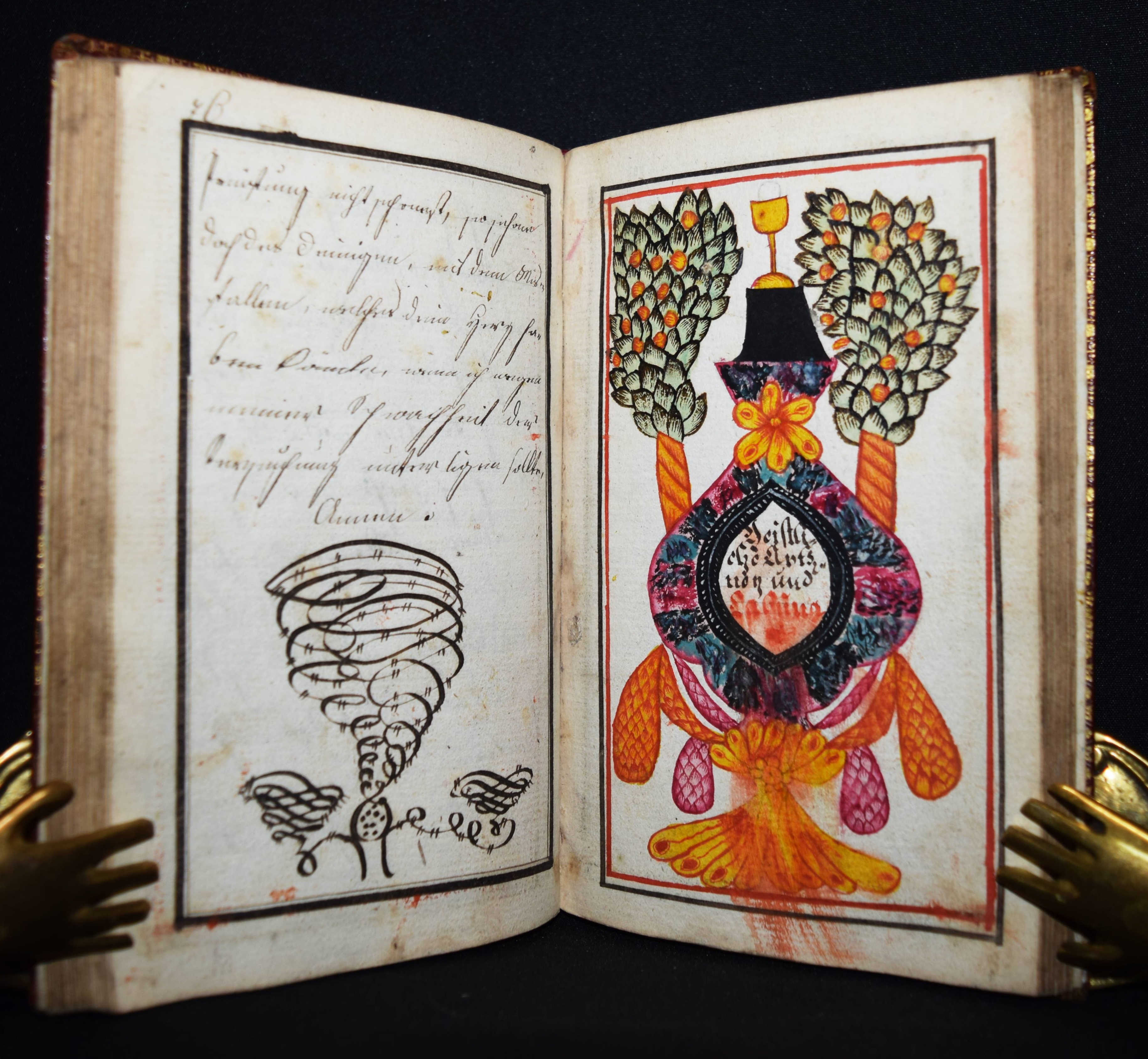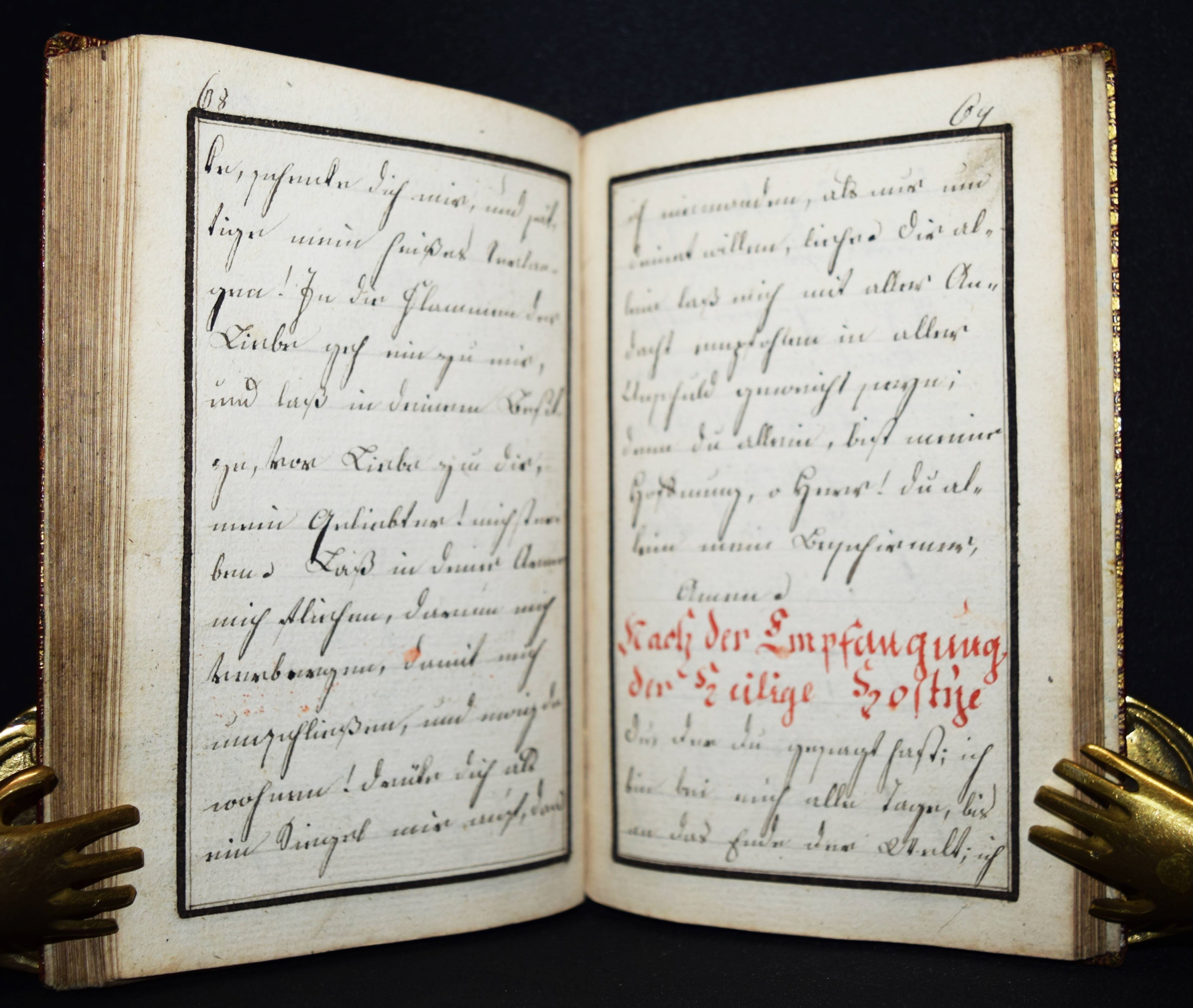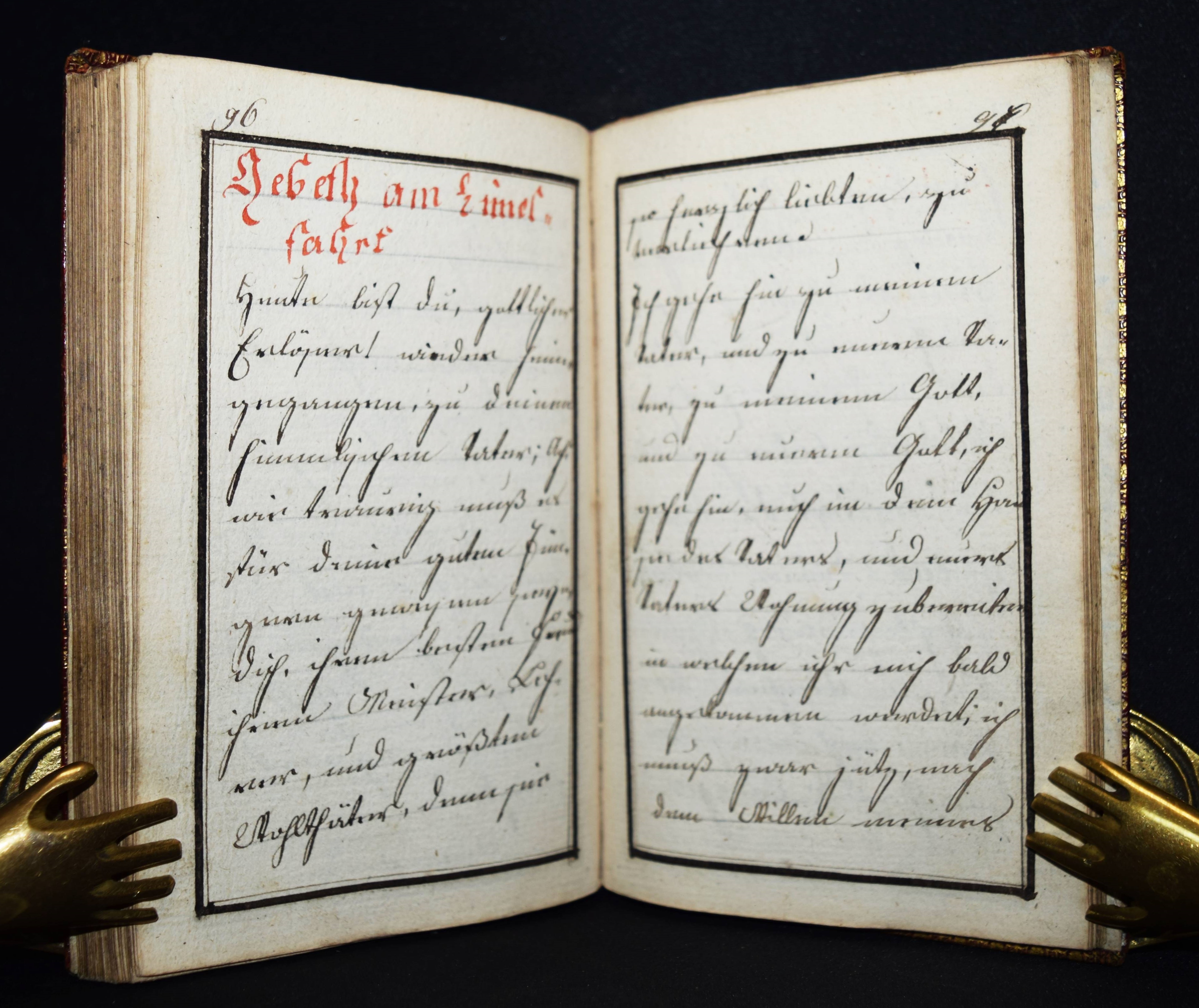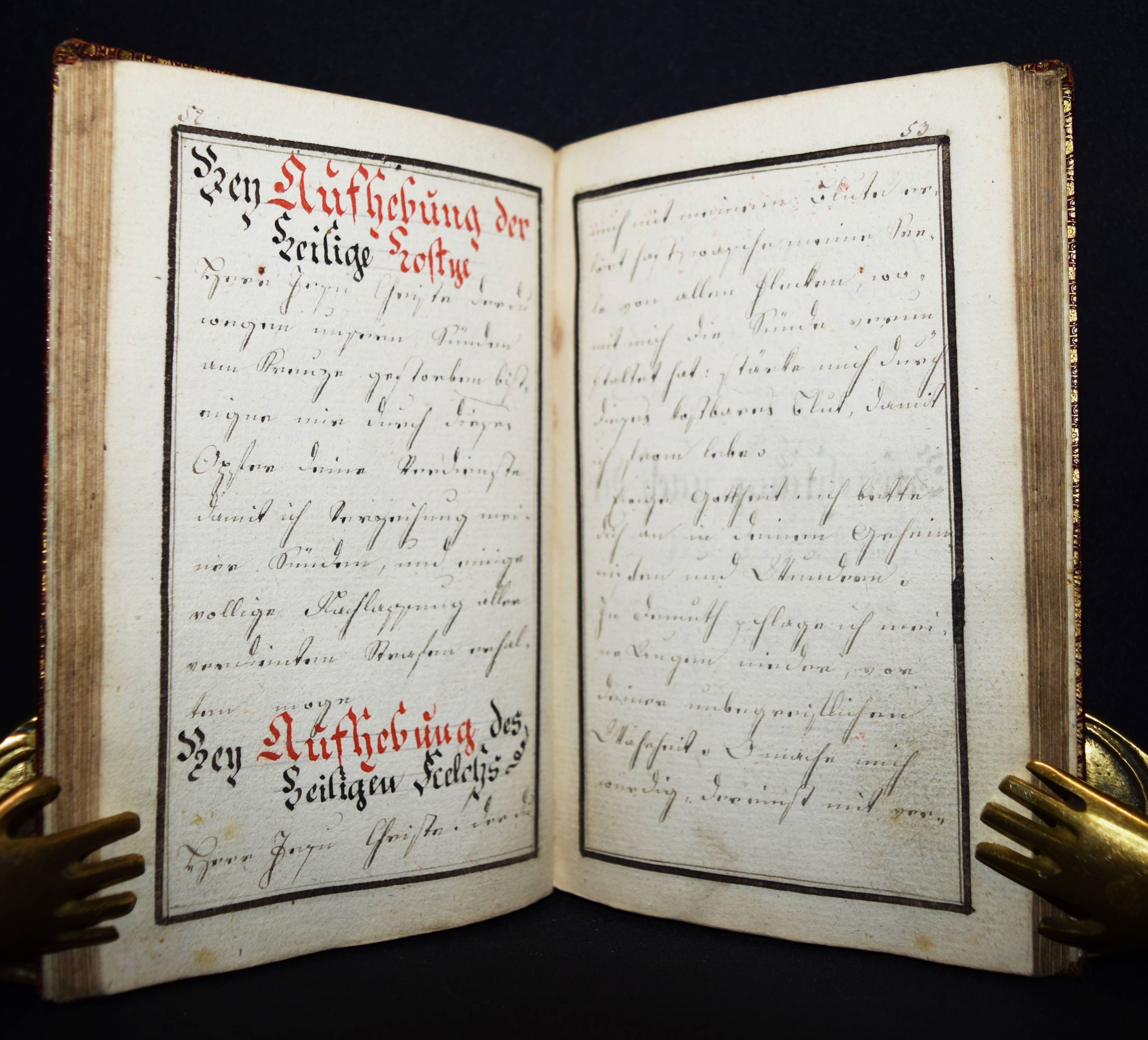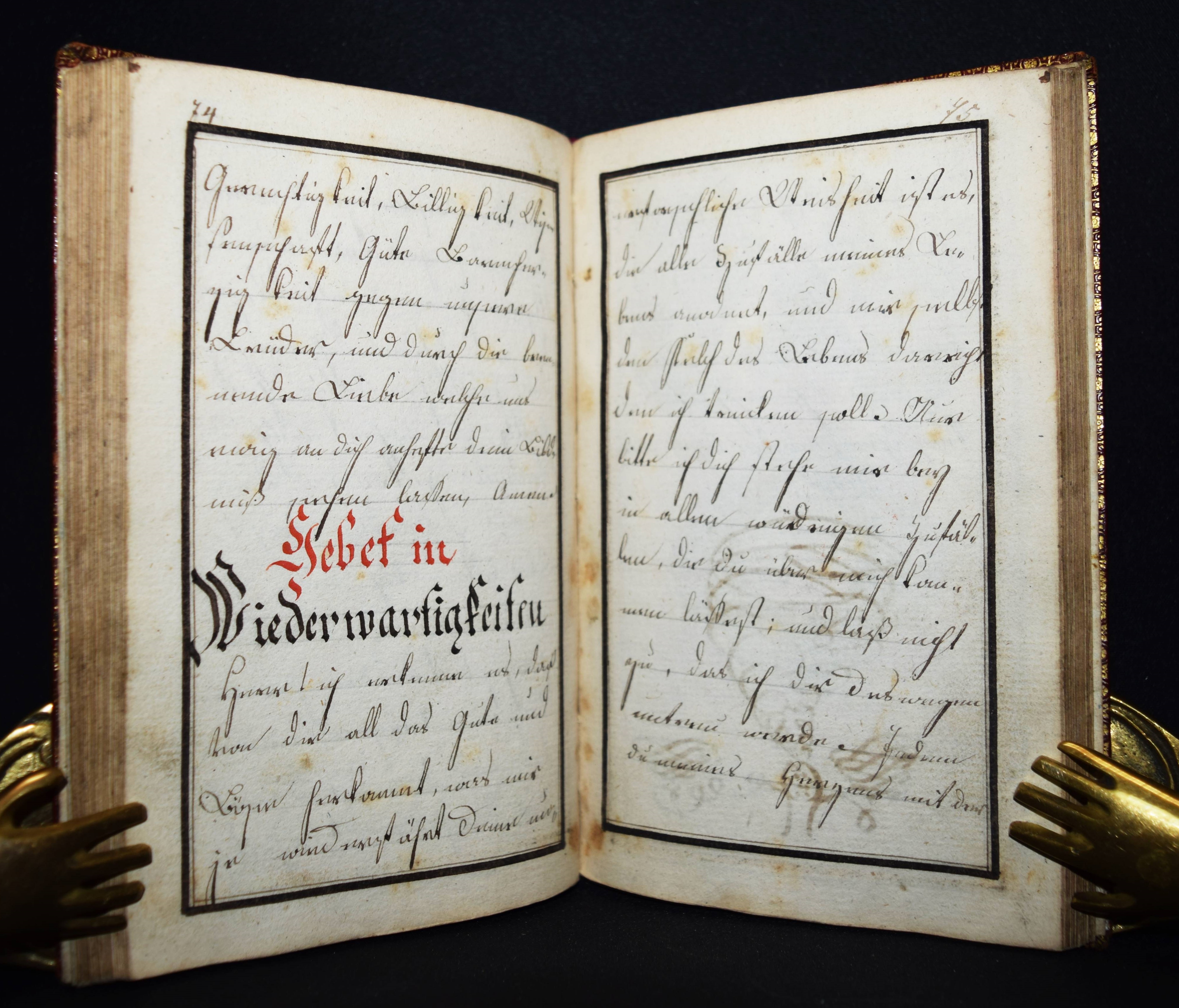 Himlischer (!) Seelenschatz. Hier enthalten sind Morgen-, Abend-, Meß, Beicht und Cominion Gebether, wie auch die Litaney z. allen Heiligen, … – Deutsche Handschrift auf Papier. O. O. (Süddeutschland) um 1790. Kl.-8° (17 x 10,5 cm.). 130 S. mit Überschriften in Schwarz und Rot, farbig illustr. Titel und 10 (3 ganzs.) Aquarellen mit floralen Motiven. Weinroter Maroquin-Lederband mit reicher Deckel- und Innenkantenvergoldung und Goldschnitt. Prachtvoll gebundenes Gebetbuch des Spät-Barock mit 40 Gebeten in sauberer Kurrentschrift. – Rücken unauffällig erneuert, stellenweise etwas fingerfleckig, sonst sehr gut erhalten.