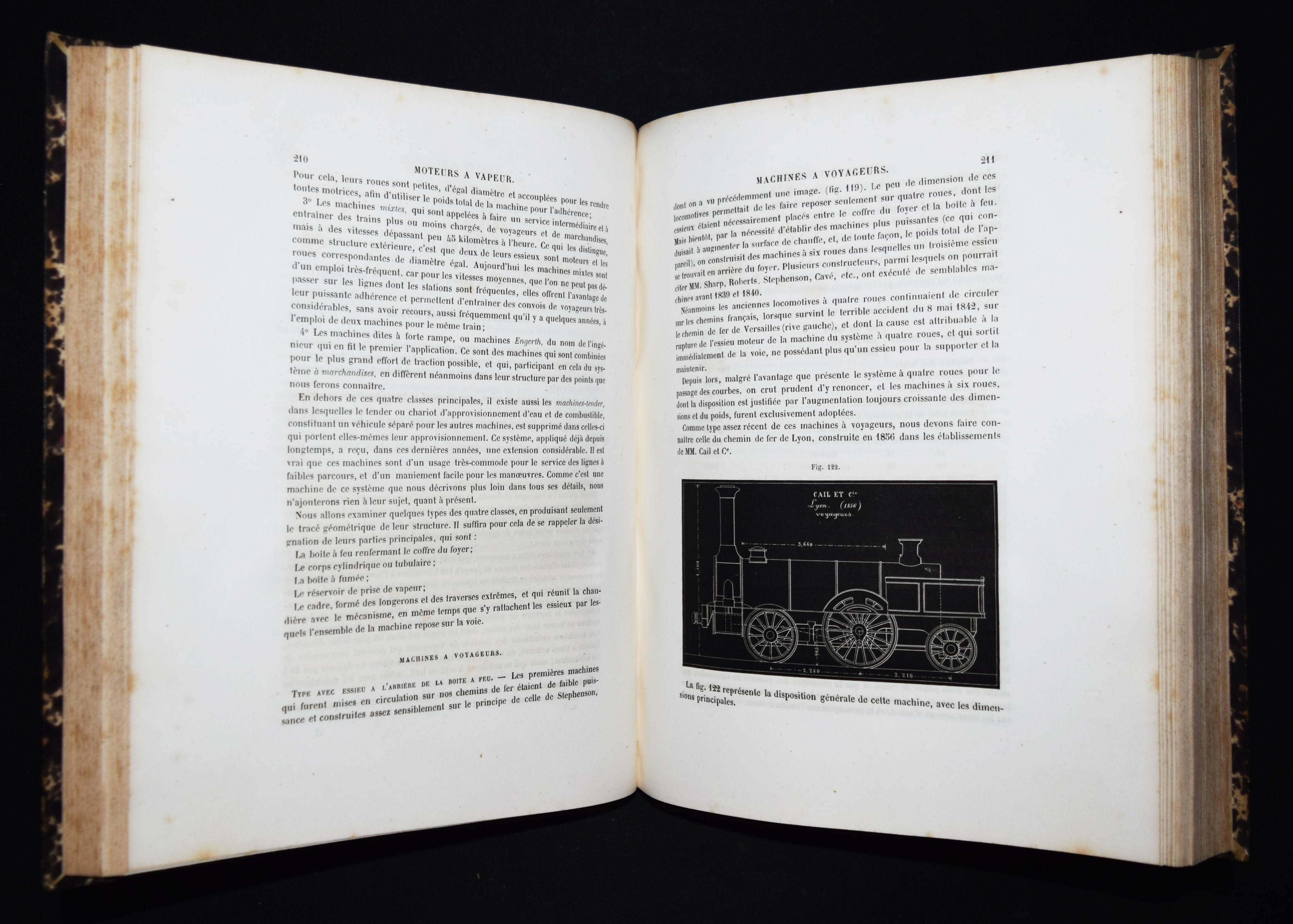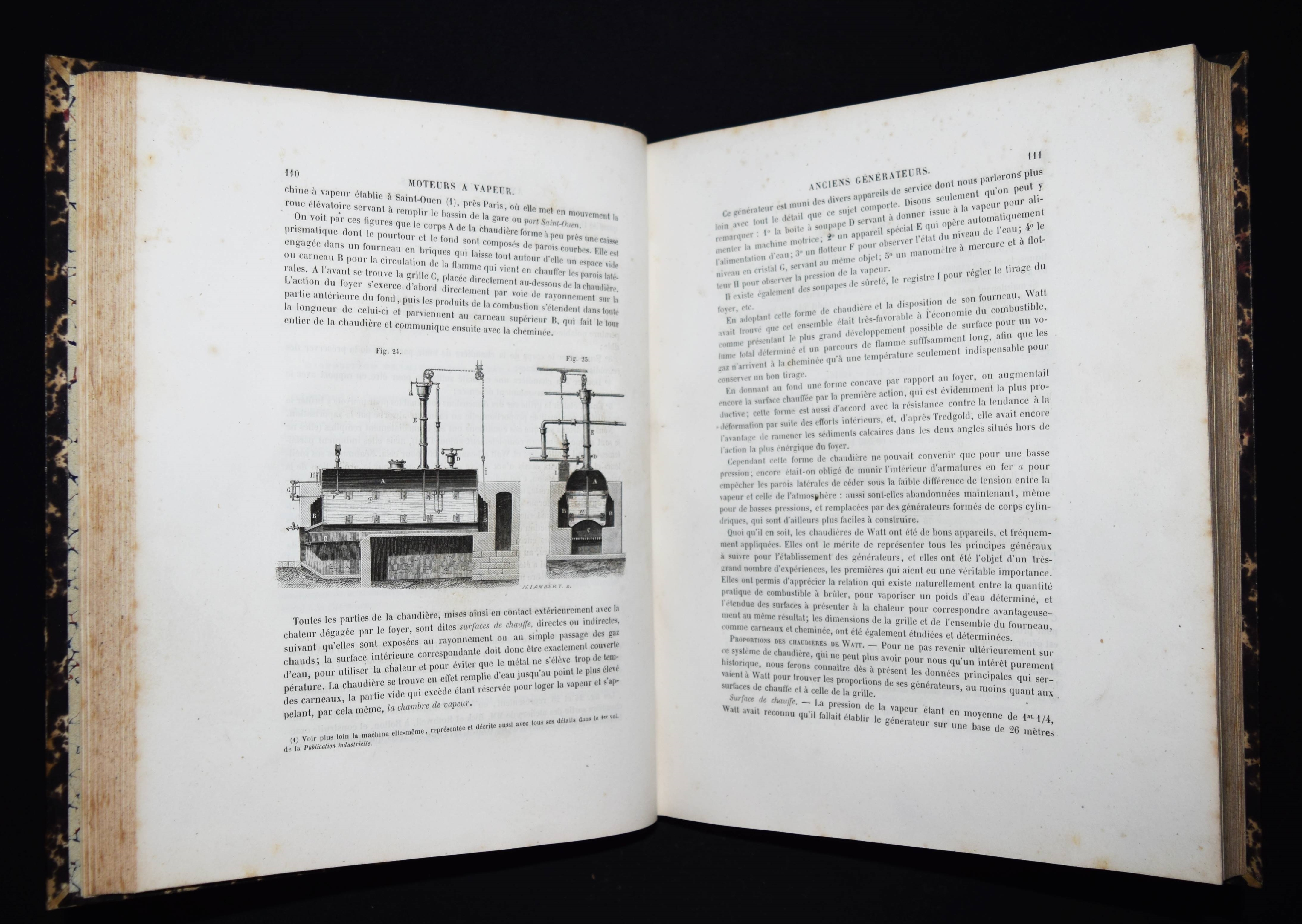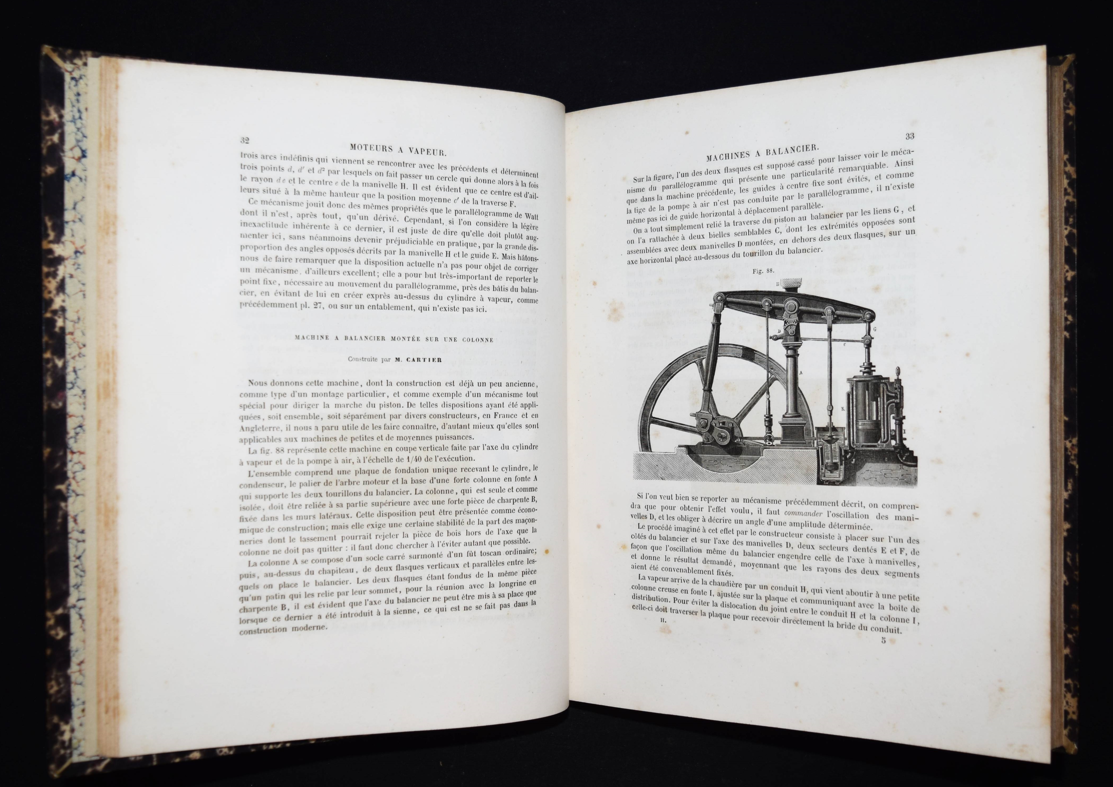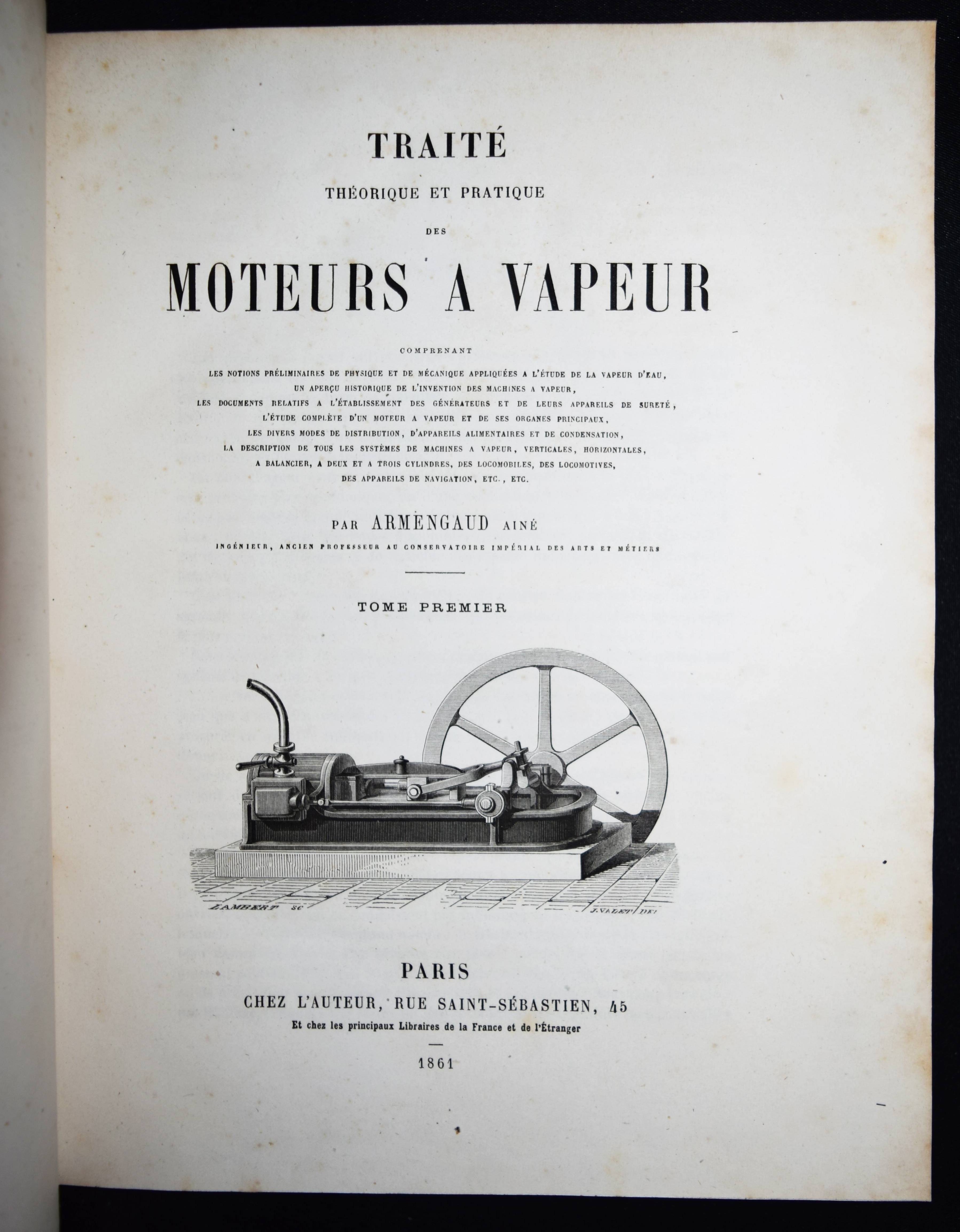 Armengaud, (Jacques Eugène). Traité théorique et pratique des moteurs a vapeur. Tome premier (et) deuxième. 2 Bände. Paris, chez l’auteur 1861 et 1862. 4°. VIII, 560 S.; 639, (1) S. mit zahlr. Holzstich-Illustrationen. Orig.-Halblederbände mit goldgepr. Rückentiteln und Rückenvergoldung. Poggendorff III, 41. – Der französische Ingenieur Jacques Eugène Armengaud (1810-1891), der sich „hervorragend als technischer Schriftsteller betätigte“, vermittelte „in jener an technischer Literatur armen Zeit dem gesamten Maschinenbau die Kenntnis der vorhandenen Konstruktionen und Anregung zu neuen Entwürfen“ (Matschoss, Männer der Technik S. 7). – Ohne den Atlasband. – Durchgehend etwas braunfleckig, gutes Exemplar.
