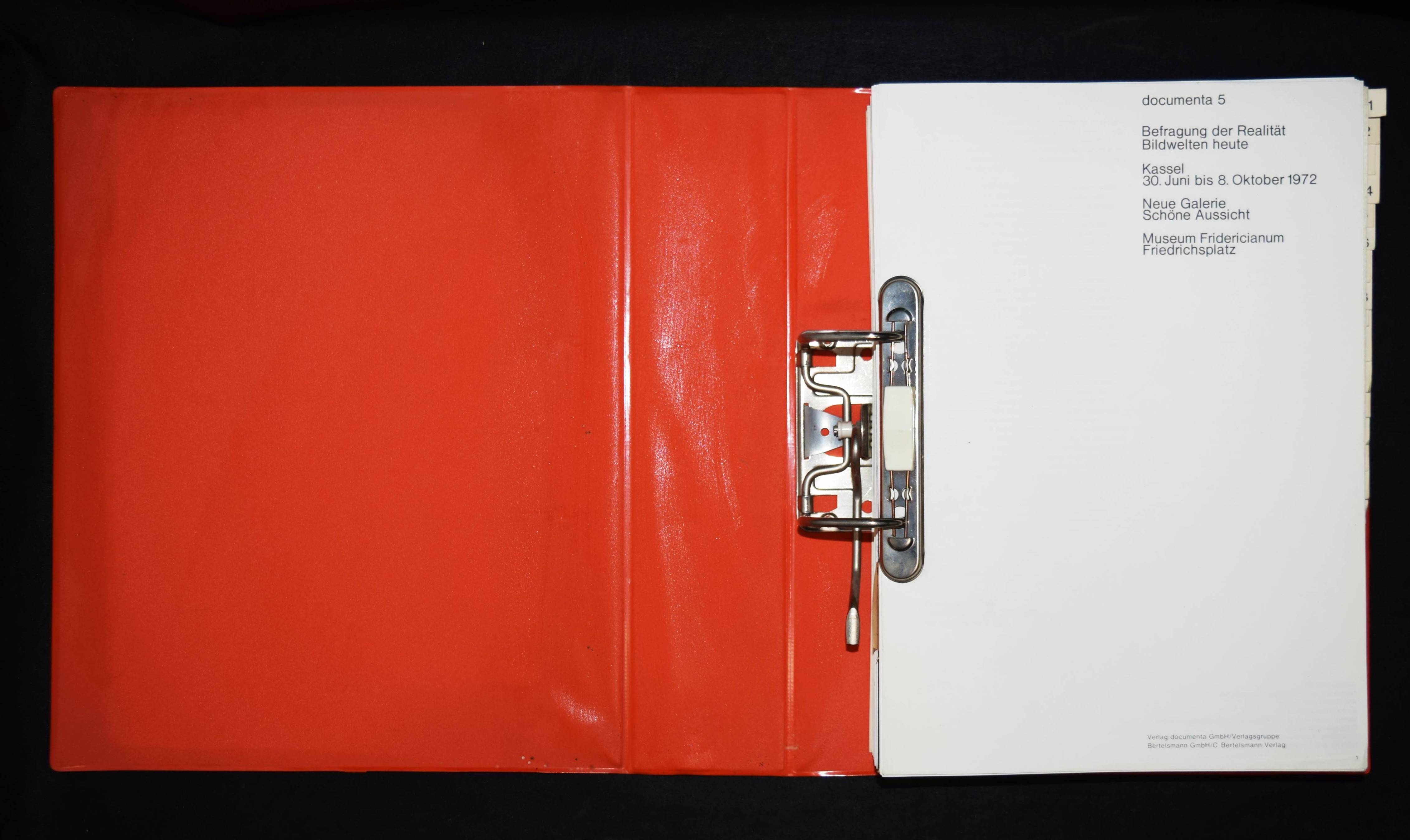 Documenta 5. Befragung der Realität. Bilderwelten heute. Kassel 30. Juni bis 8. Oktober 1972. Neue Galerie Schöne Aussicht. Museum Fridericianum Friedrichsplatz. Kassel 1972. 4°. 693 S. mit zahlr. teils farb. Abb. Illustr. orangefarb. Orig.-Kunststoff-Ring-Ordner (Entwurf: Ed Ruscha). Der wichtigste Documenta-Katalog. – Enthält nach dem Titel und Vorwort den Übersichtskatalog „Rundgang vom 4. Juni 1972“. Wie meist sind die Registerblätter 19 bis 24 ohne Inhalt (Nr. 25 Fotonachweis enthält ein Blatt). – Ordner am Rücken leicht fleckig, sonst sehr gut erhalten.