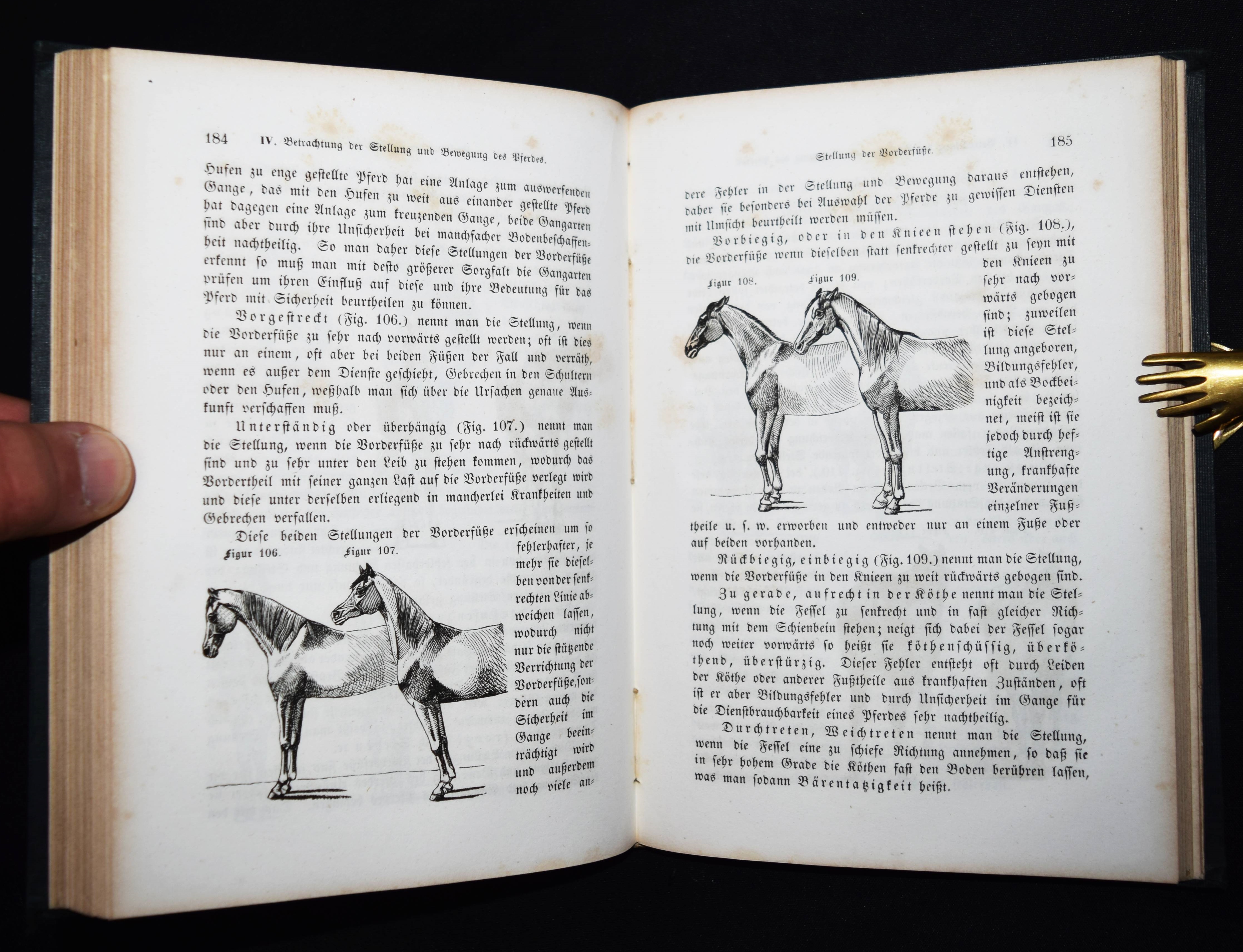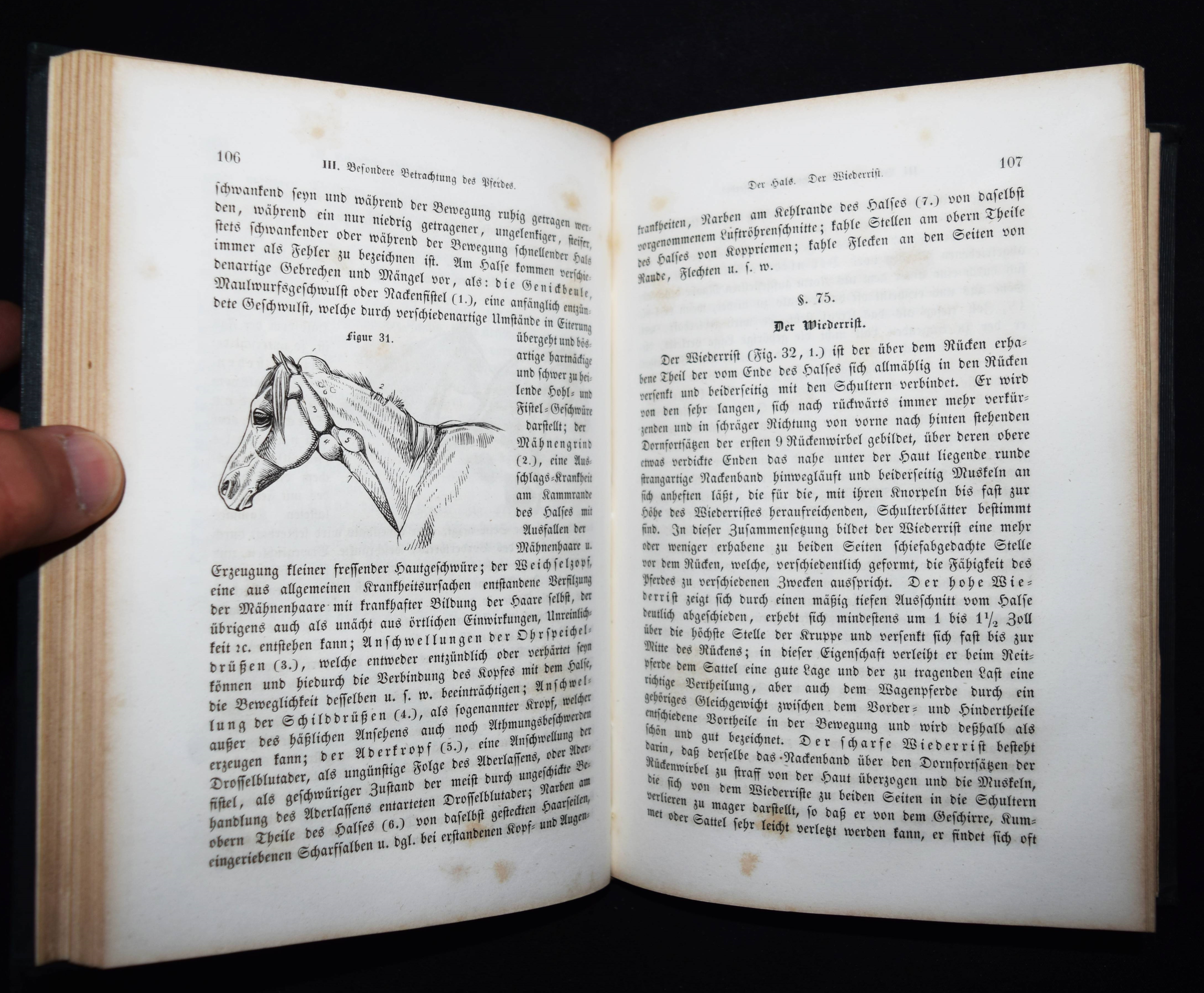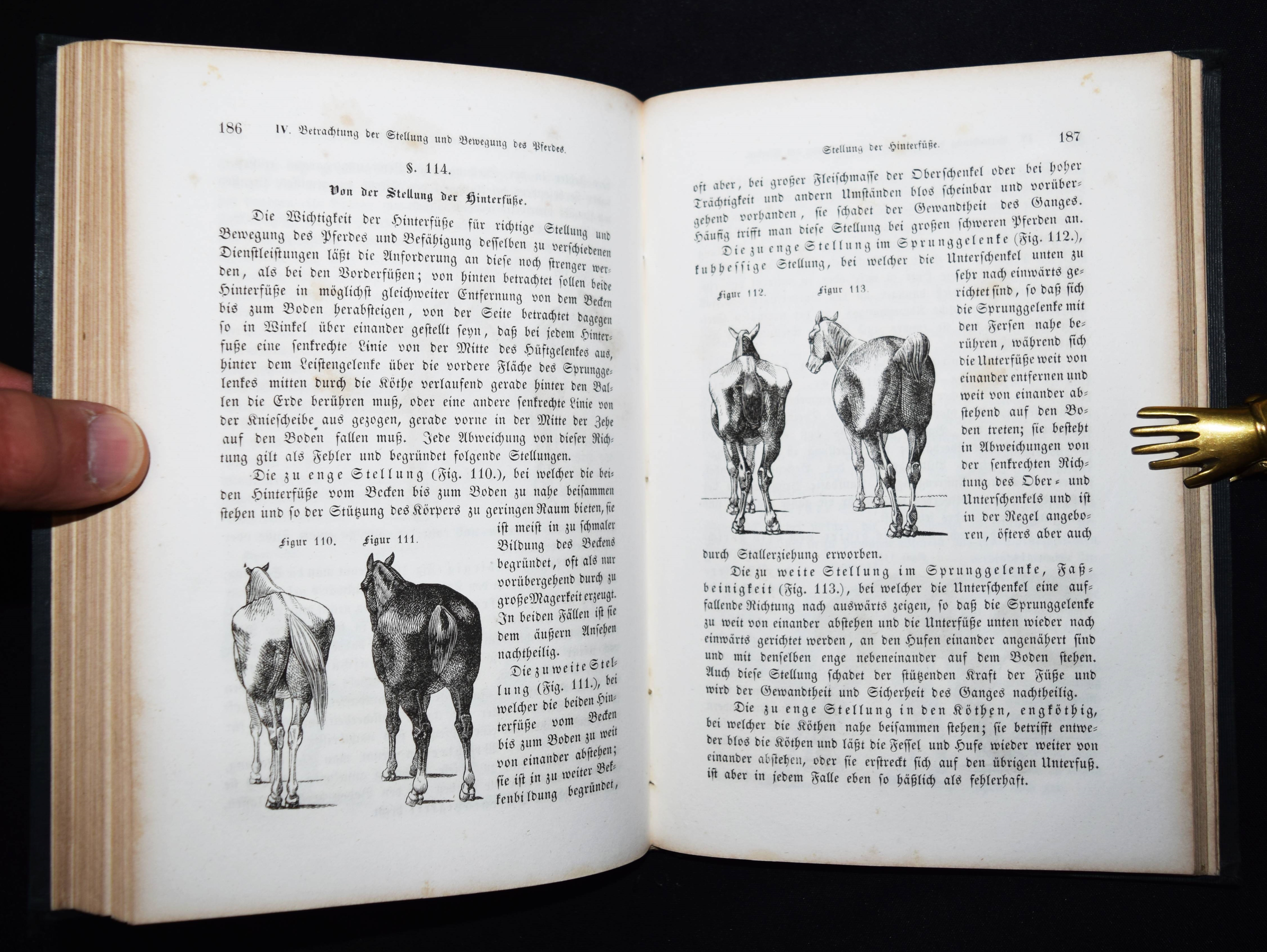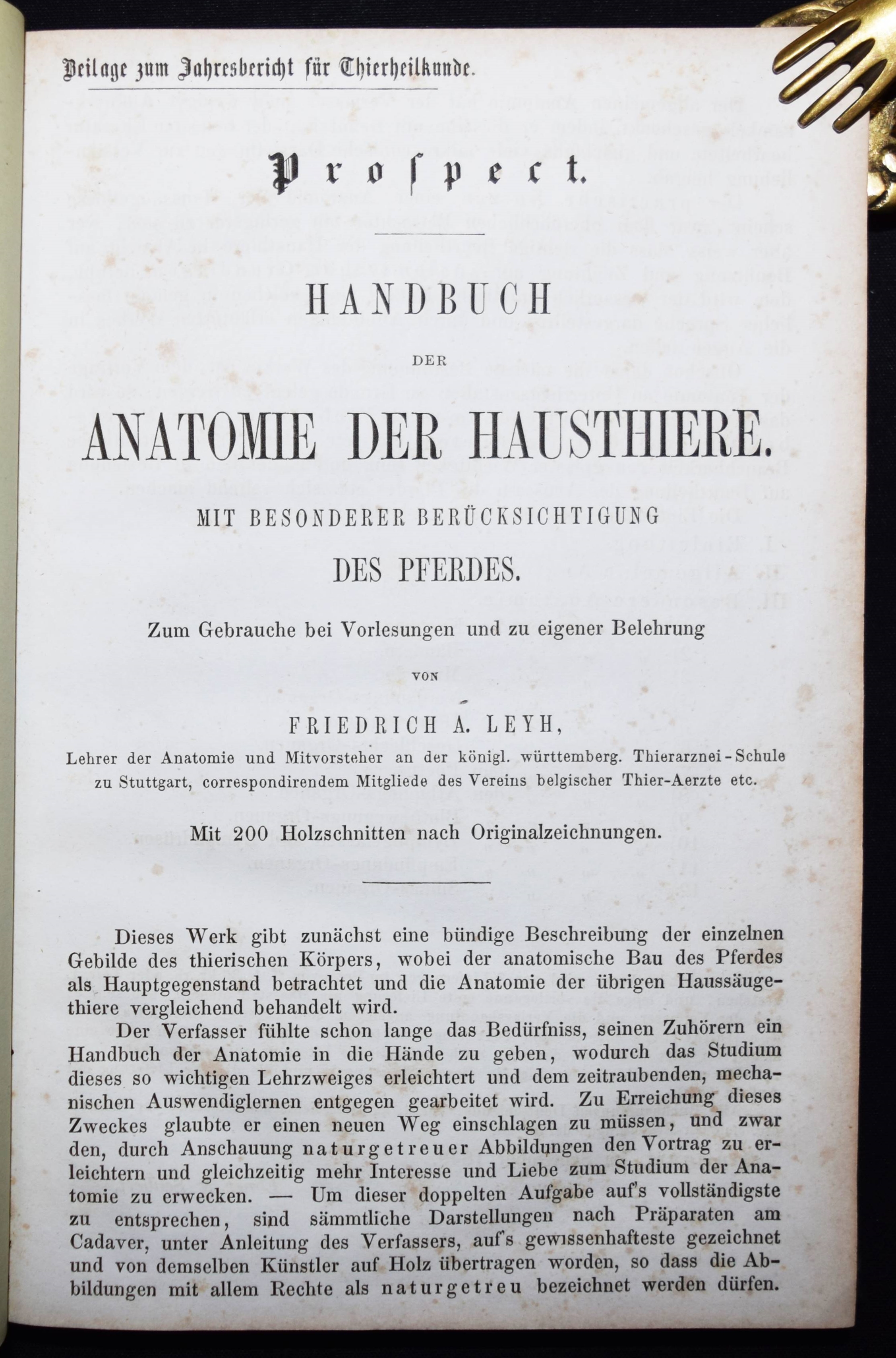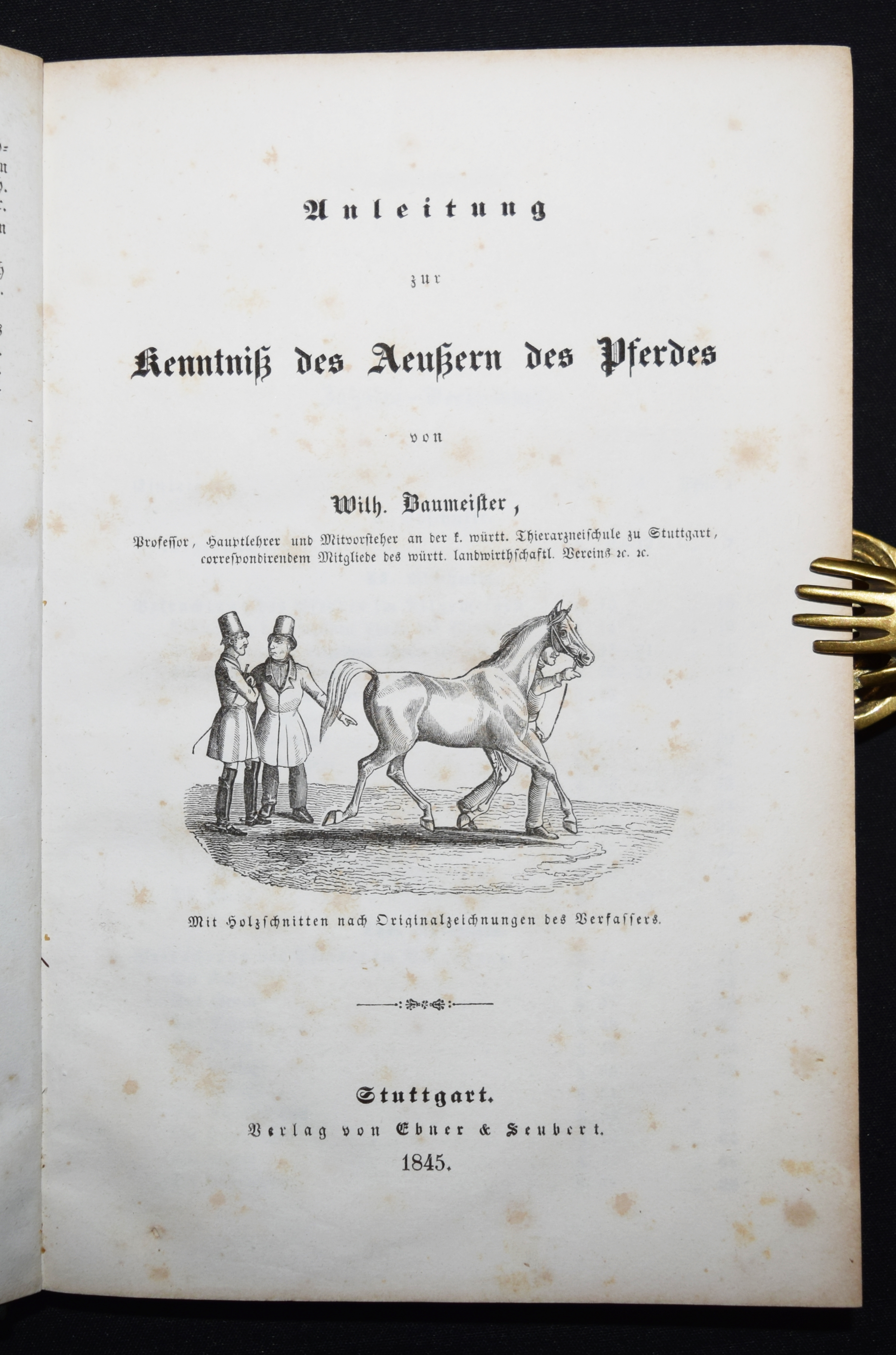 Baumeister, (Johann) Wilh(elm). Anleitung zur Kenntniß des Aeußern des Pferdes. Für Thierarzte, Pferdeliebhaber und Pferdebesitzer jeden Standes. Mit Holzschnitten nach Originalzeichnungen des Verfassers. Stuttgart, Ebner & Seubert 1845. 8°. [7] Bl., 276 S., [1] Bl. mit Titelvignette und 145 Holzschnitten im Text. Orig.-Leinenband mit goldgepr. Rückentitel und Deckelvignette. ADB II, 156 f. Schrader 131. – Seltene erste Ausgabe des erfolgreichsten deutschen Handbuchs für Pferdebesitzer. – J. W. Baumeister (1804-1846) war seit 1839 Professor und Hauptlehrer an der königl. Thierarzneischule in Stuttgart. „Hier begann seine so fruchtbringende litterarische Thätigkeit, bei welcher er seine Kunst zu Darstellungen aus dem Gebiete der Thierheilkunde verwendete. Er wußte auf diese Art seinen faßlich vorgetragenen Lehren eine besondere Anschaulichkeit zu geben“ (W. Löbe in ADB). – Stellenweise etwas braunfleckig, sonst gut erhalten.
