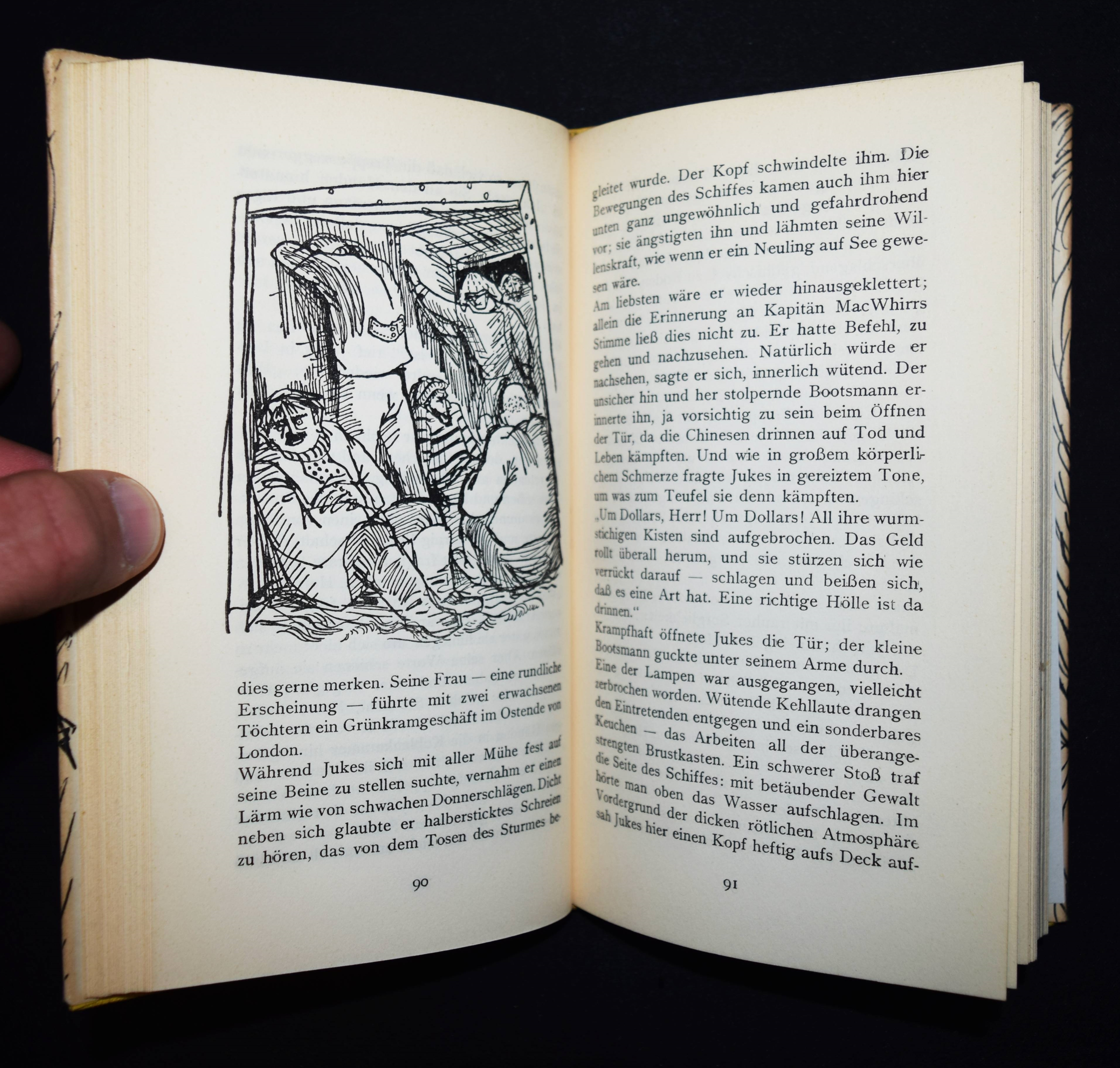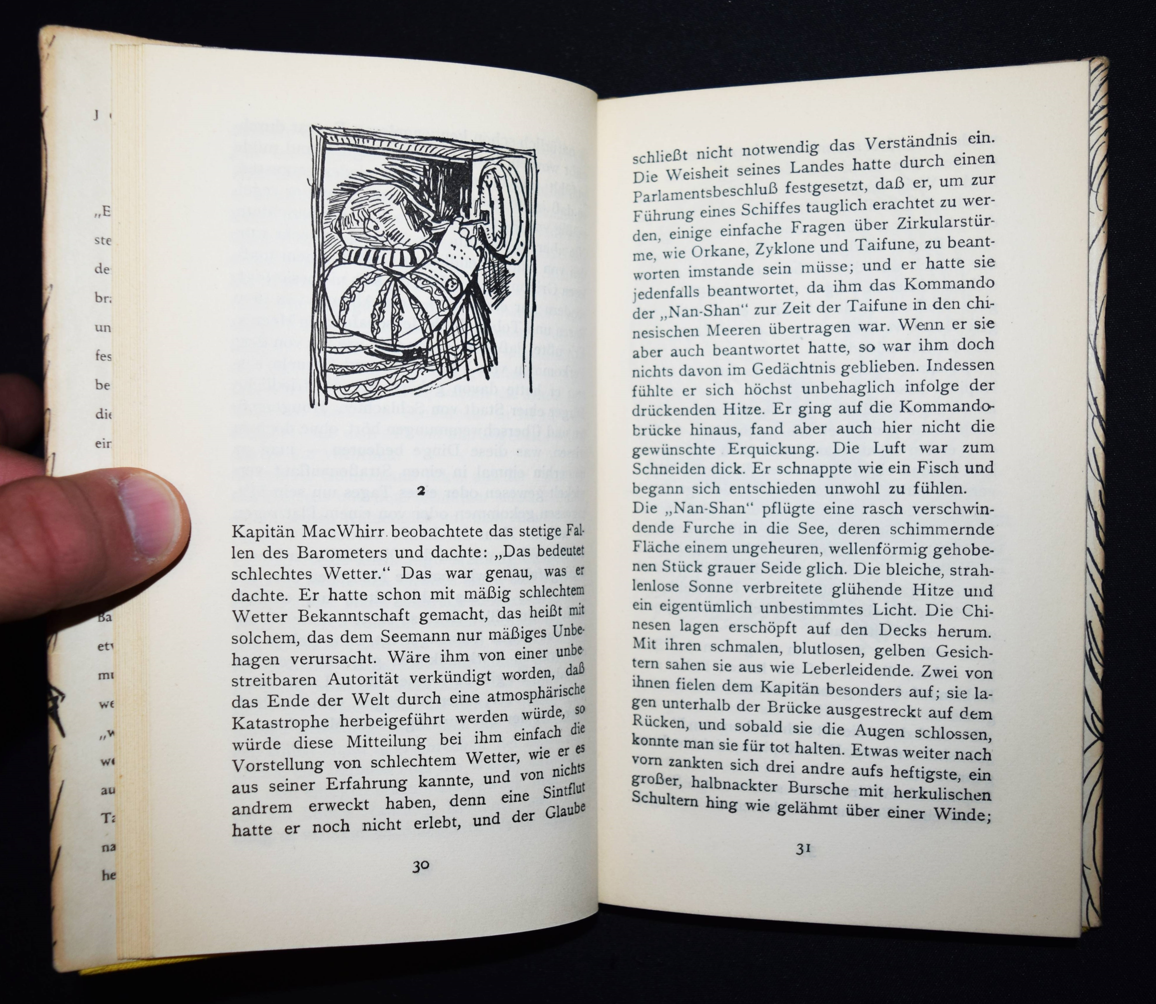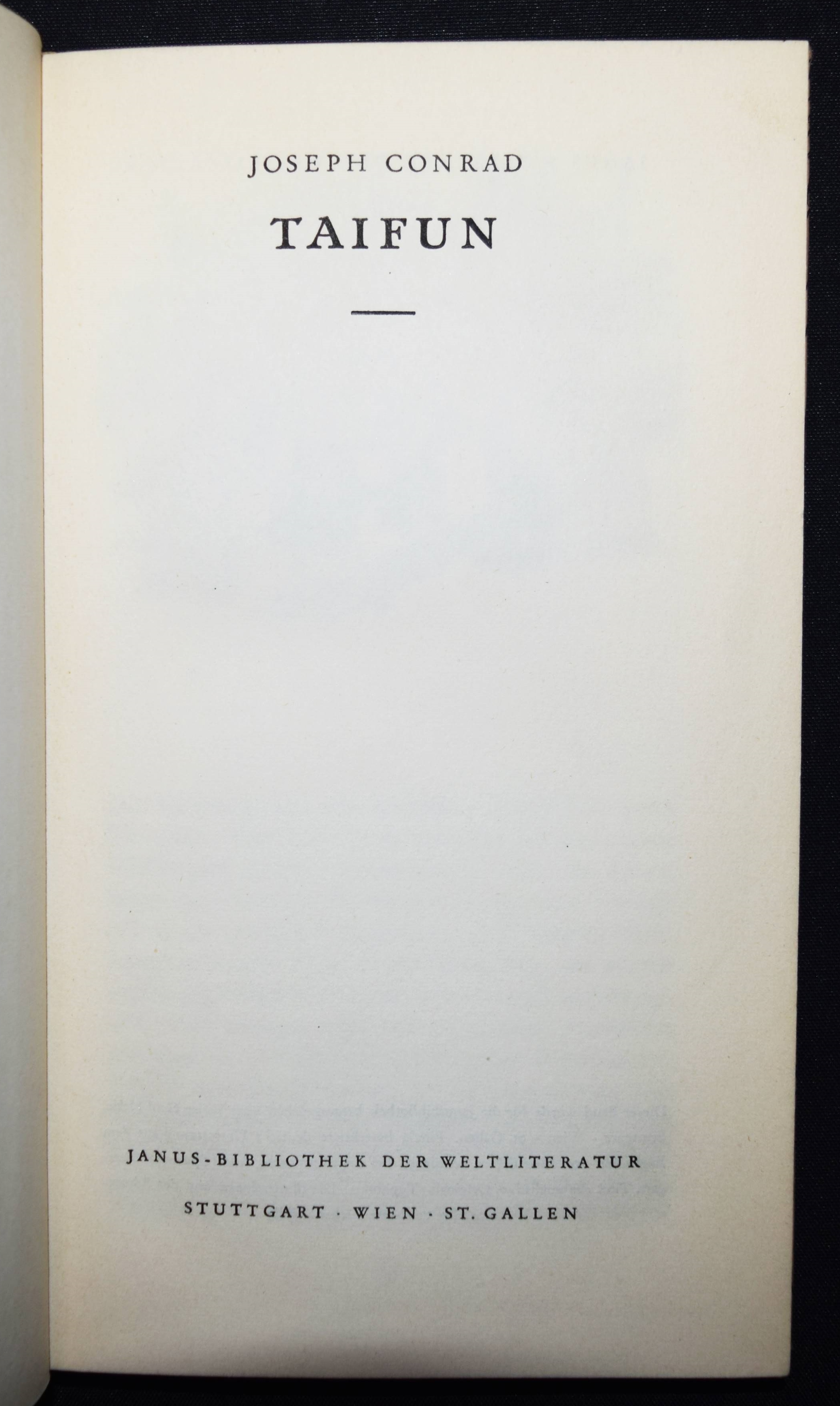 Conrad, Joseph (d. i. Józef Teodor Konrad Korzeniowski). Taifun. (Einzig berechtigte deutsche Übersetzung aus dem Englischen von Elise Eckert). Stuttgart, Wien, St. Gallen, Gerd Hatje o. J. (1950). 8°. 150 S., [1] Bl. mit Illustrationen von Gerhard Uhlig. Orig.-Leinenband mit illustr. Schutzumschlag. (Janus-Bibliothek der Weltliteratur, Band 18). Erste Ausgabe mit den Illustrationen von G. Uhlig. – Die Erzählung von J. Conrad erschien zuerst 1903. Die erste deutsche Ausgabe übersetzt von E. Eckert erschien 1908 bei J. Engelhorn in Stuttgart. – „Kapitän MacWhirr und seine Crew befahren auf dem Dampfer Nan-Shan, im Auftrag einer englischen Reederei, jedoch unter der Flagge von Siam, das Chinesische Meer. Auf einer Reise gerät das Schiff in einen Taifun, und die Seeleute kämpfen ums Überleben. Die Situation wird dadurch erschwert, dass die Nan-Shan eine Gruppe chinesischer Kulis an Bord hat, die im finsteren und sturmbewegten Zwischendeck um ihre ersparten Silberdollars kämpfen, die aus den zerbrechenden Seekisten fallen. Es gelingt MacWhirr und seinen Leuten, die Ordnung wiederherzustellen und die Nan-Shan, wenn auch schwer gezeichnet, in den Hafen zu bringen“ (Wikipedia). – Der Maler, Grafiker und Fotograf G. Uhlig (1924-2015) war Schüler von Josef Hegenbarth, Max Schwimmer, Johannes Itten und Willi Baumeister. – „Während meines Kunststudiums hat es zwei Lehrer gegeben, die meine Auffassung hinsichtlich des künstlerischen Tuns besonders beeinflußt haben: J. Hegenbarth und W. Baumeister. Beide waren Arbeiter, Künstlerallüren waren ihnen zuwider“ (G. Uhlig). – „Seine ursprüngliche künstlerische Neigung und Begabung führten durch einen selbstverständlichen Fleiß und Intensität zu den besten Resultaten meiner Klasse. Sie waren ausgezeichnet!“ (W. Baumeister). – Schutzumschlag am Rücken etwas gebräunt, schönes Exemplar.
