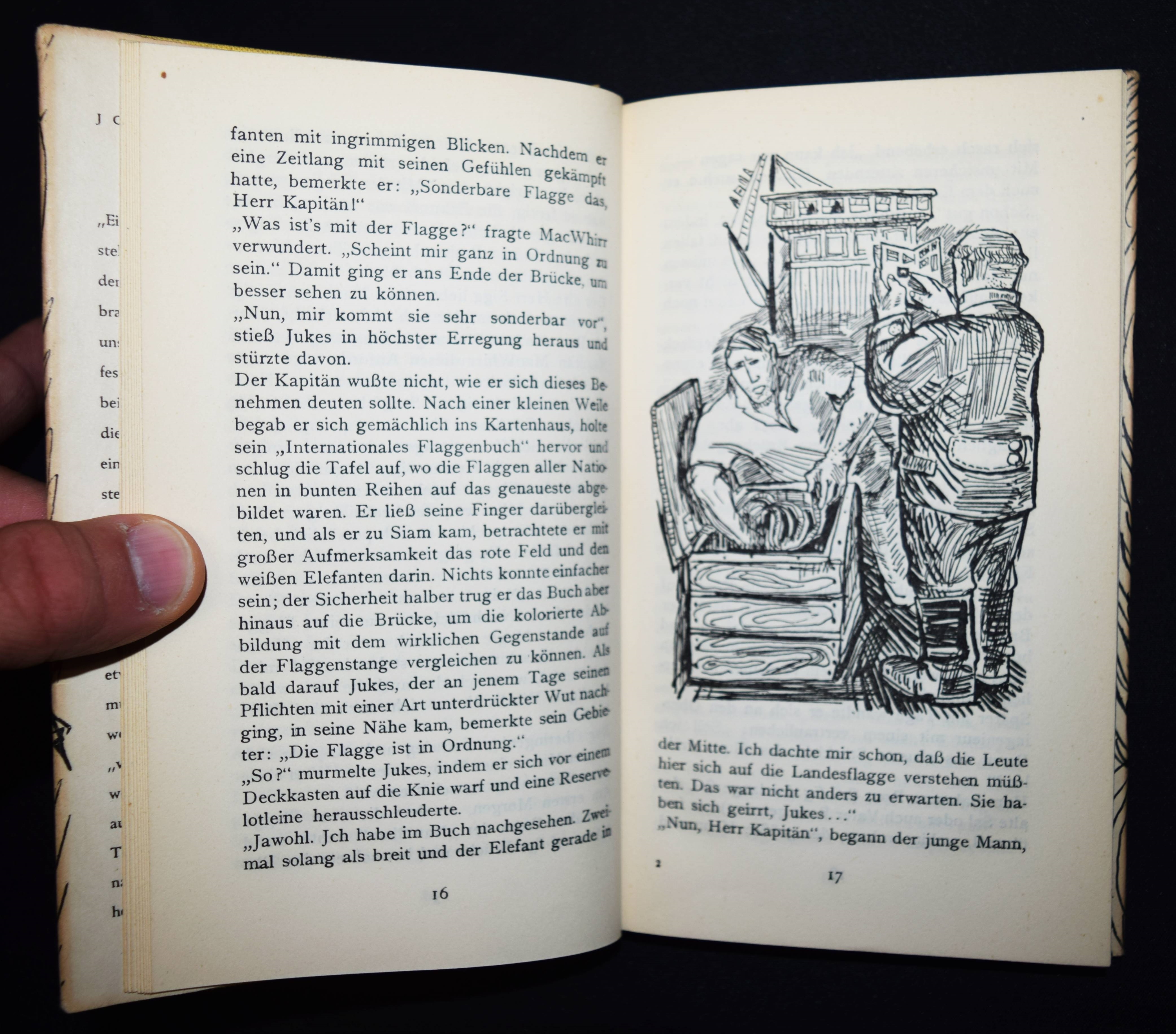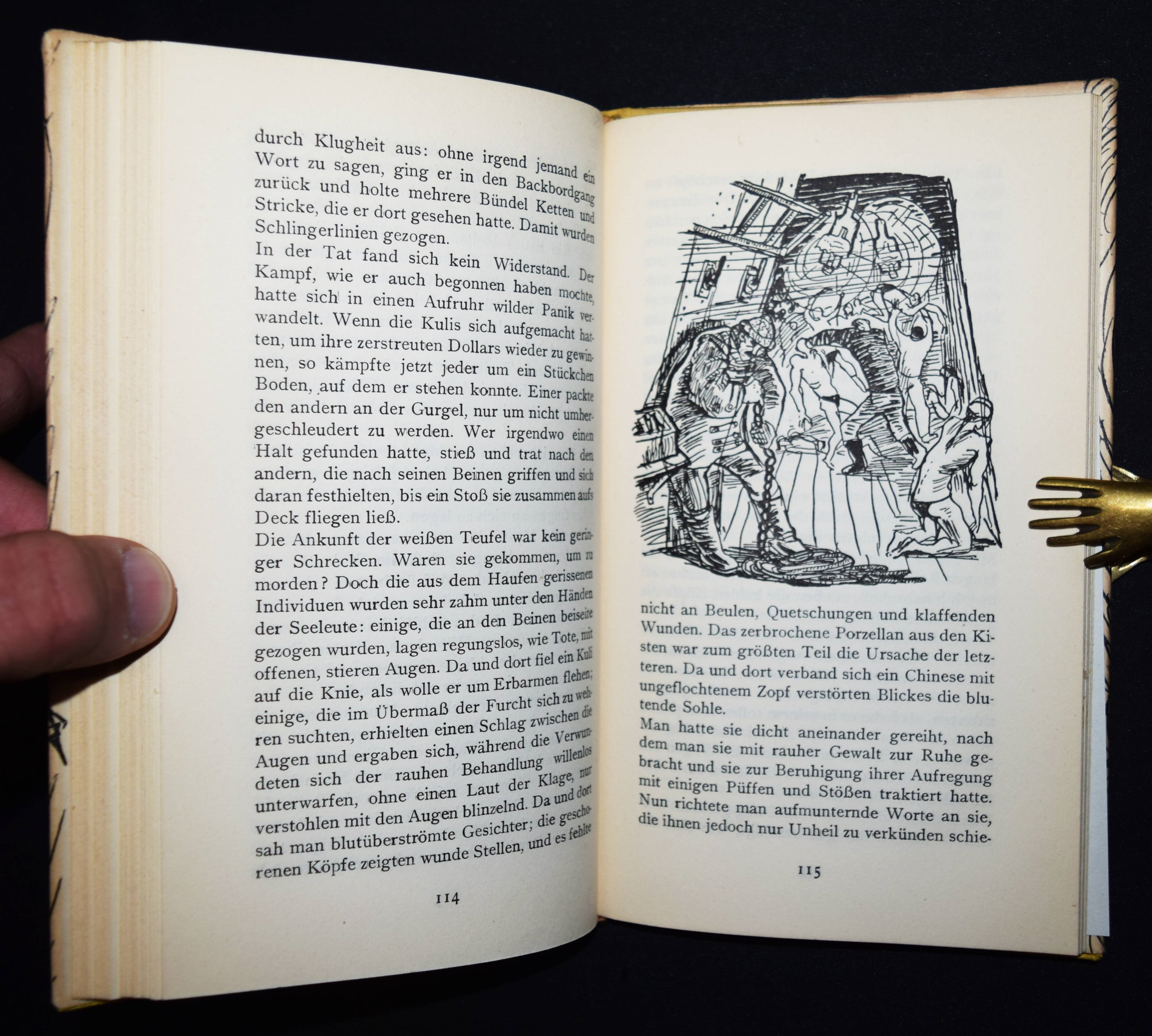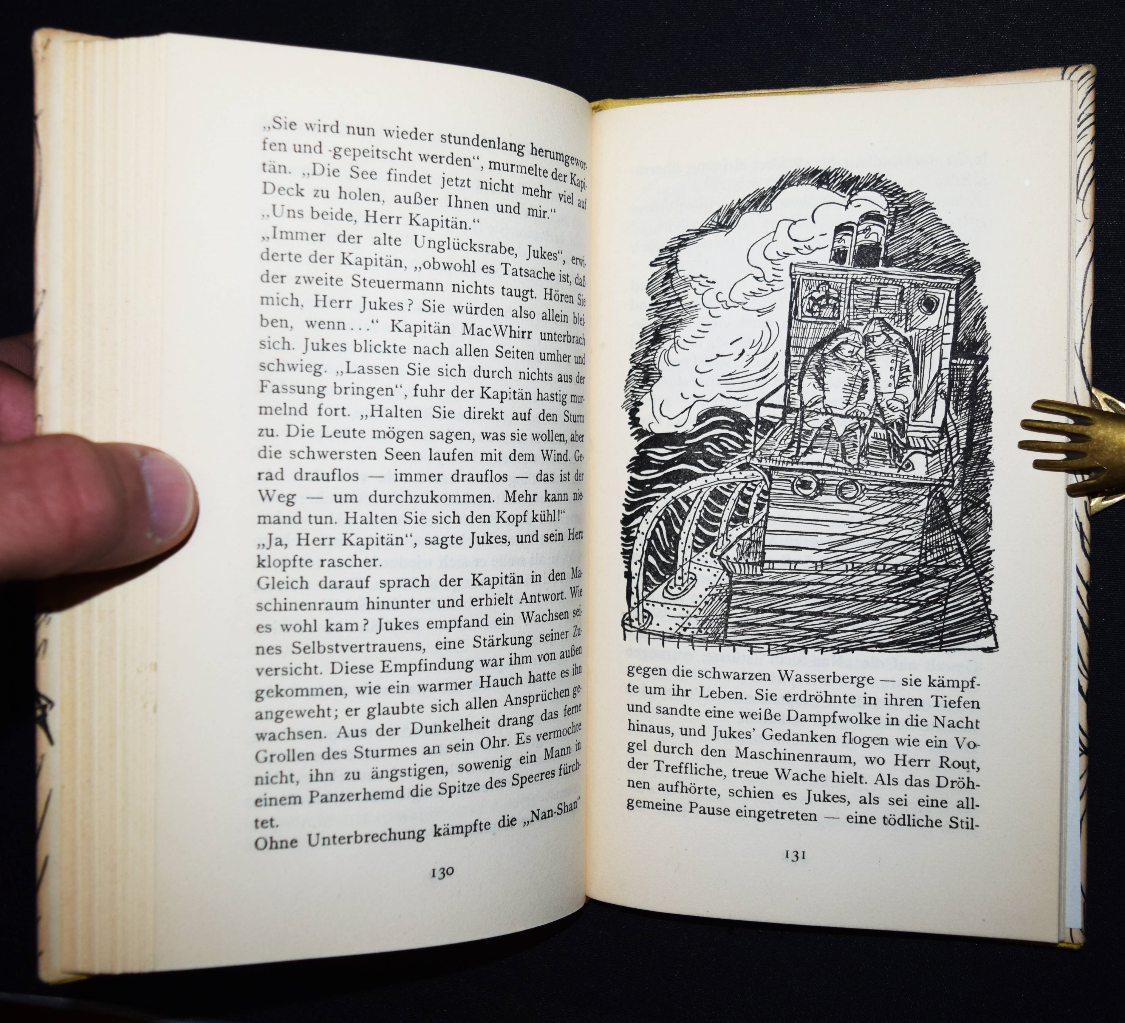 Conrad, Joseph (d. i. Józef Teodor Konrad Korzeniowski). Taifun. (Einzig berechtigte deutsche Übersetzung aus dem Englischen von Elise Eckert). Stuttgart, Wien, St. Gallen, Gerd Hatje o. J. (1950). 8°. 150 S., [1] Bl. mit Illustrationen von Gerhard Uhlig. Orig.-Leinenband mit illustr. Schutzumschlag. (Janus-Bibliothek der Weltliteratur, Band 18). Erste Ausgabe mit den Illustrationen von G. Uhlig. – Die Erzählung von J. Conrad erschien zuerst 1903. Die erste deutsche Ausgabe übersetzt von E. Eckert erschien 1908 bei J. Engelhorn in Stuttgart. – „Kapitän MacWhirr und seine Crew befahren auf dem Dampfer Nan-Shan, im Auftrag einer englischen Reederei, jedoch unter der Flagge von Siam, das Chinesische Meer. Auf einer Reise gerät das Schiff in einen Taifun, und die Seeleute kämpfen ums Überleben. Die Situation wird dadurch erschwert, dass die Nan-Shan eine Gruppe chinesischer Kulis an Bord hat, die im finsteren und sturmbewegten Zwischendeck um ihre ersparten Silberdollars kämpfen, die aus den zerbrechenden Seekisten fallen. Es gelingt MacWhirr und seinen Leuten, die Ordnung wiederherzustellen und die Nan-Shan, wenn auch schwer gezeichnet, in den Hafen zu bringen“ (Wikipedia). – Der Maler, Grafiker und Fotograf G. Uhlig (1924-2015) war Schüler von Josef Hegenbarth, Max Schwimmer, Johannes Itten und Willi Baumeister. – „Während meines Kunststudiums hat es zwei Lehrer gegeben, die meine Auffassung hinsichtlich des künstlerischen Tuns besonders beeinflußt haben: J. Hegenbarth und W. Baumeister. Beide waren Arbeiter, Künstlerallüren waren ihnen zuwider“ (G. Uhlig). – „Seine ursprüngliche künstlerische Neigung und Begabung führten durch einen selbstverständlichen Fleiß und Intensität zu den besten Resultaten meiner Klasse. Sie waren ausgezeichnet!“ (W. Baumeister). – Schutzumschlag am Rücken etwas gebräunt, schönes Exemplar.