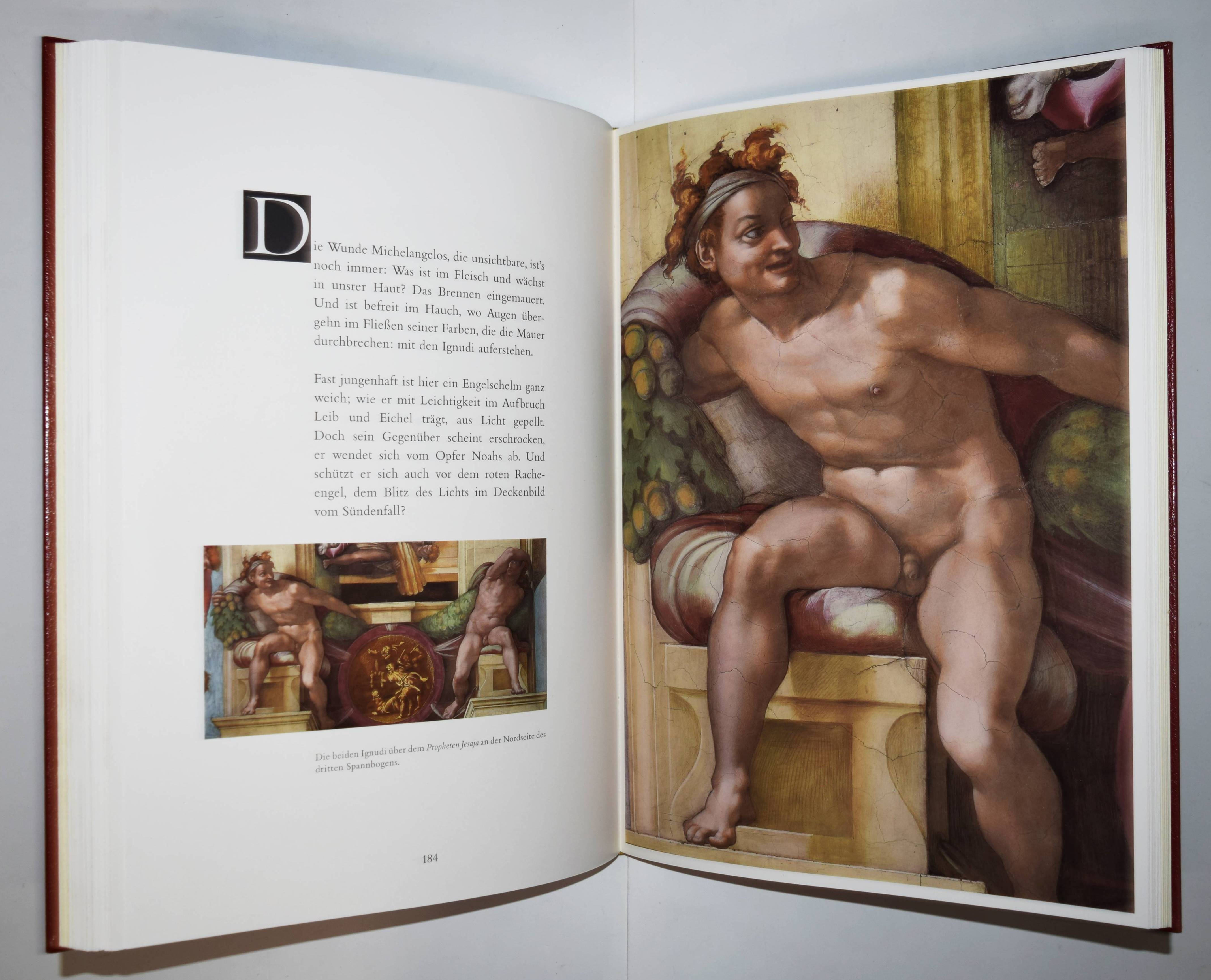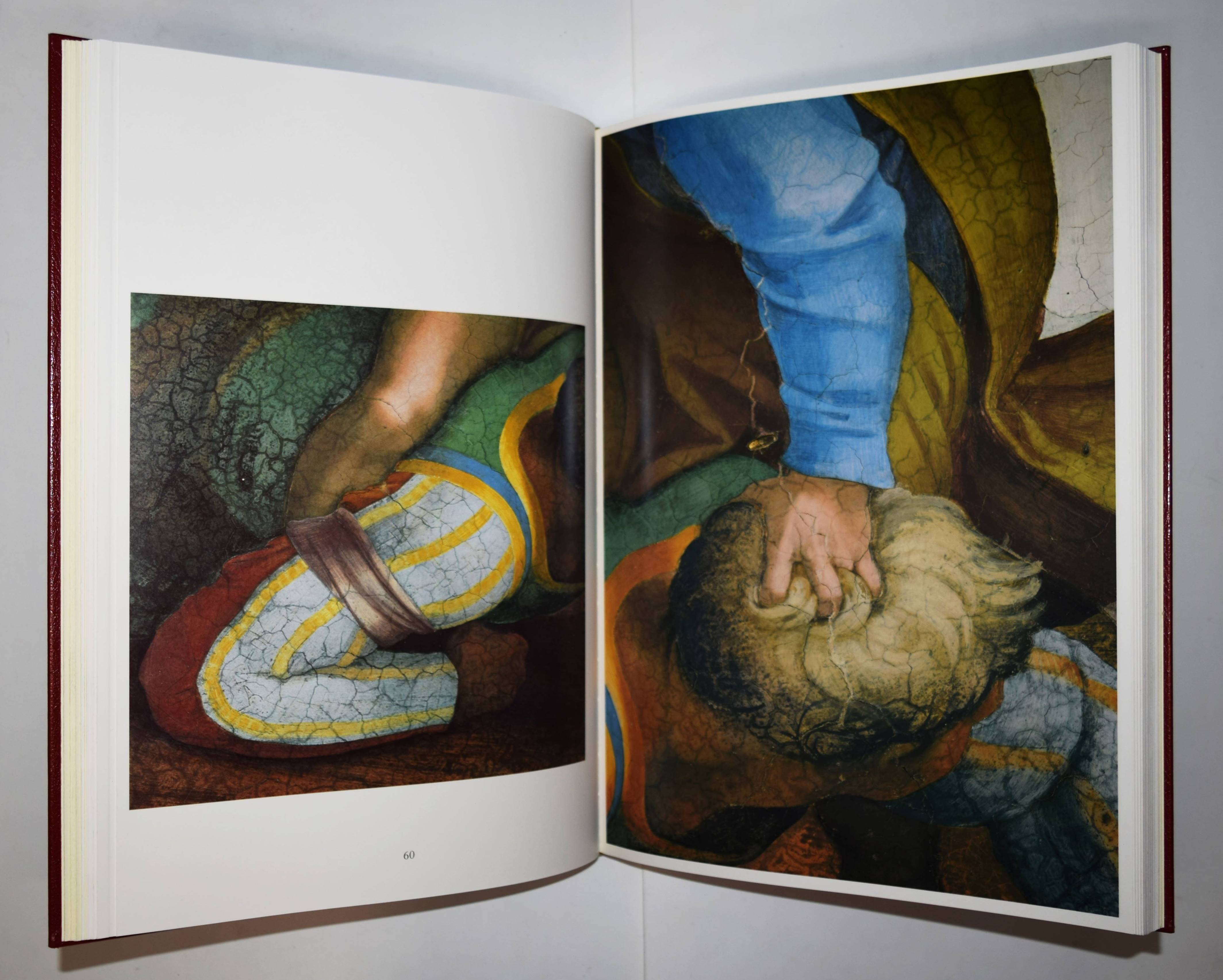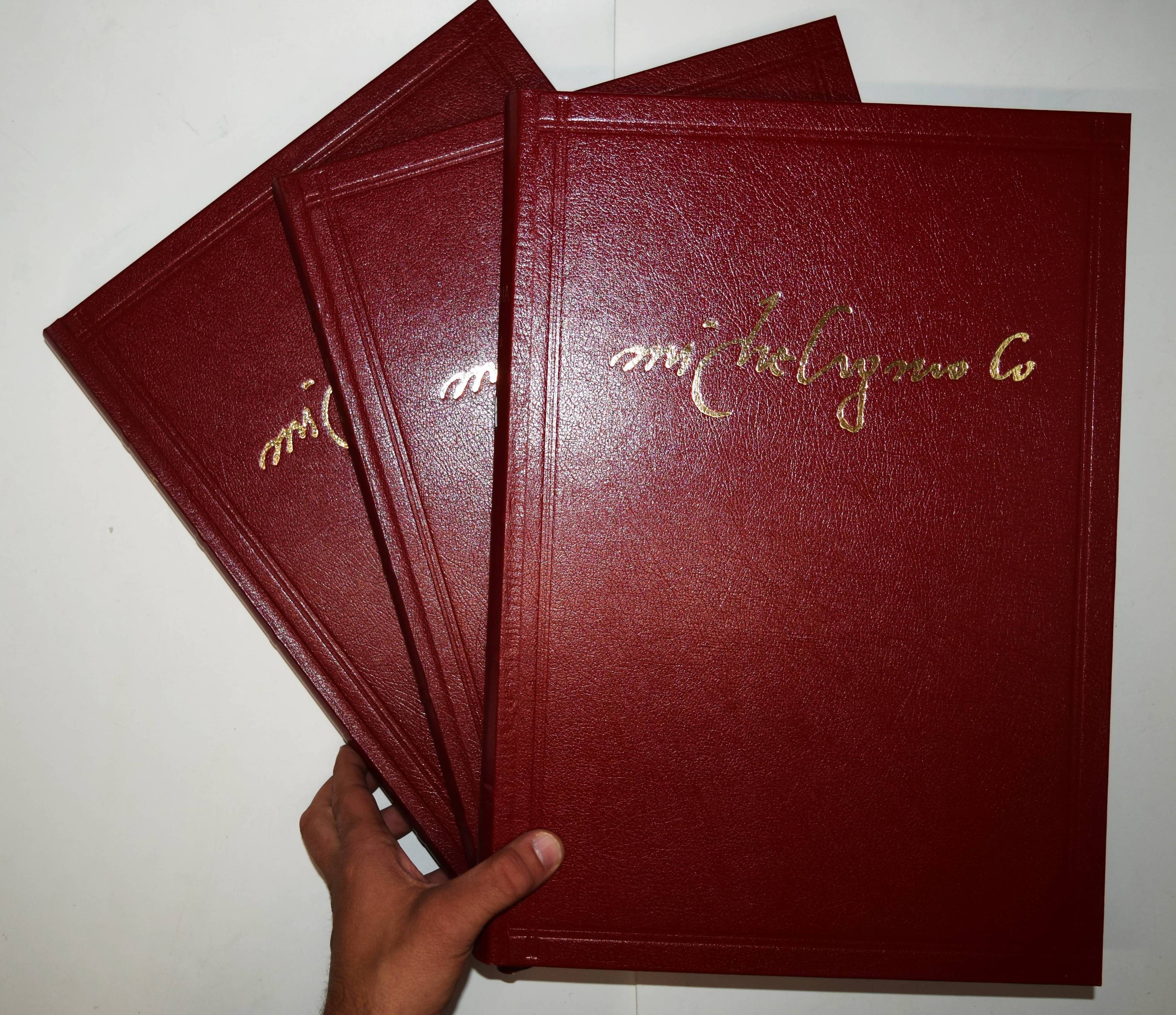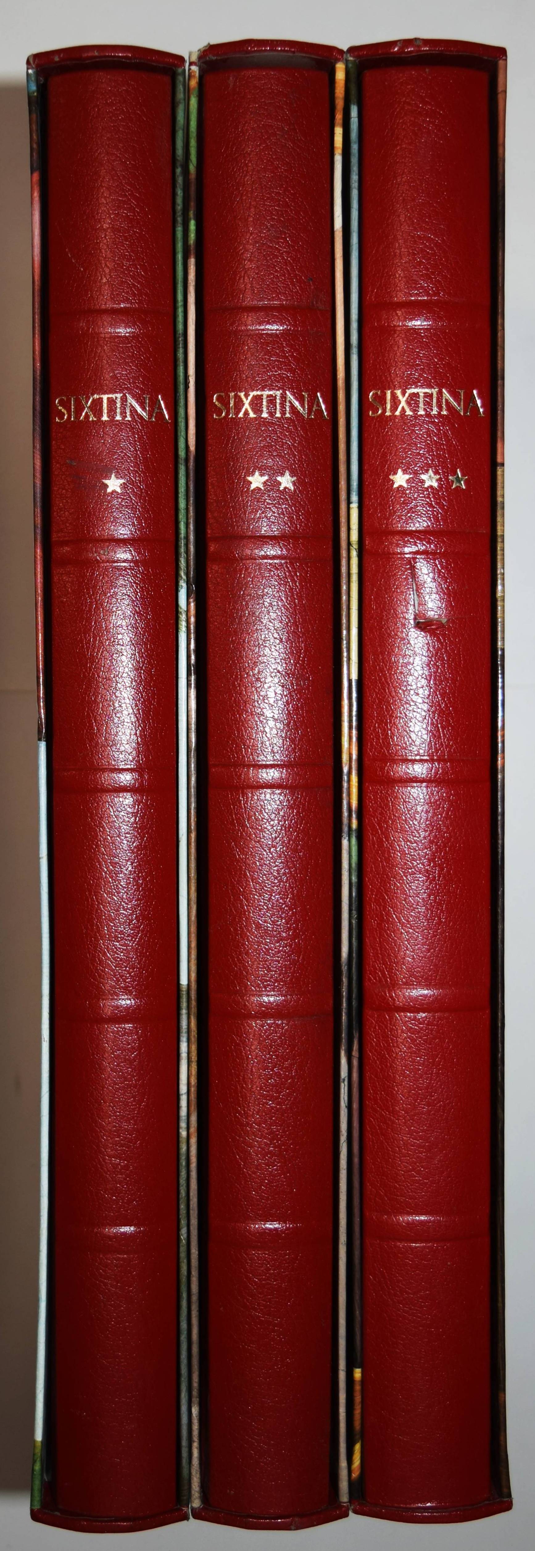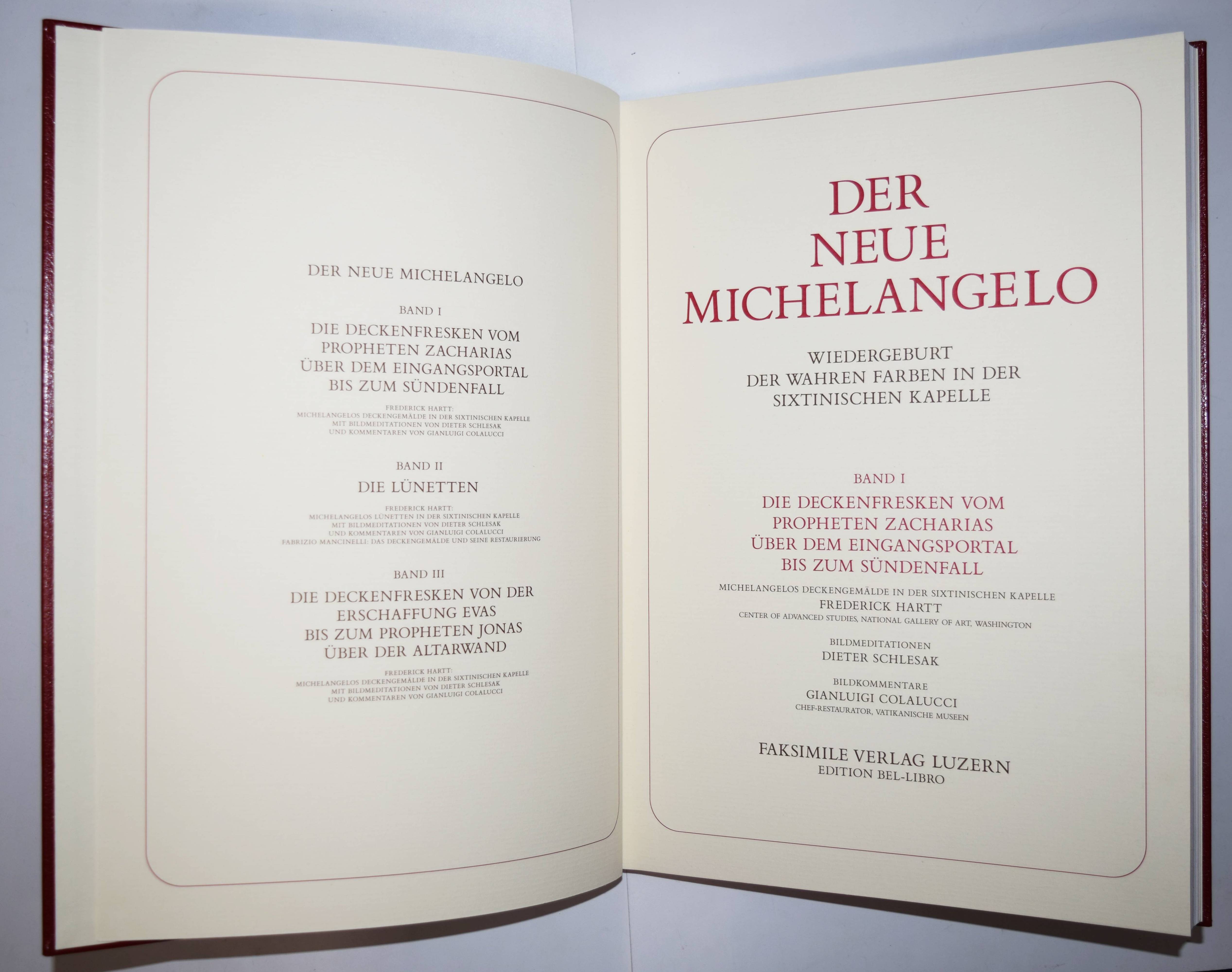 Michelangelo – Hartt, Frederick (Hrsg.). Der neue Michelangelo. Wiedergeburt der wahren Farben in der Sixtinischen Kapelle. Mit Bildmeditationen von Dieter Schlesak und Kommentaren von Gianluigi Colalucci. – I. Die Deckenfresken vom Propheten Zacharias über dem Eingangsportal bis zum Sündenfall. – II. Die Lünetten. – III. Die Deckenfresken von der Erschaffung Evas bis zum Propheten Johannes über der Altarwand. 3 Bände (von 4). Luzern, Faksimile Verlag 1989-1991. Imperial-Folio (43,5 x 31,5 cm.). 247 S.; 246 S., 256 S. mit über 500 teils ganzs. farb. Abb. Weinrote Kunstlederbände in farbig illustr. Pappschubern. Ohne den erst 1995 erschienenen vierten Band „Das Jüngste Gericht“. – Rücken von Band III mit geringfügig beschädigt, gutes Exemplar.