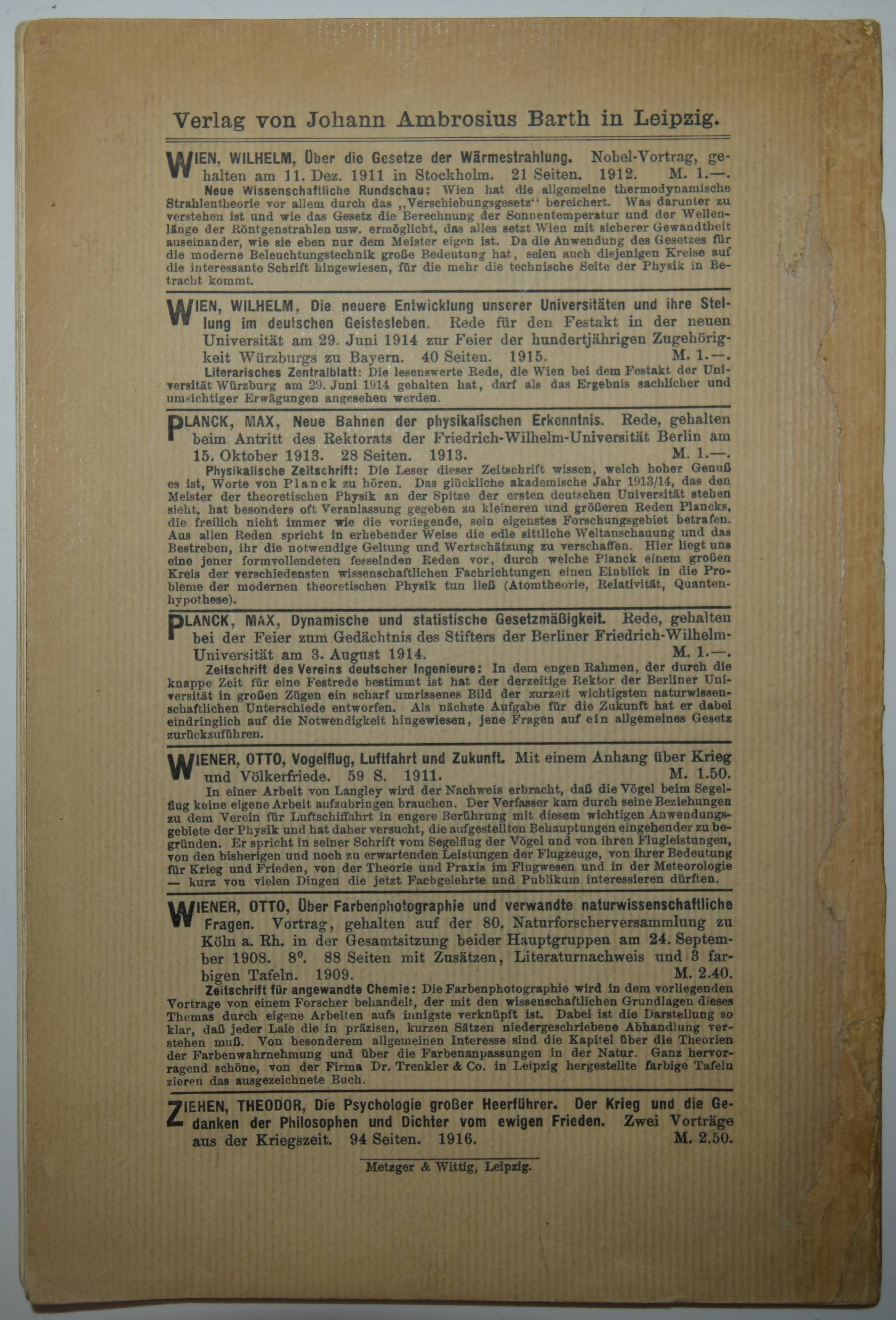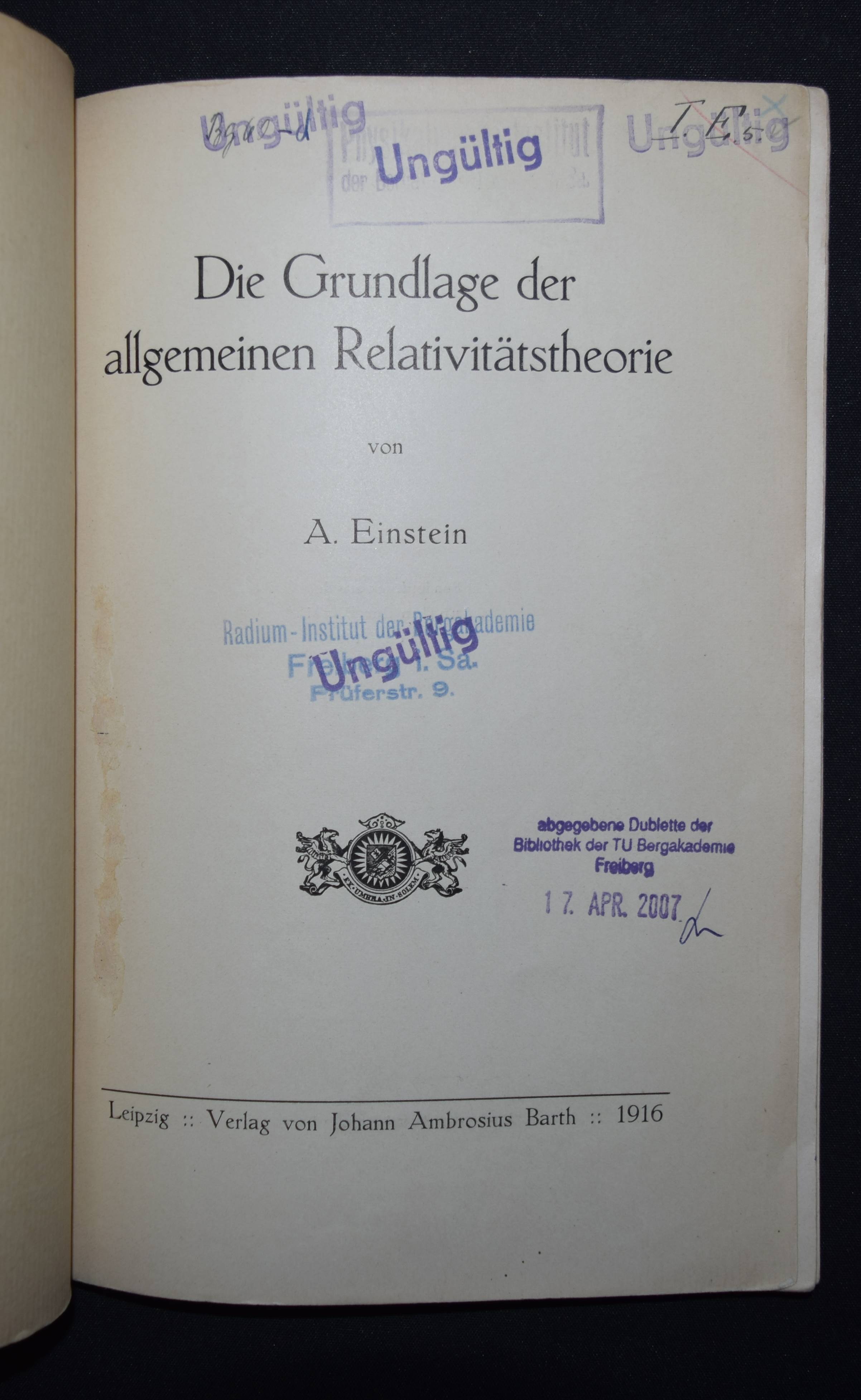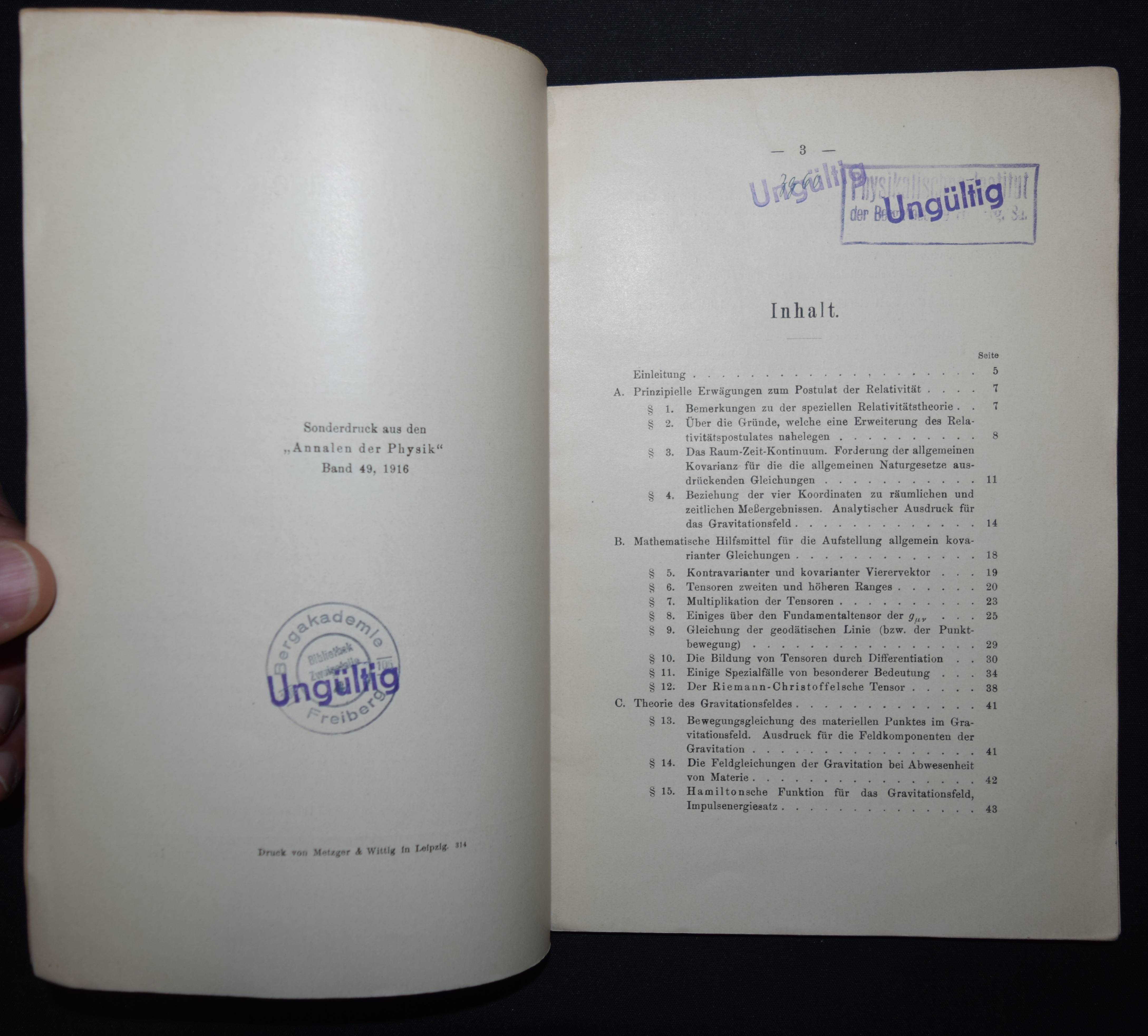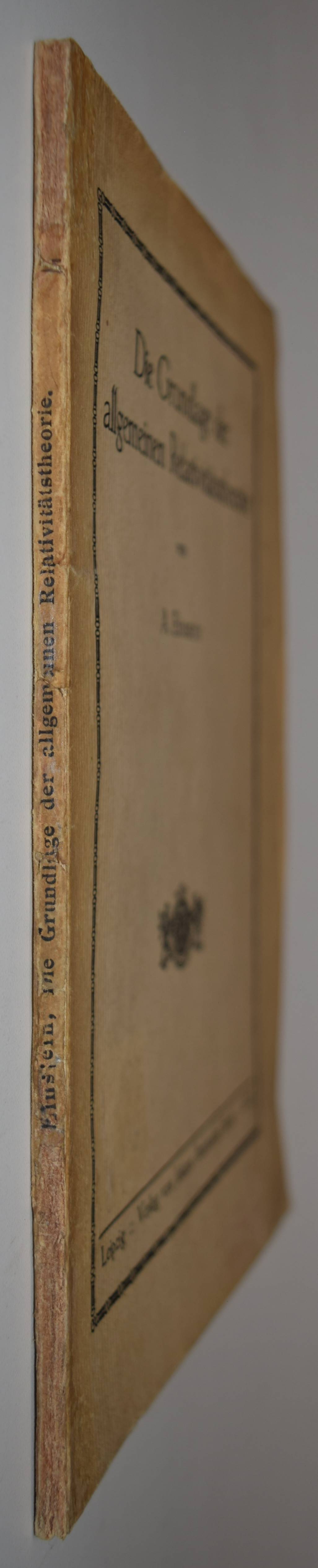 Einstein, A(lbert). Die Grundlage der allgemeinen Relativitätstheorie. Leipzig, Barth 1916. 8°. 64 S. Typogr. Orig.-Kartonumschlag. Boni 78.1. Horblit 26. PMM 408. Schilpp-Schields 86. Weil 80 a. – Erste separate Ausgabe (Sonderdruck aus den Annalen der Physik, Band 49, 1916). „Druck von Metzger & Wittig in Leipzig. 314“. – Mit der Einleitung (S. 5/6), die im Zeitschriftenabdruck nicht enthalten ist und eigenständiger Paginierung. – „It is described now as the original of this classic paper“ (Weil). – „The theory of relativity has transformed astrophysics, and indeed the whole scientific outlook.“ (Carter/Muir). – „This paper was the first comprehensive overview of the final version of Einstein’s general theory of relativity after several expositions of preliminary versions and latest revisions of the theory in November 1915. It includes a self-contained exposition of the elements of the tensor calculus that are needed for the theory“ (T. Sauer in Landmark Writings in Western Mathematics). – „Würde ein Weltraumschiff mit beinahe Lichtgeschwindigkeit zum Arcturus, hundert Lichtjahre entfernt von uns, reisen, so schiene der Besatzung, die Reise dauere zehn Jahre, da sich die Zeit für sie verlangsamt. Kehrt das Schiff nach weiteren hundert Jahren zurück, so schienen es der Besatzung wiederum nur zehn Jahre zu sein. Je näher ein Weltraumfahrer der Lichtgeschwindigkeit käme, um so ‚unsterblicher‘; würde er. Und dieser Effekt ist sogar nachprüfbar. Die verlängerte Lebenserwartung ist von Physikern bei bestimmten Elementarteilchen, sogenannten Mesonen, nachgewiesen worden. Und noch etwas je schneller das Raumschiff von uns forteilt, desto kürzer wird es. Nicht nur die Zeit, auch die geometrischen Dimensionen sind keine den Objekten im Raume anhaftenden Eigenschaften, sondern sind veränderlich bezüglich des Ortes und der Bewegung eines bestimmten Beobachters. Die Annahme, daß es einen bevorrechteten Bezugskörper gebe, auf den alle Ereignisse eindeutig bezogen werden könnten, ist eine nicht empirisch zu sichernde Hypothese und führt zu unlöslichen Widersprüchen. ‚Die allgemeine Relativitätstheorie‘ ist Einsteins kühner Versuch, diesem Dilemma zu entkommen. Wir müssen die Vorstellung aufgeben, die Welt mit den Augen Gottes betrachten zu können. So war nämlich angenommen worden, daß sich die Erde durch den Lichtäther bewegen müsse, der im absoluten Raum festläge; doch kein Experiment vermochte eine solche Bewegung nachzuweisen. Einstein schrieb: „Nach dieser Theorie gibt es kein besonders bevorrechtetes (einheitliches) Koordinatensystem, das die Einführung einer Äthervorstellung zuläßt, und deshalb kann es keine Ätherdrift noch irgendein Experiment geben, das sie aufweist!“; Die Relativitätstheorie hat die Astrophysik umgekrempelt, sogar das ganze wissenschaftliche Weltbild. 1914 wurde Einstein ordentliches Mitglied der Preußischen Akademie der Wissenschaften und Direktor des Kaiser-Wilhelm Instituts für Physik. 1921 erhielt er den Nobelpreis für die quantentheoretische Deutung des lichtelektrischen Effektes – nicht für die Relativitätstheorie“ (Carter/Muir). – Rücken unauffällig restauriert und etwas berieben, Deckel etwas angestaubt und gebräunt, Titelblatt mehrfach gestempelt „abgegebene Doublette der Bibliothek der TU Bergakademie Freiberg 17. April 2007“, sehr gutes Exemplar. – First separate edition (offprint from Annalen der Physik, vol. 49, 1916). „Printed by Metzger & Wittig in Leipzig. 314“. – With the introduction (p. 5/6), which is not included in the journal print, and independent pagination. – “If a spaceship were to travel to Arcturus, a hundred light years away from us, at almost the speed of light, the crew would think the journey would take ten years because time would slow down for them. If the ship returns after another hundred years, it would again seem to the crew that it would only take ten years. The closer a space traveler gets to the speed of light, the more ‚immortal‘ they become. And this effect is even verifiable. The extended life expectancy has been proven by physicists for certain elementary particles, so-called mesons. And another thing: the faster the spaceship moves away from us, the shorter it becomes. Not only time, but also geometric dimensions are not properties inherent to objects in space, but are variable in relation to the location and movement of a particular observer. The assumption that there is a privileged reference body to which all events can be unambiguously related is a hypothesis that cannot be empirically verified and leads to insoluble contradictions. ‚The general theory of relativity‘ is Einstein’s bold attempt to escape this dilemma. We must give up the idea that we can see the world through the eyes of God. It had been assumed that the earth had to move through the light ether, which was fixed in absolute space; however, no experiment was able to prove such a movement. Einstein wrote: “According to this theory, there is no particularly favored (uniform) coordinate system that allows the introduction of an ether concept, and therefore there can be no ether drift nor any experiment that shows it!” The theory of relativity turned astrophysics upside down, even the entire scientific world view. In 1914, Einstein became a full member of the Prussian Academy of Sciences and Director of the Kaiser Wilhelm Institute of Physics. In 1921 he was awarded the Nobel Prize for the quantum theoretical interpretation of the photoelectric effect – not for the theory of relativity” (Carter/Muir). – Spine inconspicuously restored and somewhat rubbed, covers somewhat dusty and browned, title page stamped several times ‘abgegebene Doublette der Bibliothek der TU Bergakademie Freiberg 17 April 2007’, a very good copy.