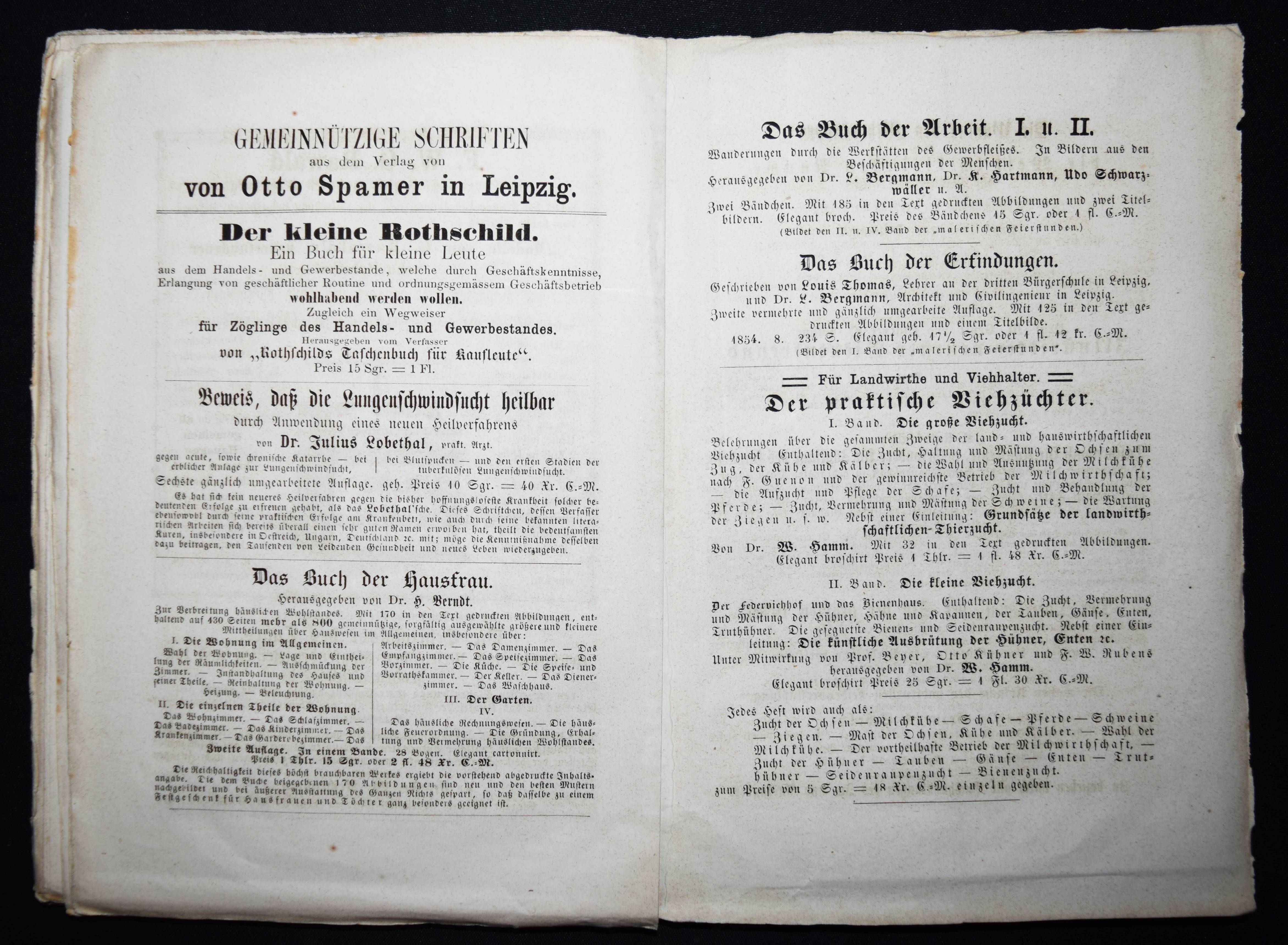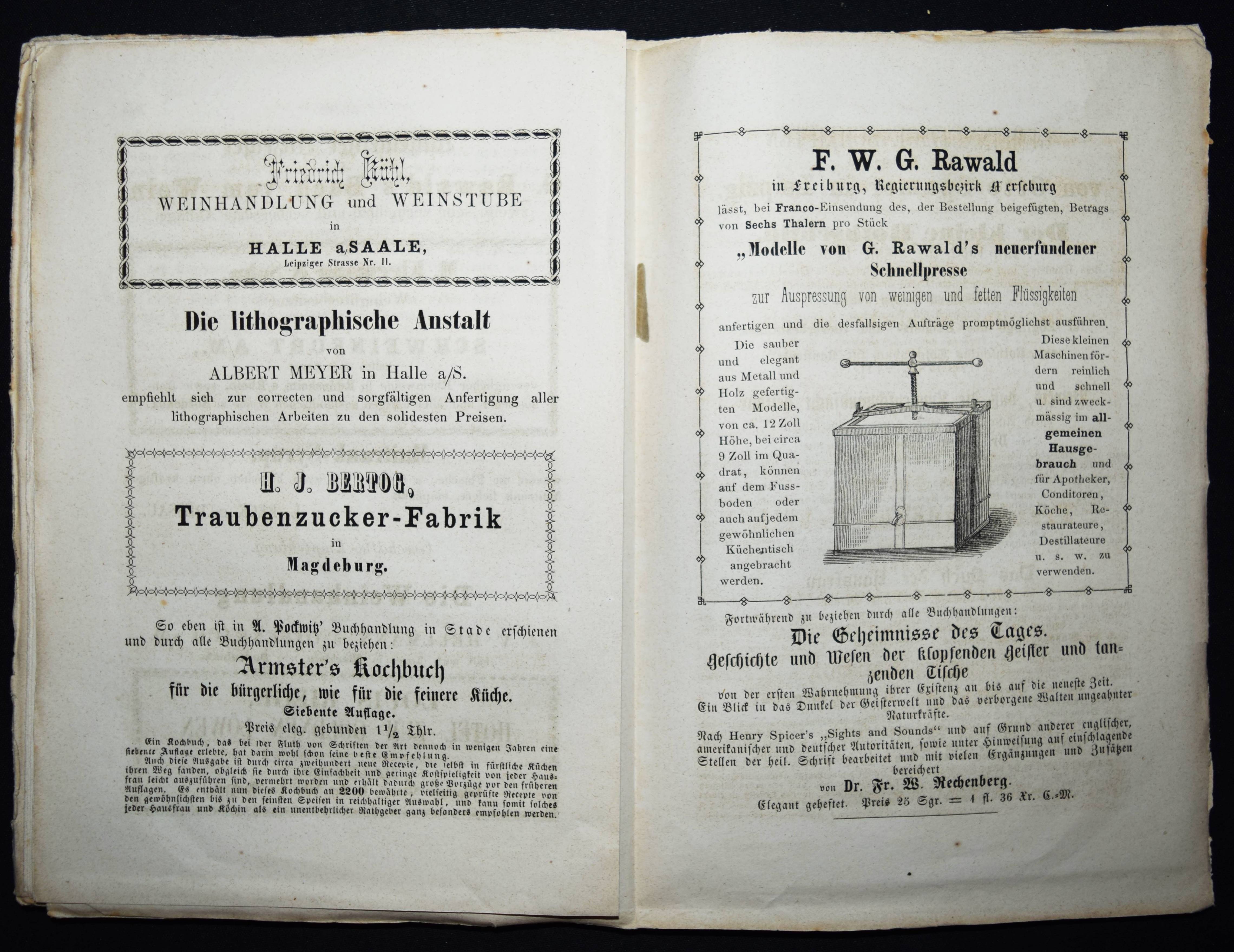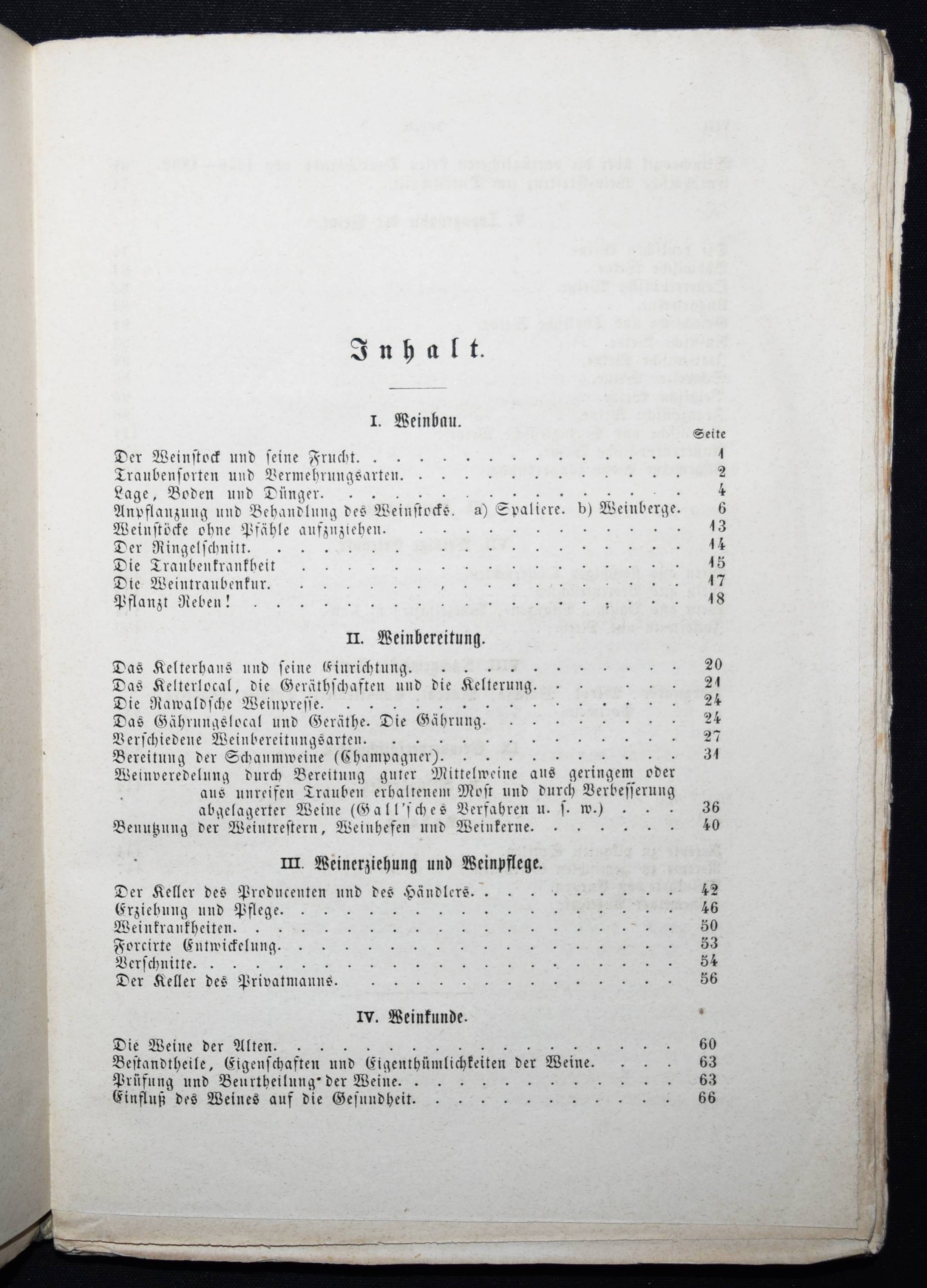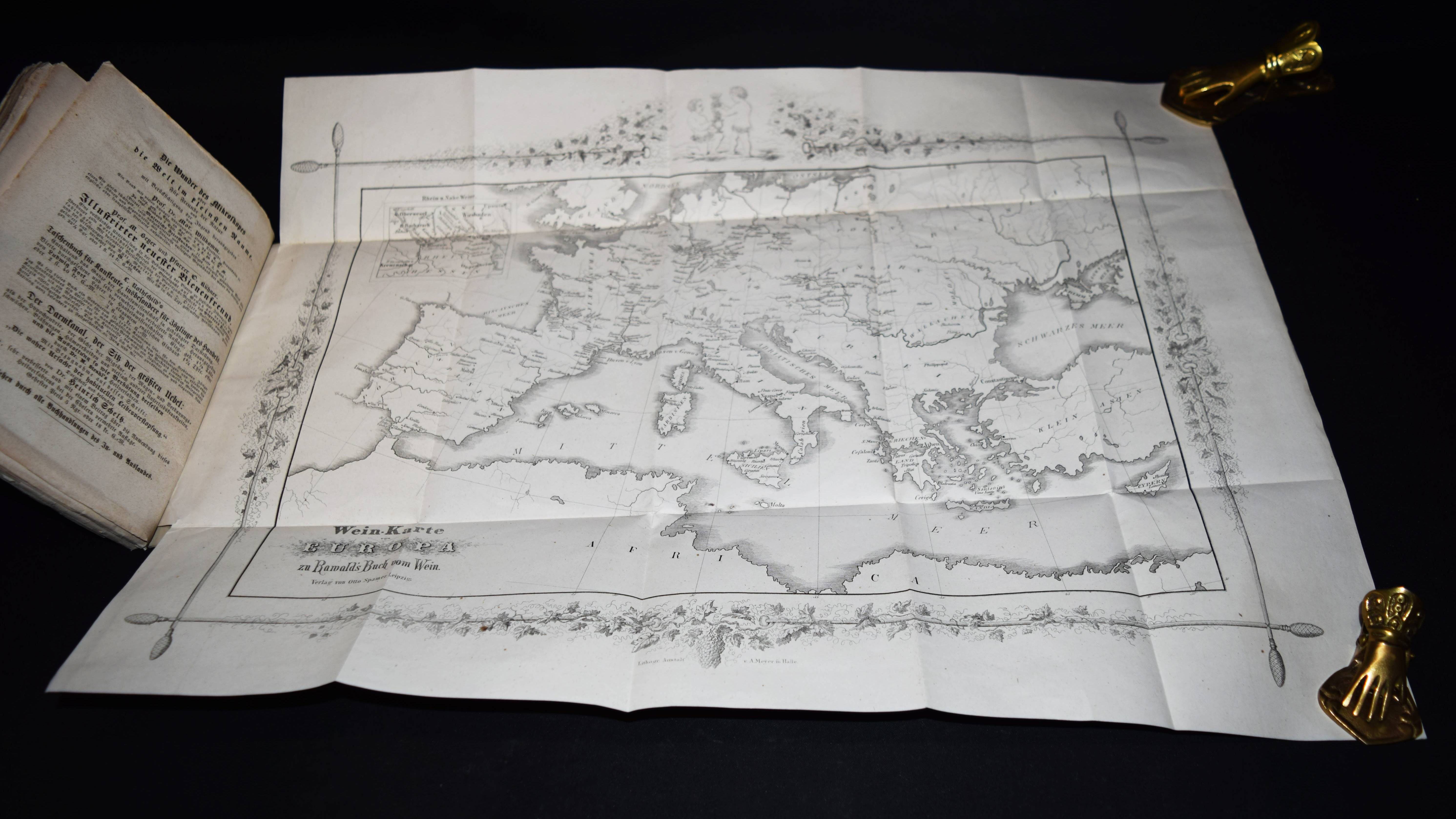 Rawald, Gustav. Das Buch vom Wein. Erfahrungen und Anweisungen über Anbau, Bereitung, Behandlung, Kenntniß und künstliche Verbesserung der Weine; für Weinbauer, Weinhändler, Gastwirthe, Weintrinker u.a. 2., gänzlich umgearb. Auflage mit einer Weinkarte von Europa und einer Abbildung der neuen Rawald’schen Weinpresse. Leipzig, Otto Spamer 1856. 8°. VIII, 150 S. mit 1 gefalt. lithogr. Karte. Farbig illustr. Orig.-Broschur. Schoene 3, 4169. – Weinbau, Weinbereitung, Weinpflege, Weinkunde, Topographie der Weine, Weinverfälschungen, Adressen usw. Gegenüber der Erstausgabe um eine großformatigen Weinkarte von Europa vermehrt. – Rücken am Fuss mit Papierstreifen überklebt, sehr gutes Exemplar.